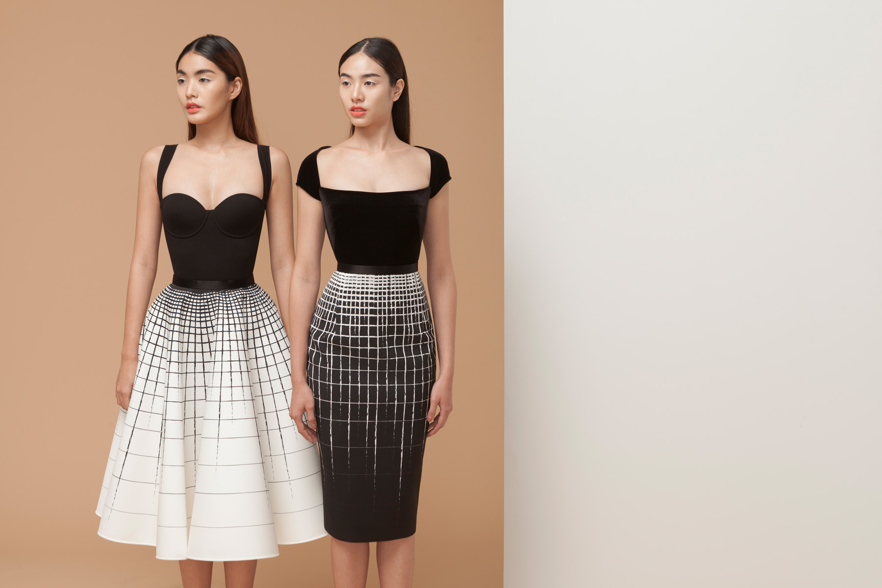 The designs pay tribute to women’s diverse body types, and signature techniques of the brand are being reinterpreted. Hourglass Second Line creates an illusion of a smaller waistline and give women sensual hourglass body. Intertwined stitching creates spiral silhouette that circles around the bodice, complementing the round skirt and dress design for women of all body types to move with grace and confidence. Tessitura print, inspired by the staff on a musical note, showcases the brand’s love and understanding for women’s body.