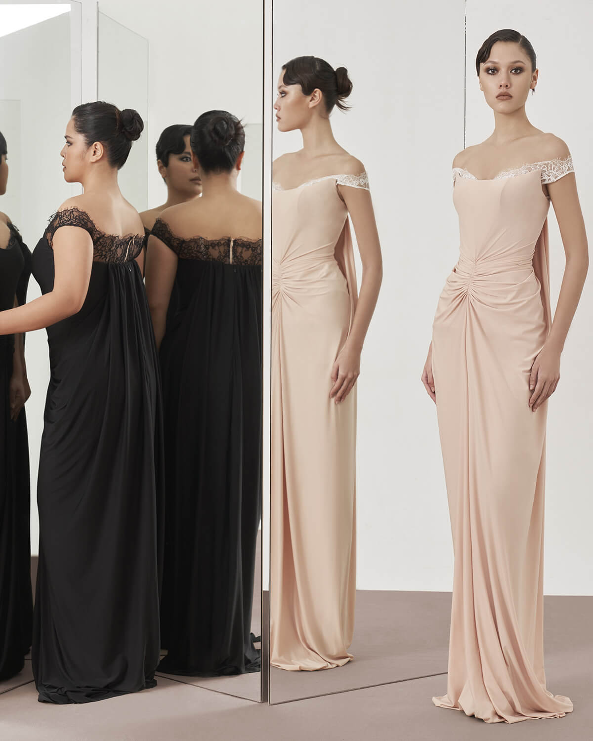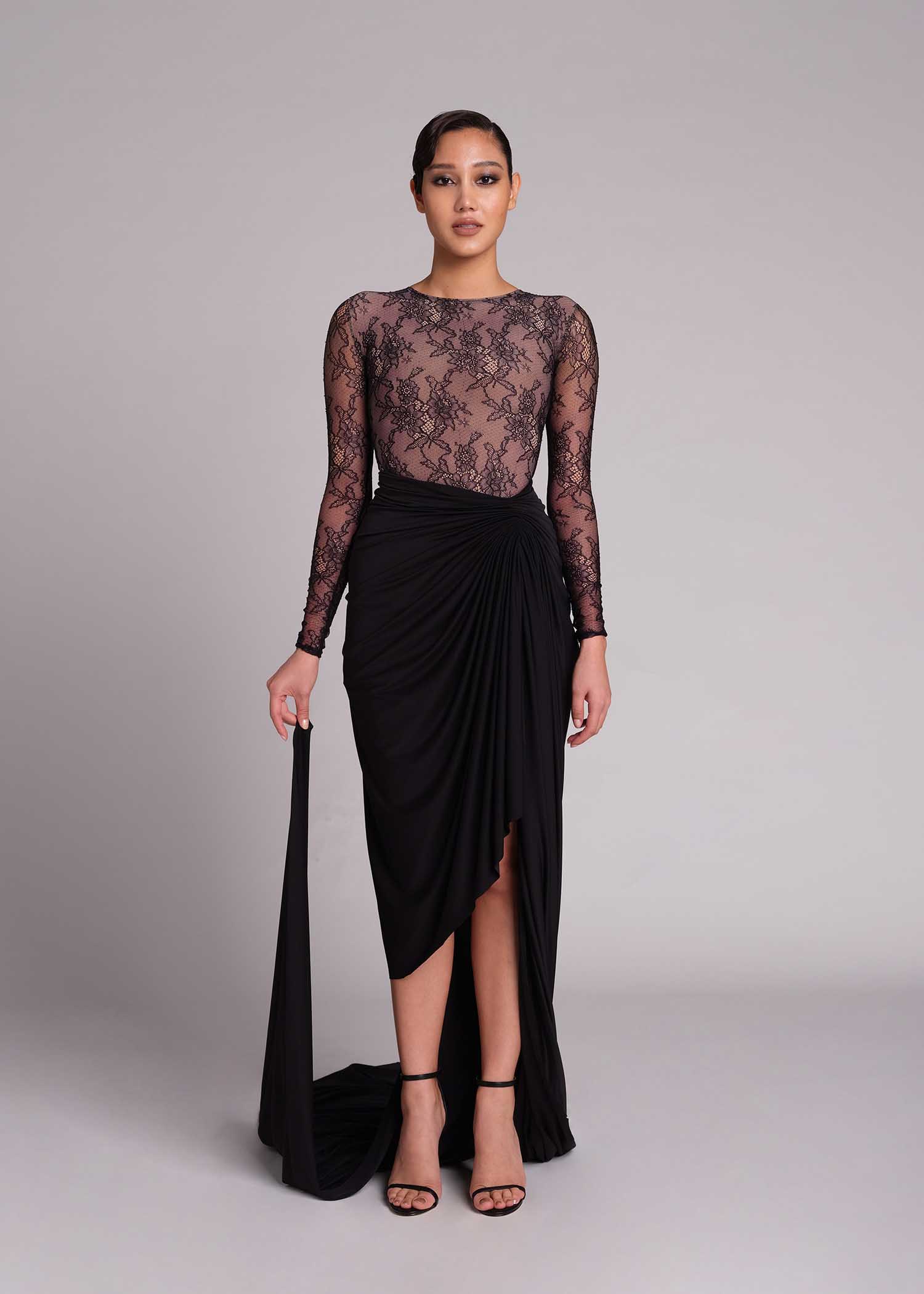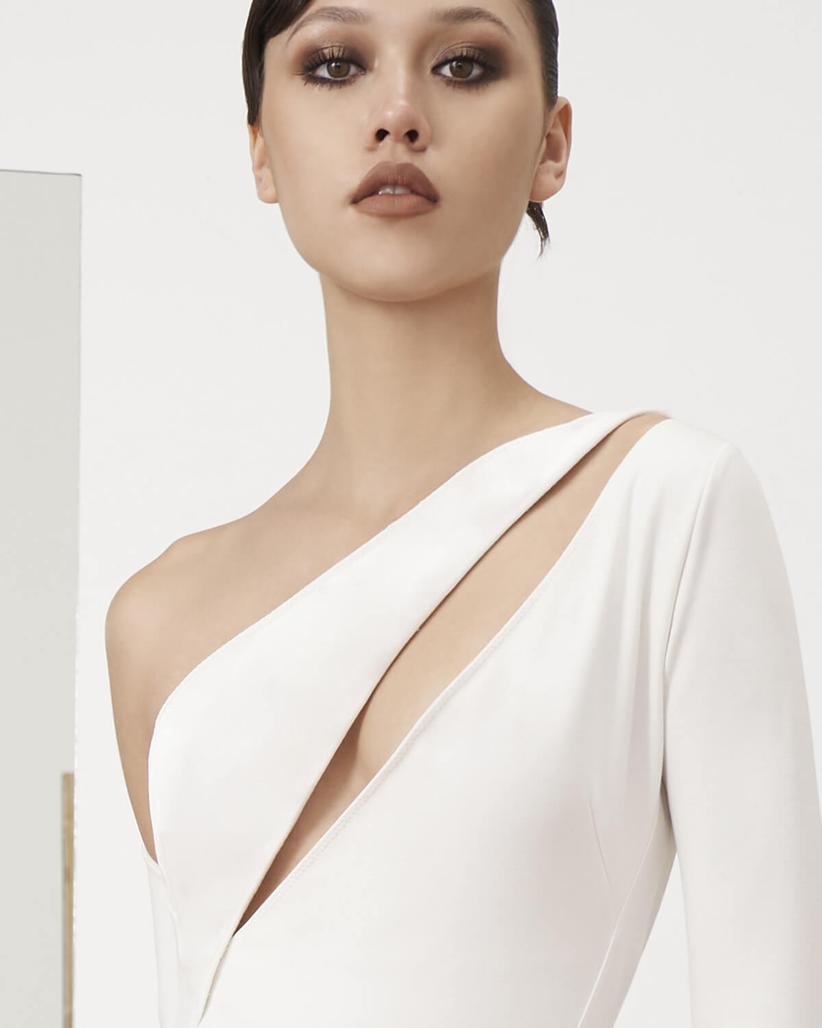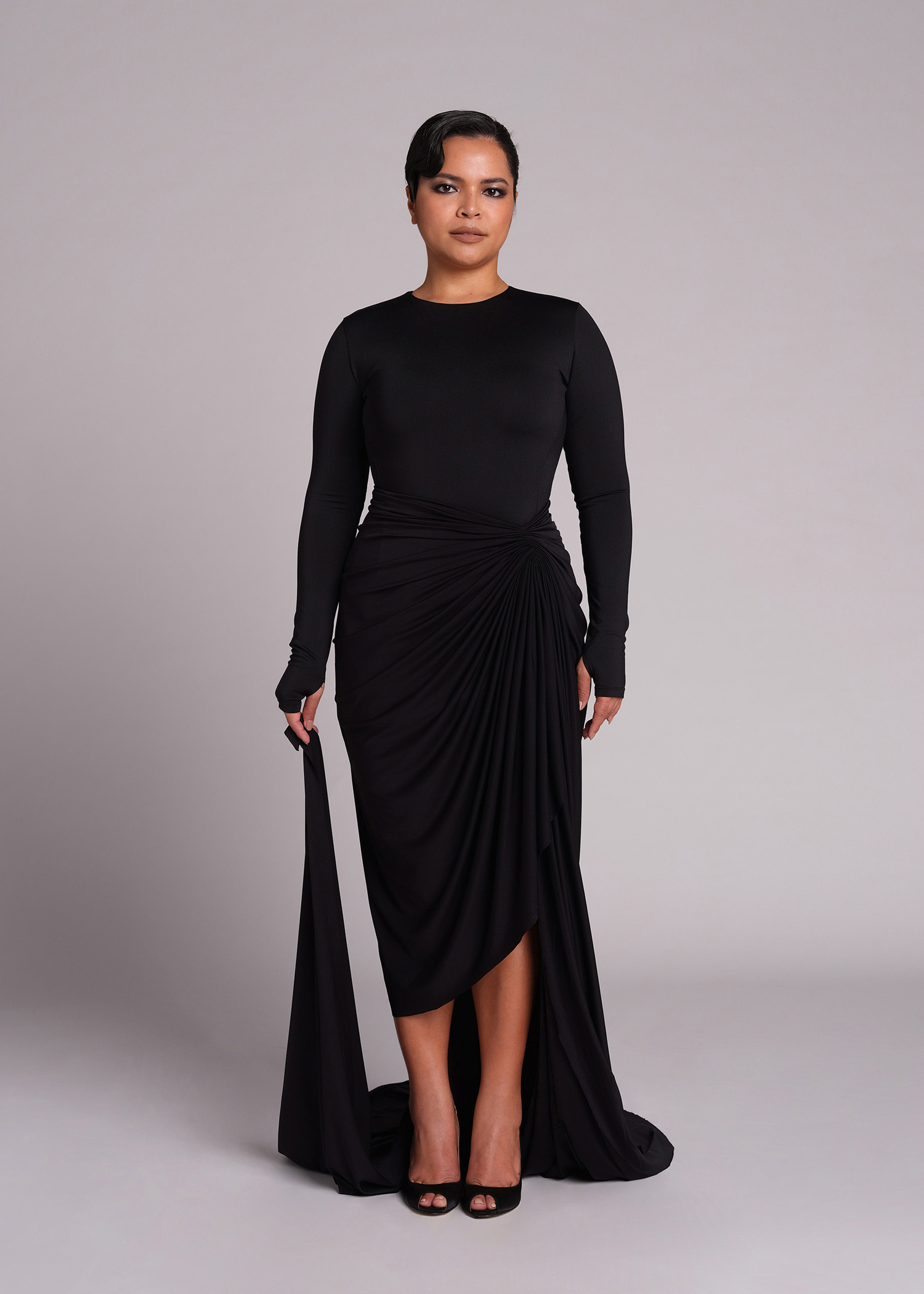 As the precise perspective lines are transposed from finely draped jersey skirts, magnifying the lines of the hips to daring slashed bodice details, each masterpiece shows an opulent expression and androgynous grace. The collection arrays just the right combination of classic and audacity, heart-made to compliment bodies of all shapes and sizes.