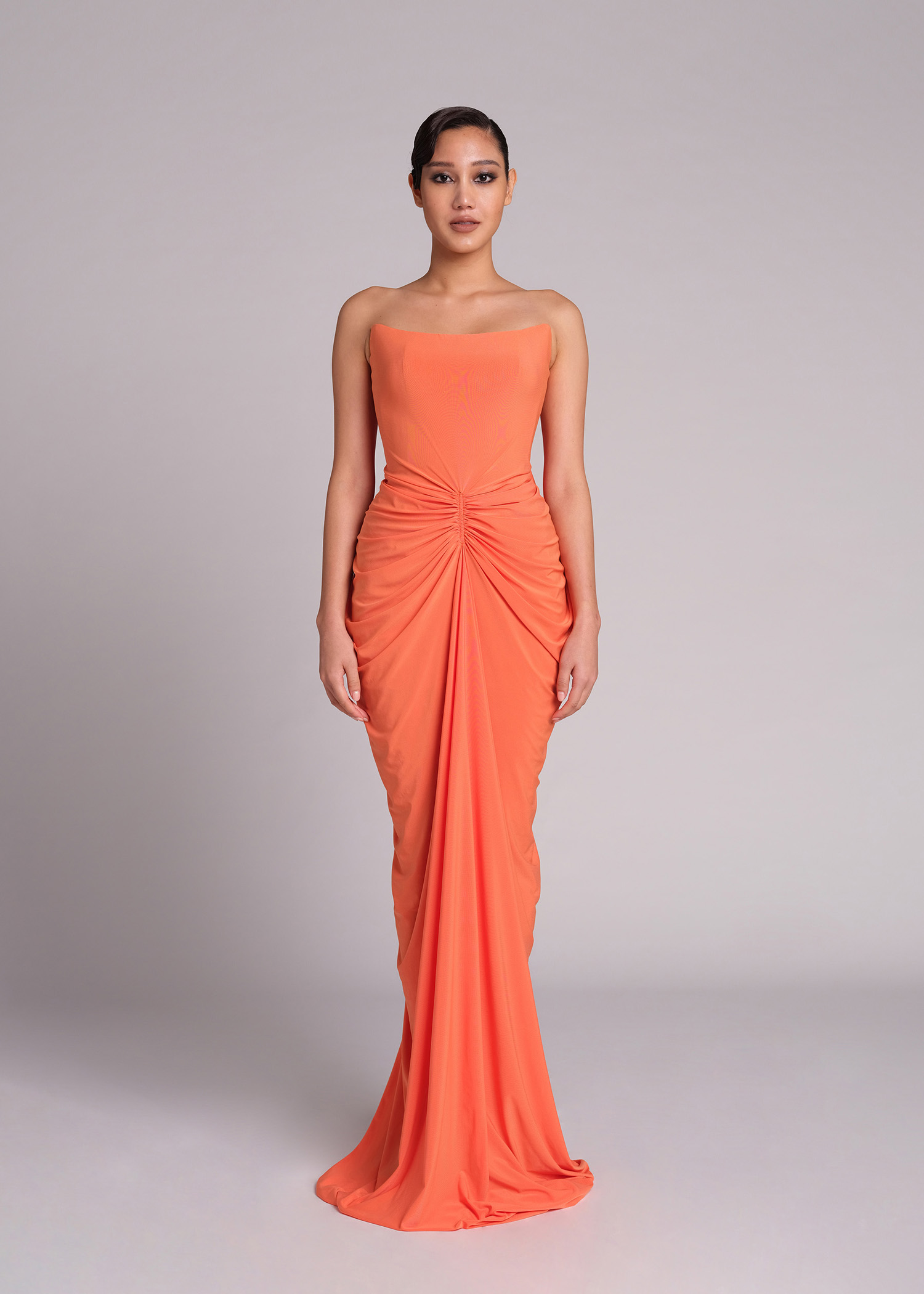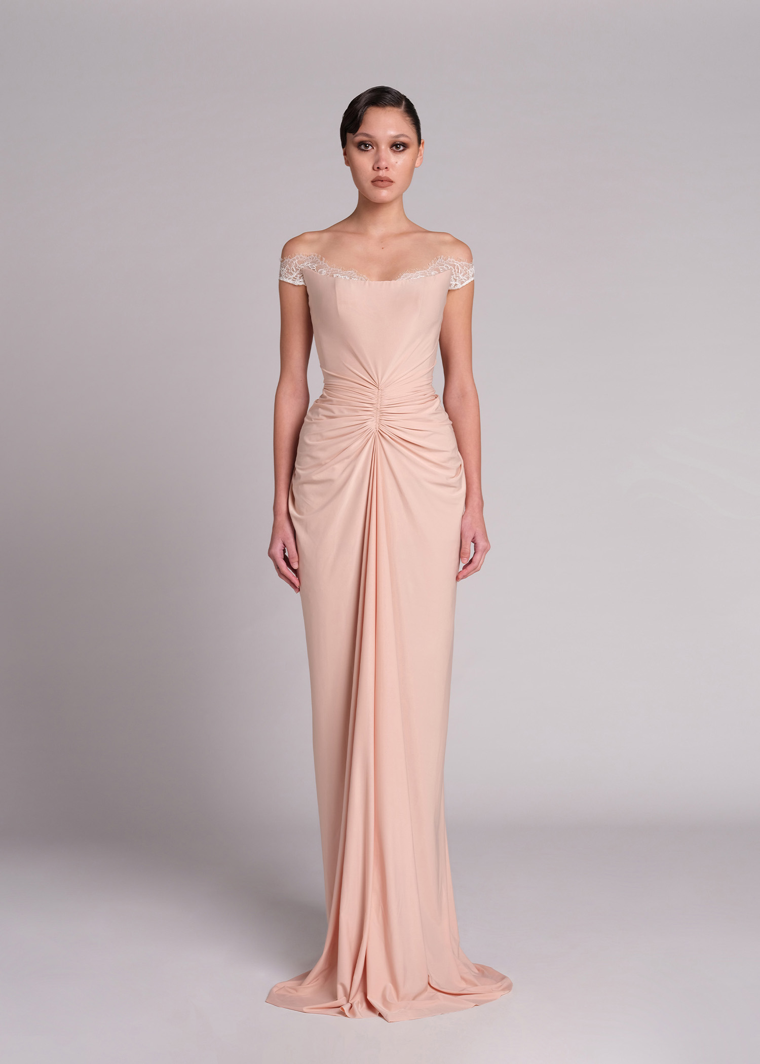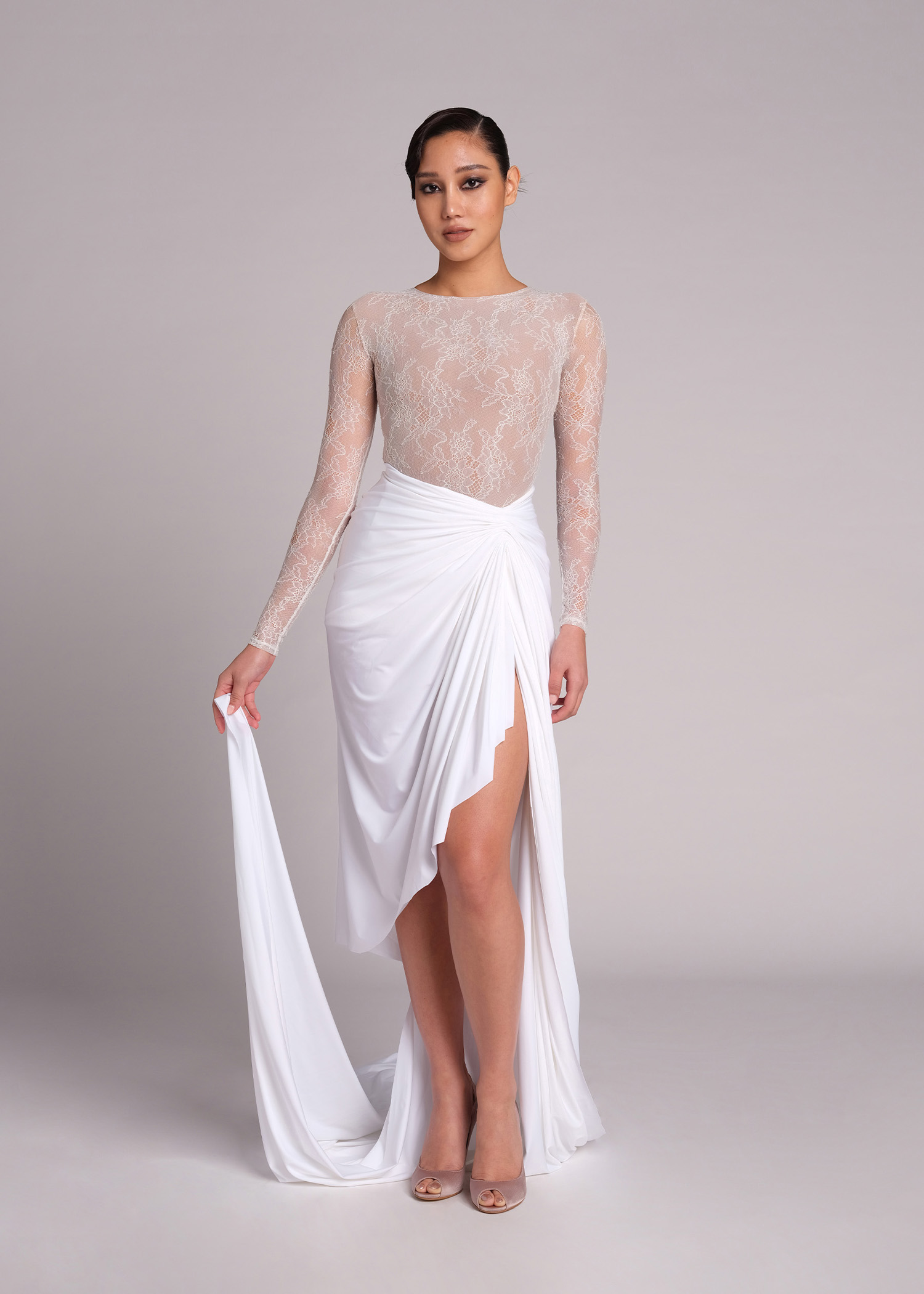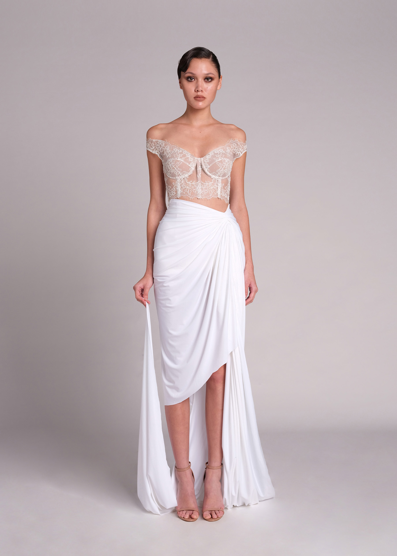 As the precise perspective lines are transposed from finely draped jersey skirts, magnifying the lines of the hips to daring slashed bodice details, each masterpiece shows an opulent expression and androgynous grace. The collection arrays just the right combination of classic and audacity, heart-made to compliment bodies of all shapes and sizes.