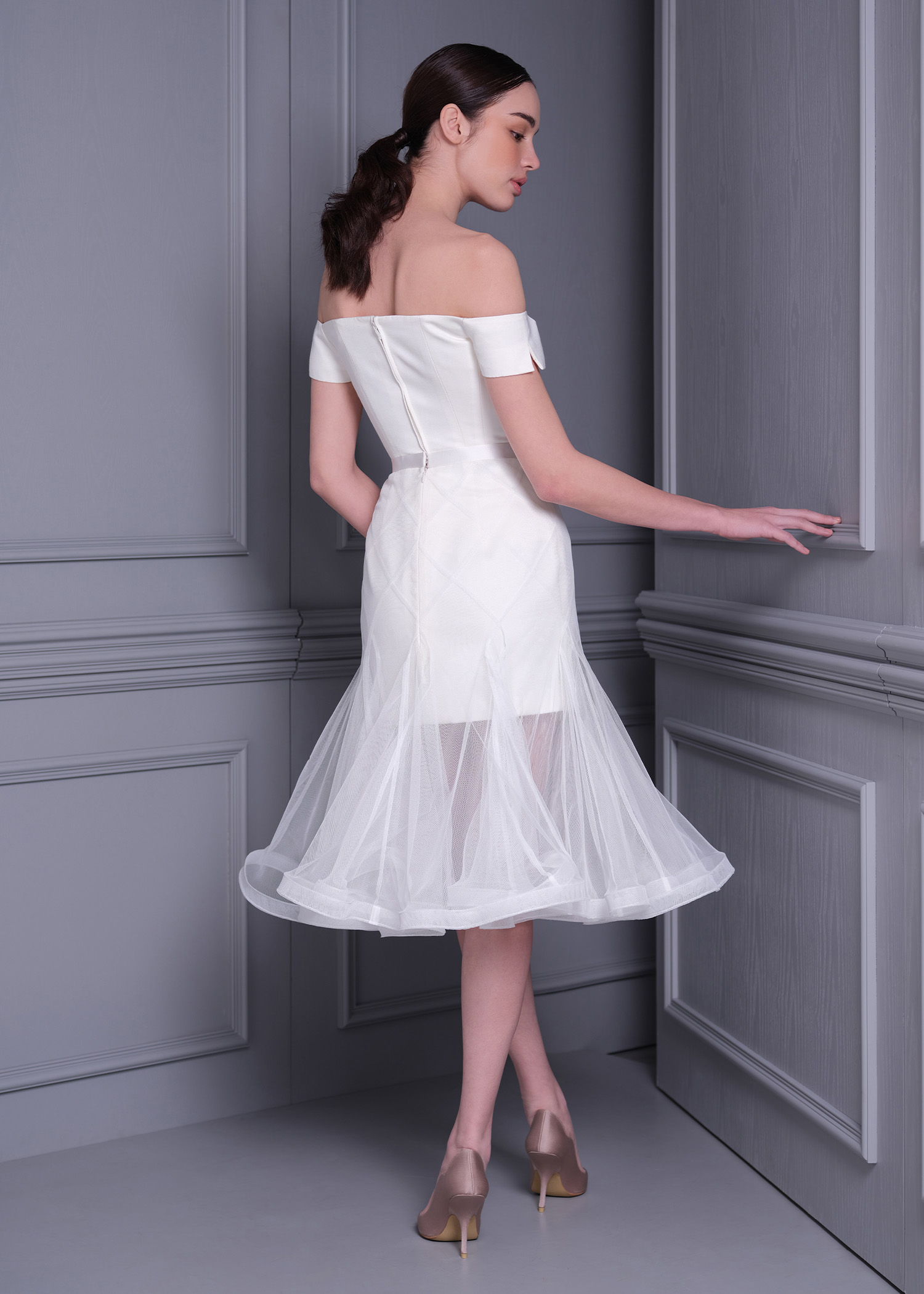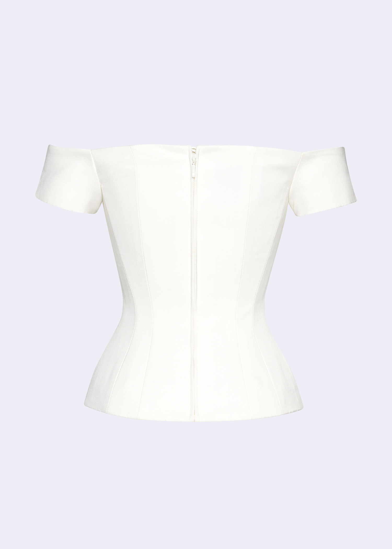 “Cher” Off-White Off-Shoulder Corset Top, meticulously crafted for both style and ease. This top features a soft off-white color and an off-shoulder design that exudes elegance. Made from high-quality polyester, it offers a structured corset silhouette that enhances your figure beautifully. Ideal for pairing with skirts or trousers, its versatile style ensures effortless elegance for various occasions.