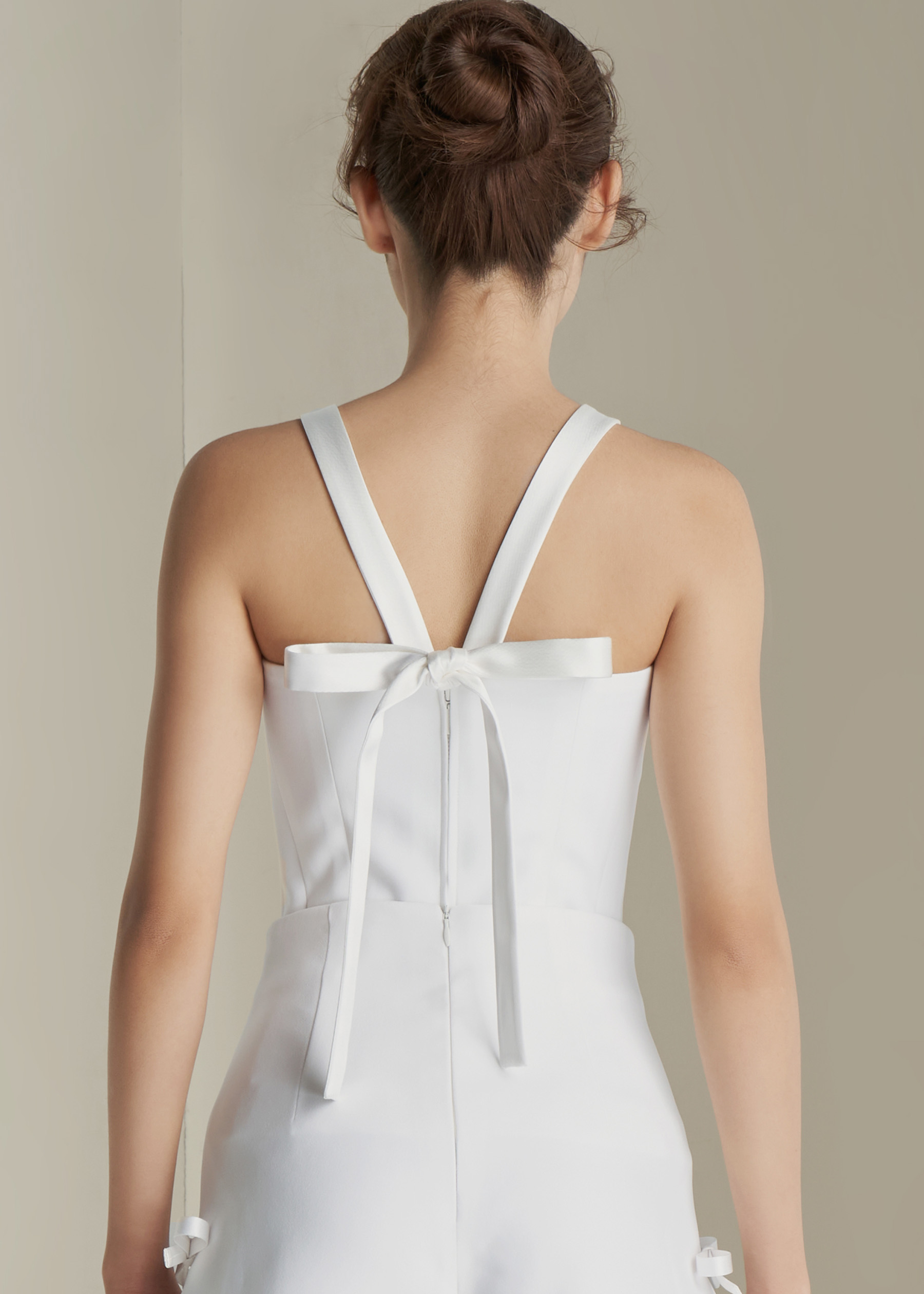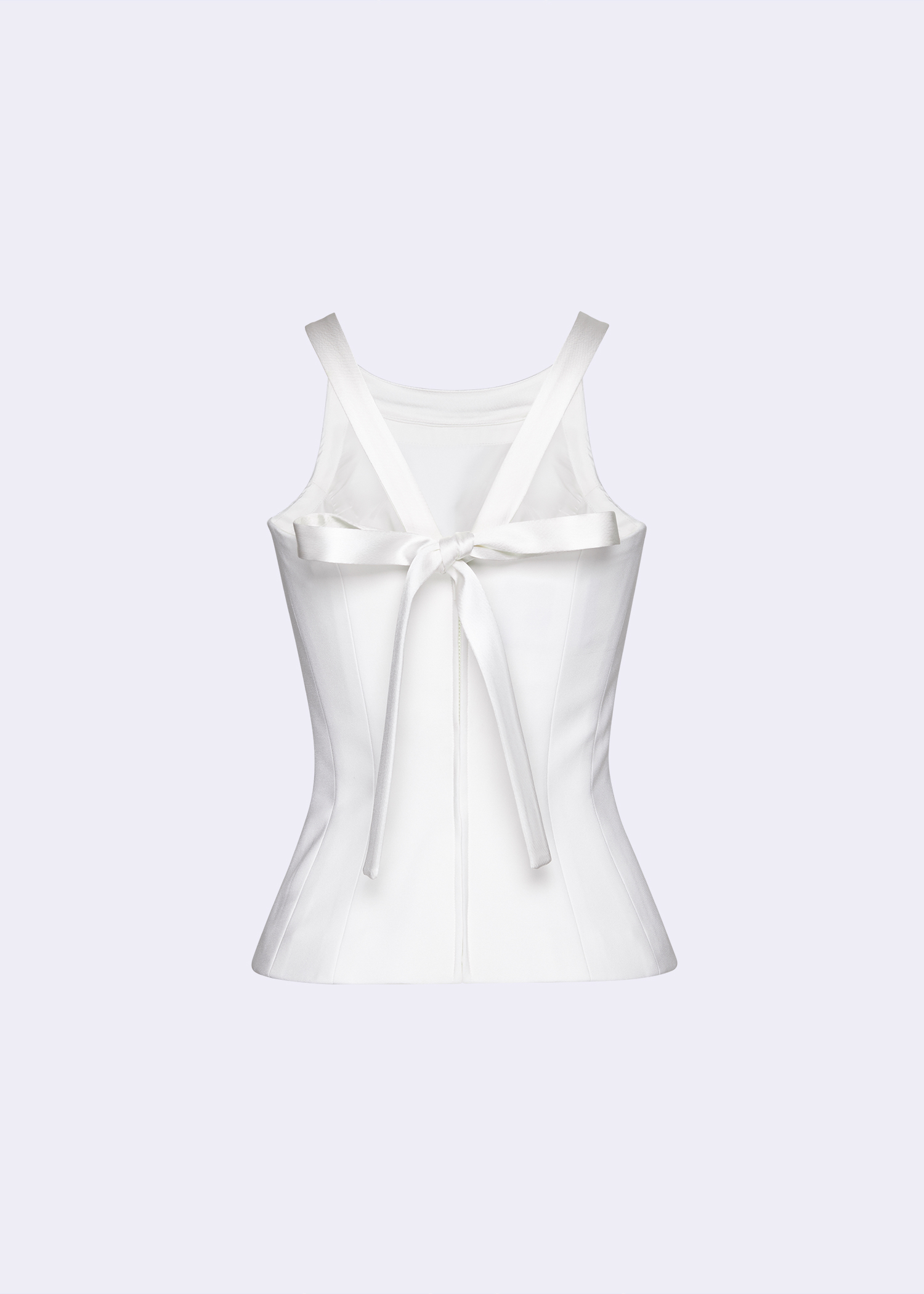 Off-White Corset Top with Satin-Crepe Detail, crafted from high-quality polyester enhanced with satin-crepe detailing for a touch of elegance. This corset top features a refined off-white color that exudes modern sophistication, complemented by intricate satin-crepe accents. Designed to flatter, it offers a structured fit that enhances your silhouette. Ideal for pairing with skirts or trousers, its versatile design ensures effortless style for various occasions.