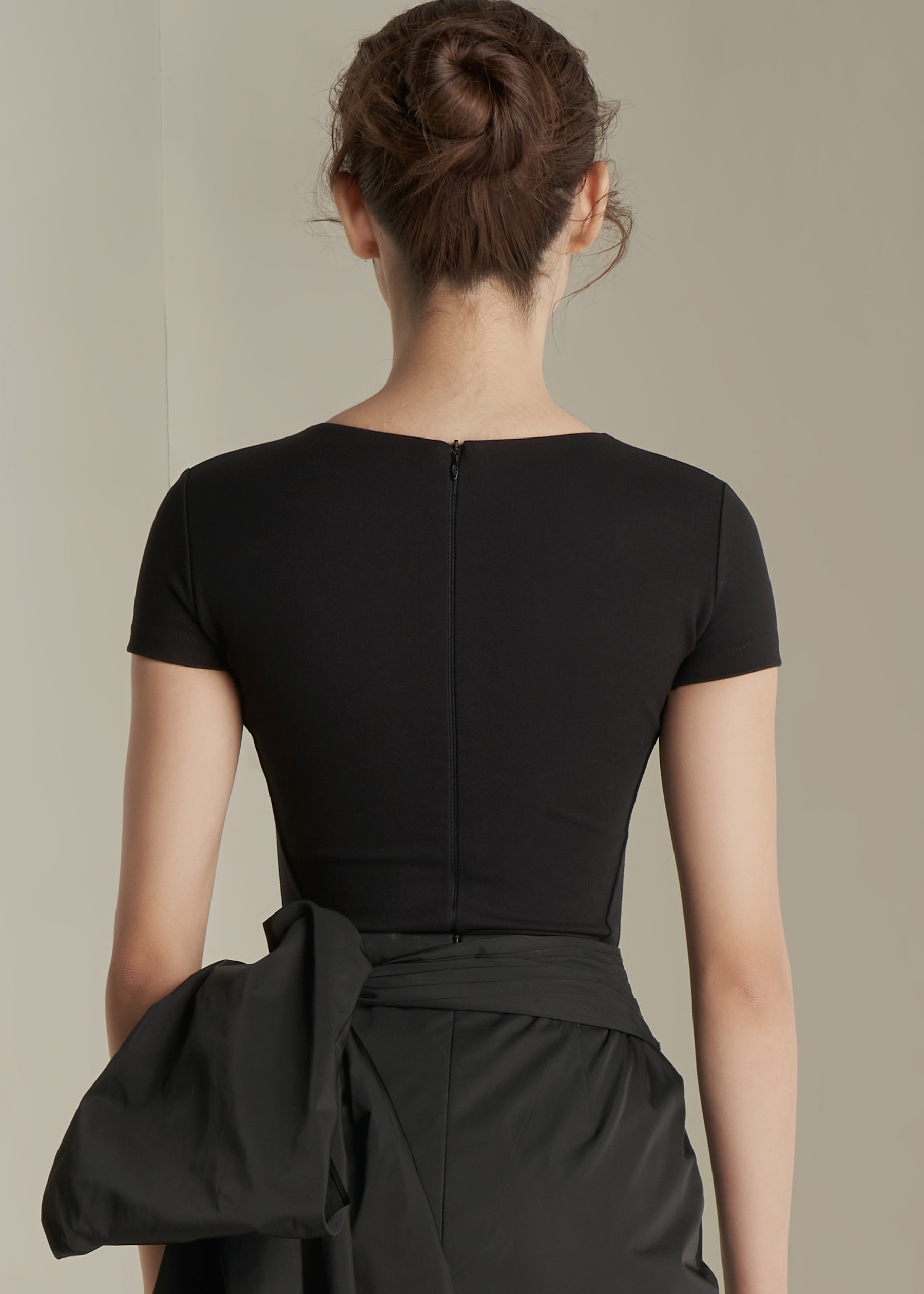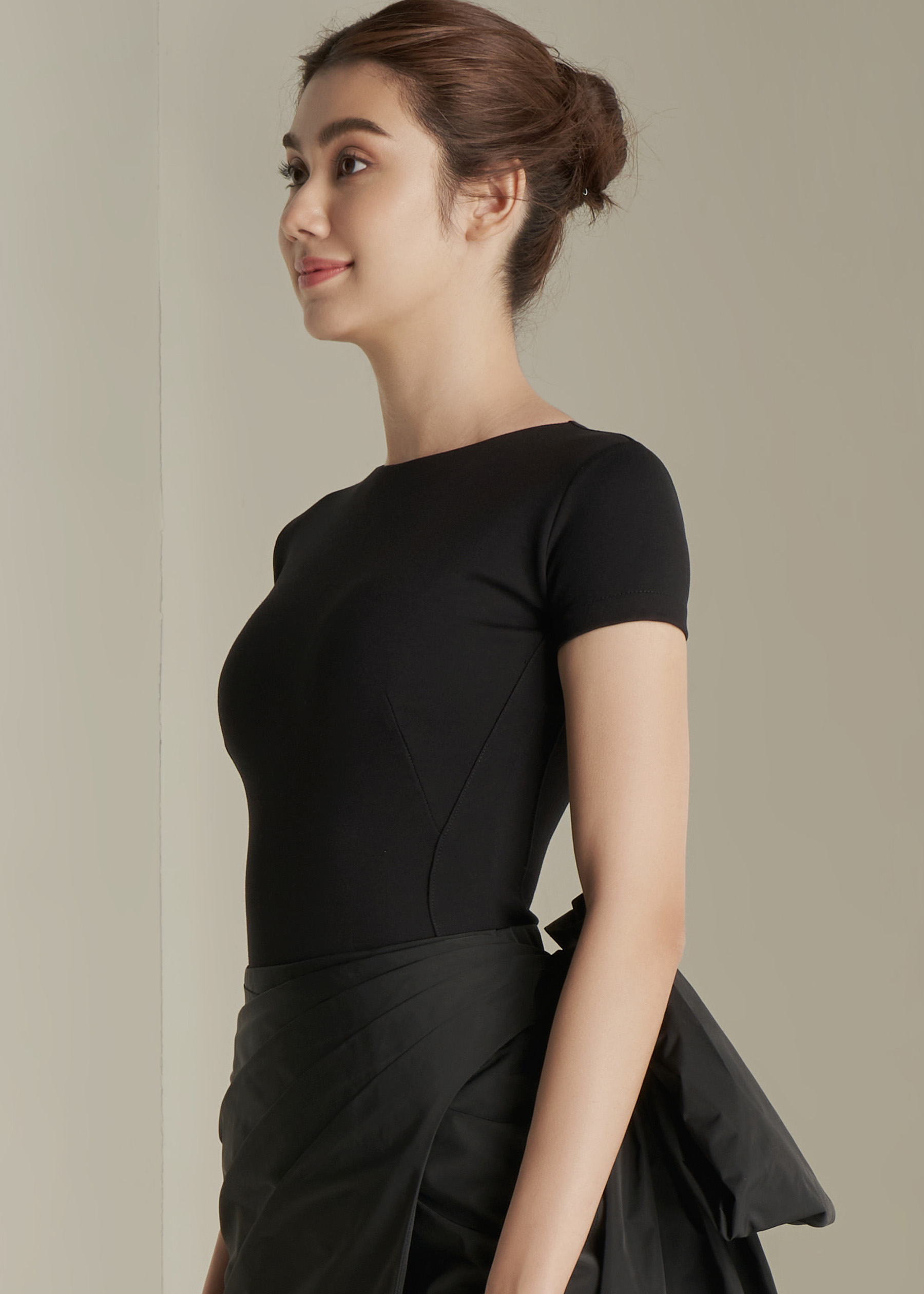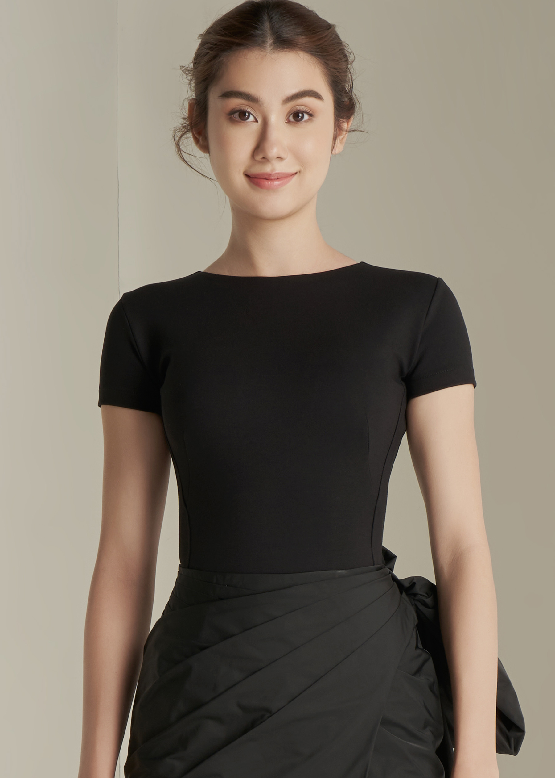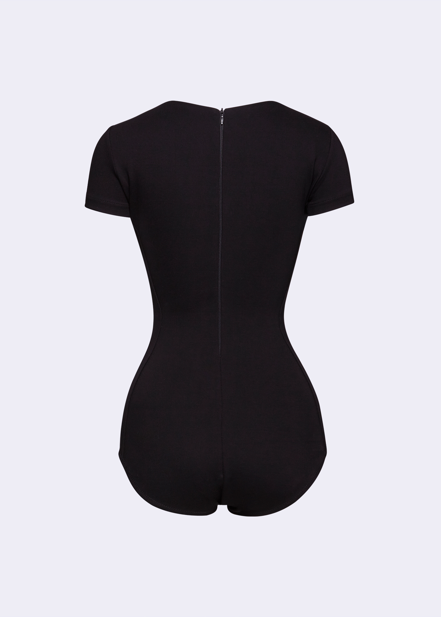Our black short sleeve bodysuit, crafted for a comfortable and flattering fit. This bodysuit features a classic black color and is made from a blend of cotton and spandex, offering flexibility and softness. Enhanced with power mesh lining, it provides additional support and shaping. Ideal for layering under skirts or trousers, its short sleeve design ensures versatility from day to evening.