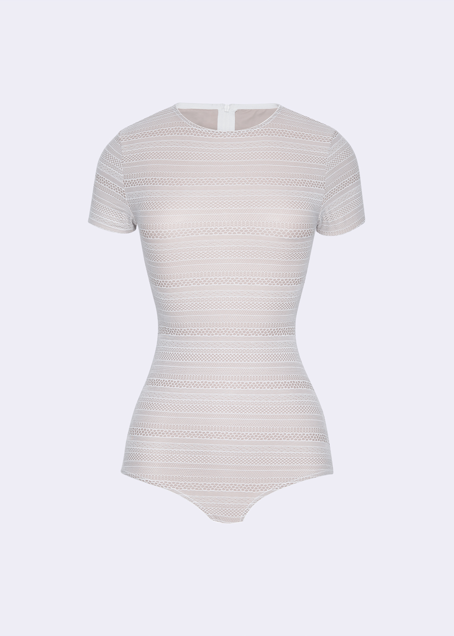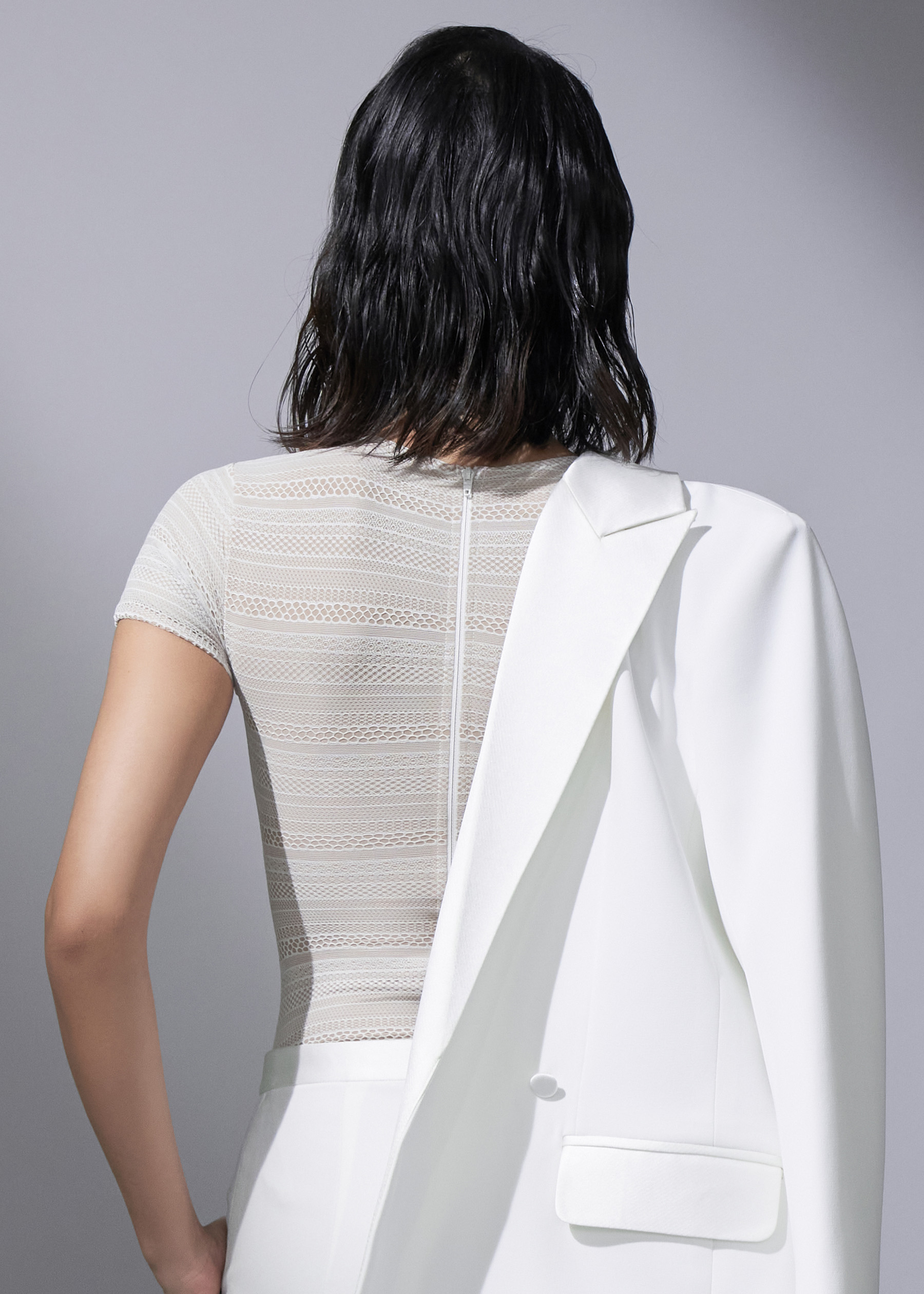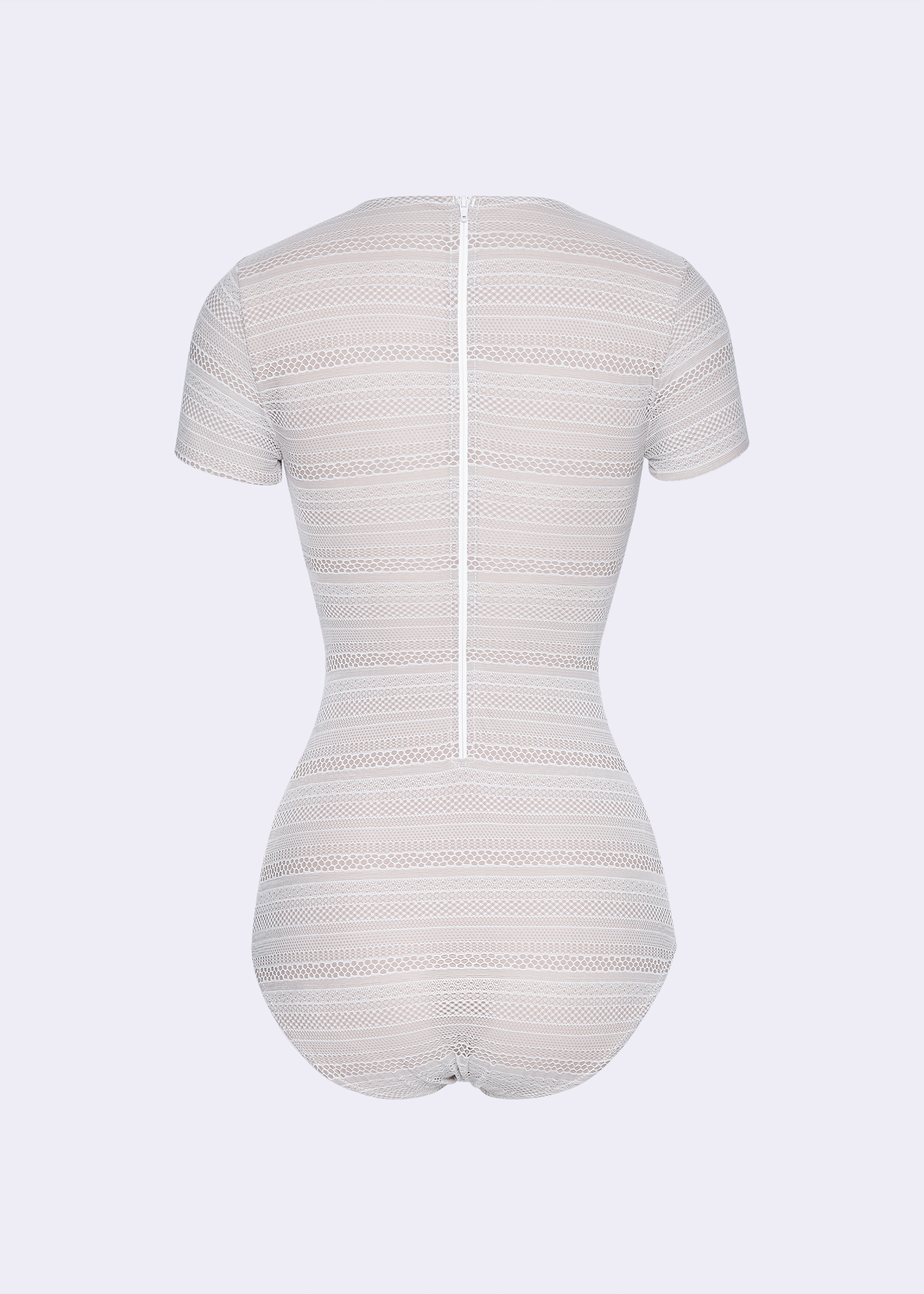 Off-White Dentelle Round-Neck with Short-Sleeve Bodysuit, crafted from delicate dentelle fabric for a luxurious feel. This bodysuit features a classic round-neck and short-sleeve design, offering both style and comfort. Ideal for layering under skirts or trousers, its versatile silhouette transitions seamlessly from day to night.