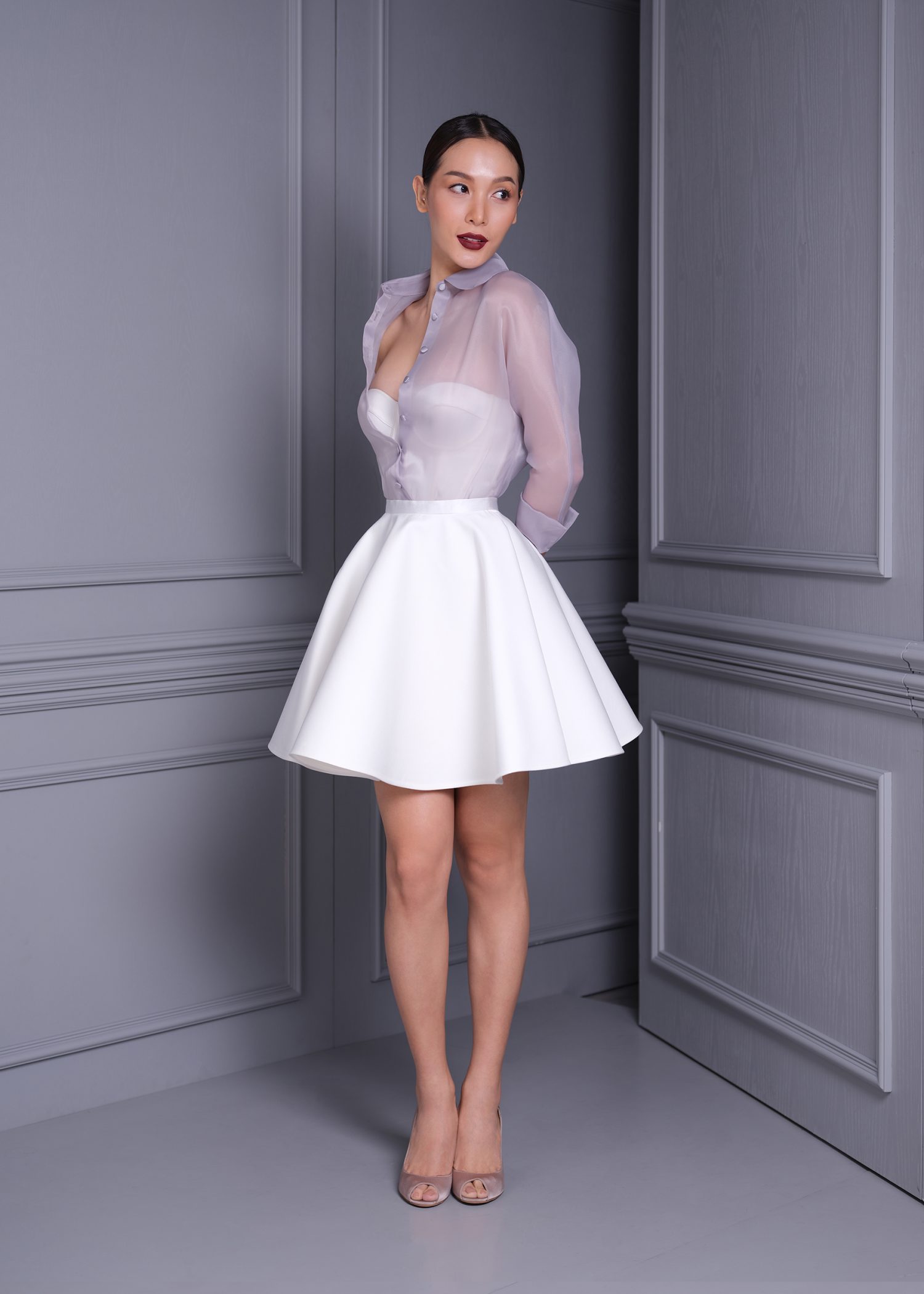 “Aurai” Grey Organza Shirt, meticulously designed for both style and comfort. This shirt features a delicate grey color and is crafted from high-quality organza, offering a sheer and lightweight feel. Its relaxed fit and versatile design make it ideal for layering over camisoles or pairing with trousers or skirts.