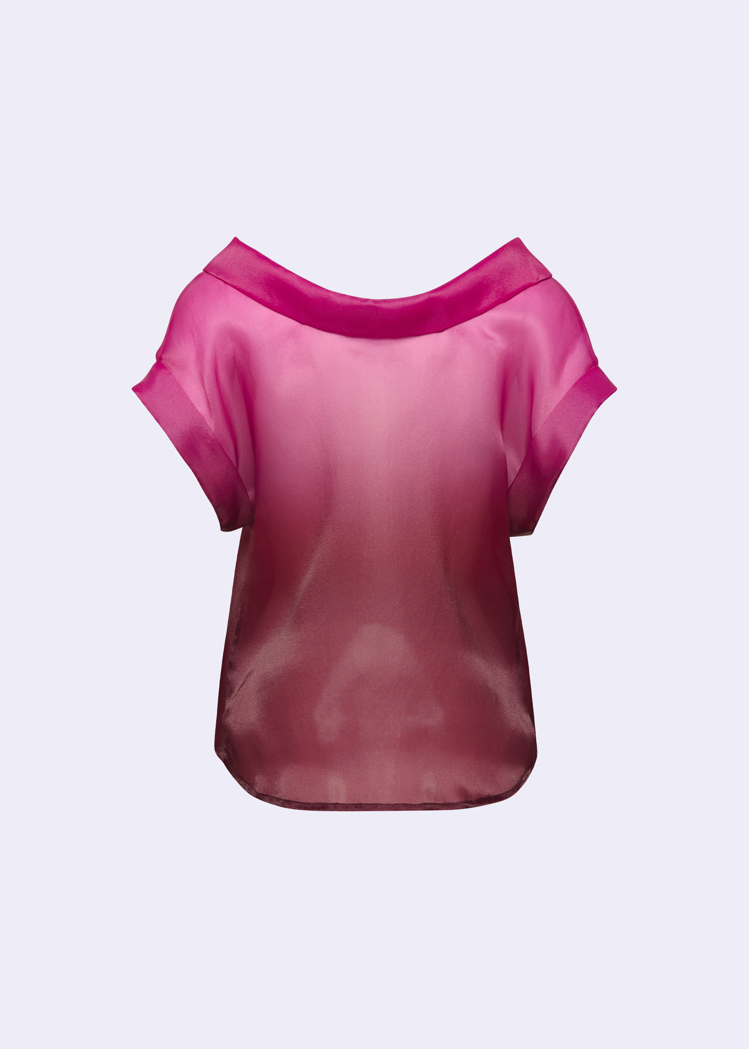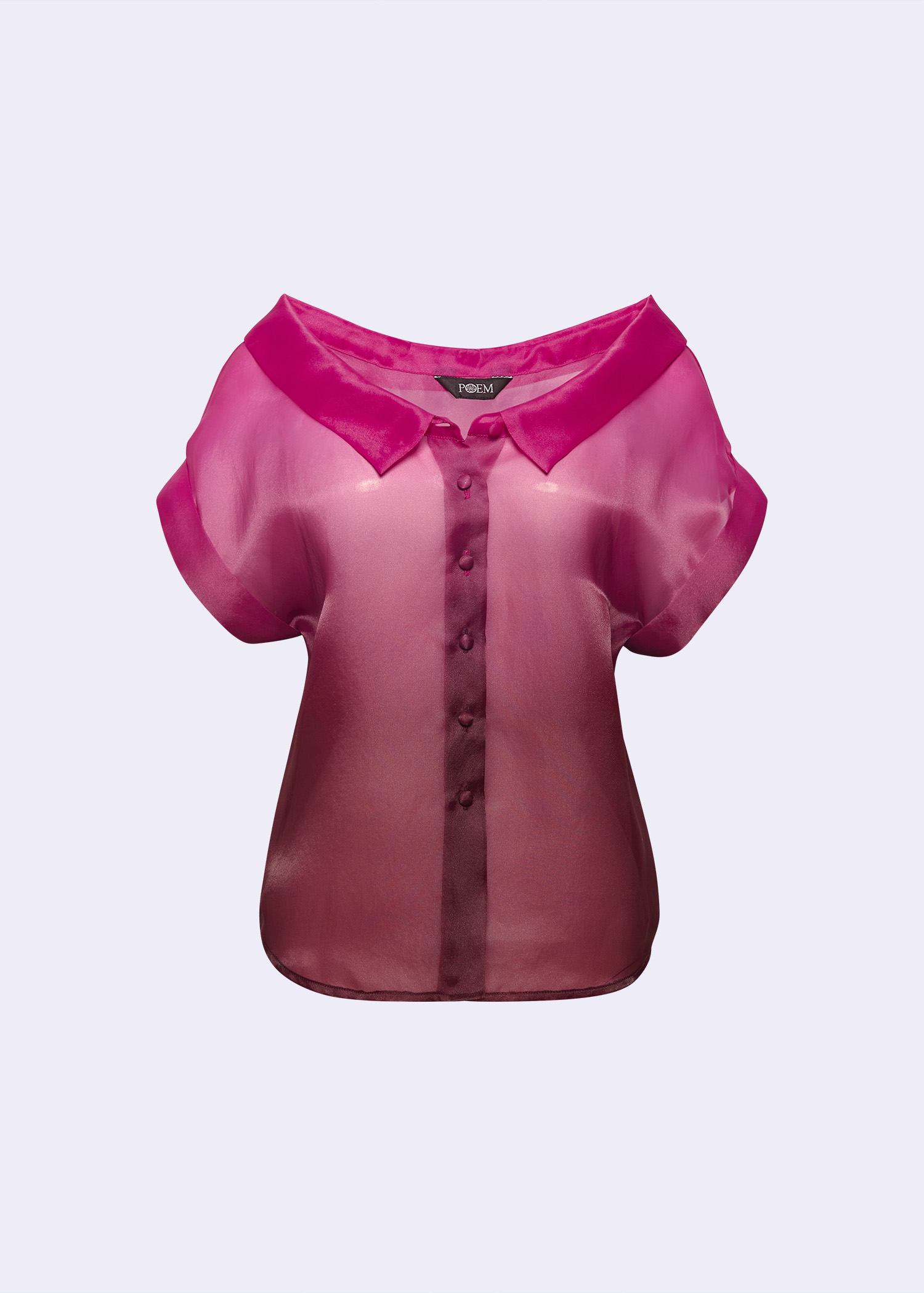 Wine Ombre Printed Wide-Collar Shirt-Blouse, crafted from luxurious magenta organza polyester. This sophisticated piece combines the elegance of wine ombre print with the lightweight comfort of organza. Perfect for enhancing your wardrobe with a touch of contemporary style, suitable for both casual and formal settings. Discover the perfect blend of fashion and comfort.