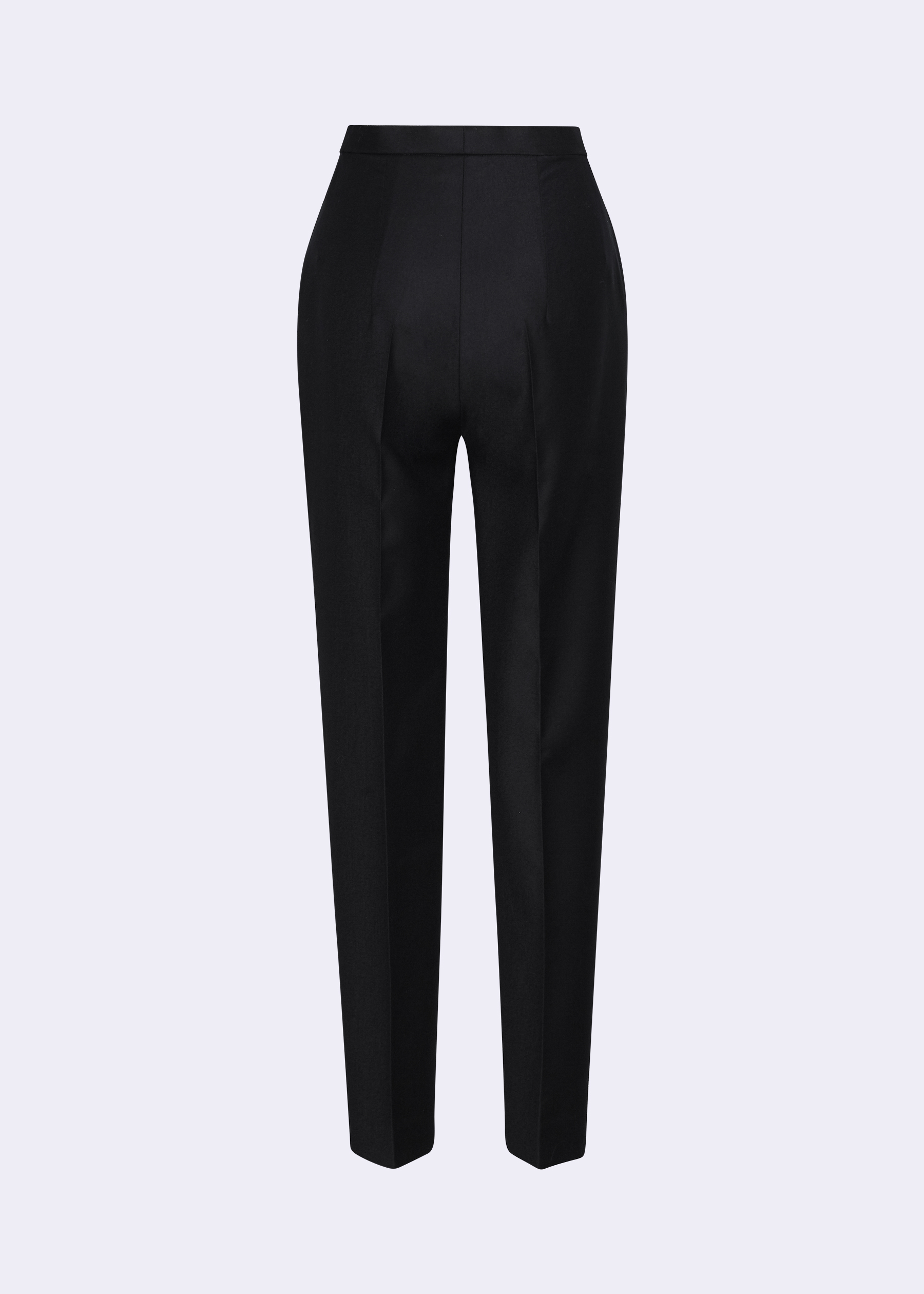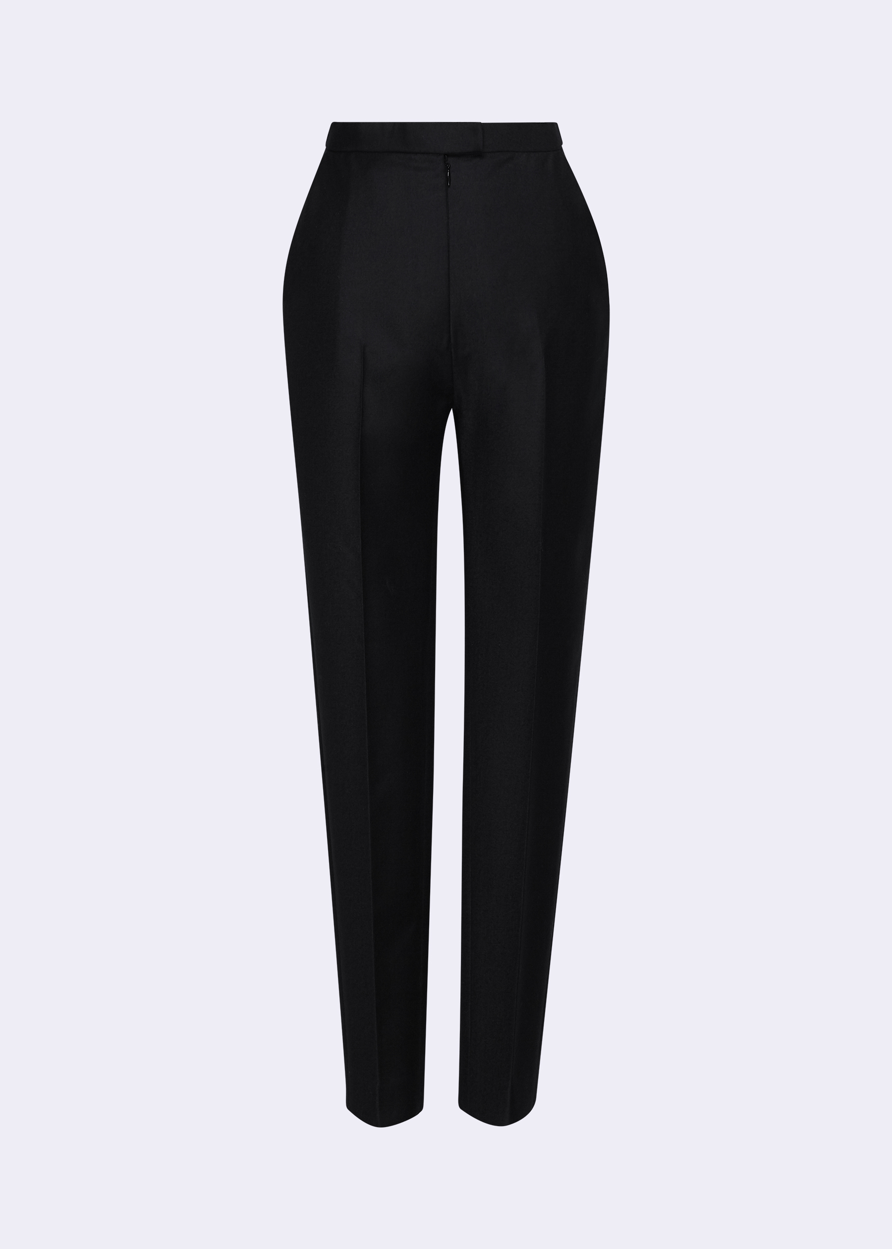 “Vostok” Black Cigarette Pants, meticulously crafted for both style and ease. These pants feature a sleek black color and a satin-crepe waistband that adds a touch of luxurious detail. Made from high-quality polyester, they offer a tailored fit and a flattering cigarette silhouette that enhances your silhouette beautifully. Ideal for pairing with blouses or tops, their versatile style ensures effortless elegance for various occasions.