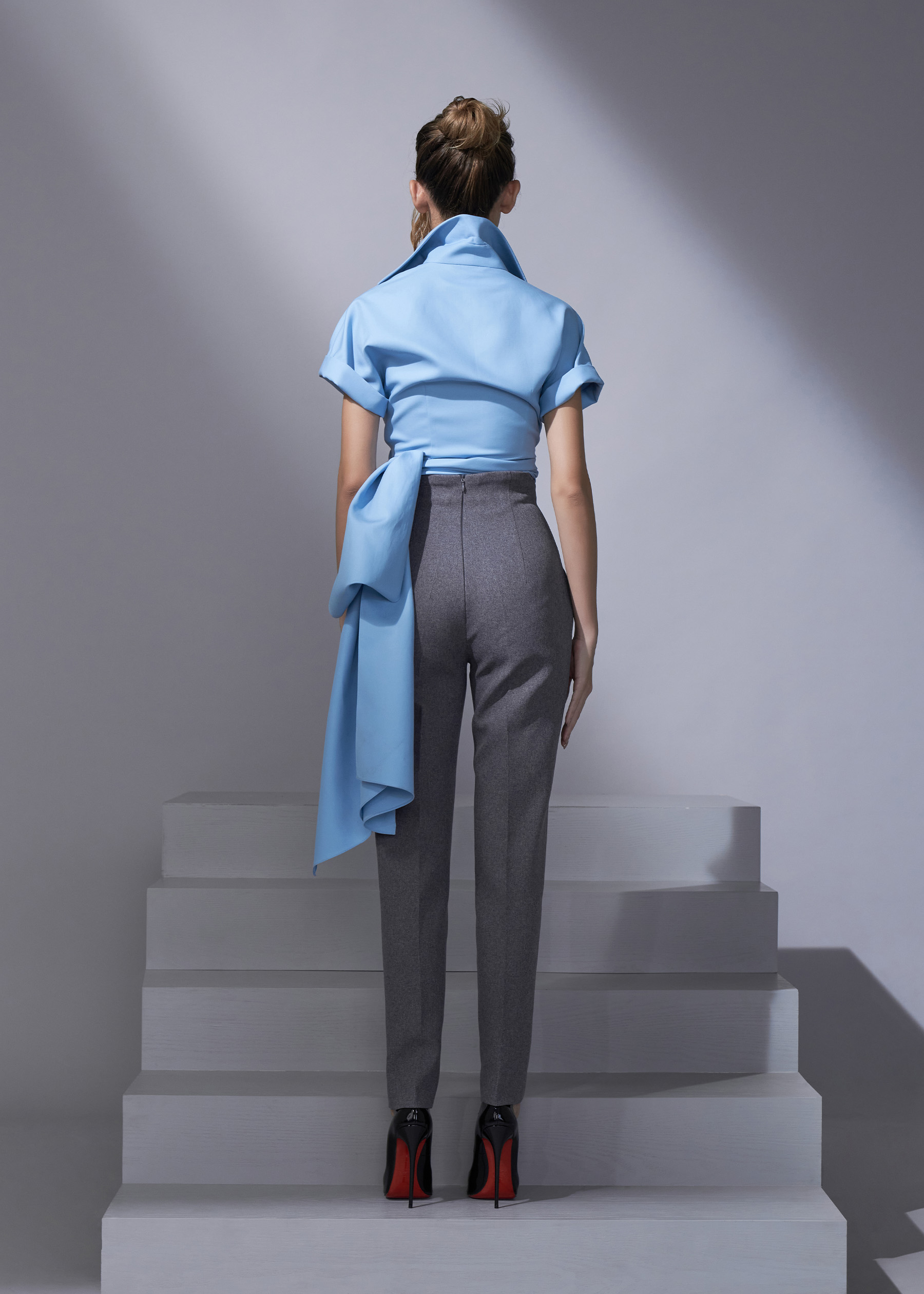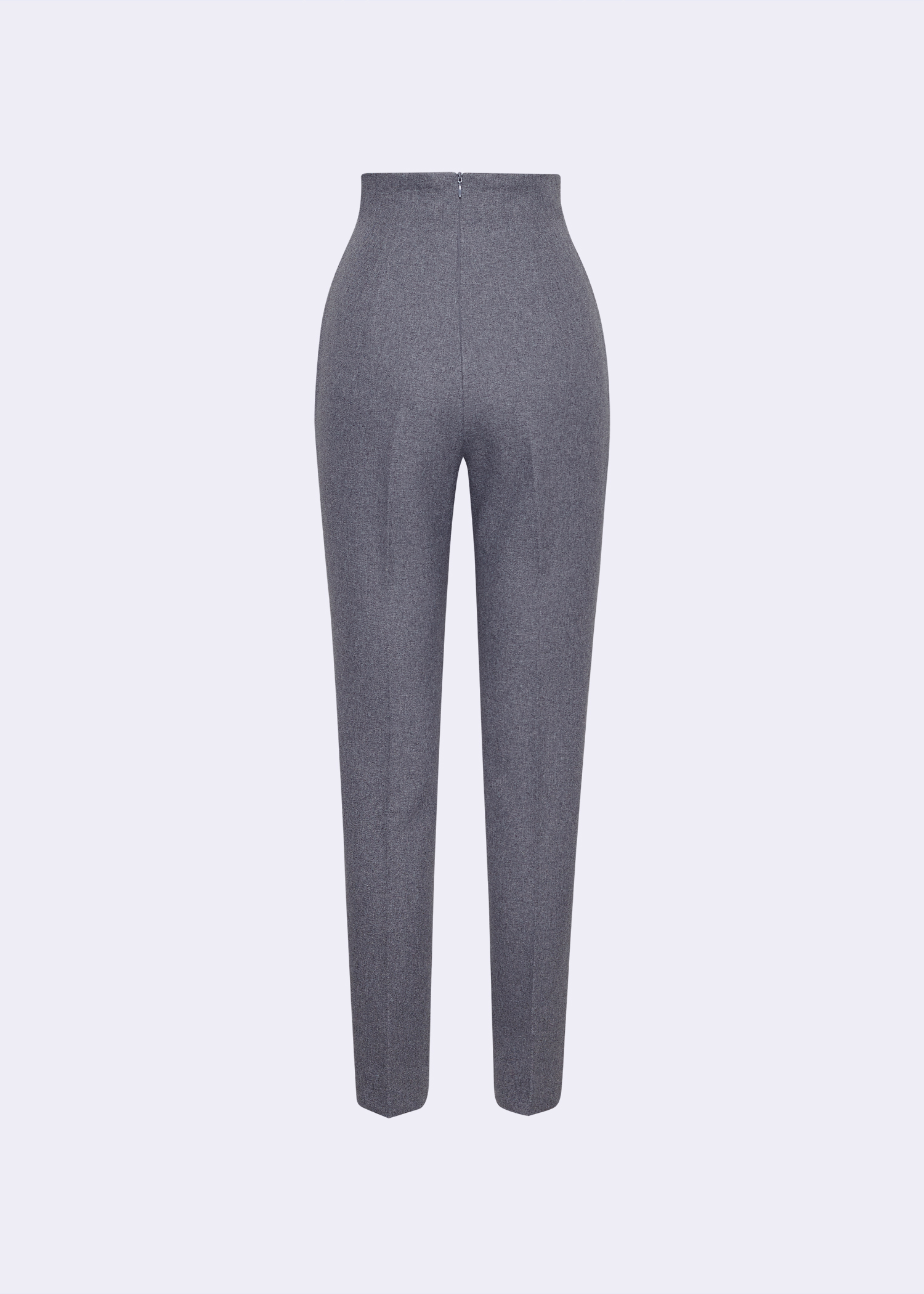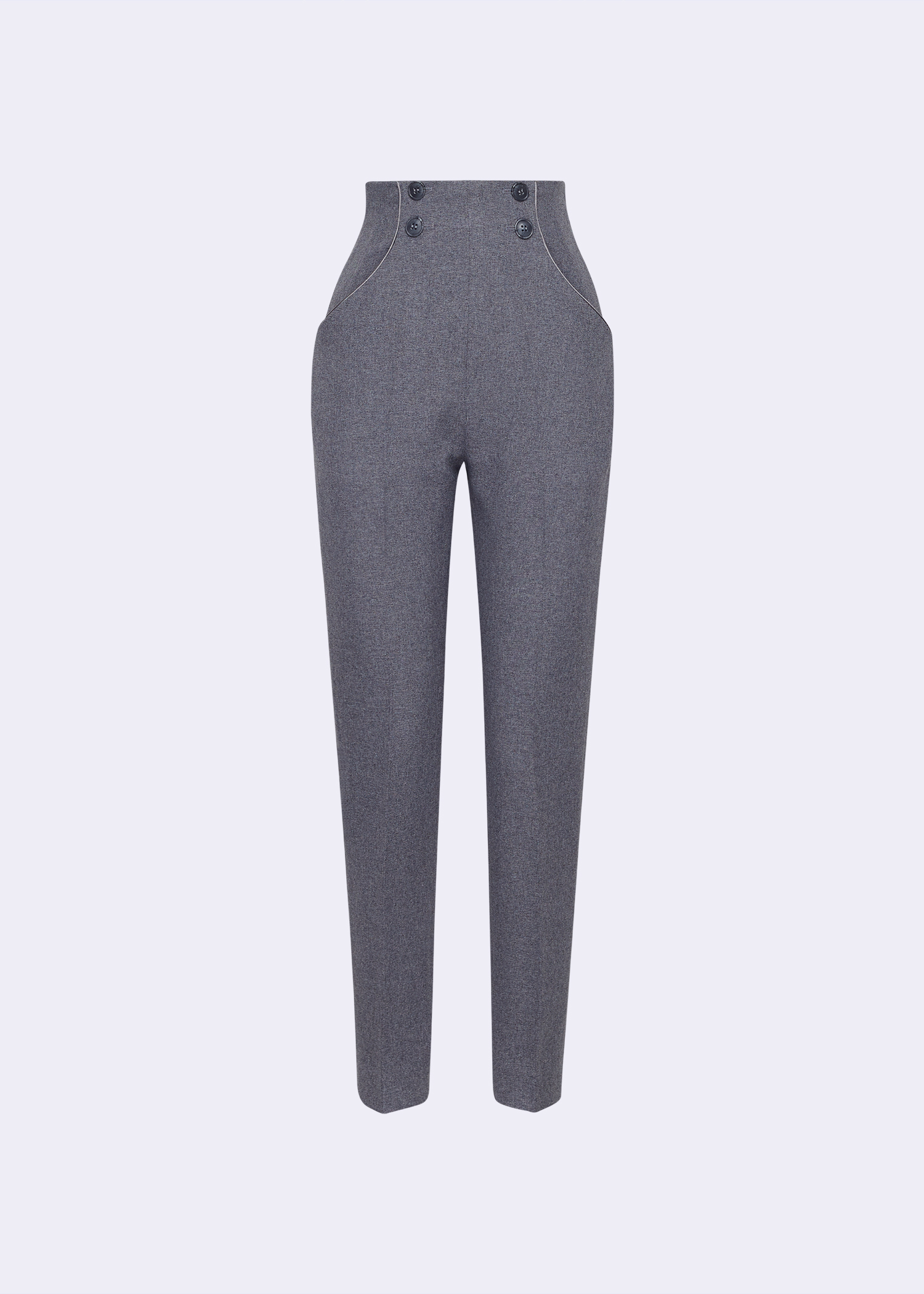 Our grey polyester high-waist pants with buttons detail, crafted from quality polyester for comfort and durability. These pants feature a chic grey color and are adorned with elegant button detailing along the high-waistline, adding a touch of refined charm. Designed for both style and functionality, they offer a flattering fit that accentuates your silhouette. Ideal for professional settings or casual outings, their versatility ensures you look polished and confident.