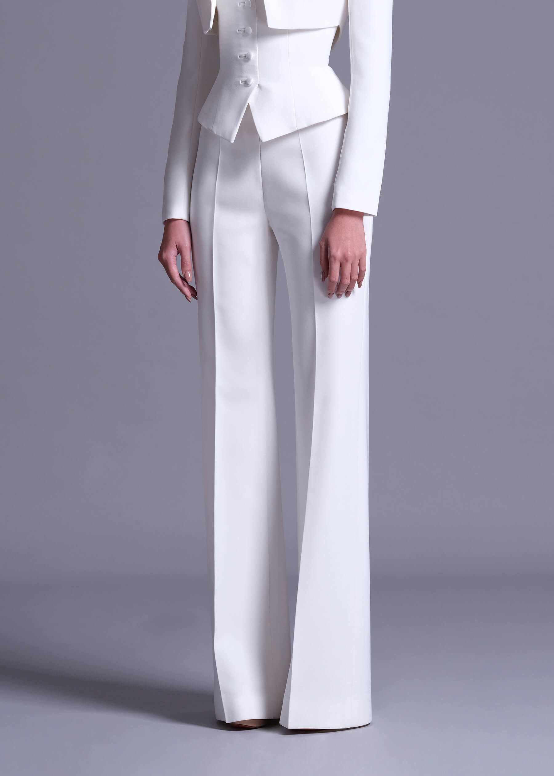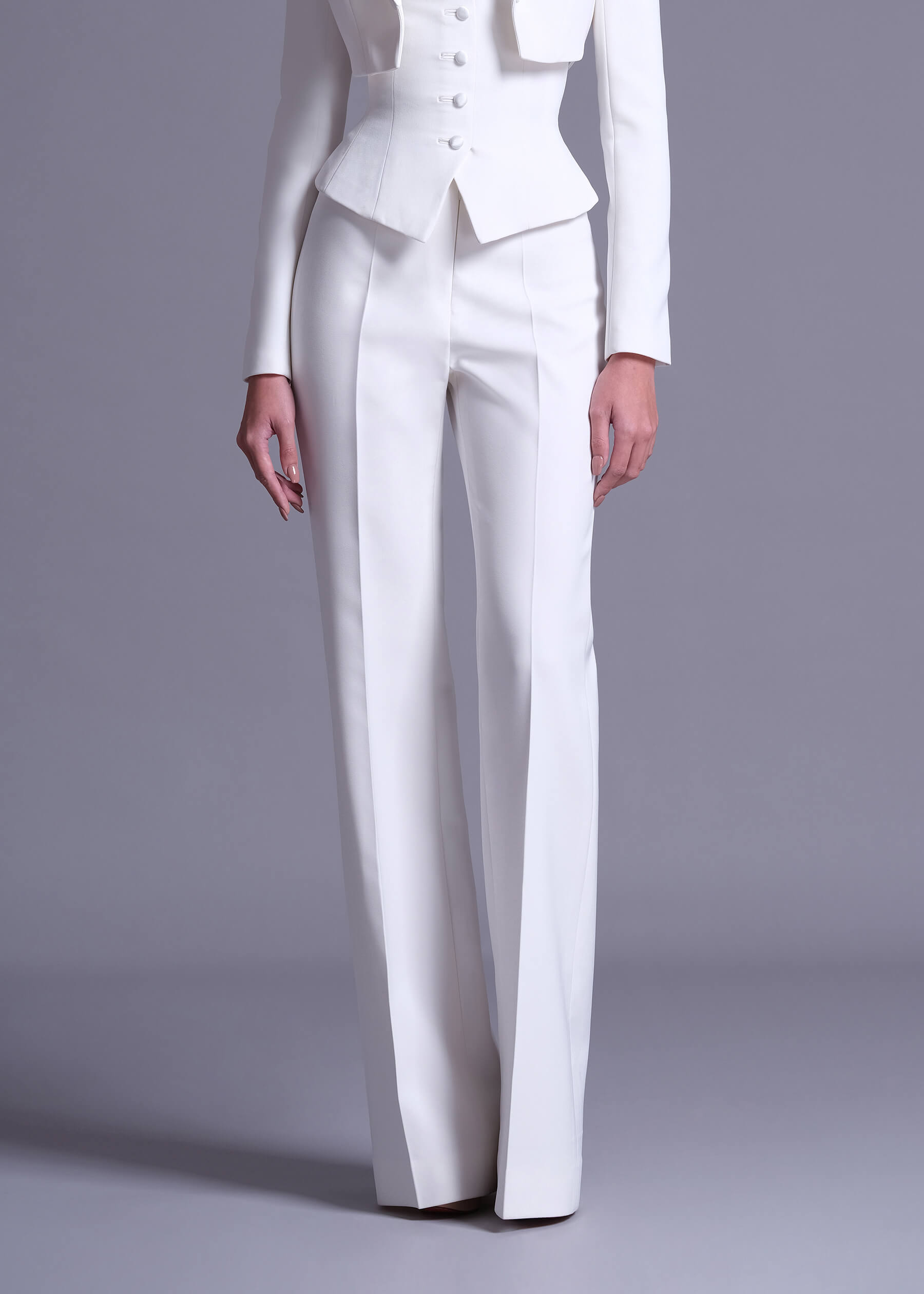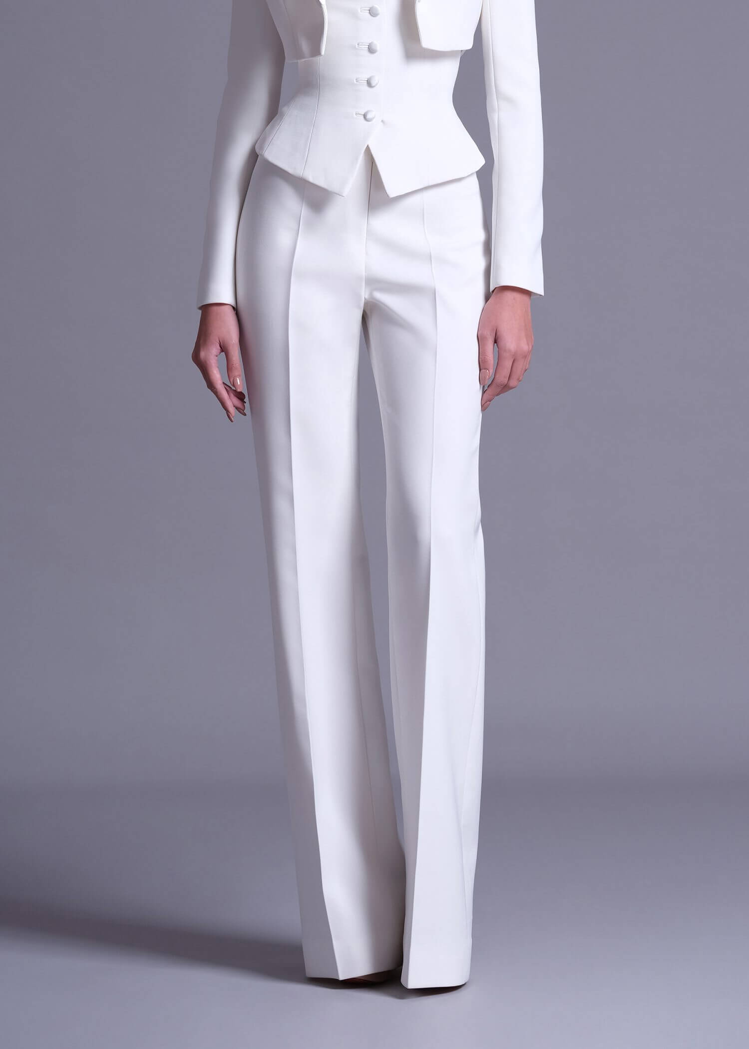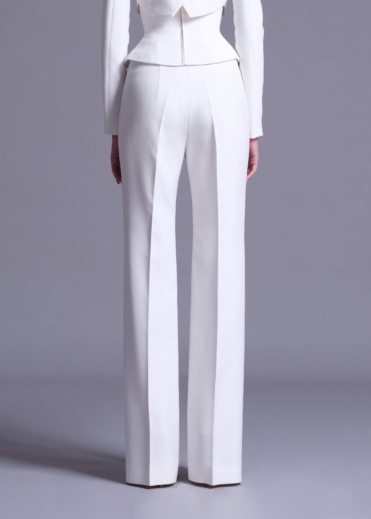 Off-White Polyester High-Waist Trousers, meticulously designed for both sophistication and ease. These trousers feature a refined off-white color that radiates classic elegance and versatility. Made from high-quality polyester, they offer a flattering high-waist design that enhances your silhouette and provides a tailored fit. Perfect for pairing with blouses or tops, their versatile style ensures effortless elegance for various occasions.