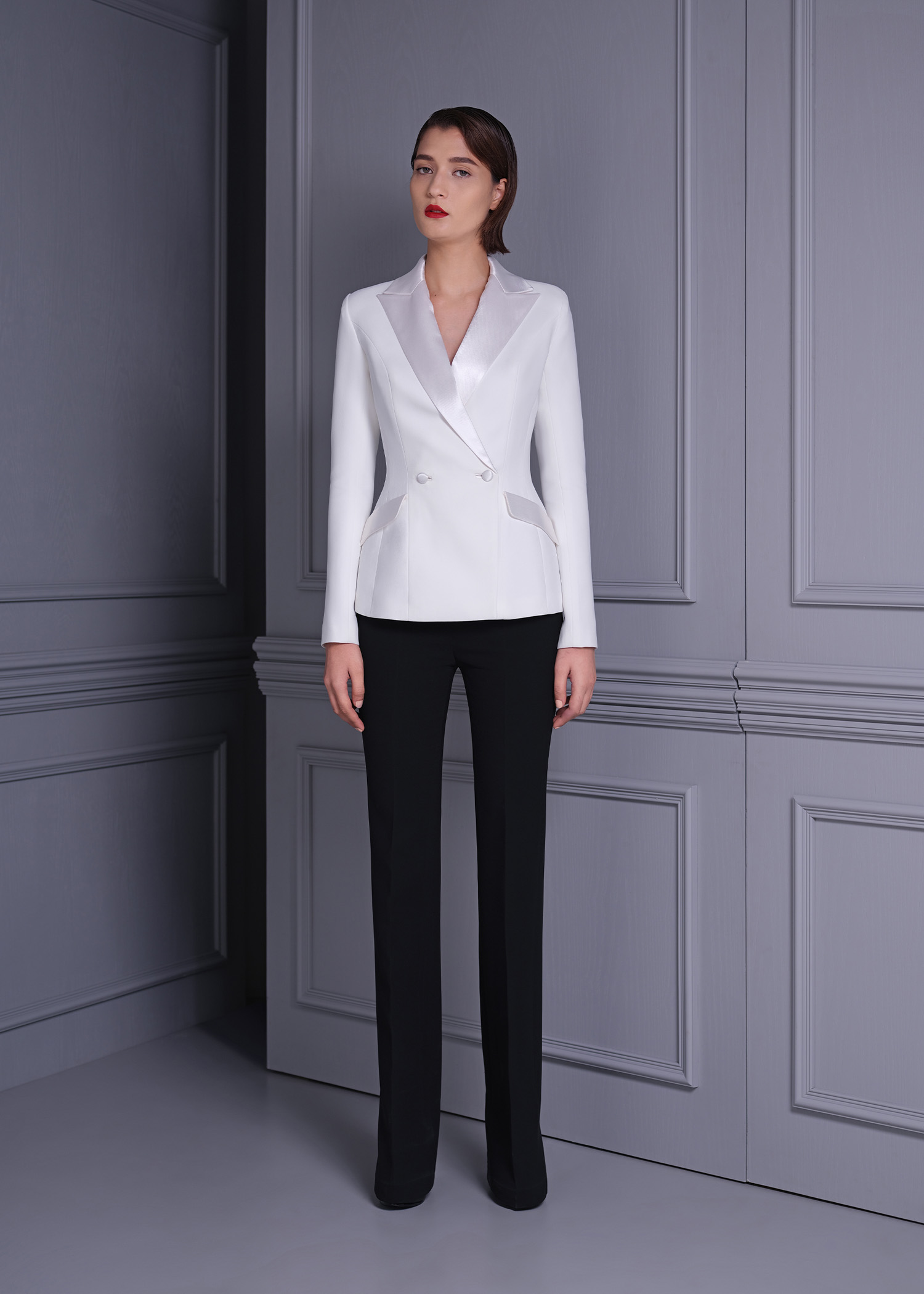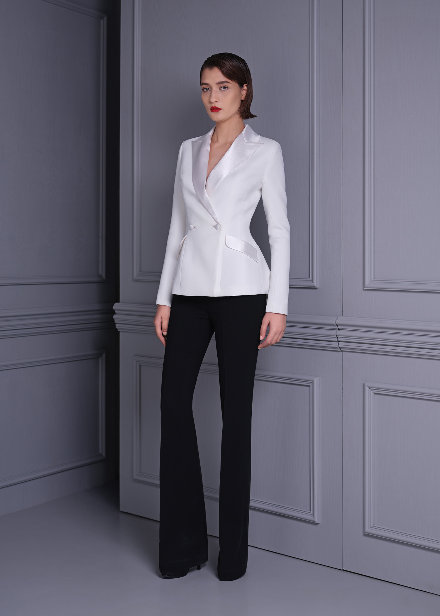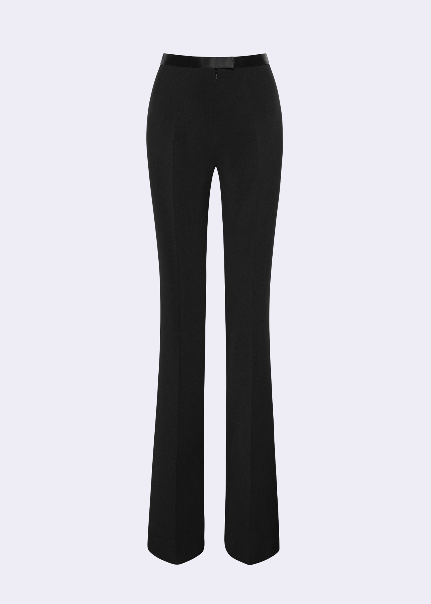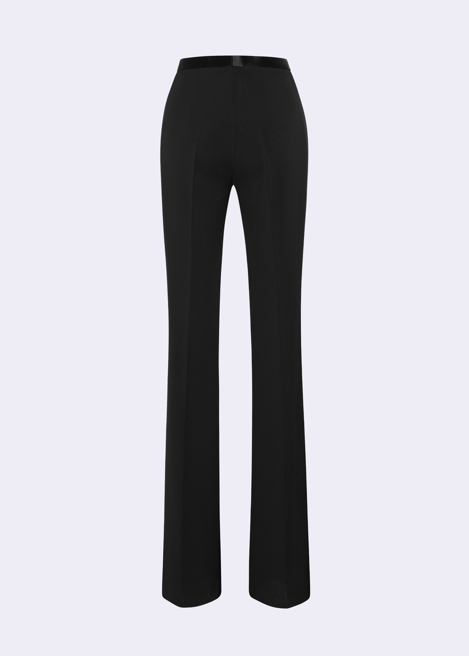 “Nadja” Black Polyester Semi-Flare Trousers, meticulously designed for both style and ease. These trousers feature a sleek black color and a satin-crepe waistband that adds a touch of luxurious detail. Crafted in a semi-flare silhouette, they offer a flattering fit that enhances your silhouette beautifully. Perfect for pairing with blouses or tops, their versatile design ensures effortless elegance for various occasions. Our trousers are a staple for those who appreciate refined fashion with a contemporary twist.