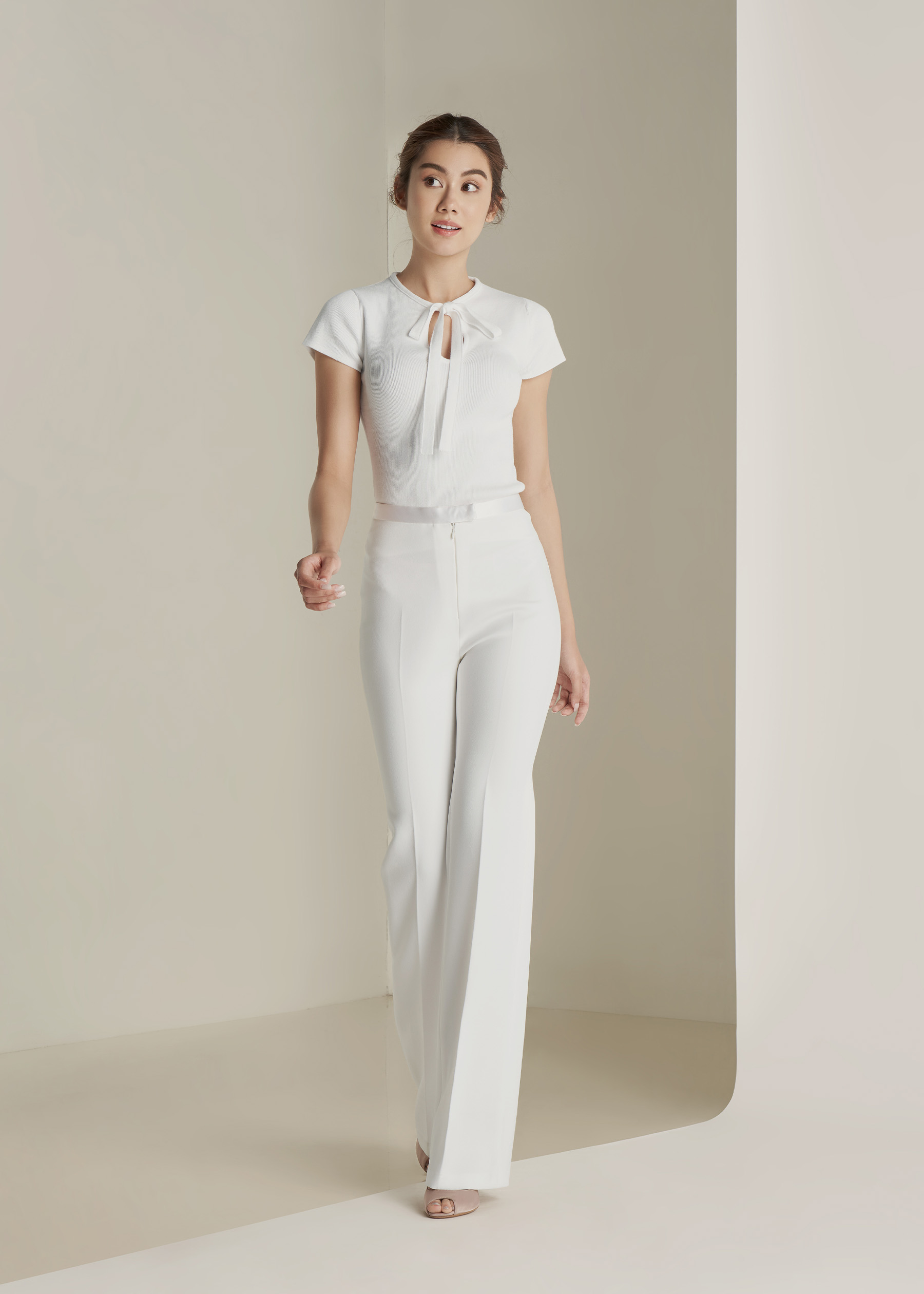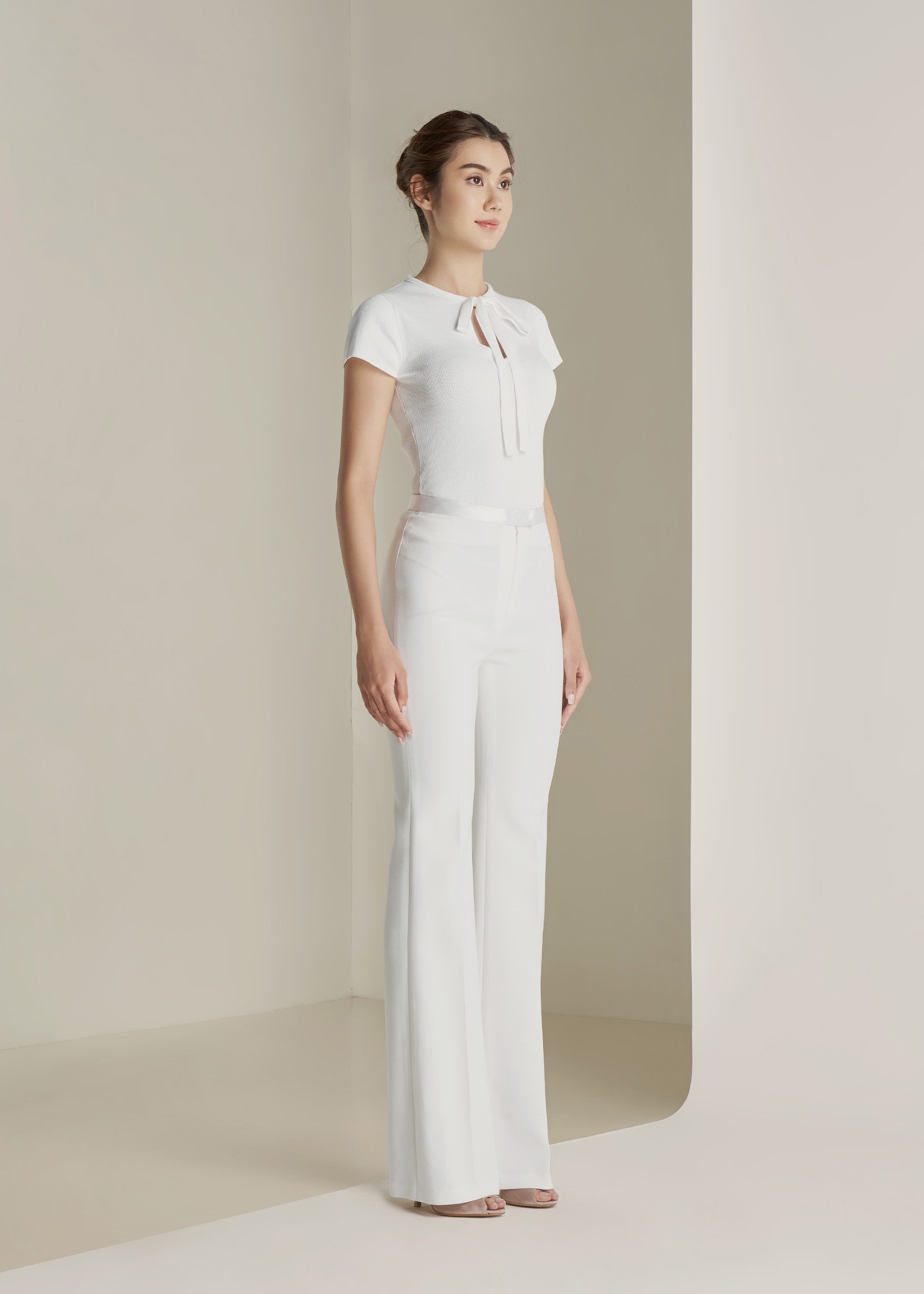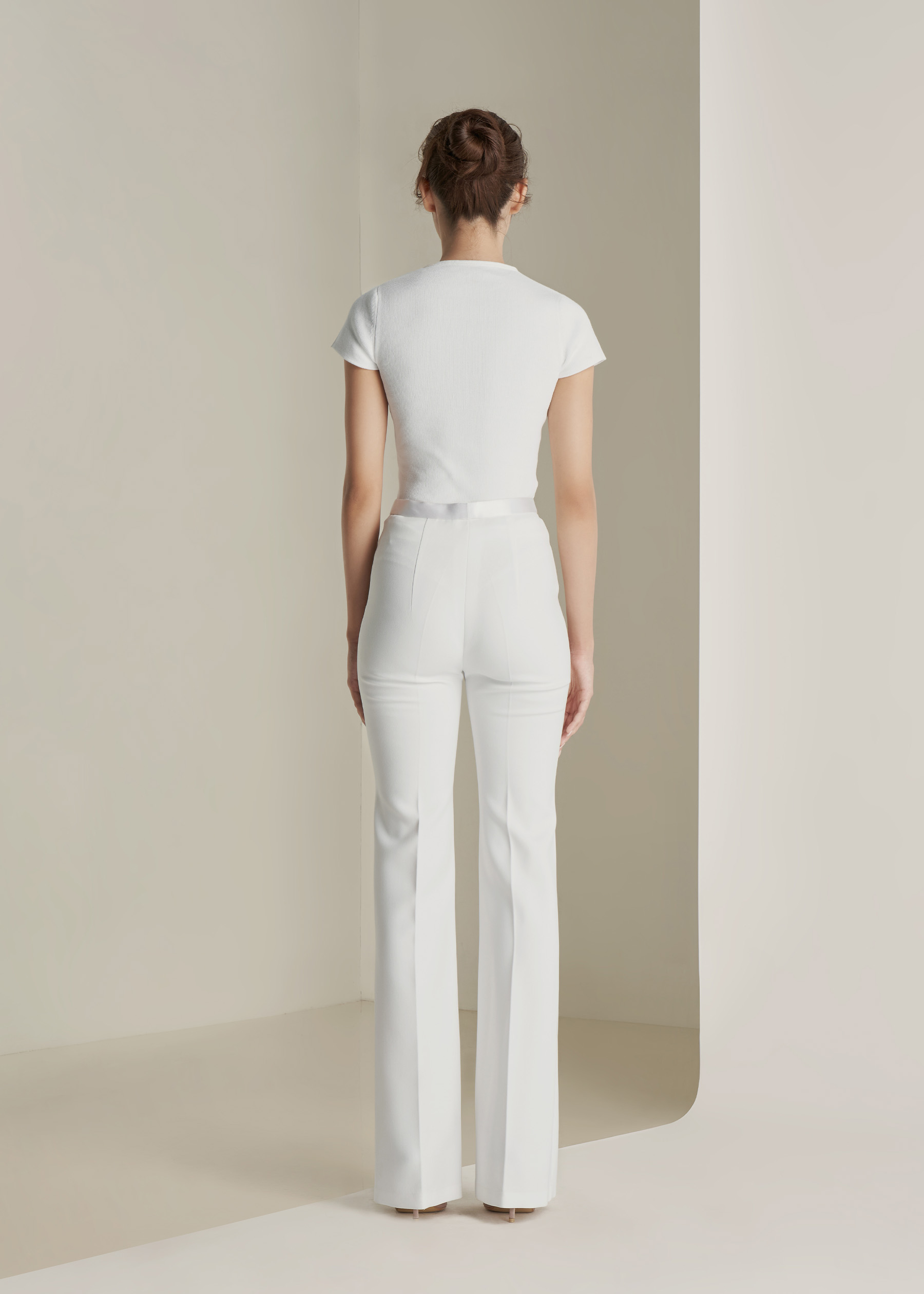 “Nadja” Off-White Semi-Flare Trousers, meticulously crafted for both style and ease. These trousers feature a soft off-white color and a satin-crepe waistband that adds a touch of luxurious elegance. Designed in a semi-flare silhouette, they offer a flattering fit that transitions seamlessly from day to night. Ideal for pairing with blouses or tops, their versatile design ensures effortless style for various occasions. Our trousers are a must-have for those who appreciate refined fashion with a contemporary twist.