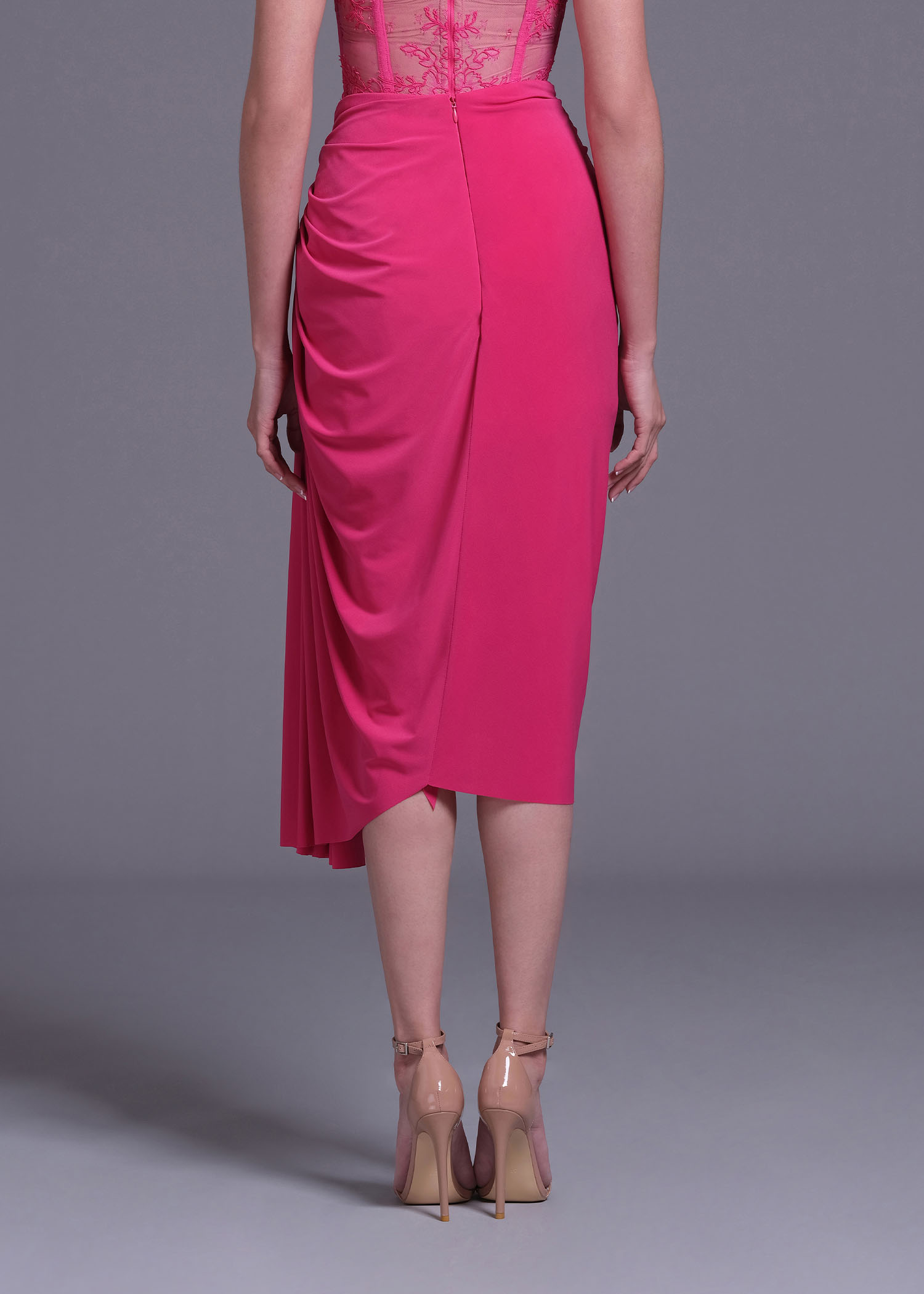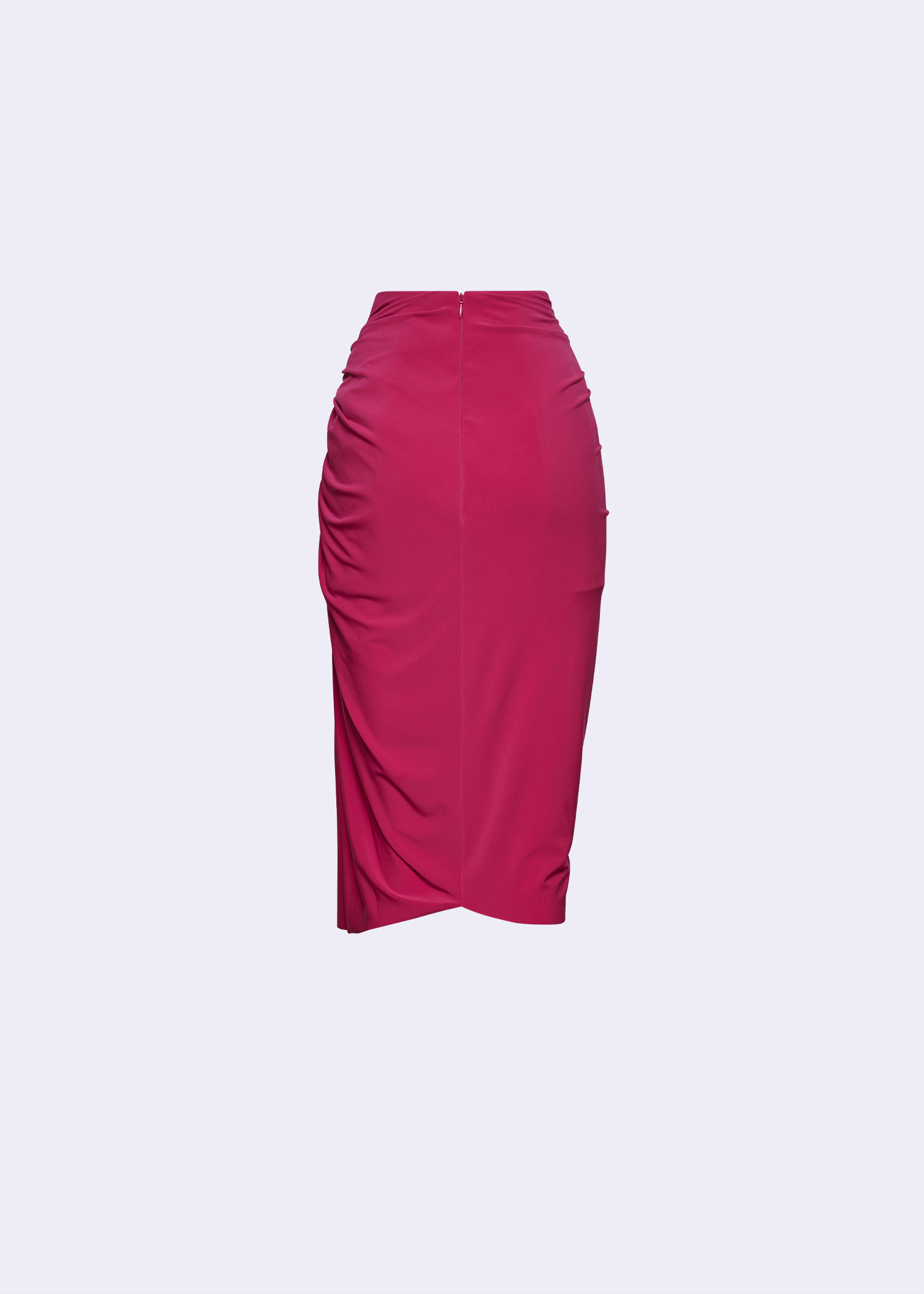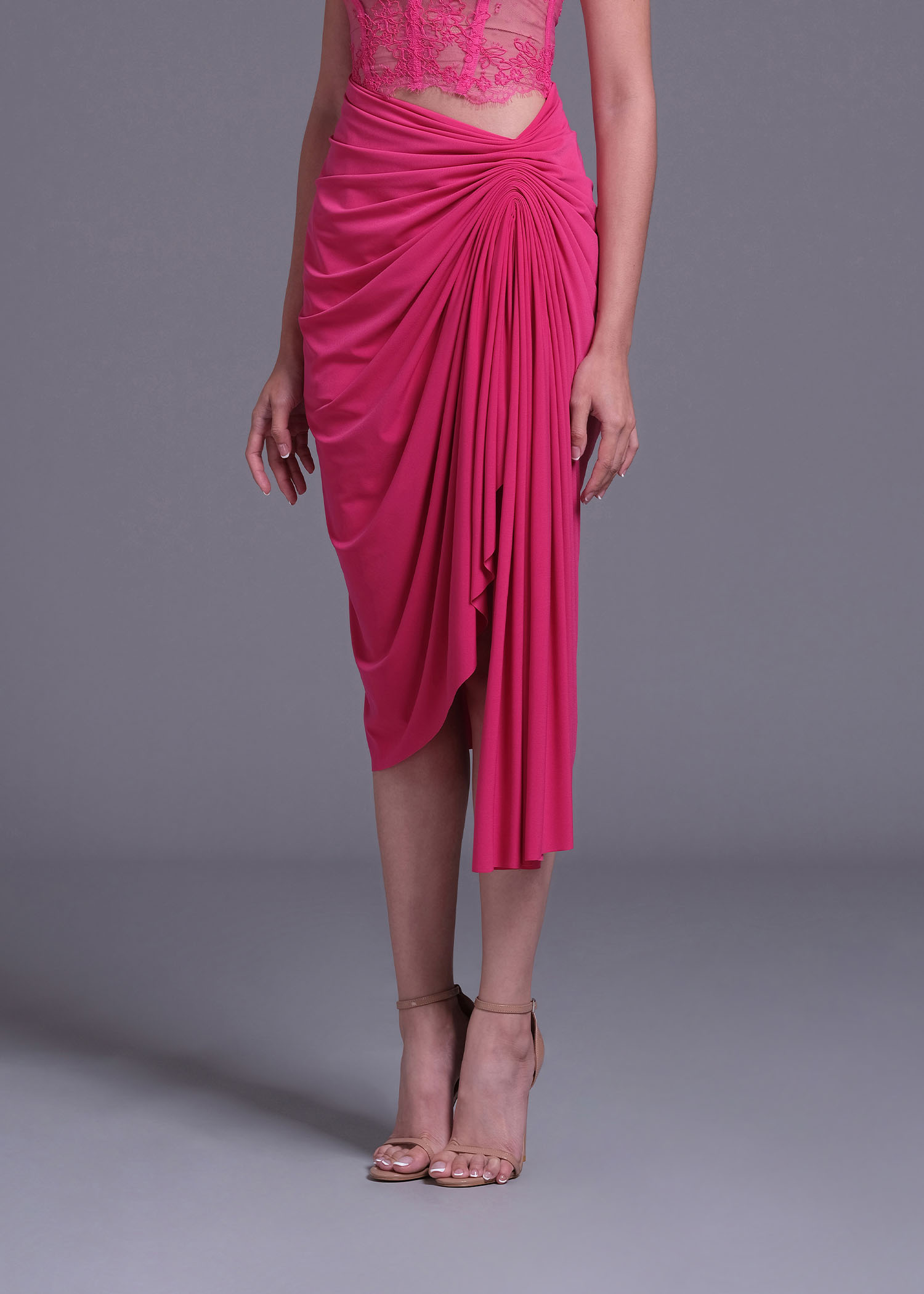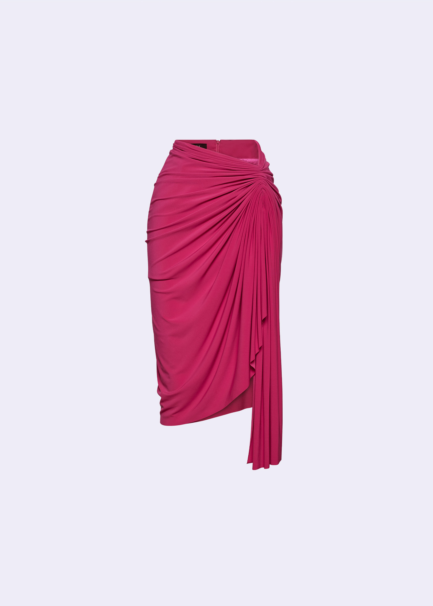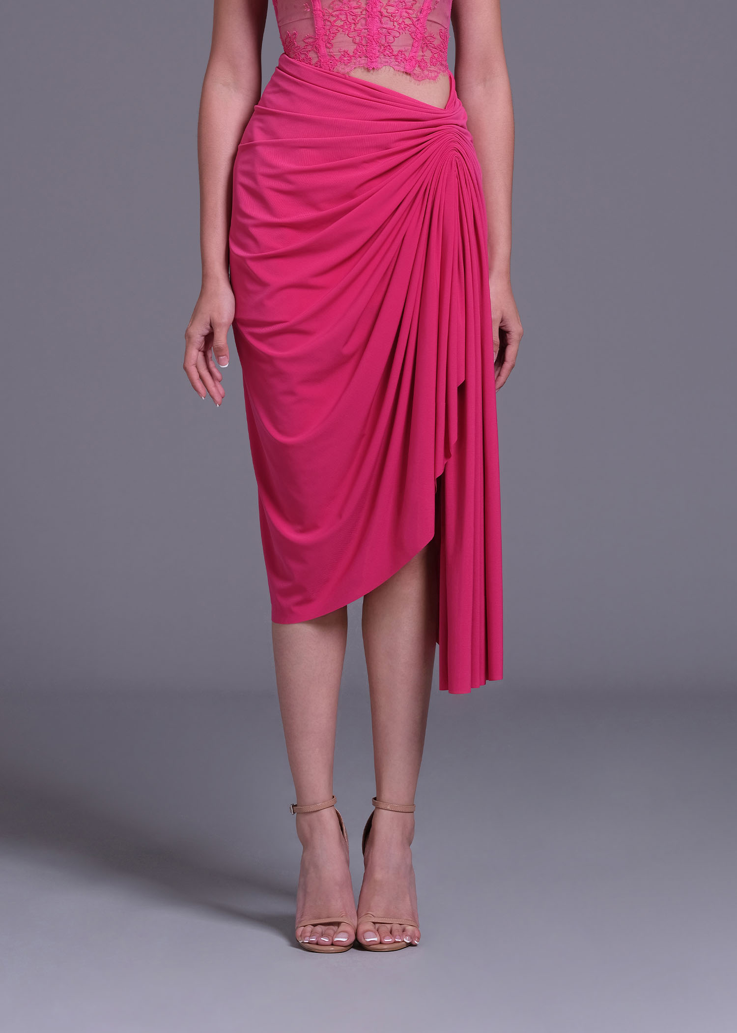 Our magenta polyester spandex draped asymmetric midi skirt. The soft fabric blend offers comfort and flexibility, while the draped design adds a touch of sophistication. Ideal for pairing with heels or flats.