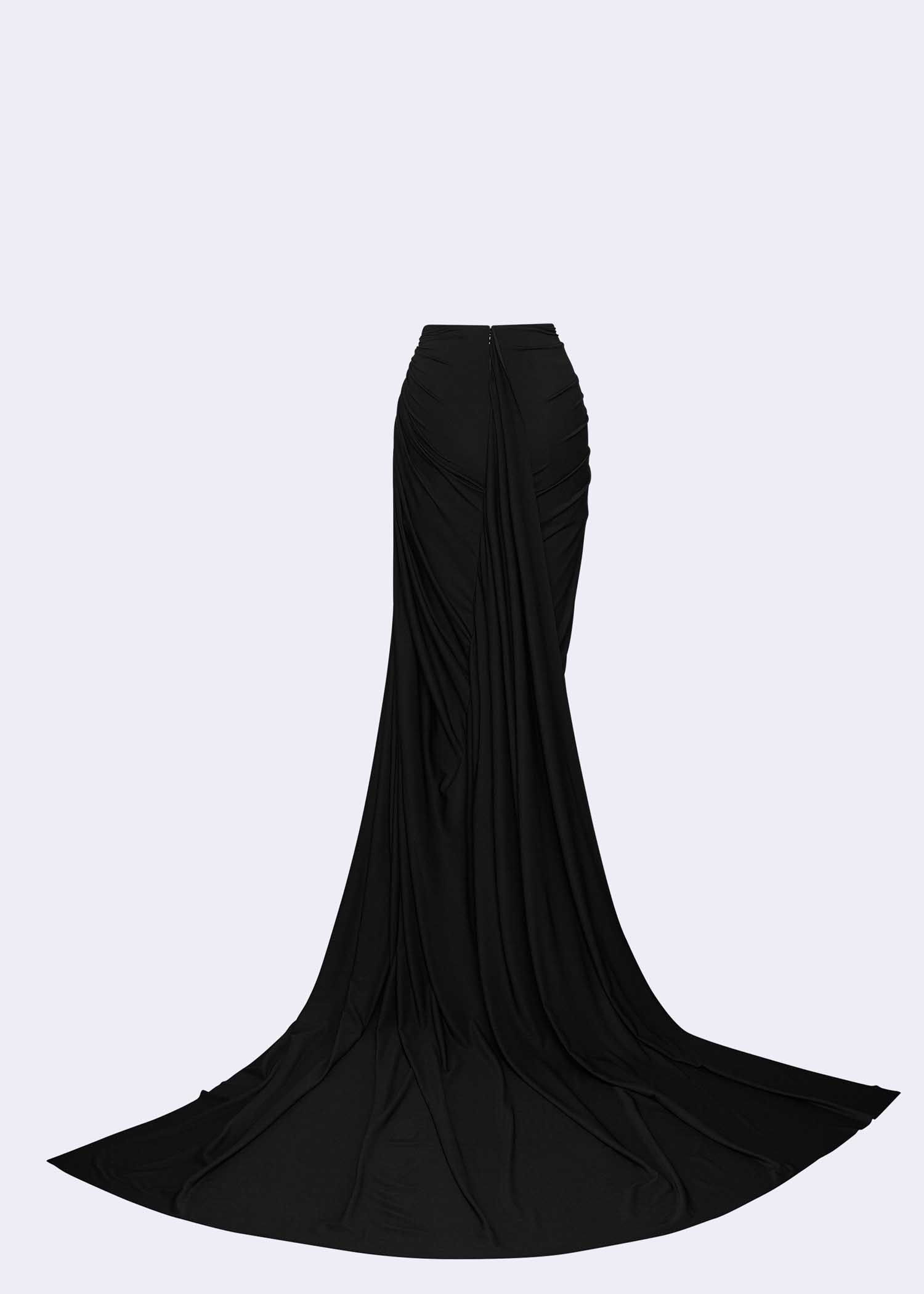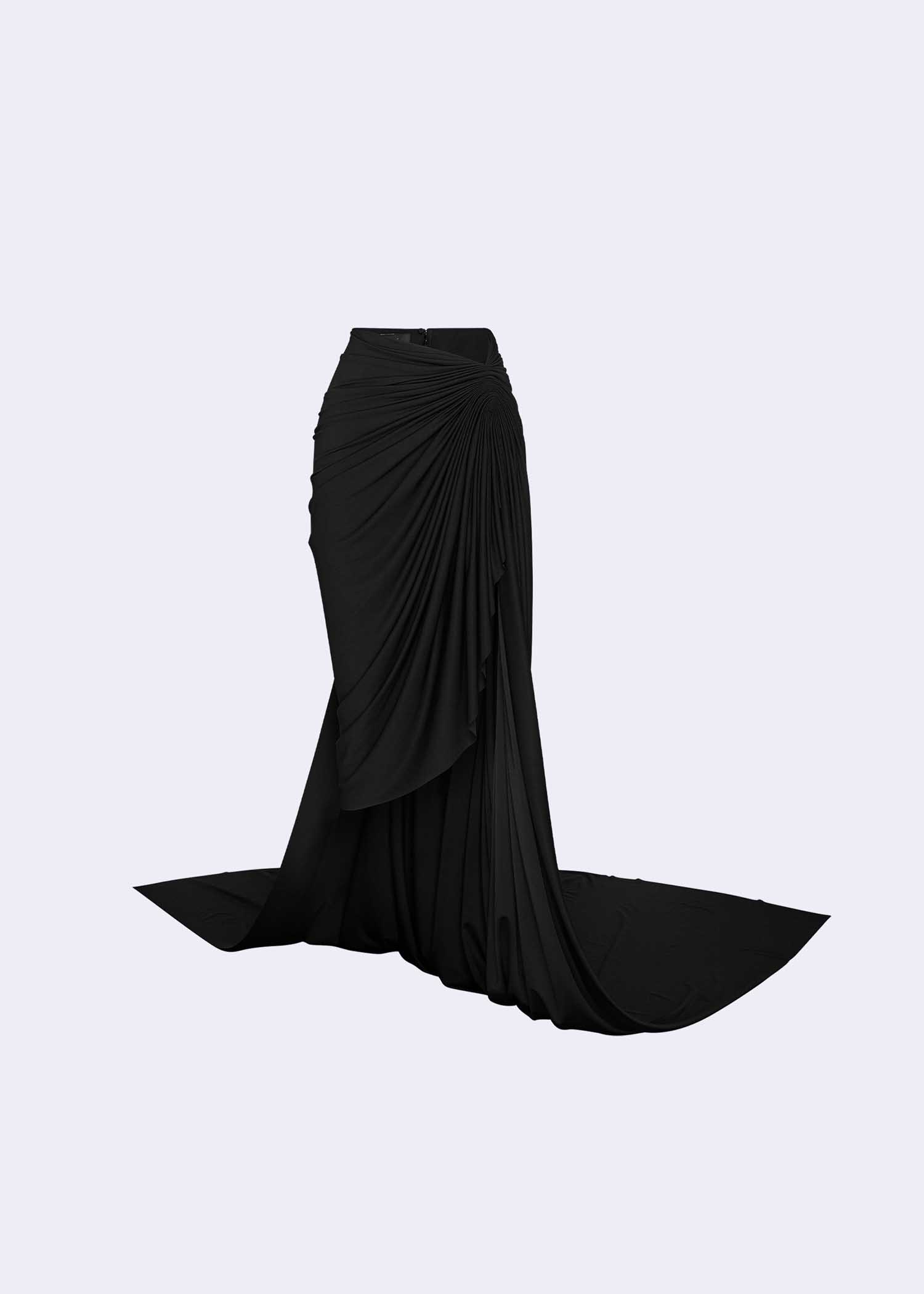Elevate your attire with our black draped asymmetric midi skirt. Designed to gracefully flow with your movements, this floor-length skirt features an asymmetrical hem that adds a modern touch. Ideal for weddings, galas, or any formal event where elegance is key.