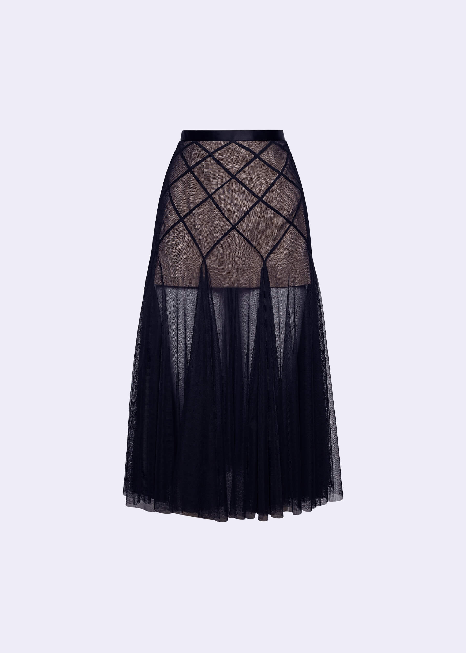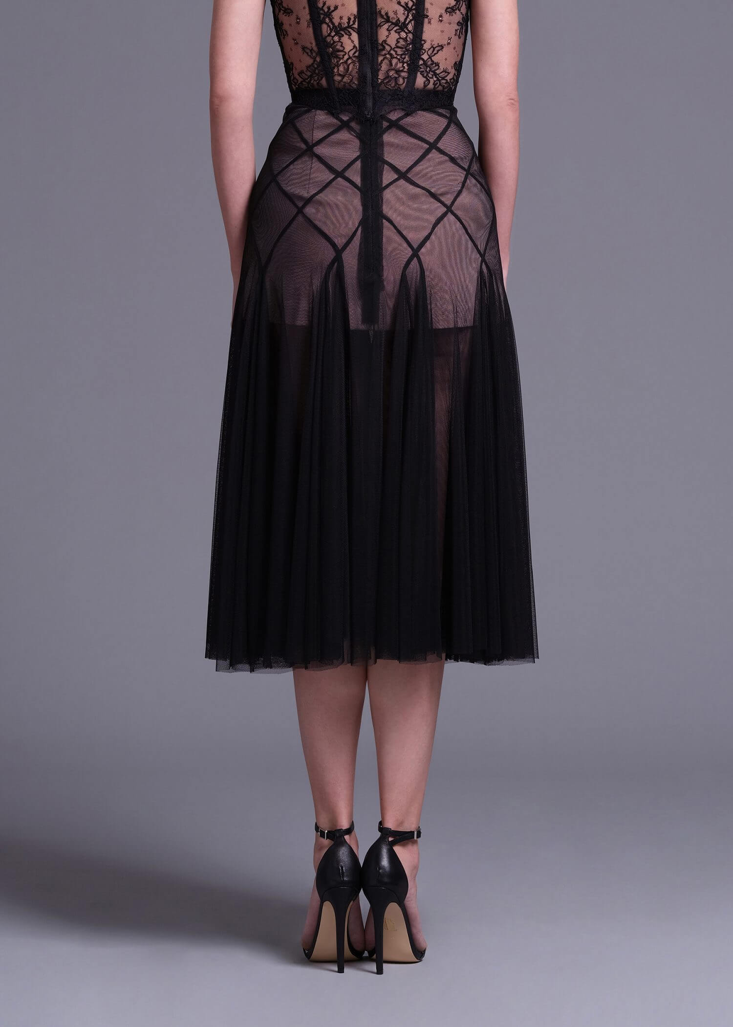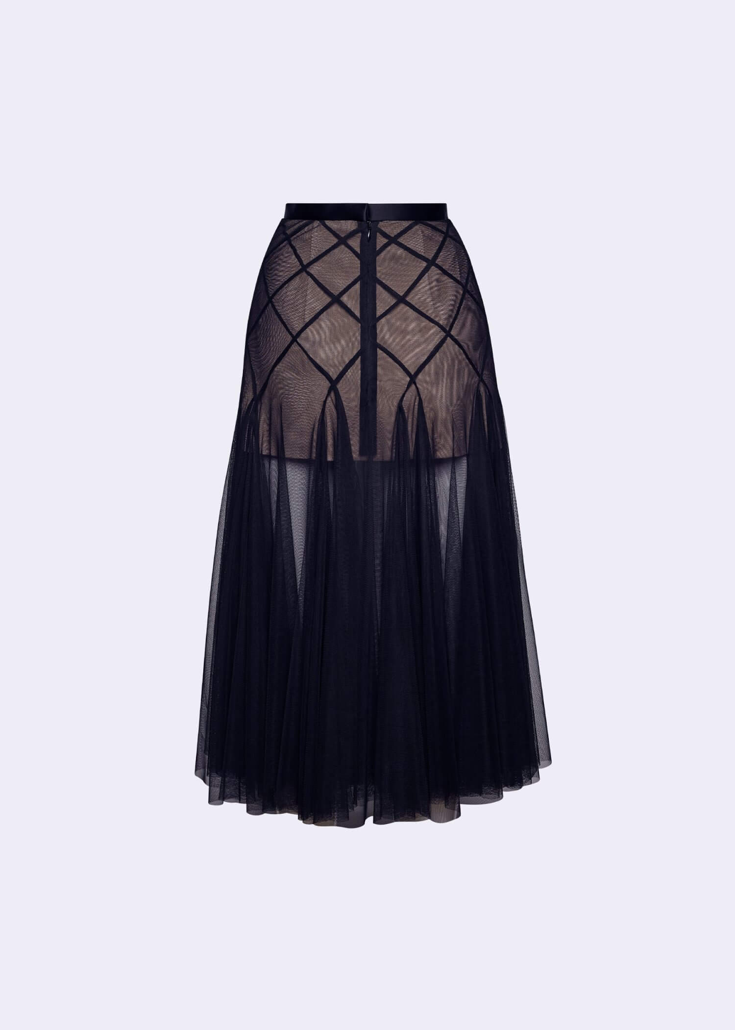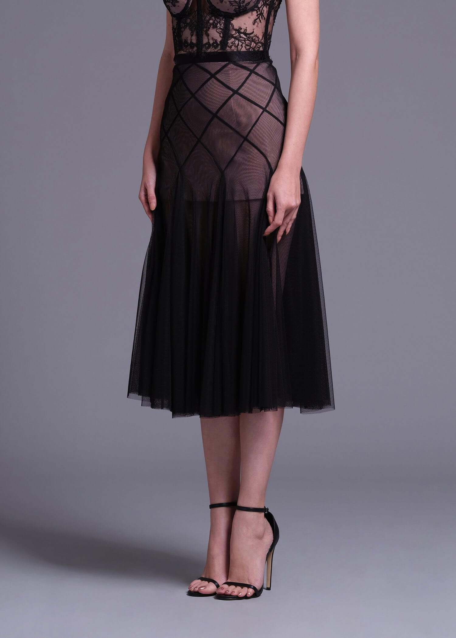 The “Datura” black polyester net skirt with nude lining, a captivating piece that effortlessly blends elegance and modern style. This skirt features a unique double layer intertwine-cut design, creating a visually stunning look that is perfect for any occasion. Crafted from high-quality polyester net with a soft nude lining, the “Datura” skirt offers a comfortable and luxurious feel. The intricate intertwine-cut design adds depth and movement to the skirt. Whether you’re dressing up for a special event or looking for a chic everyday outfit. Pair it with a blouse and heels for a polished look or keep it casual with a simple top and flats.