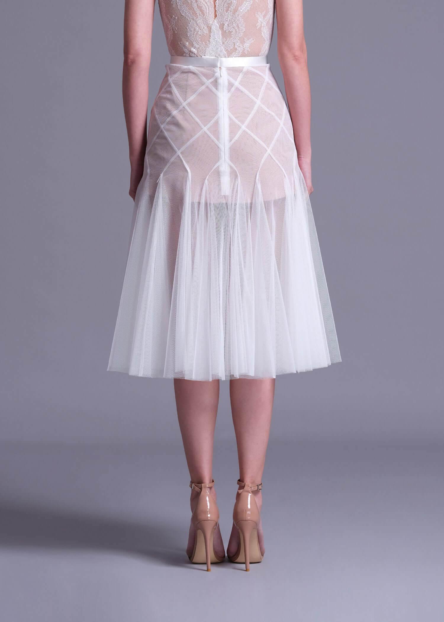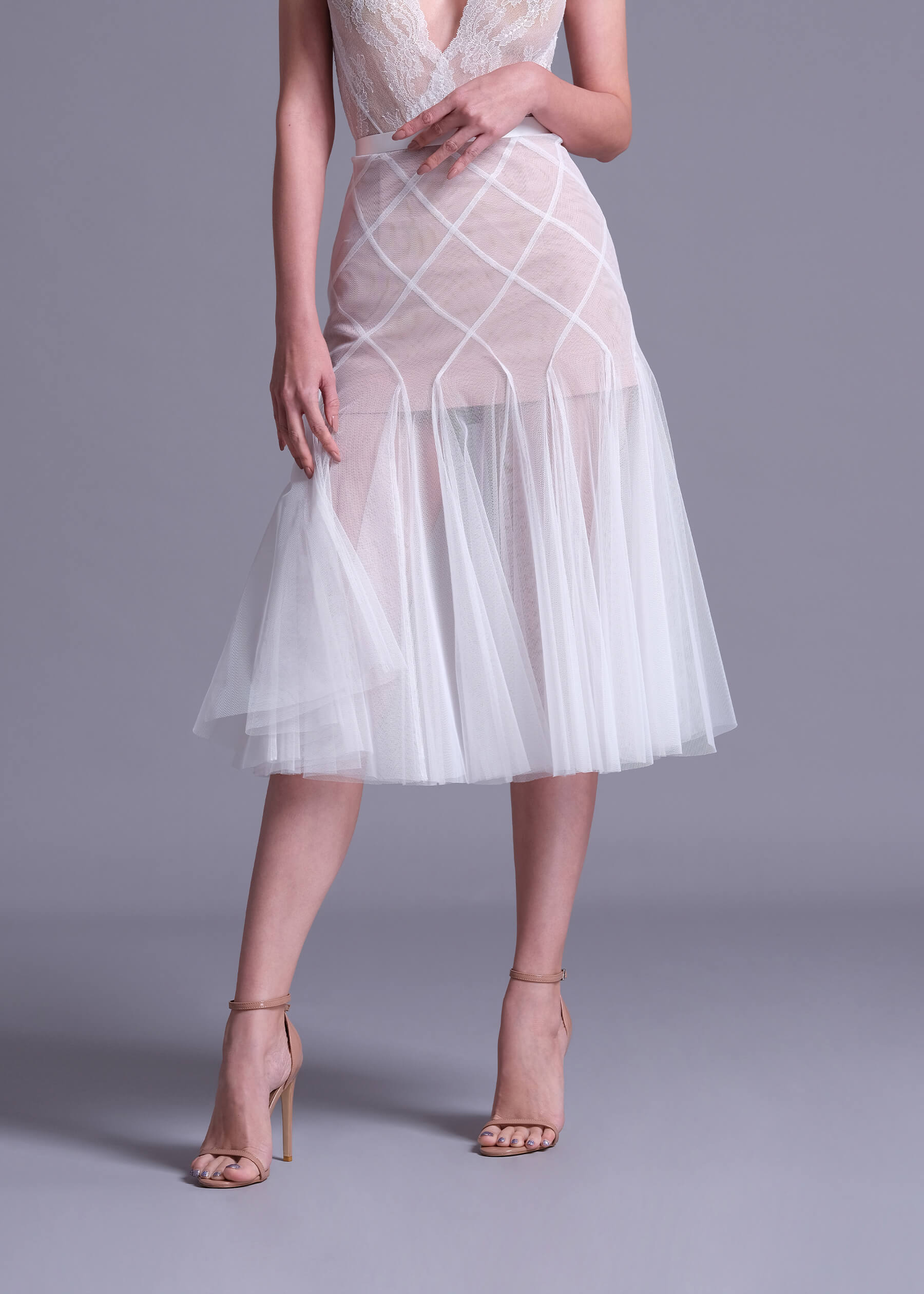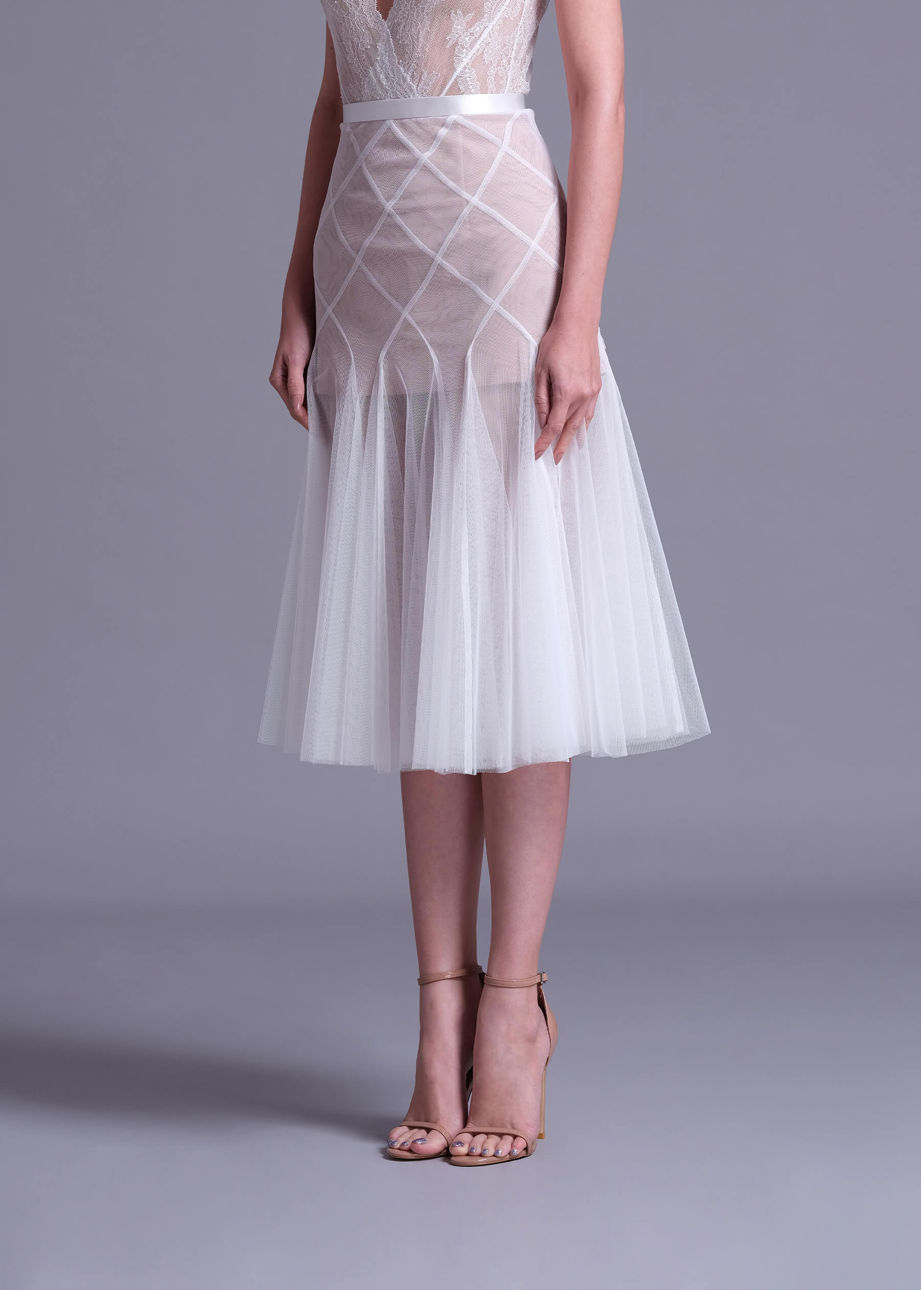 The “Datura” off-white polyester net skirt with nude lining, a captivating piece that effortlessly blends elegance and modern style. This skirt features a unique double layer intertwine-cut design, creating a visually stunning look that is perfect for any occasion. Crafted from high-quality polyester net with a soft nude lining, the “Datura” skirt offers a comfortable and luxurious feel. The intricate intertwine-cut design adds depth and movement to the skirt. Whether you’re dressing up for a special event or looking for a chic everyday outfit. Pair it with a blouse and heels for a polished look or keep it casual with a simple top and flats.