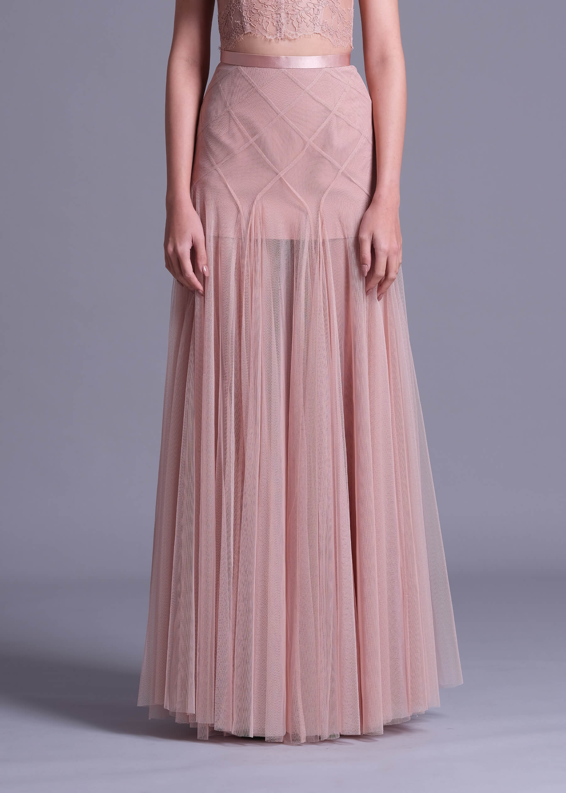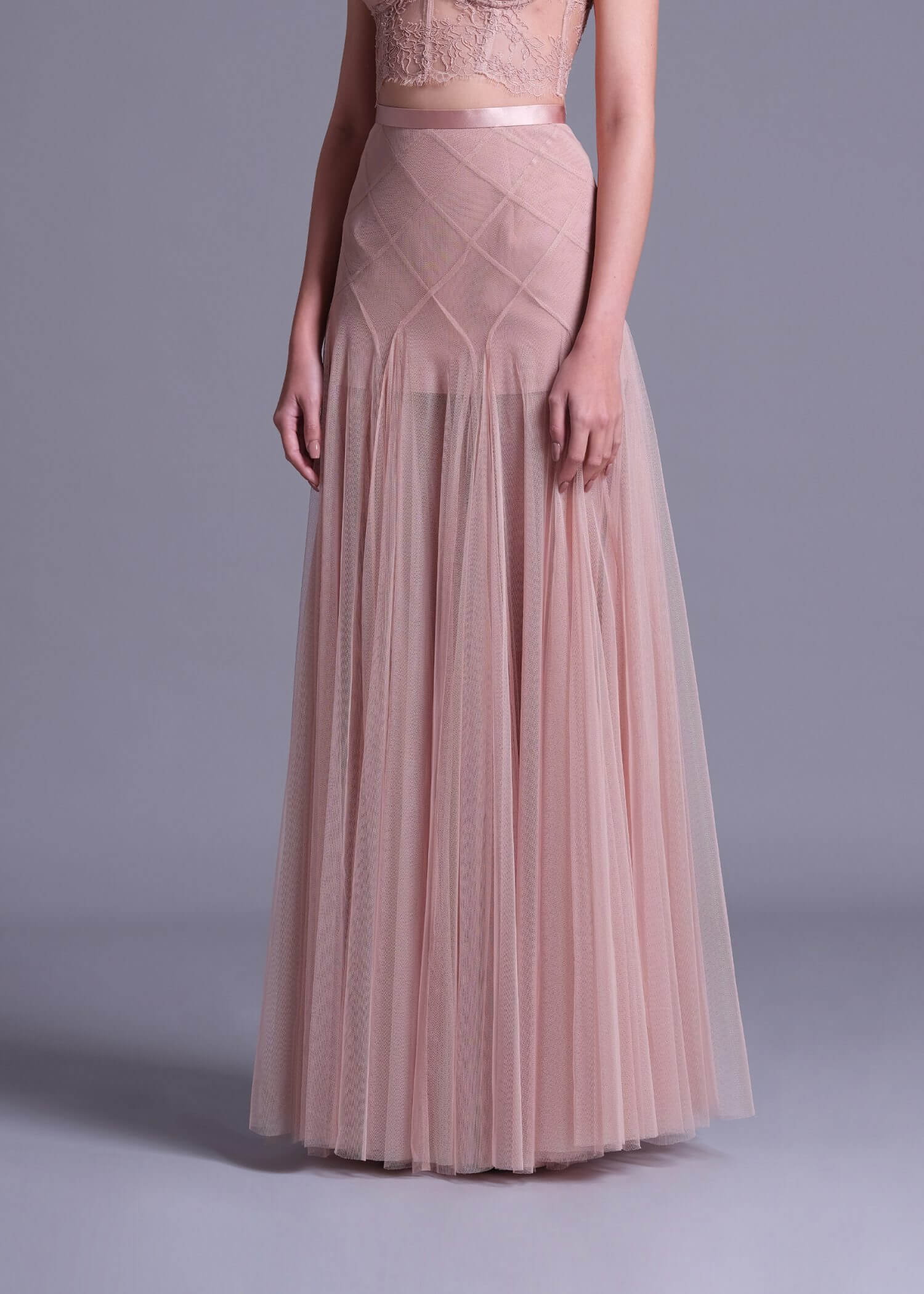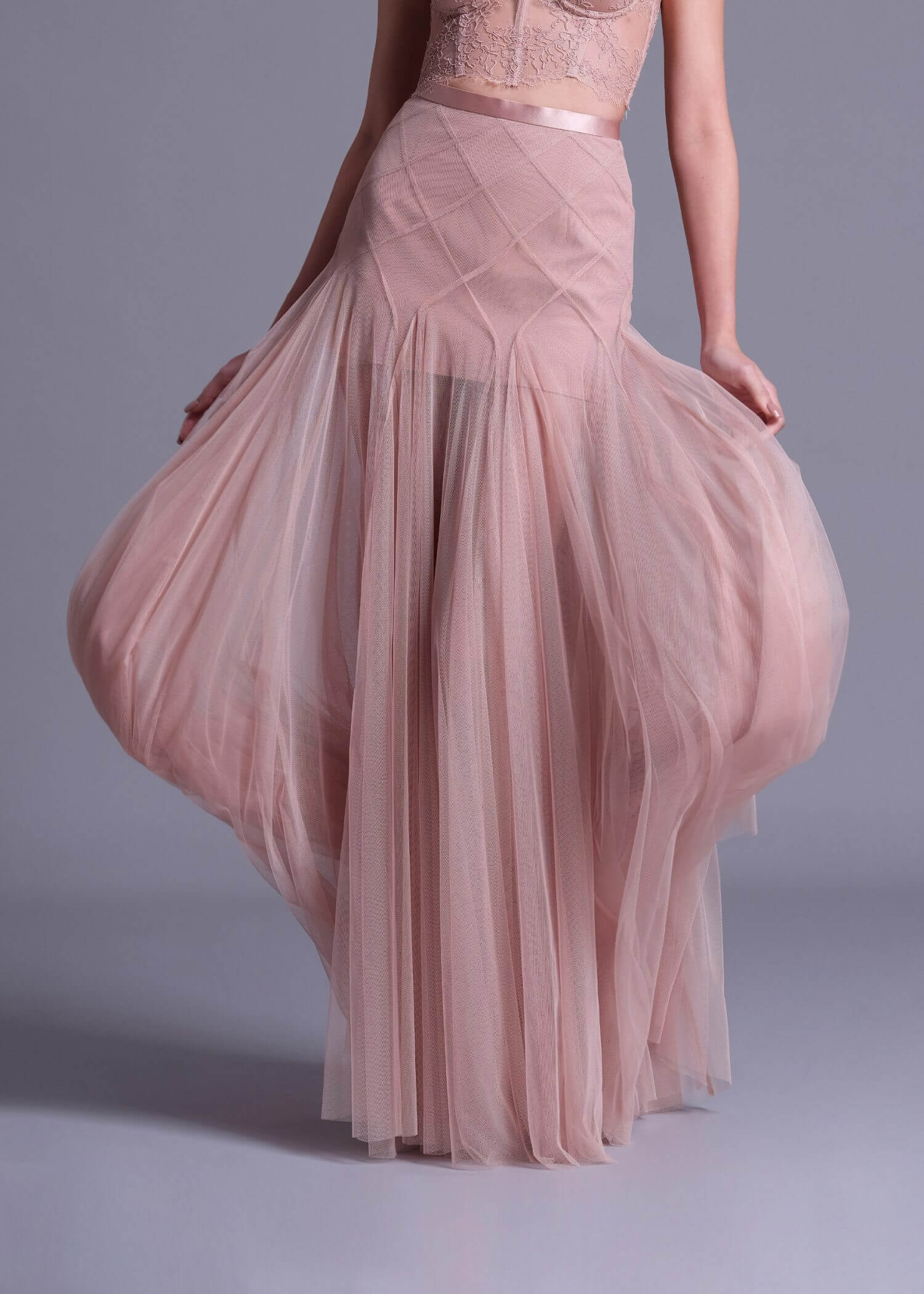 The “Datura” skirt, meticulously crafted from luxurious nude polyester net and adorned with a seamless nude lining. This exquisite combination offers a sophisticated allure that is both refined and timeless. The skirt features a double layer design with an intricate intertwine-cut pattern, enhancing its visual appeal with every sway. Its floor-length silhouette exudes grace and poise, making it ideal for formal events and special occasions. Whether paired with a sleek blouse for a polished look or styled with a delicate top for a hint of casual charm. Experience the epitome of feminine sophistication with the “Datura” double layer skirt, where impeccable craftsmanship meets modern elegance.