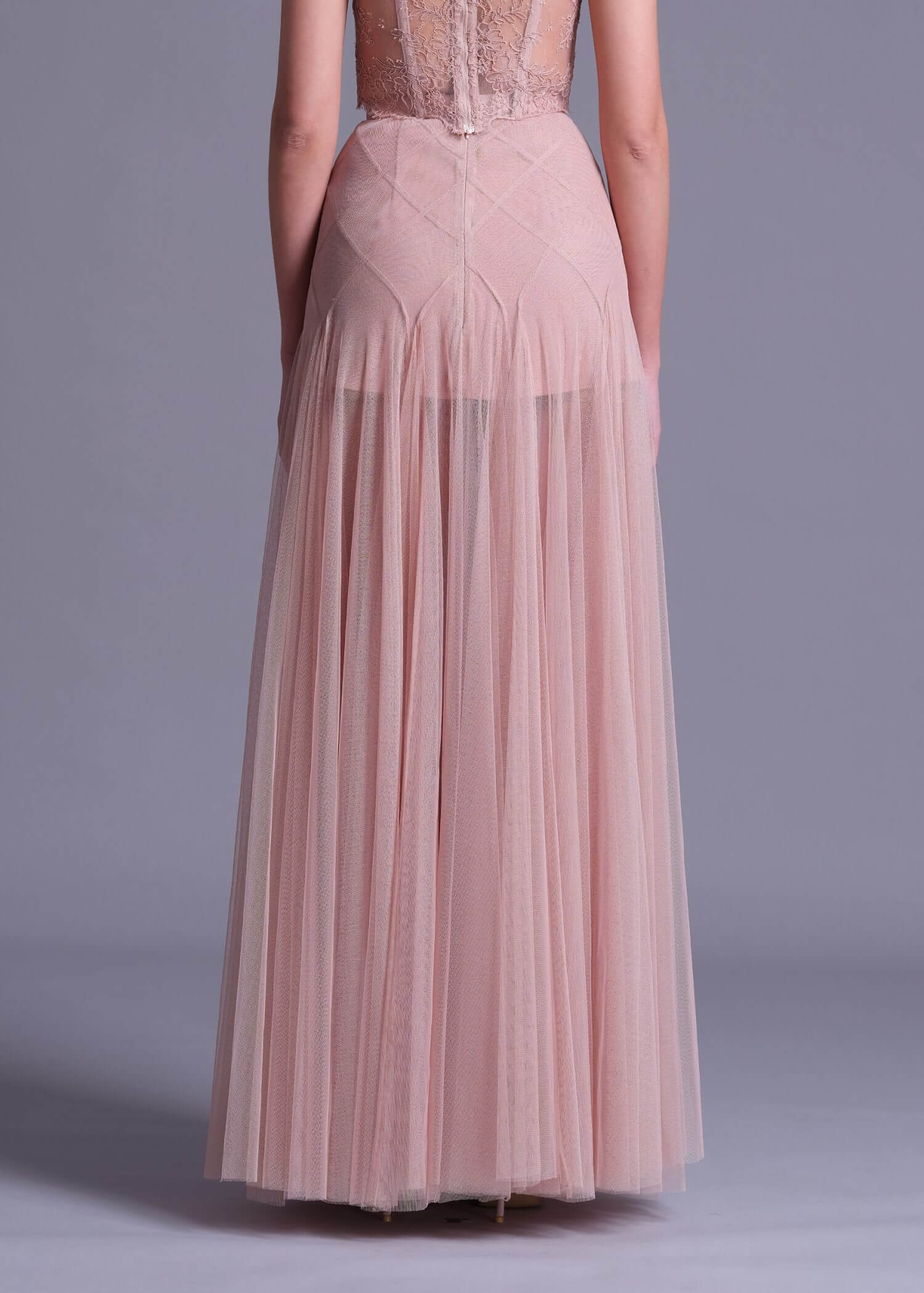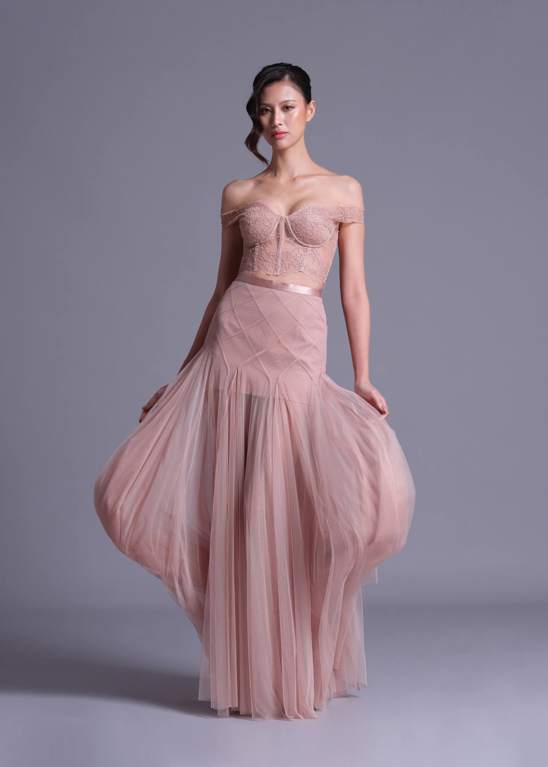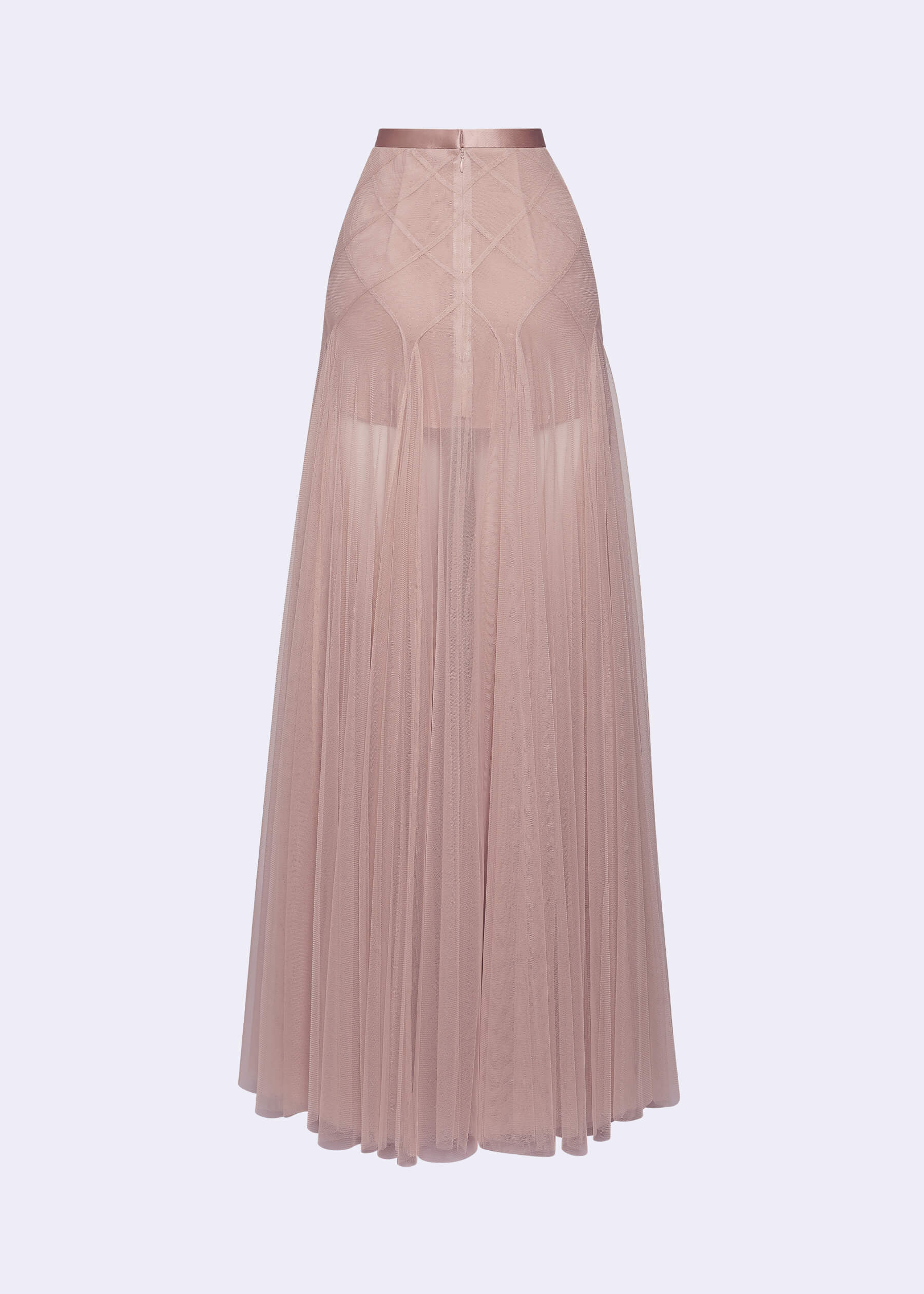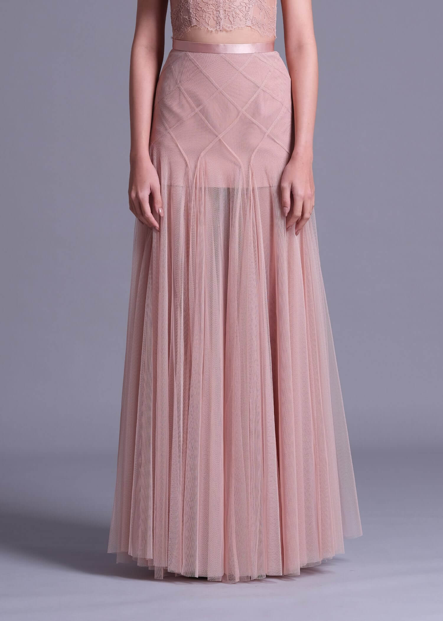 The “Datura” skirt, meticulously crafted from luxurious nude polyester net and adorned with a seamless nude lining. This exquisite combination offers a sophisticated allure that is both refined and timeless. The skirt features a double layer design with an intricate intertwine-cut pattern, enhancing its visual appeal with every sway. Its floor-length silhouette exudes grace and poise, making it ideal for formal events and special occasions. Whether paired with a sleek blouse for a polished look or styled with a delicate top for a hint of casual charm. Experience the epitome of feminine sophistication with the “Datura” double layer skirt, where impeccable craftsmanship meets modern elegance.