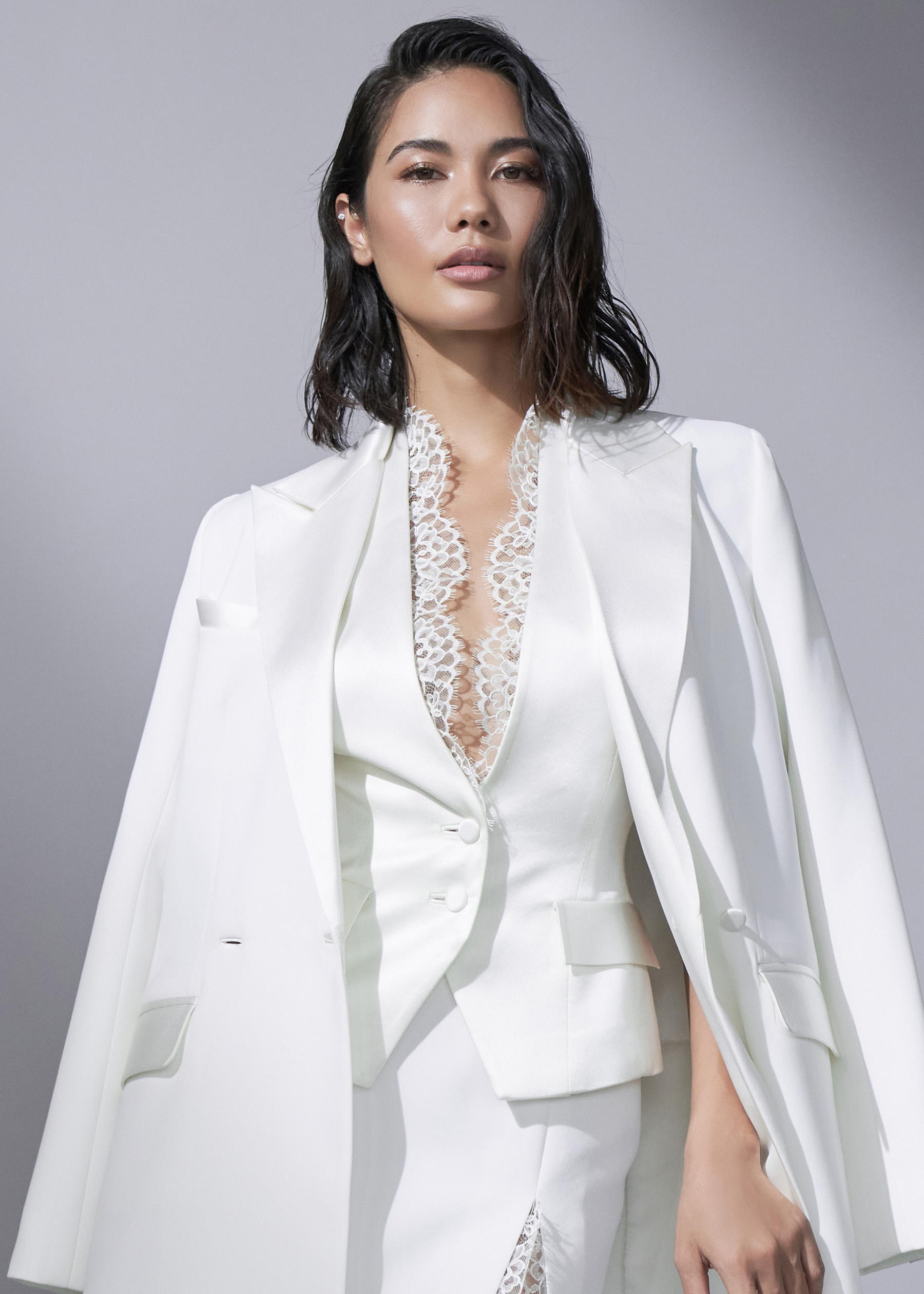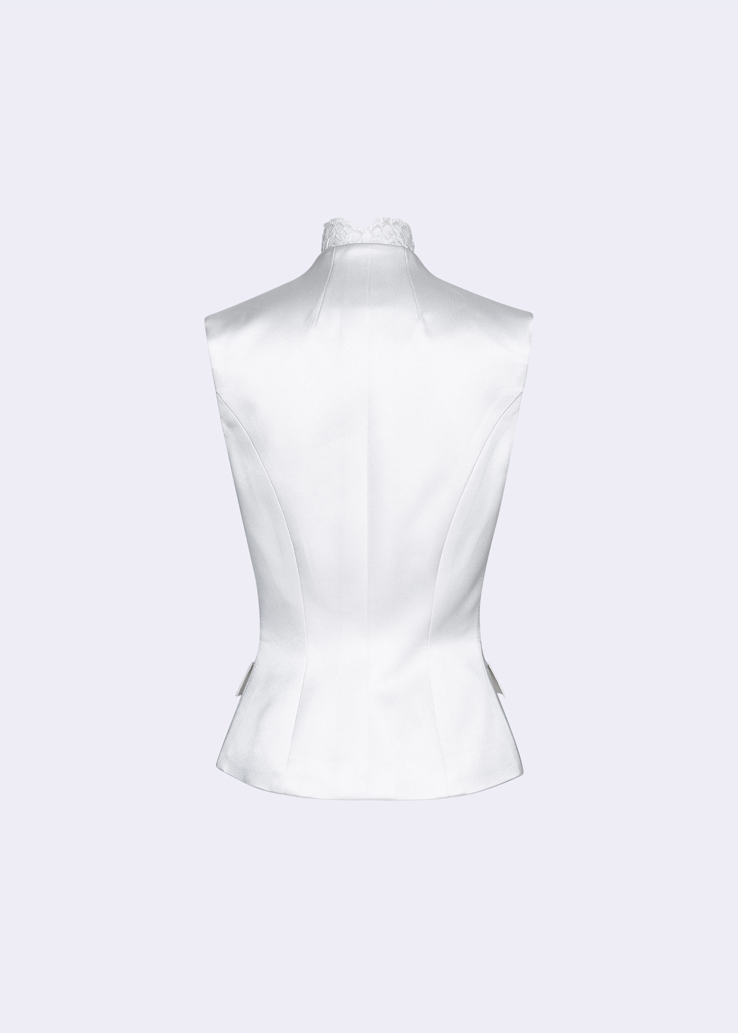 Off-White Waistcoat With Satin-Crepe & Lace Detail, crafted from luxurious satin-crepe fabric adorned with delicate lace accents. This waistcoat features an elegant off-white color that exudes timeless elegance, complemented by intricate lace detailing for added charm. Perfect for layering over blouses or dresses, its versatile design enhances both formal and casual attire. Our lace detail waistcoat is a must-have for those who appreciate refined fashion with a touch of romance.