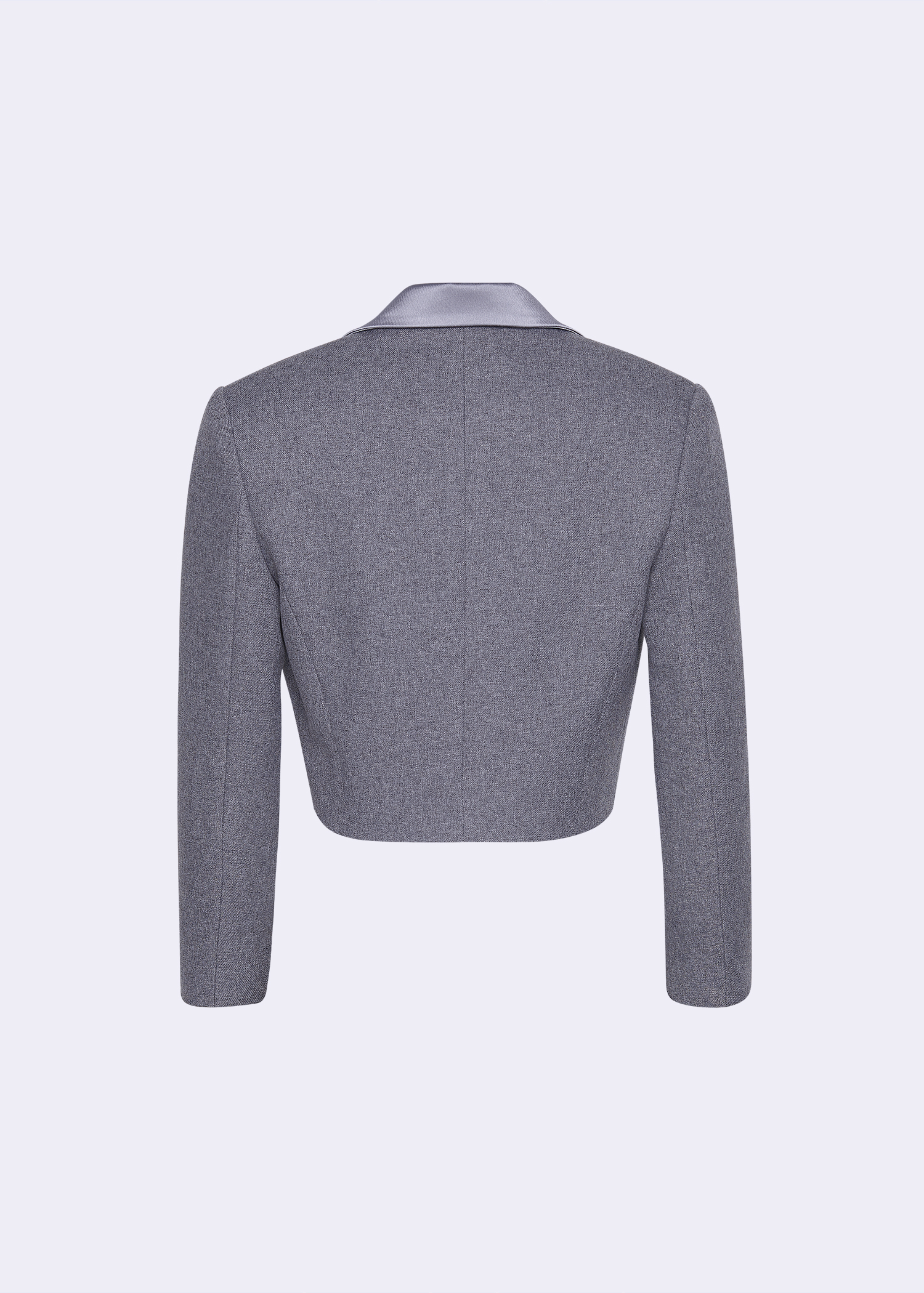 Grey Crop Jacket with Satin-Crepe Detail, crafted from quality polyester for comfort and durability. This crop jacket features a sleek grey hue and is adorned with sophisticated satin-crepe detailing, adding a touch of refined charm. Designed for both style and functionality, it offers a flattering cropped length that complements various outfits. Ideal for layering over dresses or pairing with high-waisted pants, its versatility ensures you look polished and confident.