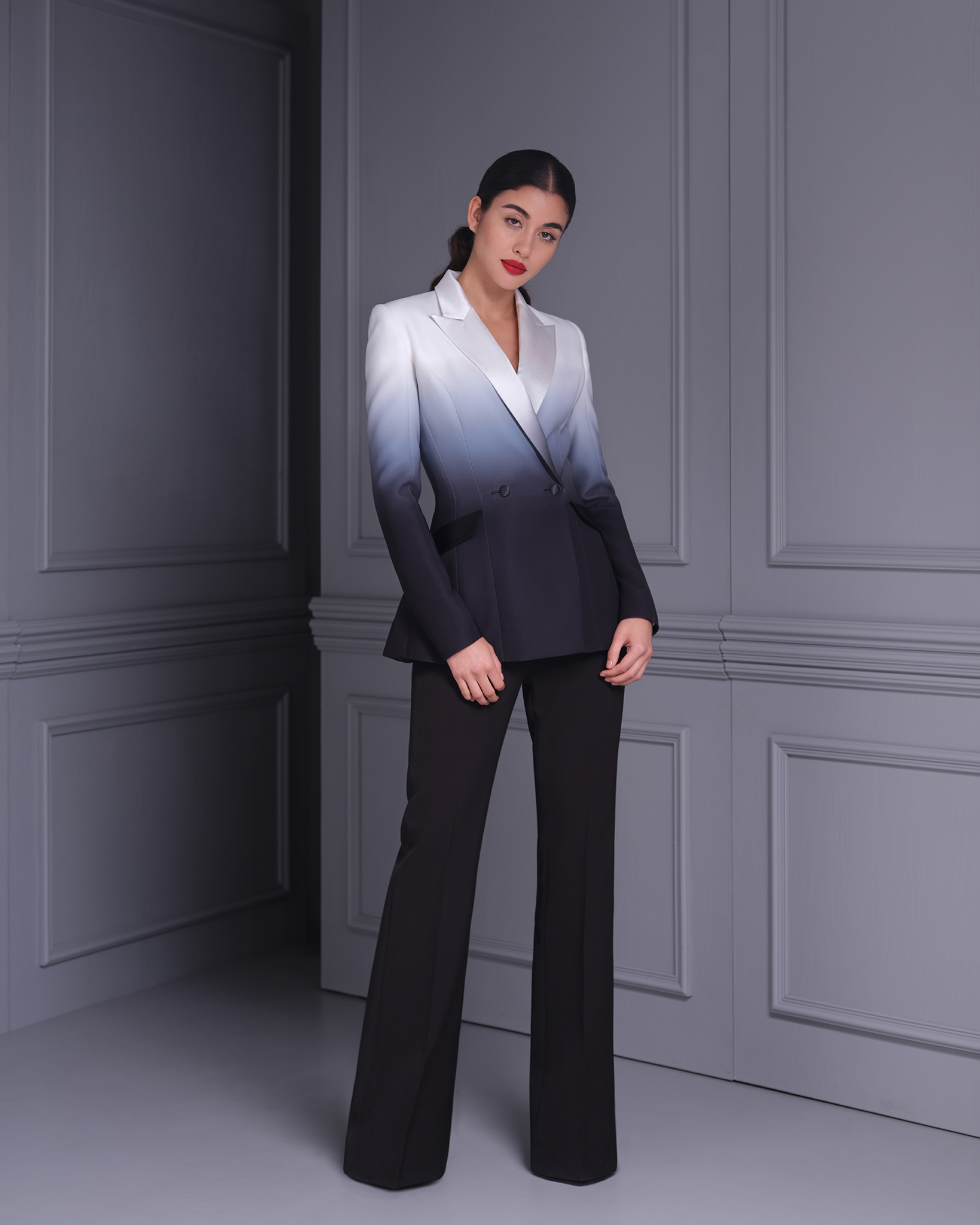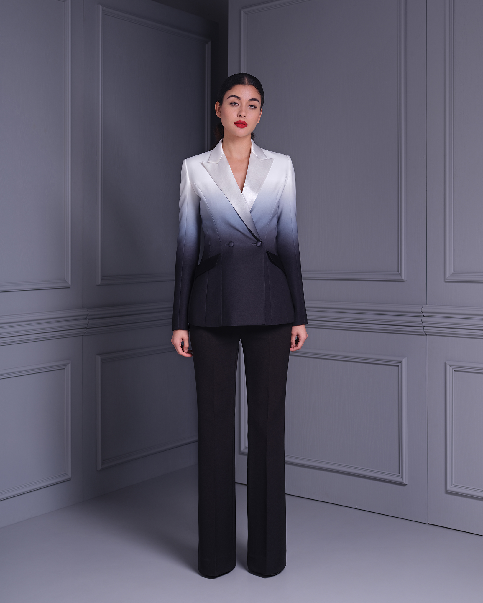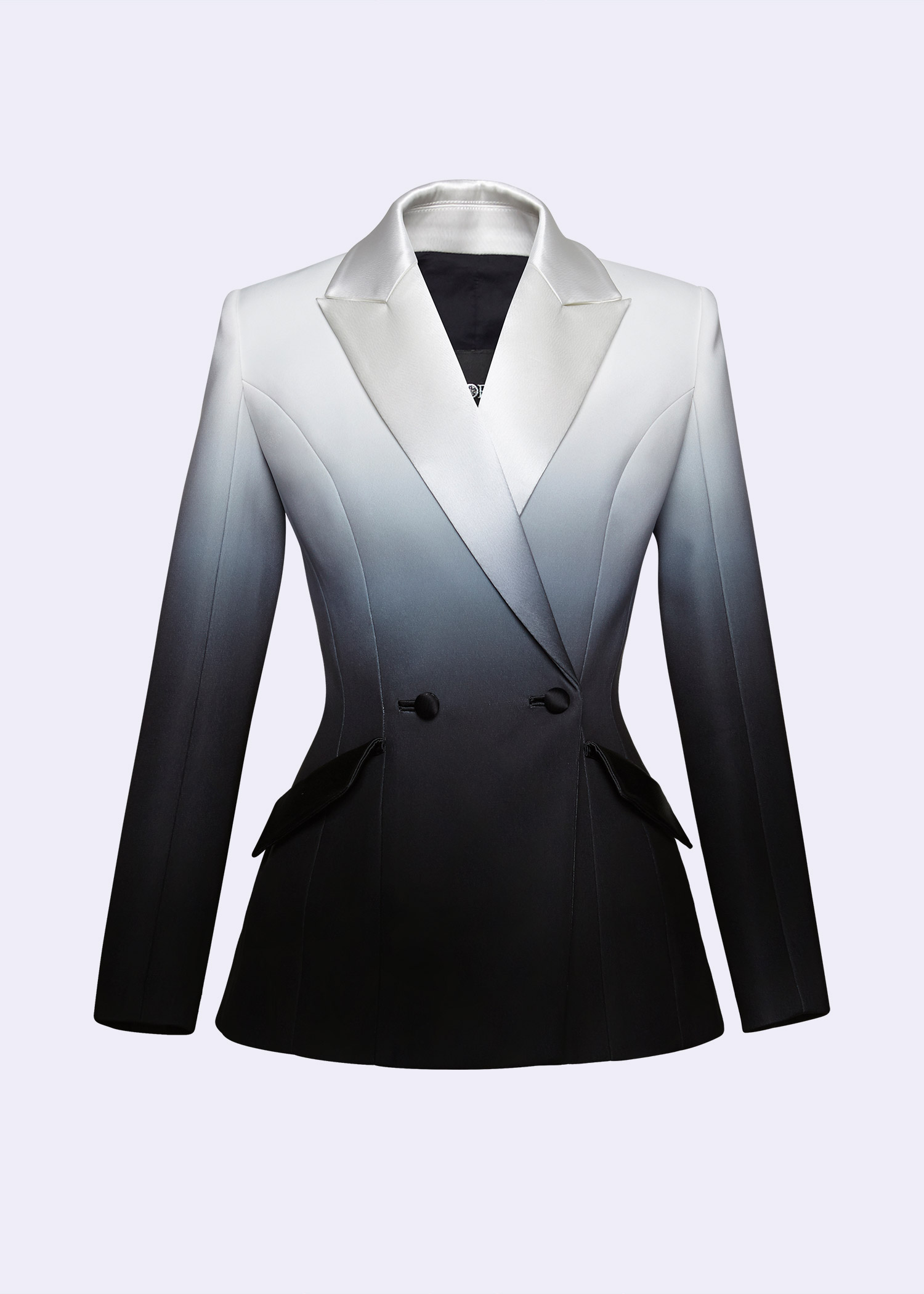 The Black & White Ombre “Charon” Le Smoking Jacket is a stunning blend of modern sophistication and classic style. Featuring a sleek double-breasted design, this jacket is crafted from high-quality polyester with an ombre effect that transitions beautifully between black and white. Inspired by the iconic Le Smoking style, it offers a structured silhouette with sharp lapels and impeccable tailoring, making it ideal for formal events or a bold fashion statement. Pair it with tailored trousers or a sleek skirt for a powerful, chic ensemble.