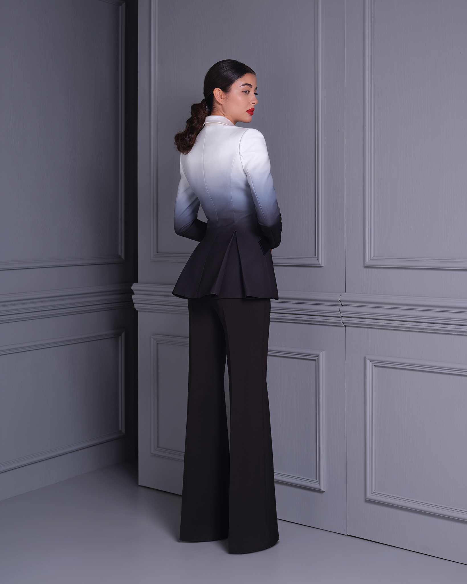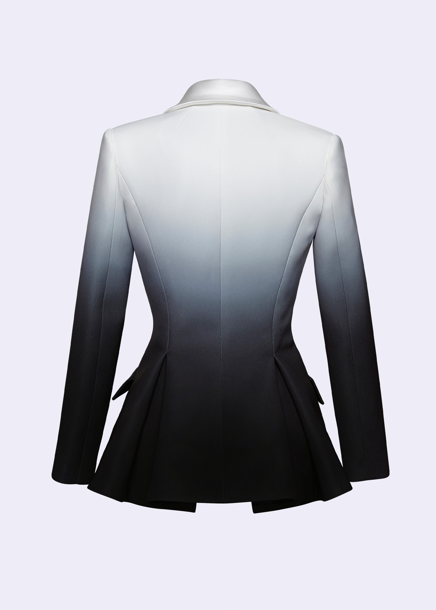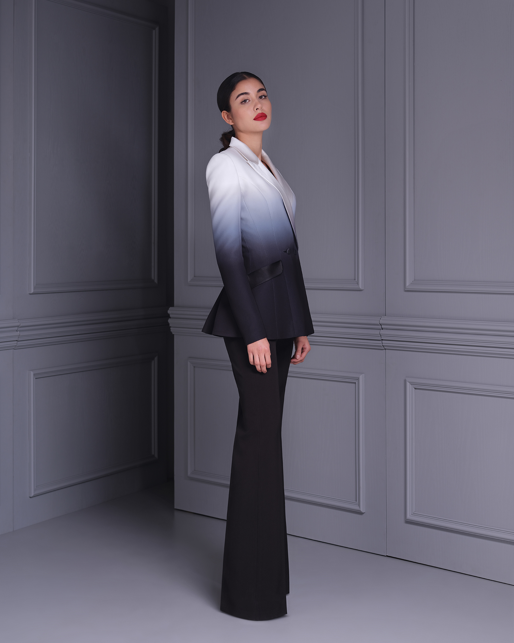 The Black & White Ombre “Charon” Le Smoking Jacket is a stunning blend of modern sophistication and classic style. Featuring a sleek double-breasted design, this jacket is crafted from high-quality polyester with an ombre effect that transitions beautifully between black and white. Inspired by the iconic Le Smoking style, it offers a structured silhouette with sharp lapels and impeccable tailoring, making it ideal for formal events or a bold fashion statement. Pair it with tailored trousers or a sleek skirt for a powerful, chic ensemble.