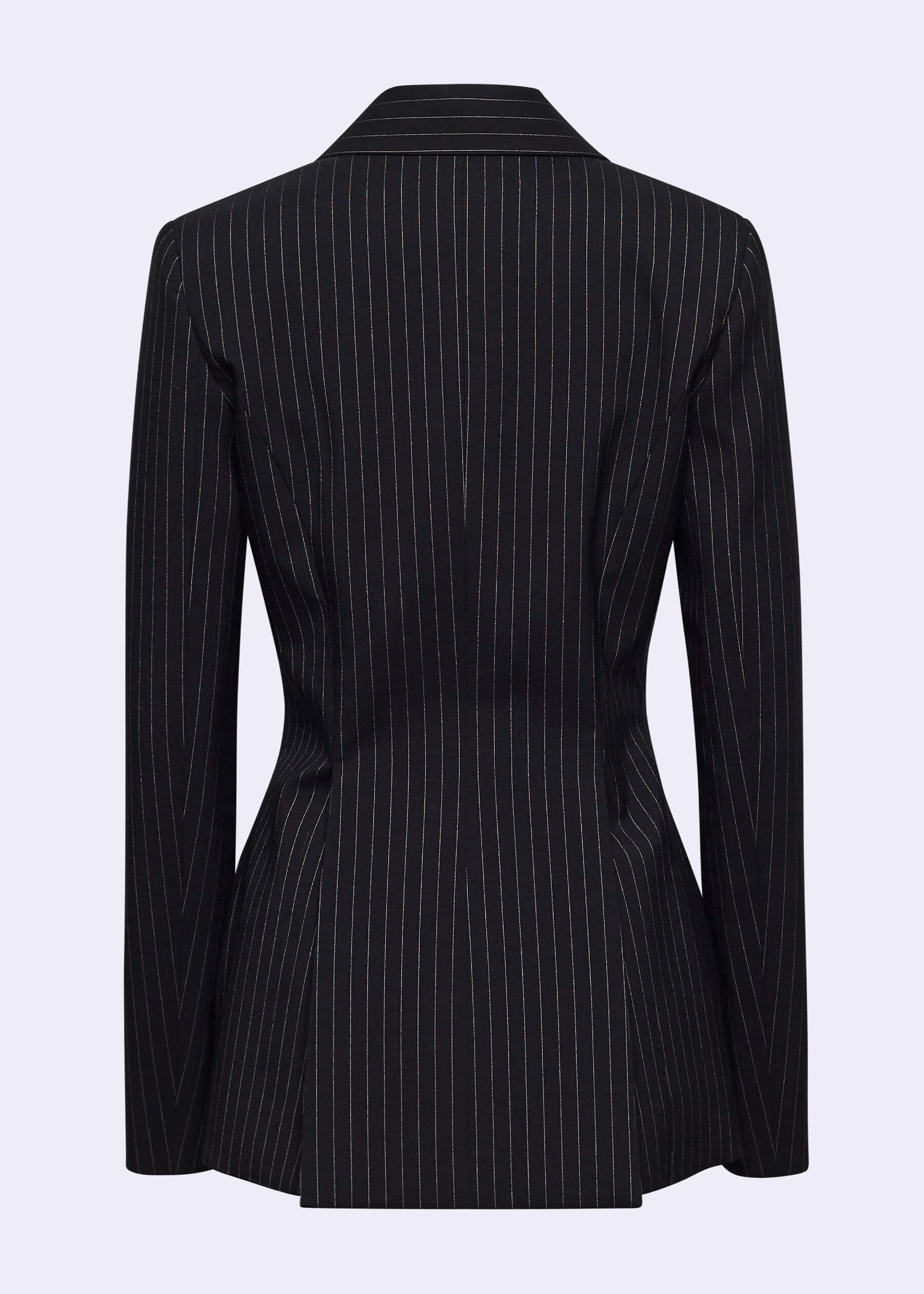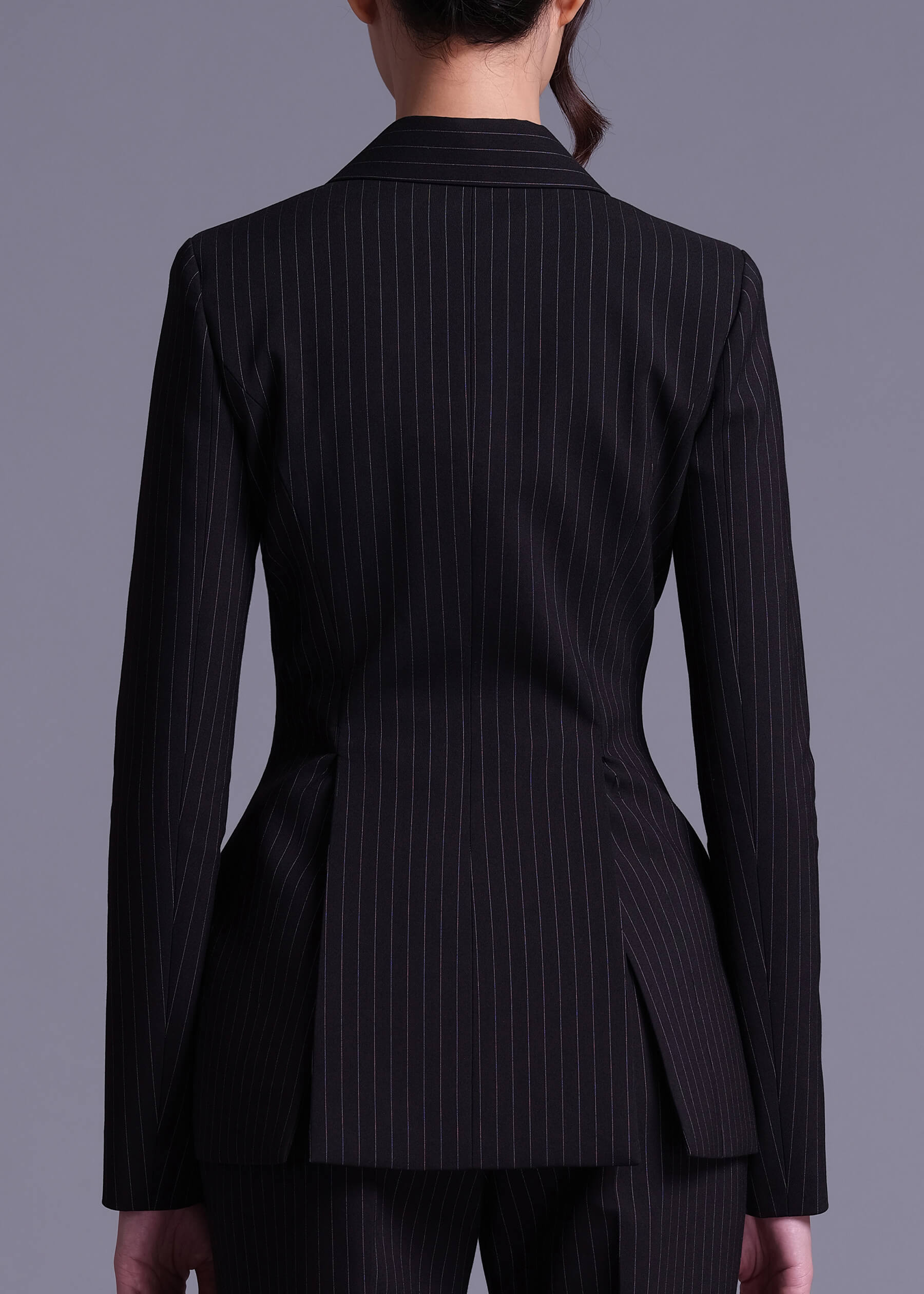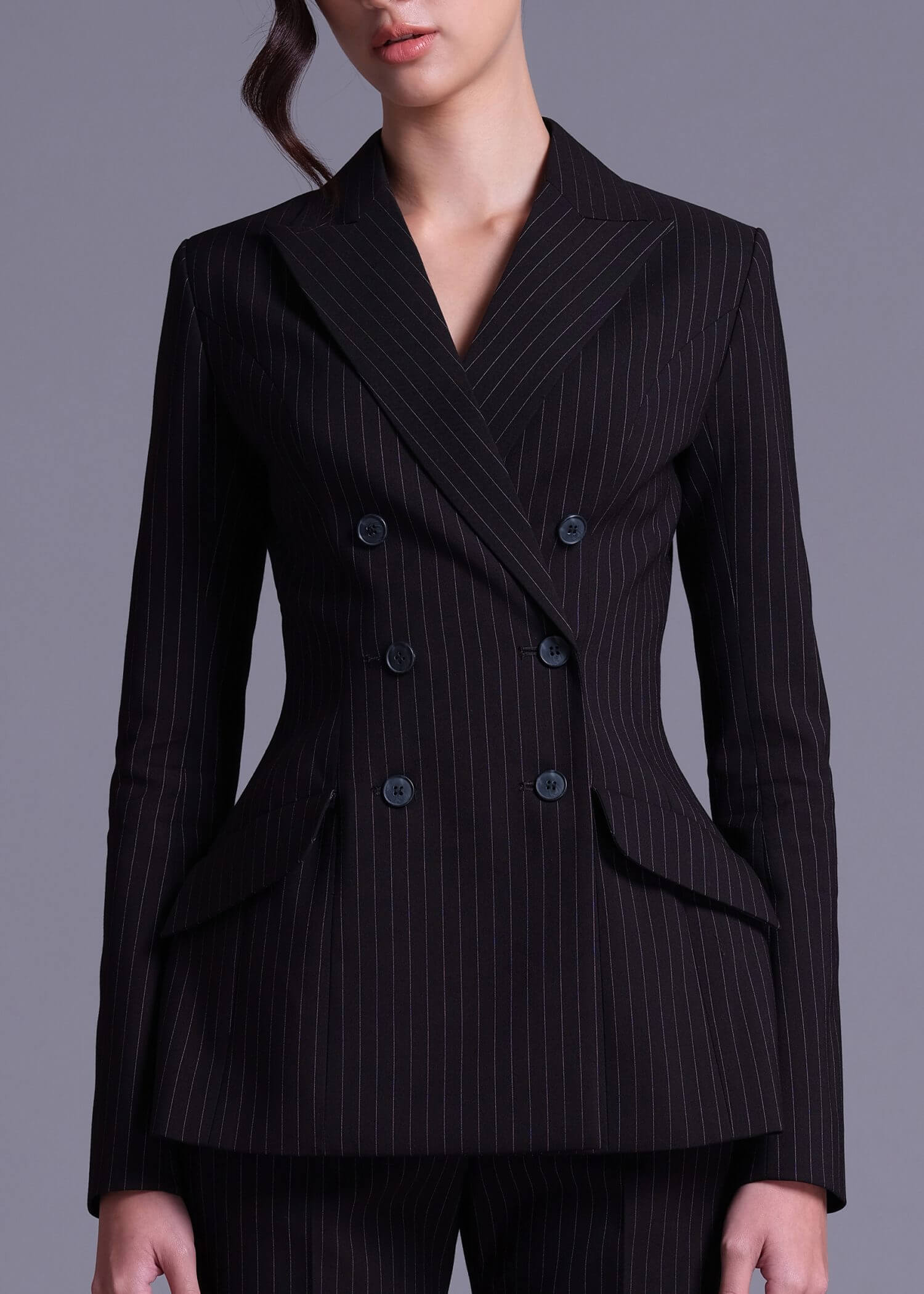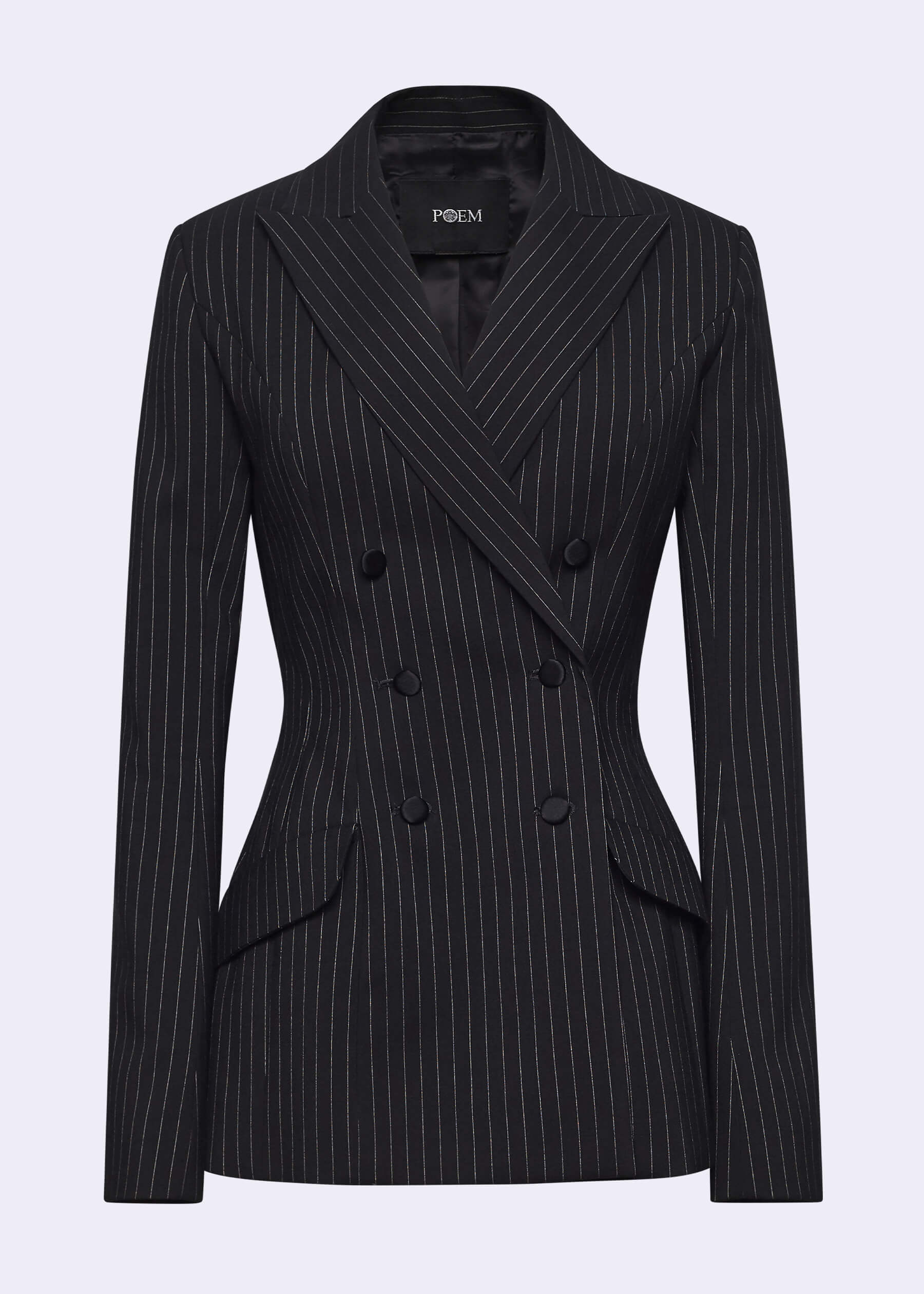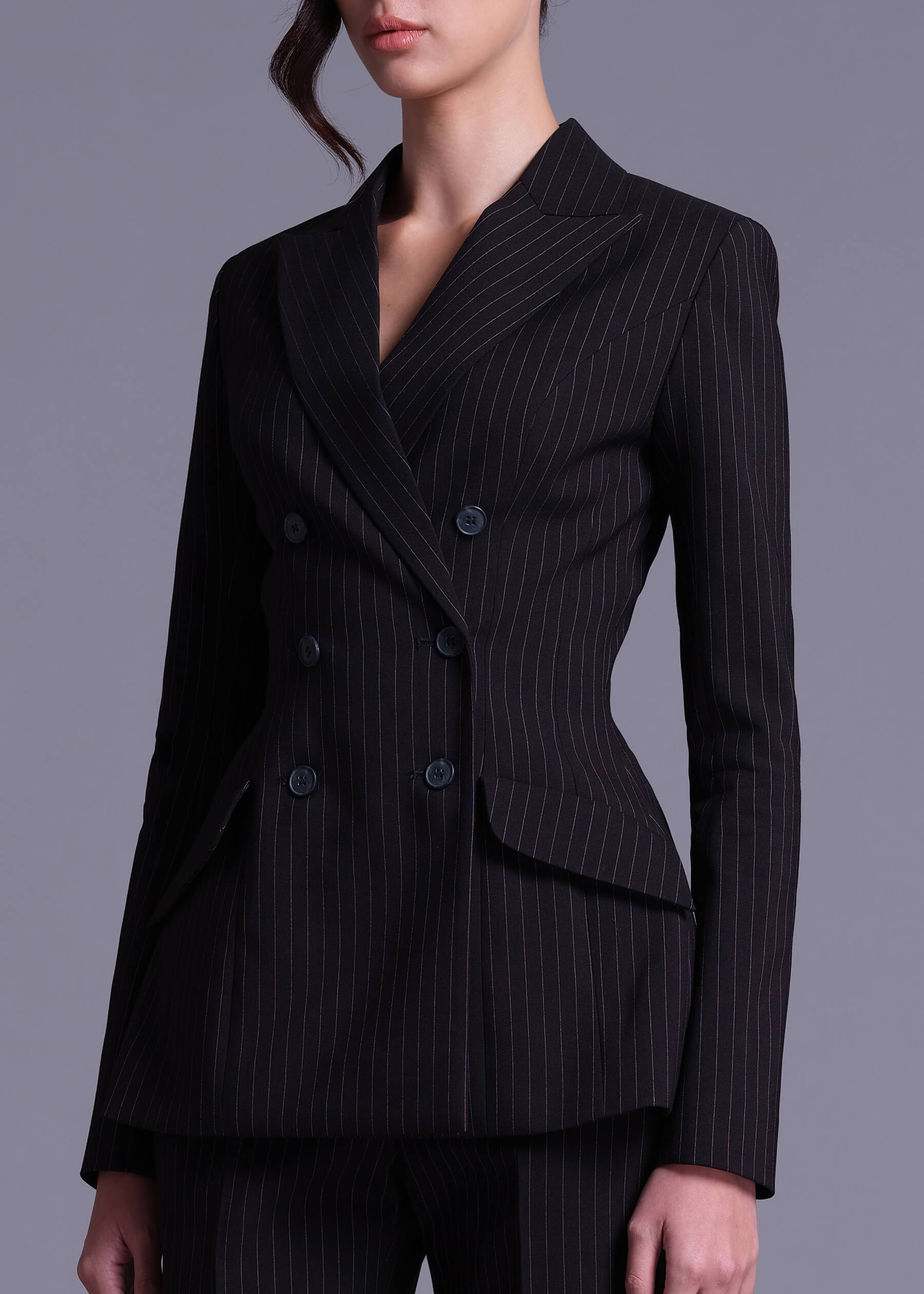 The “Trop” black pinstripe linen rayon double-breasted jacket, a sophisticated piece that combines classic elegance with modern style. This jacket features a timeless black pinstripe pattern and a double-breasted design, making it a versatile addition to any wardrobe. Crafted from a high-quality blend of linen and rayon, the “Trop” jacket offers a comfortable and breathable fit, ideal for year-round wear. The tailored silhouette enhances your figure, while the double-breasted front adds a touch of sophistication. Perfect for both formal and casual occasions, this jacket can be dressed up with trousers and heels for a polished look or paired with jeans for a chic, everyday style.