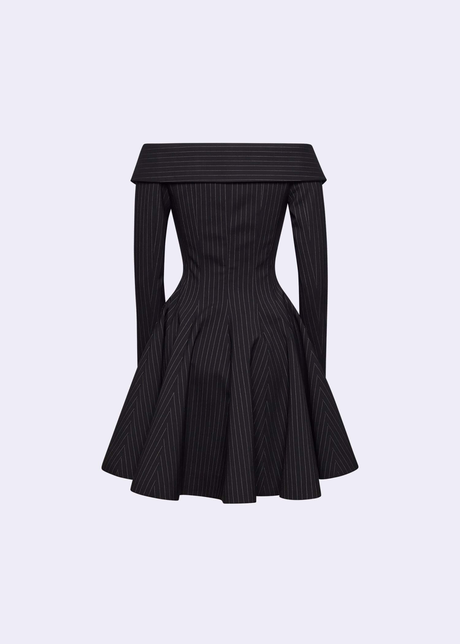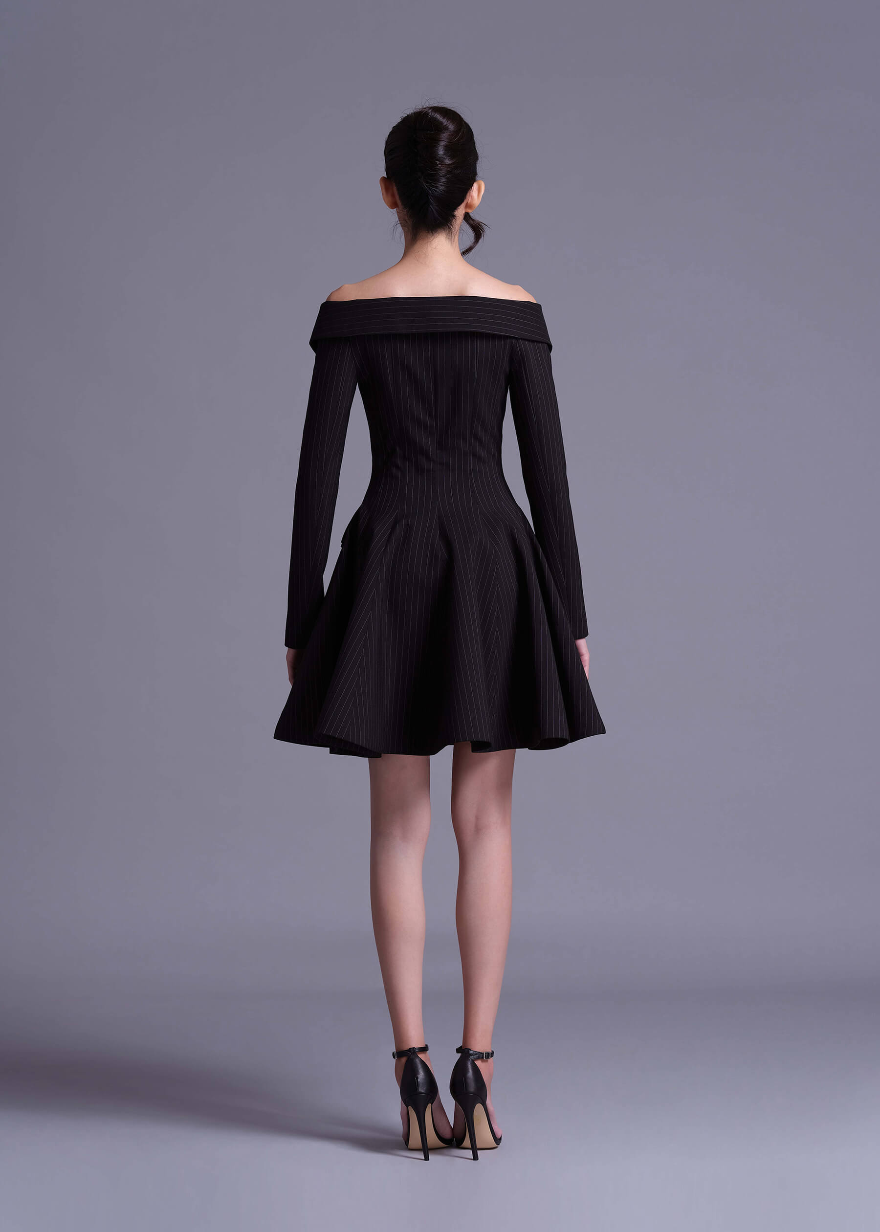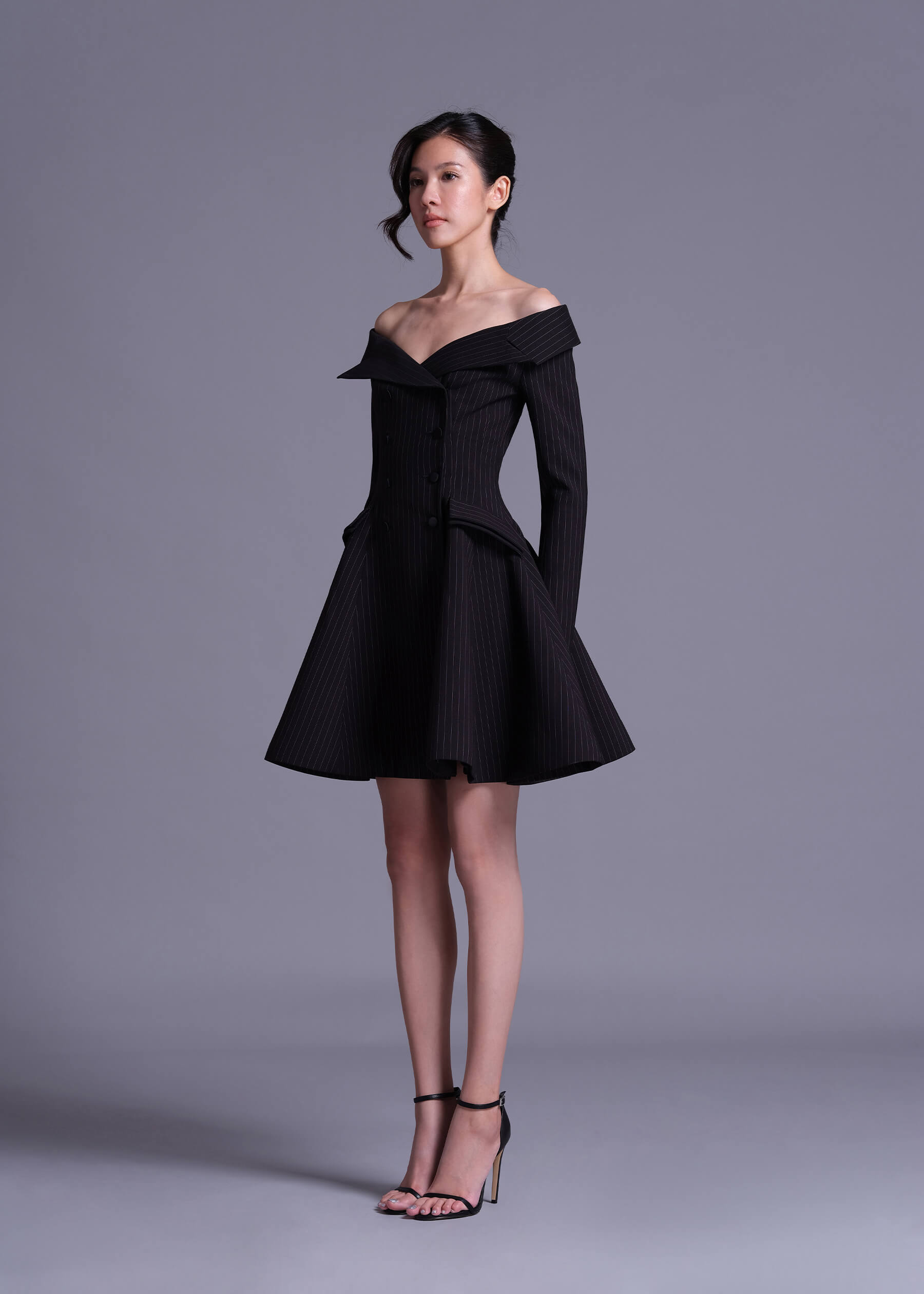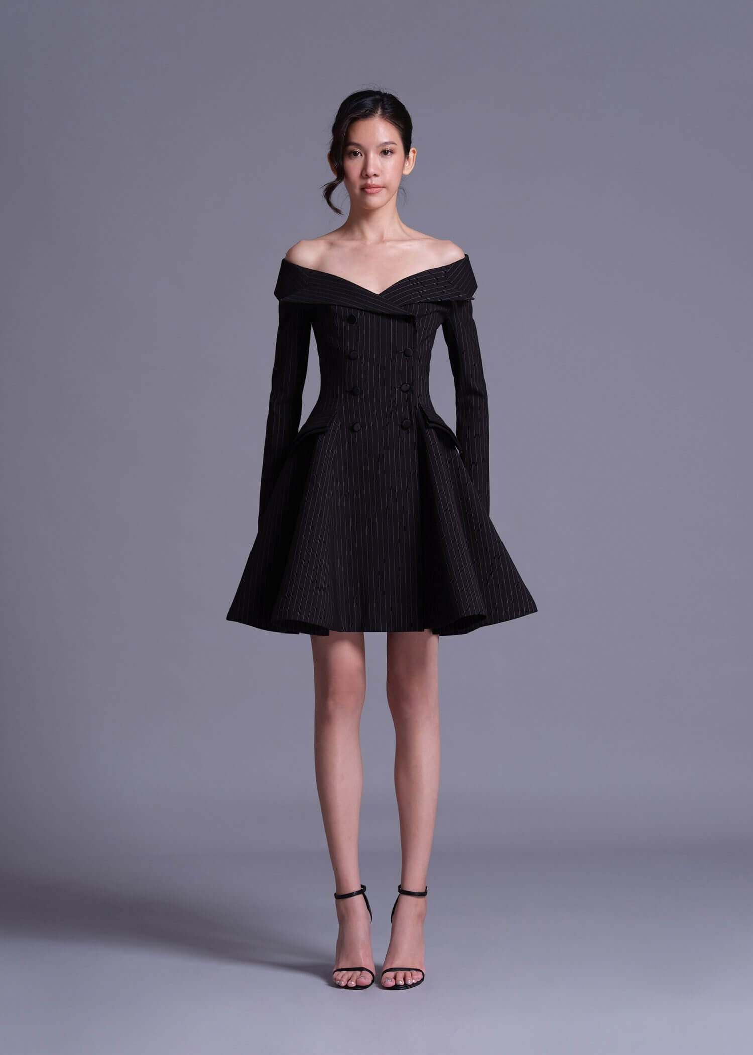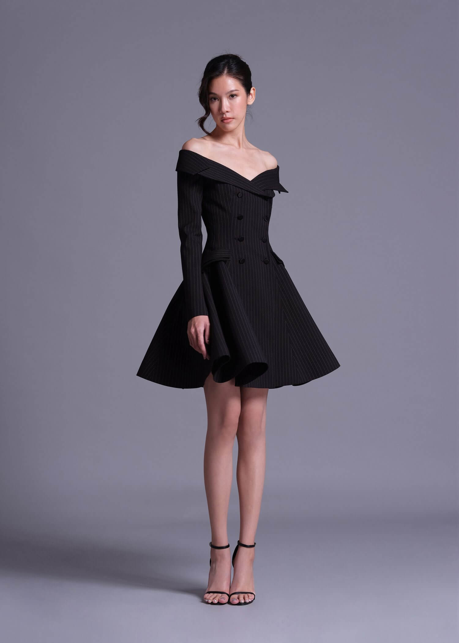 The “Odin” black pinstripe linen rayon off-shoulder A-line jacket-dress, a chic and versatile piece perfect for any occasion. This unique design combines the sophistication of a tailored jacket with the feminine appeal of an A-line dress, creating a fashionable look that stands out. Crafted from a high-quality blend of linen and rayon, this dress offers a comfortable and breathable fit, ideal for all-day wear. The black pinstripe pattern adds a touch of classic elegance, while the off-shoulder design enhances your silhouette with a modern twist. Whether you’re dressing up for a business meeting, a night out, or a special event. Pair it with heels for a polished look or dress it down with flats for a more casual style.