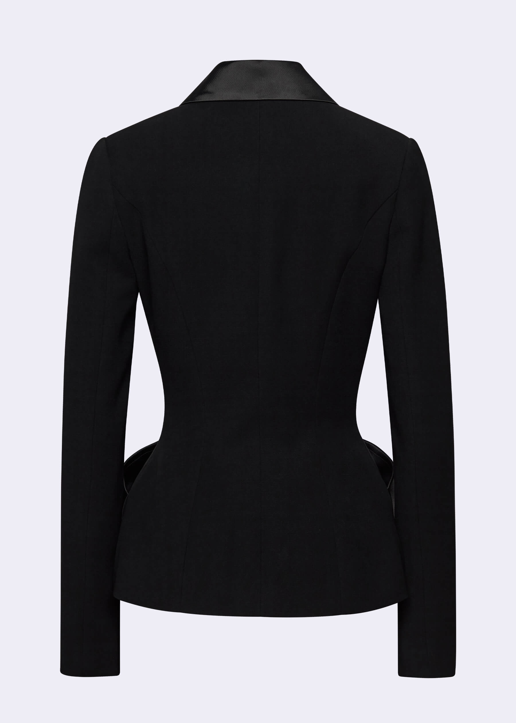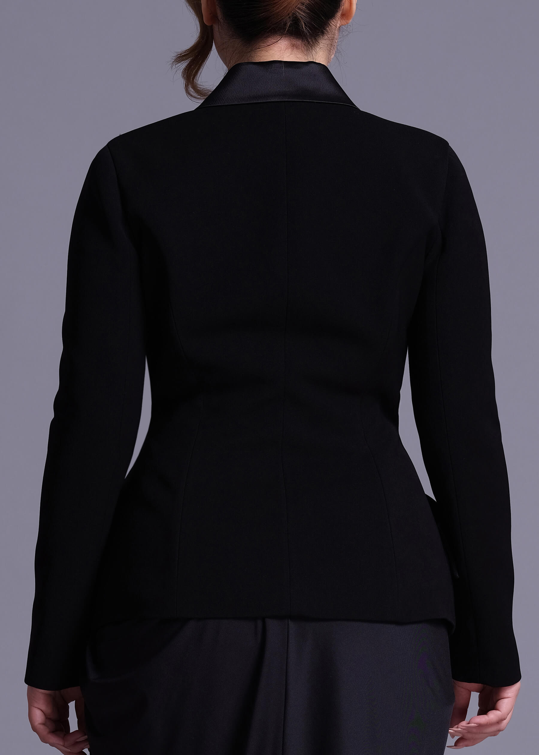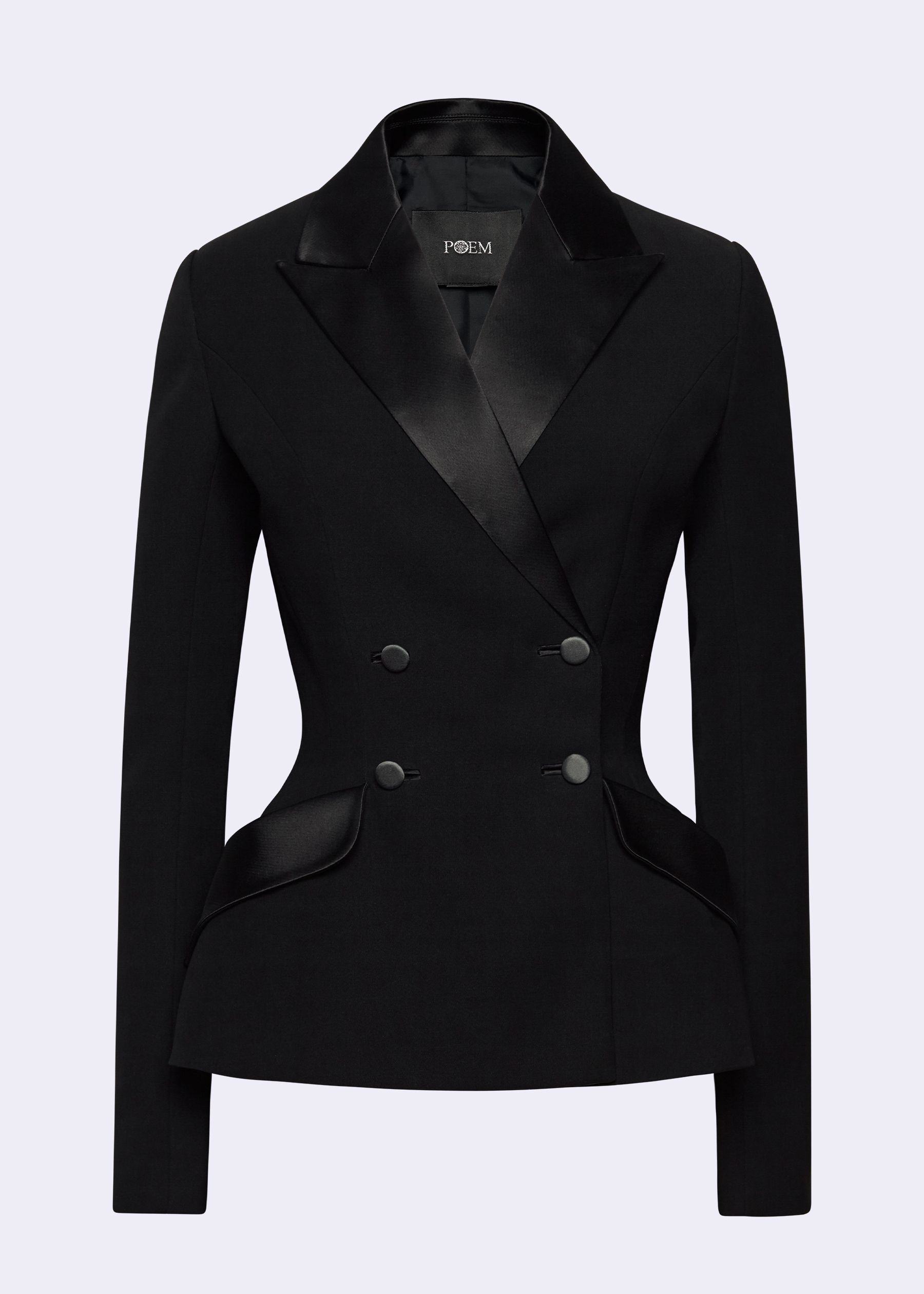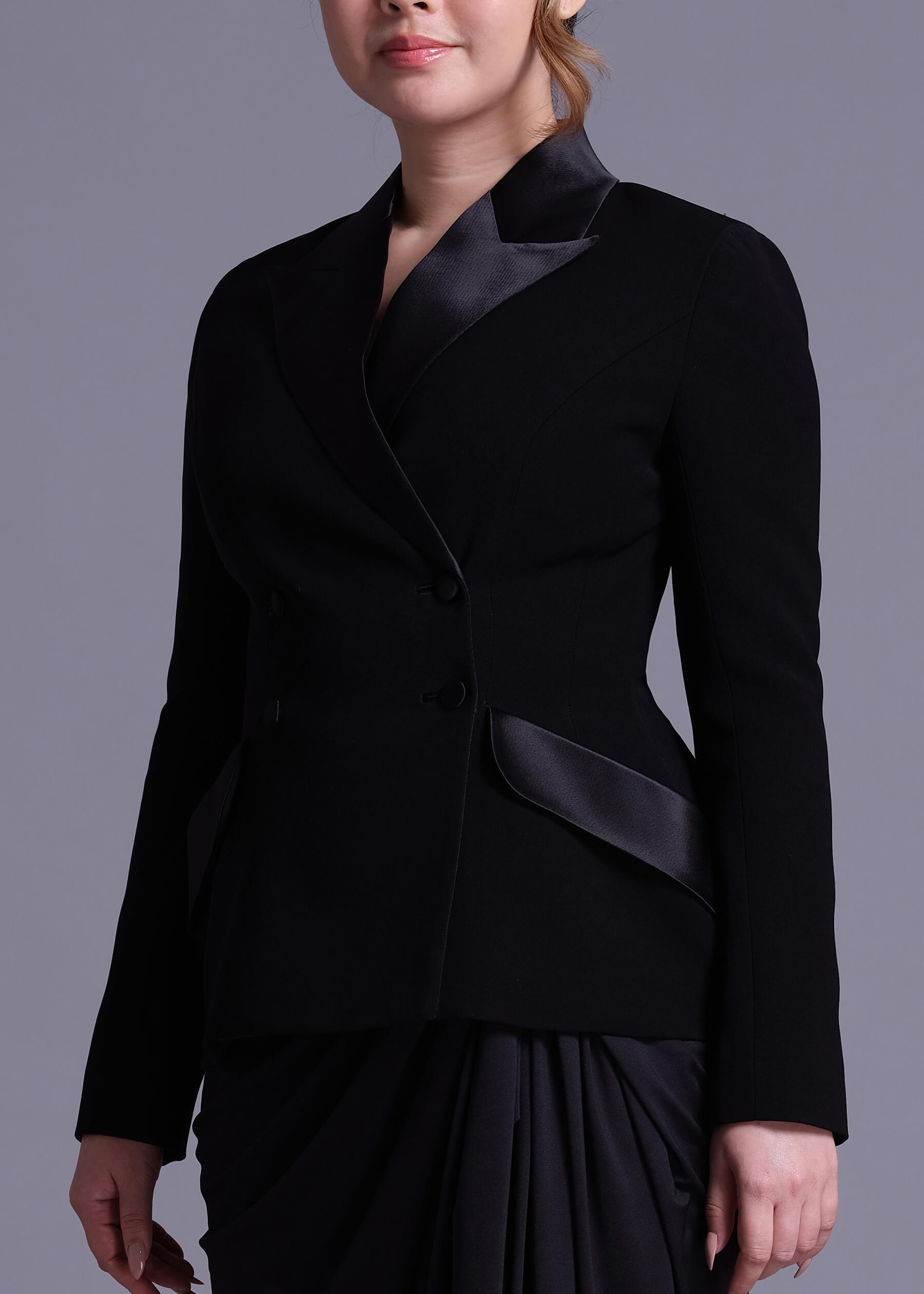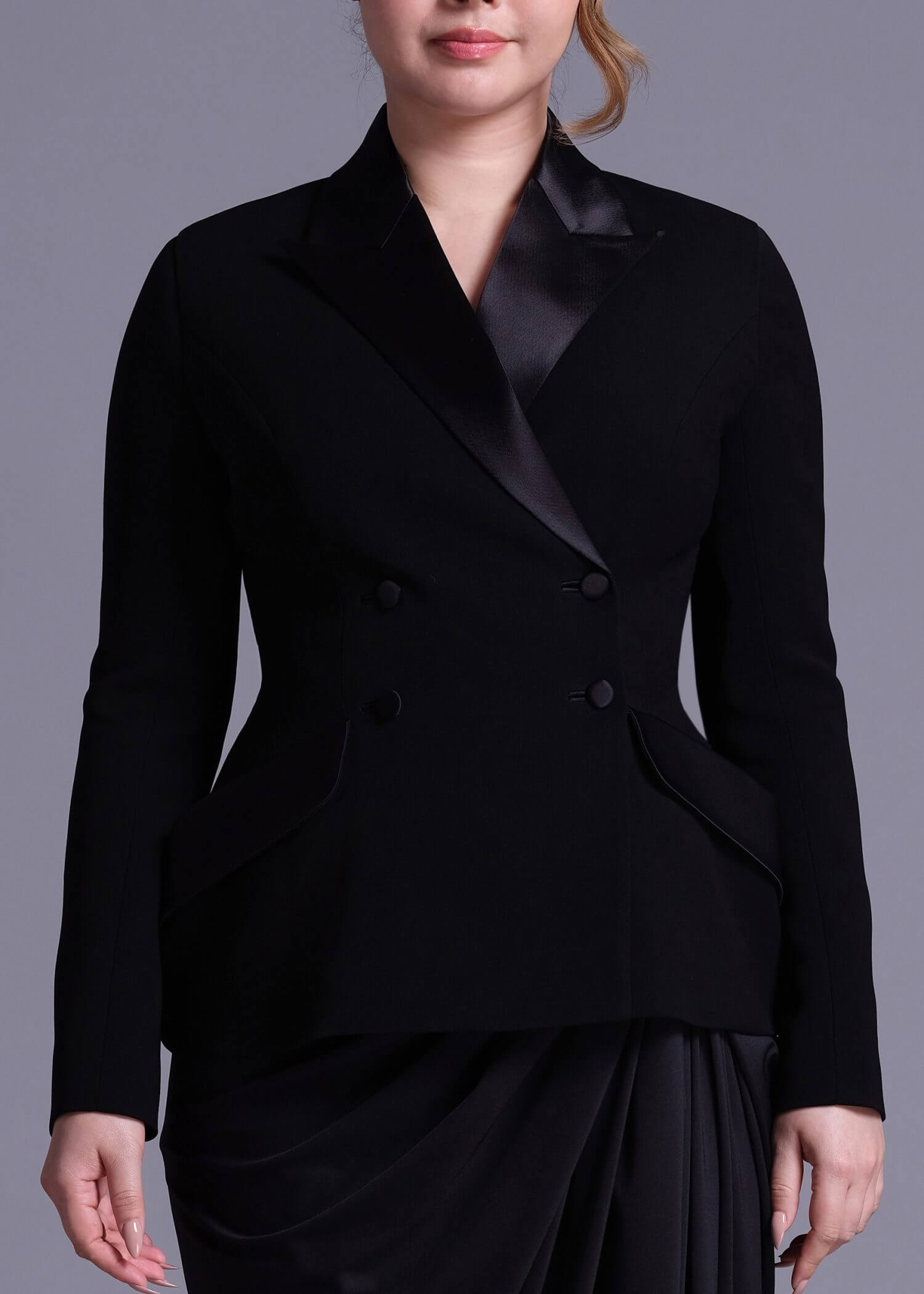 The ‘Oberon’ Black Double-Breasted Jacket is the epitome of elegance and modern design. Crafted from high-quality polyester and enhanced with luxurious satin-crepe detailing, this jacket offers a polished look that transitions effortlessly from office settings to evening occasions. Its tailored fit and double-breasted closure ensure a sharp silhouette, while the subtle sheen from the satin-crepe accents adds a touch of glamour. Perfect for pairing with trousers, skirts, or dresses.