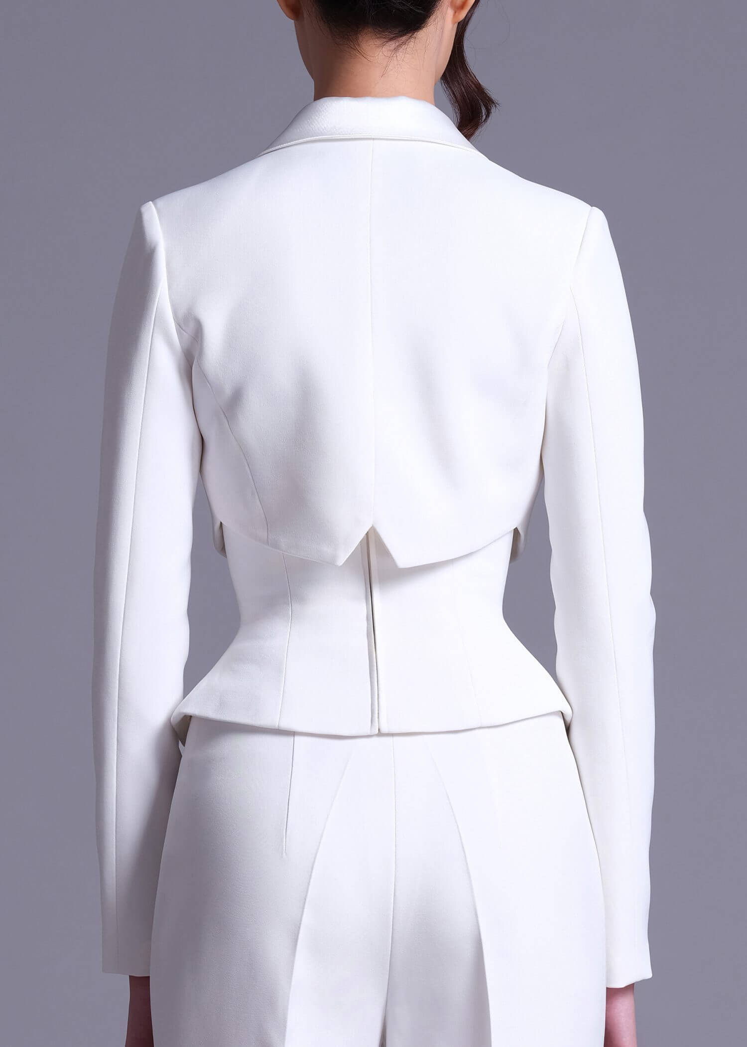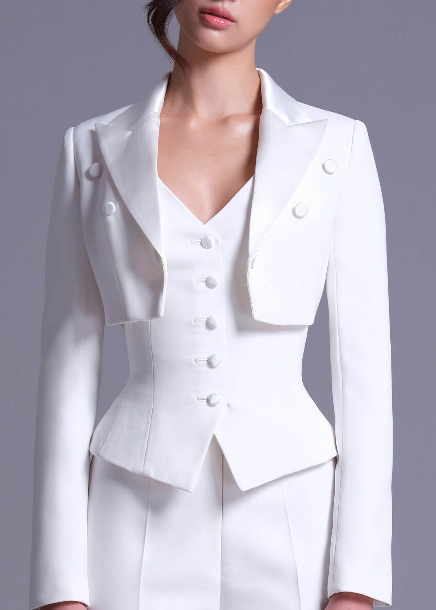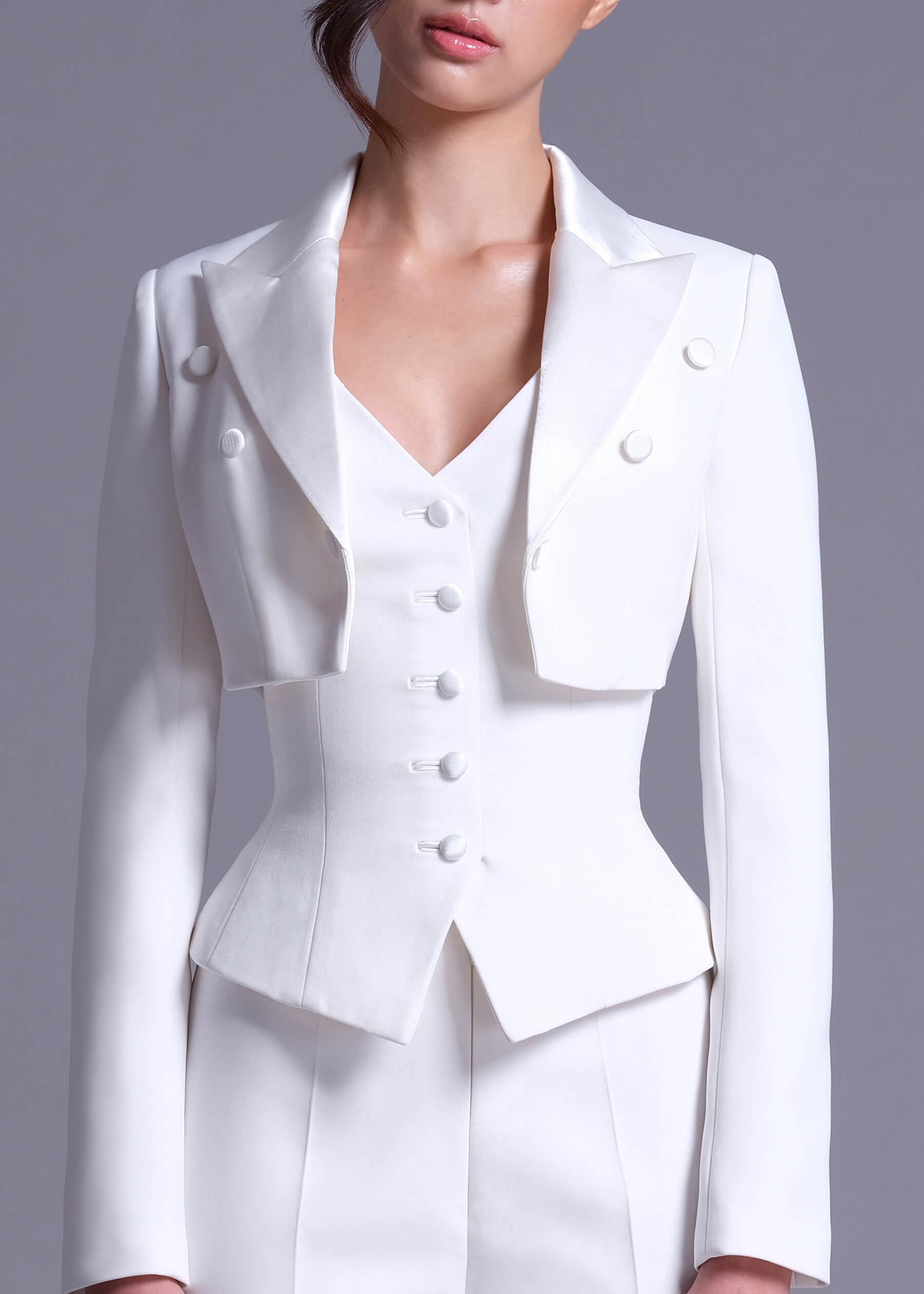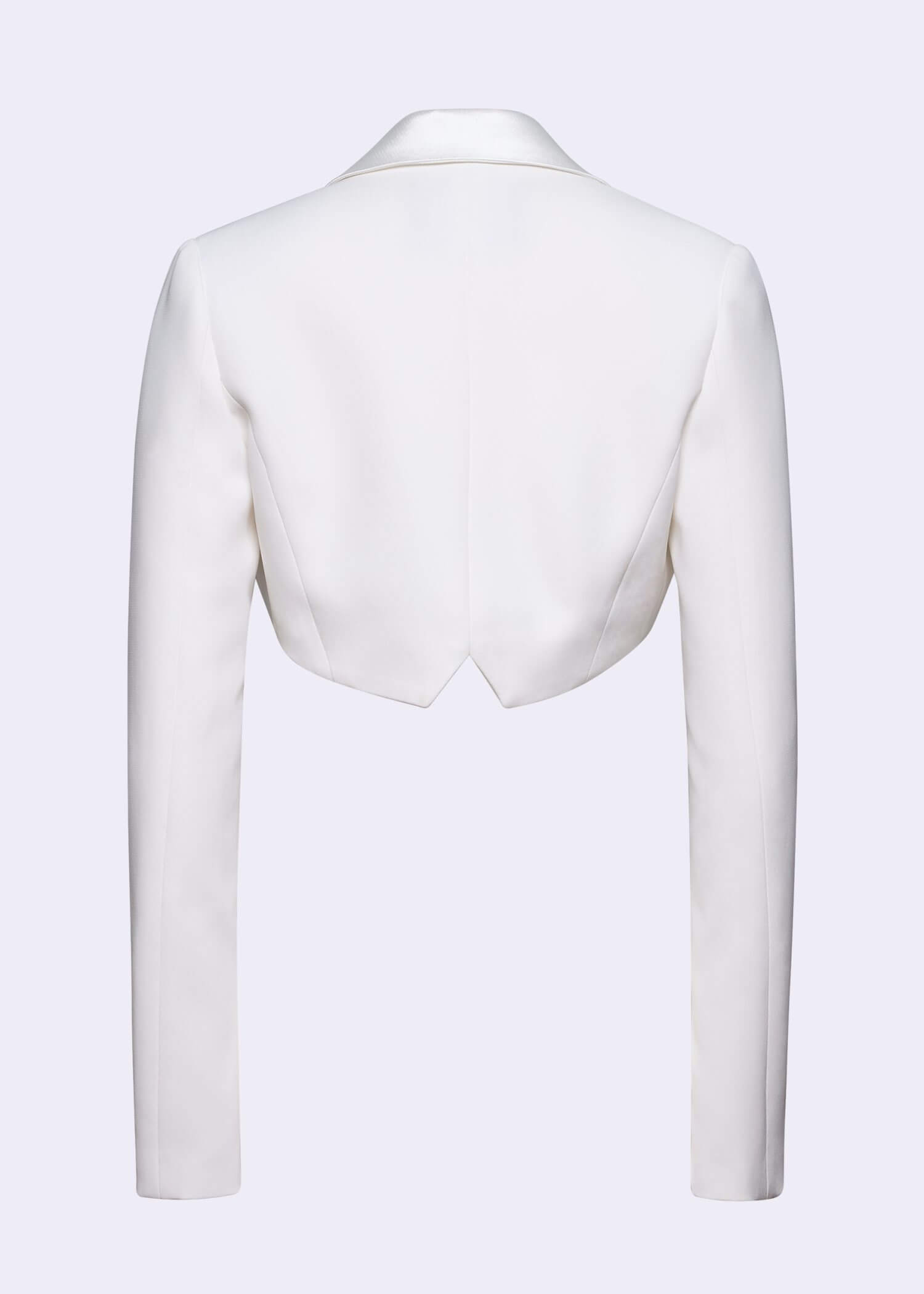 The “Triton” off-white cropped double-breasted jacket, featuring luxurious satin-crepe detail. Crafted from high-quality off-white polyester and accented with elegant satin-crepe detailing. The double-breasted design and cropped length provide a contemporary look. Pair this chic jacket with high-waisted trousers and a blouse for a polished office look, or wear it over a dress for a sophisticated evening ensemble. The off-white color and satin-crepe details make it easy to mix and match with various outfits.