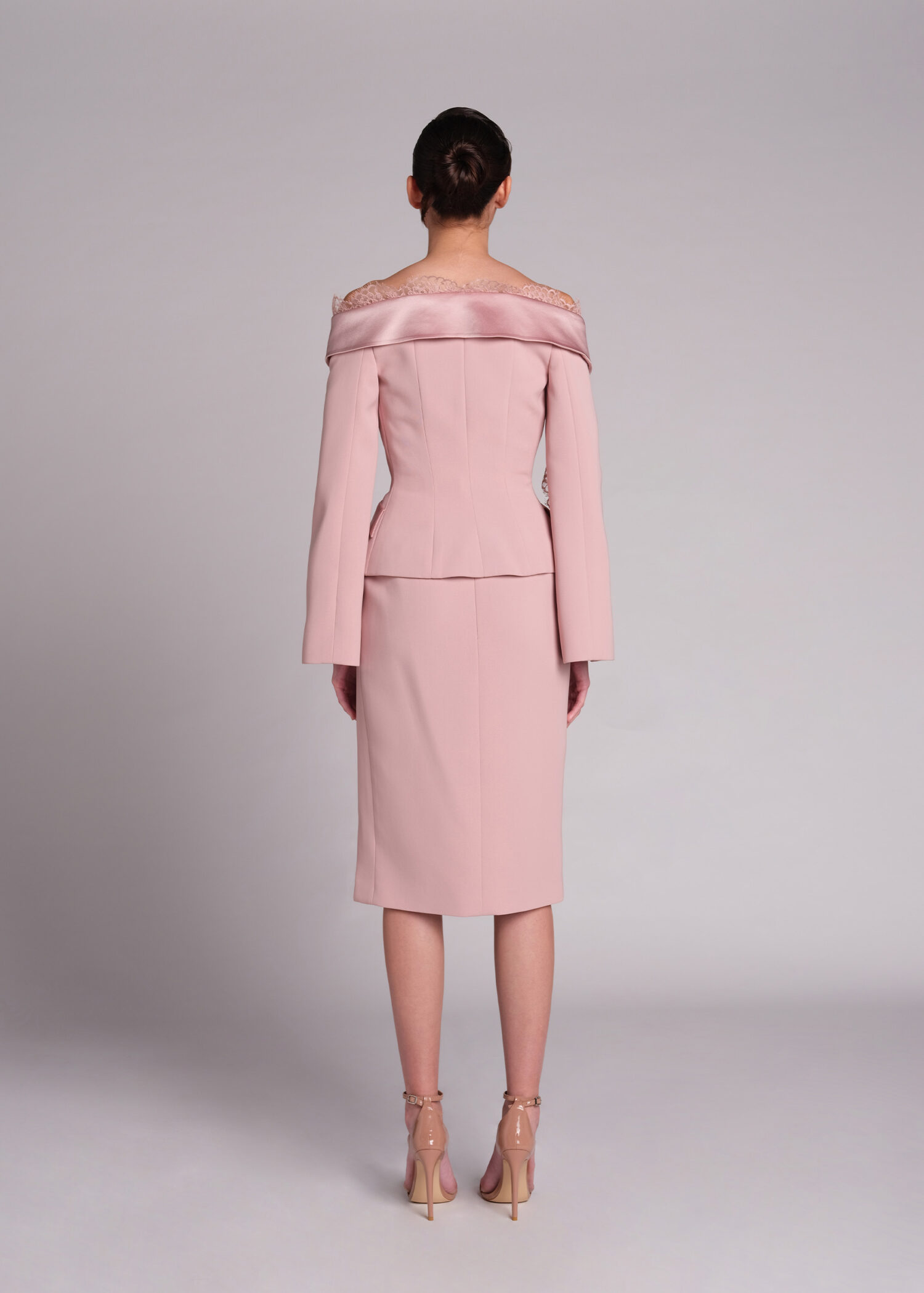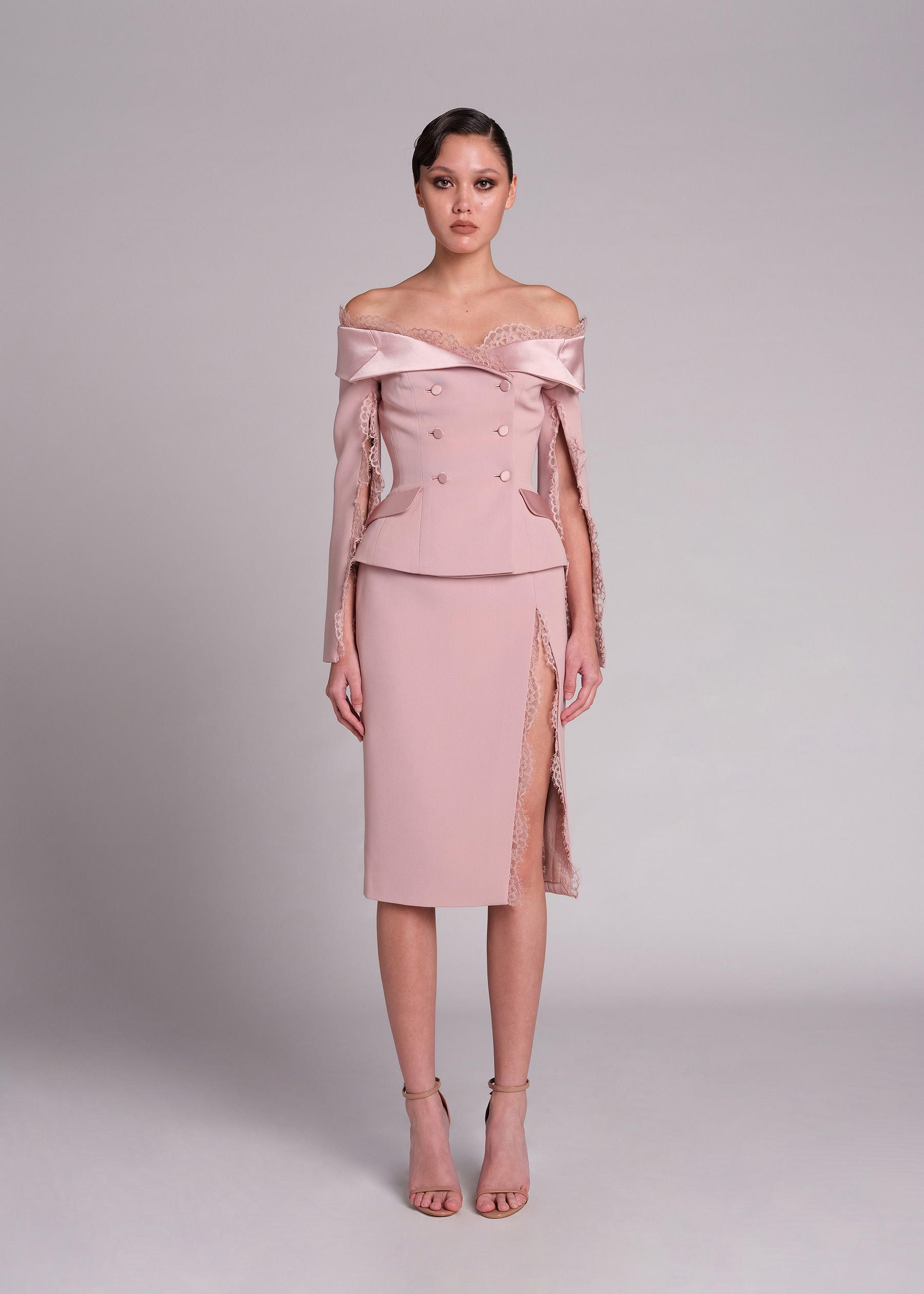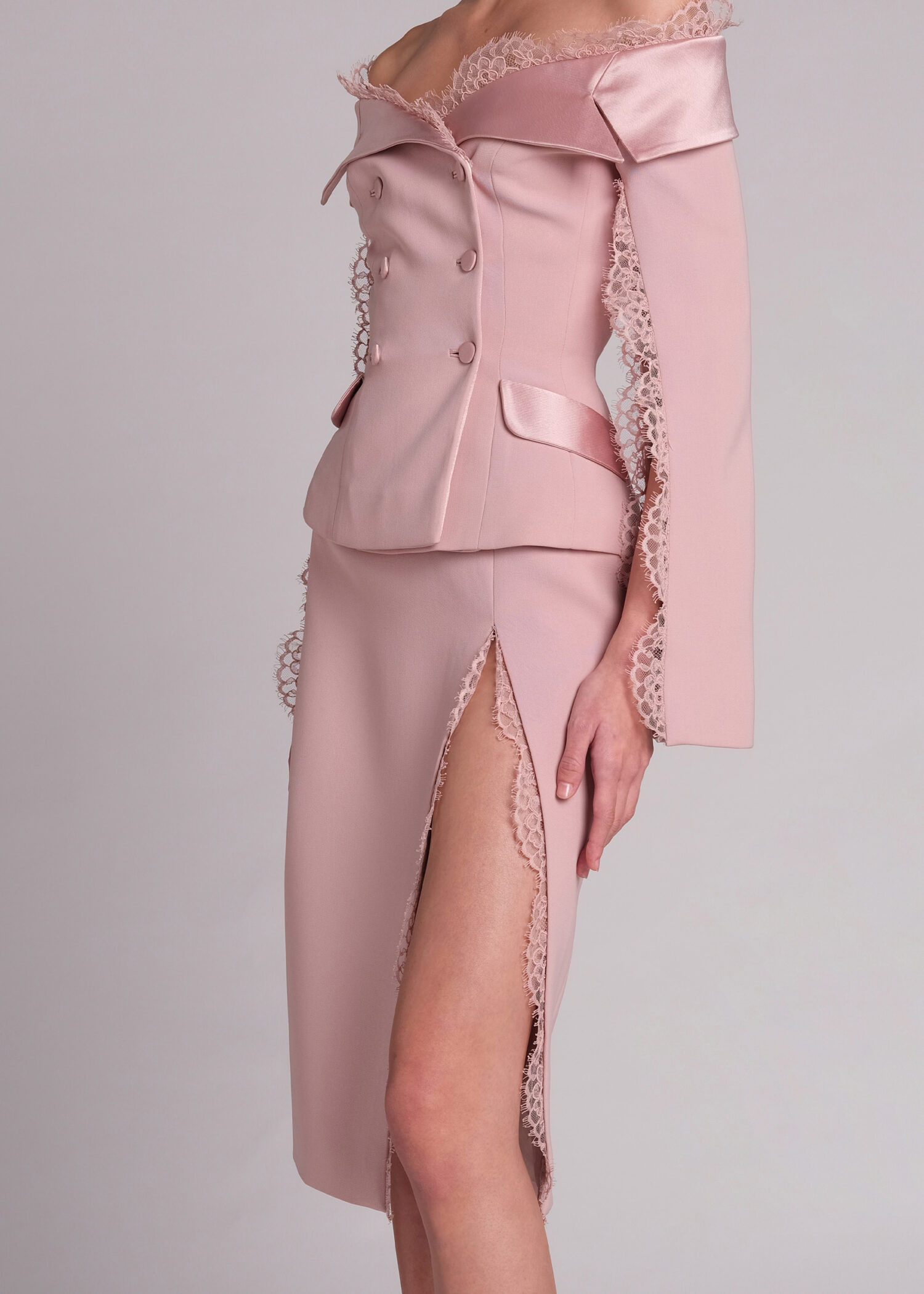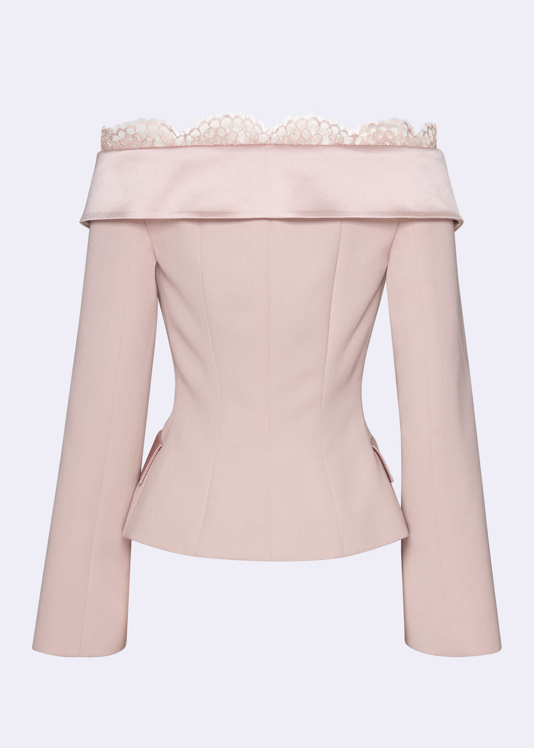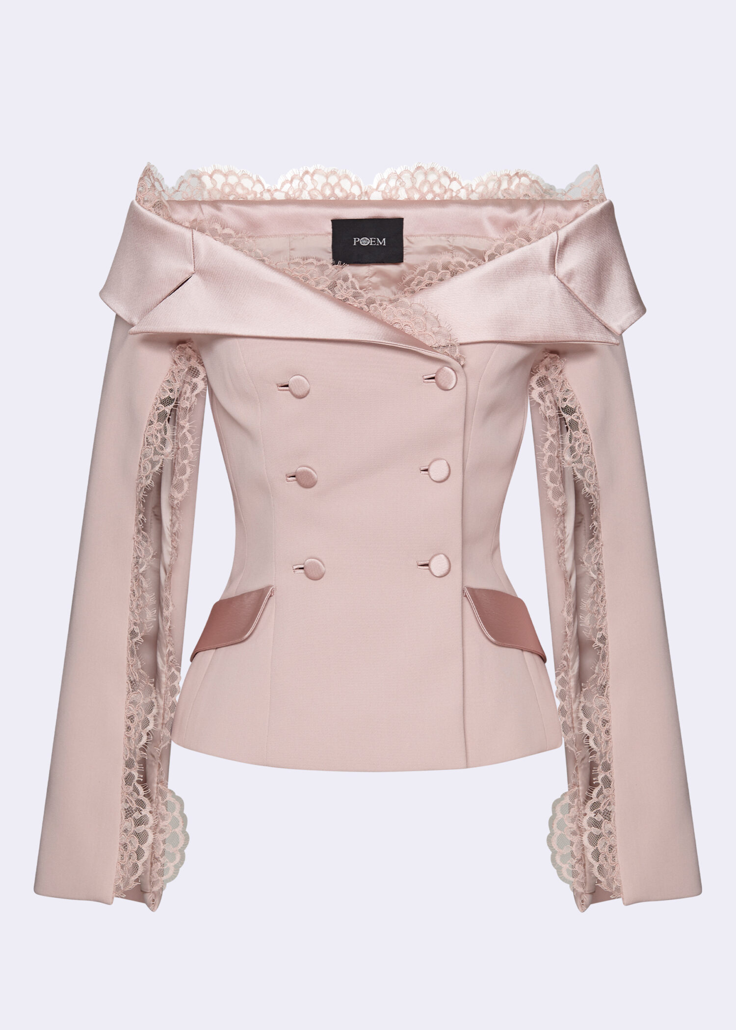 The pink off-shoulder double-breasted jacket. Crafted from high-quality polyester, this jacket combines the timeless appeal of an off-shoulder design with the modern elegance of double-breasted tailoring. The luxurious satin-crepe fabric adds a touch of sophistication, while the intricate lace details enhance its feminine charm. Perfect for formal events, business meetings, or a stylish night out. The flattering off-shoulder cut highlights your neckline and shoulders, creating a chic silhouette that pairs beautifully with both skirts and trousers.