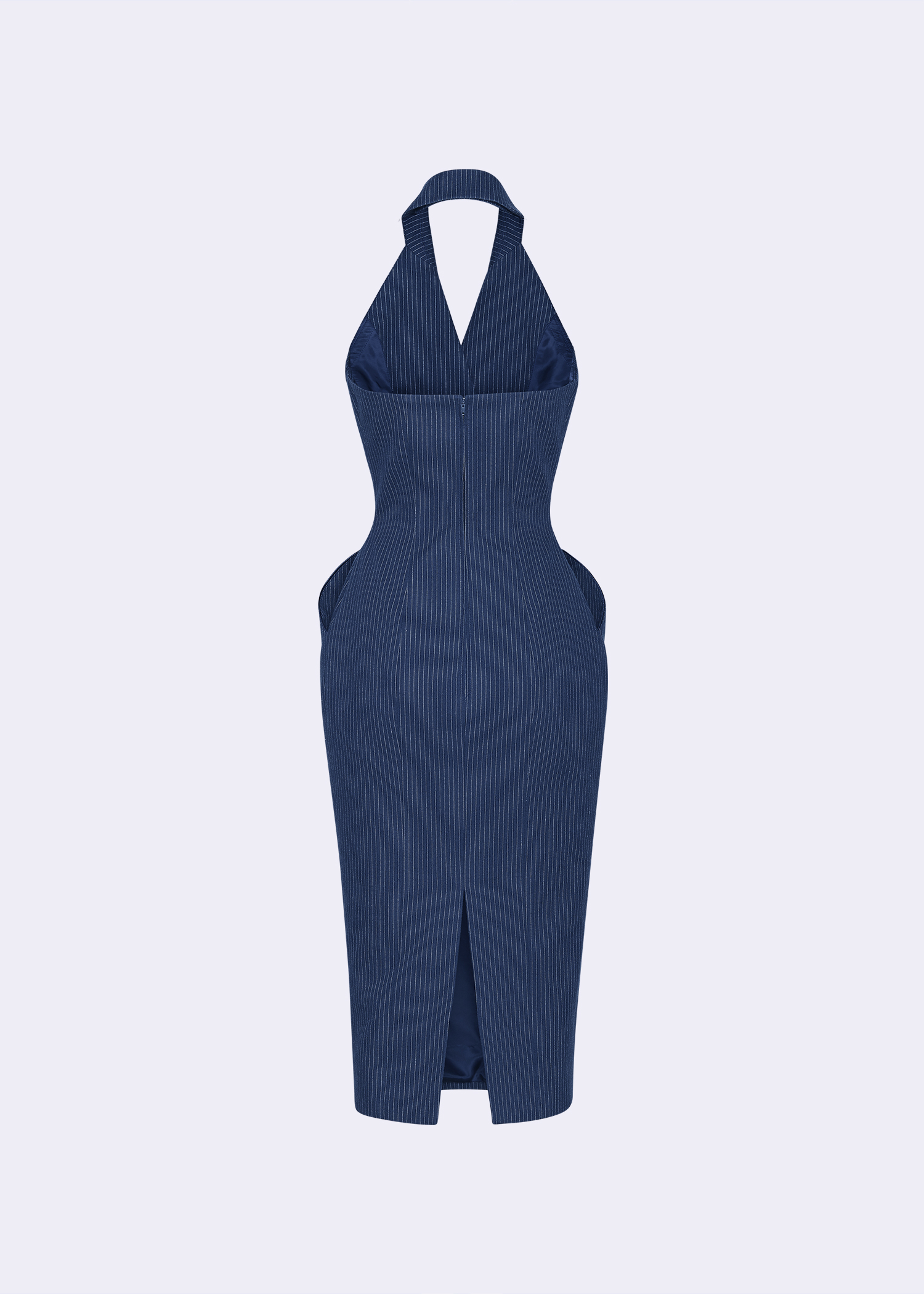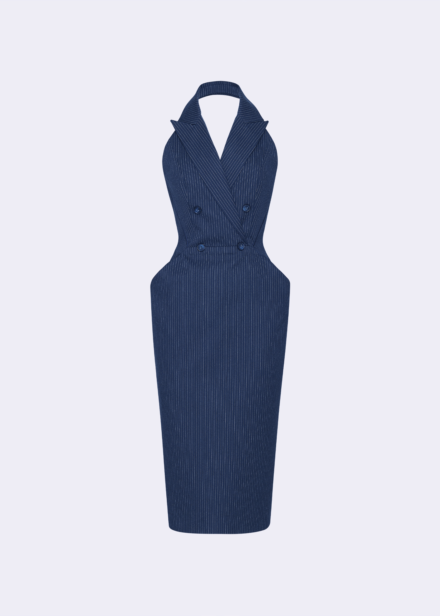The navy pinstripe peak lapel halter sheath dress with buttons detail, crafted from premium cotton for comfort and durability. This dress features a sophisticated navy blue color with subtle pinstripes, complemented by elegant button detailing and a peak lapel halter neckline. Designed to flatter, it offers a tailored sheath silhouette that accentuates your curves beautifully. Ideal for formal events or cocktail parties, its versatile design ensures you look polished and confident. Our halter sheath dress is a must-have for those who appreciate refined fashion with a contemporary twist.