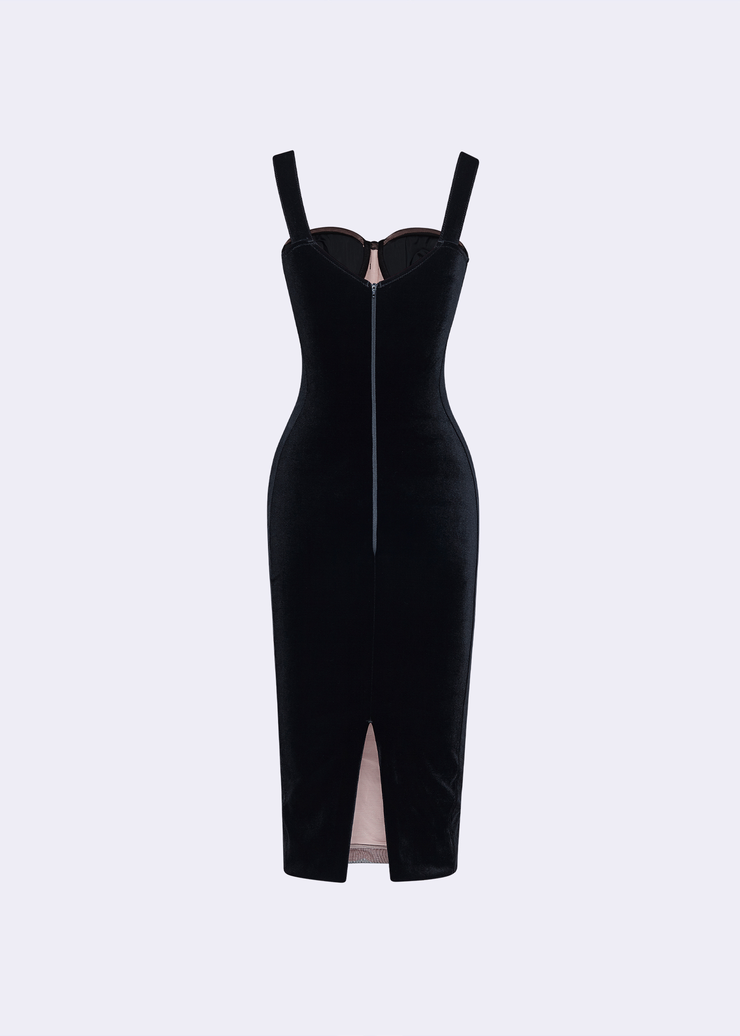 The Black Soft Net Velvet with Power mesh Lining Bustier Sheath Dress, a blend of exquisite net and velvet fabrics. This dress combines elegance with allure, featuring a flattering bustier bodice and a sheath silhouette that enhances your curves beautifully. The soft net overlay adds a touch of ethereal charm, while the power mesh lining ensures a comfortable fit. Ideal for formal events or special occasions, its timeless black hue and sophisticated design make it a standout piece in any wardrobe. our sheath dress epitomizes refined glamour and contemporary style.