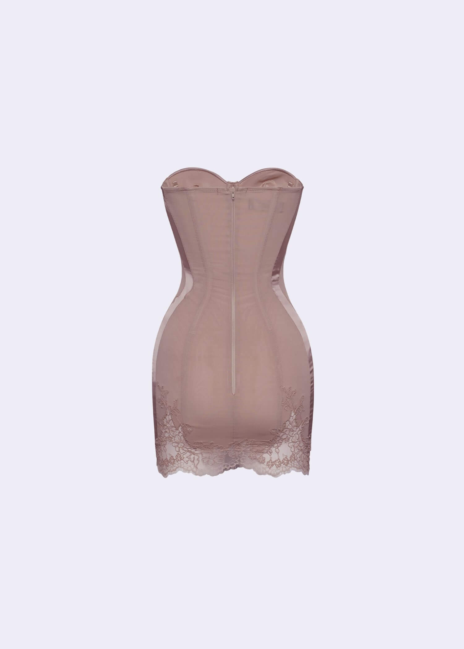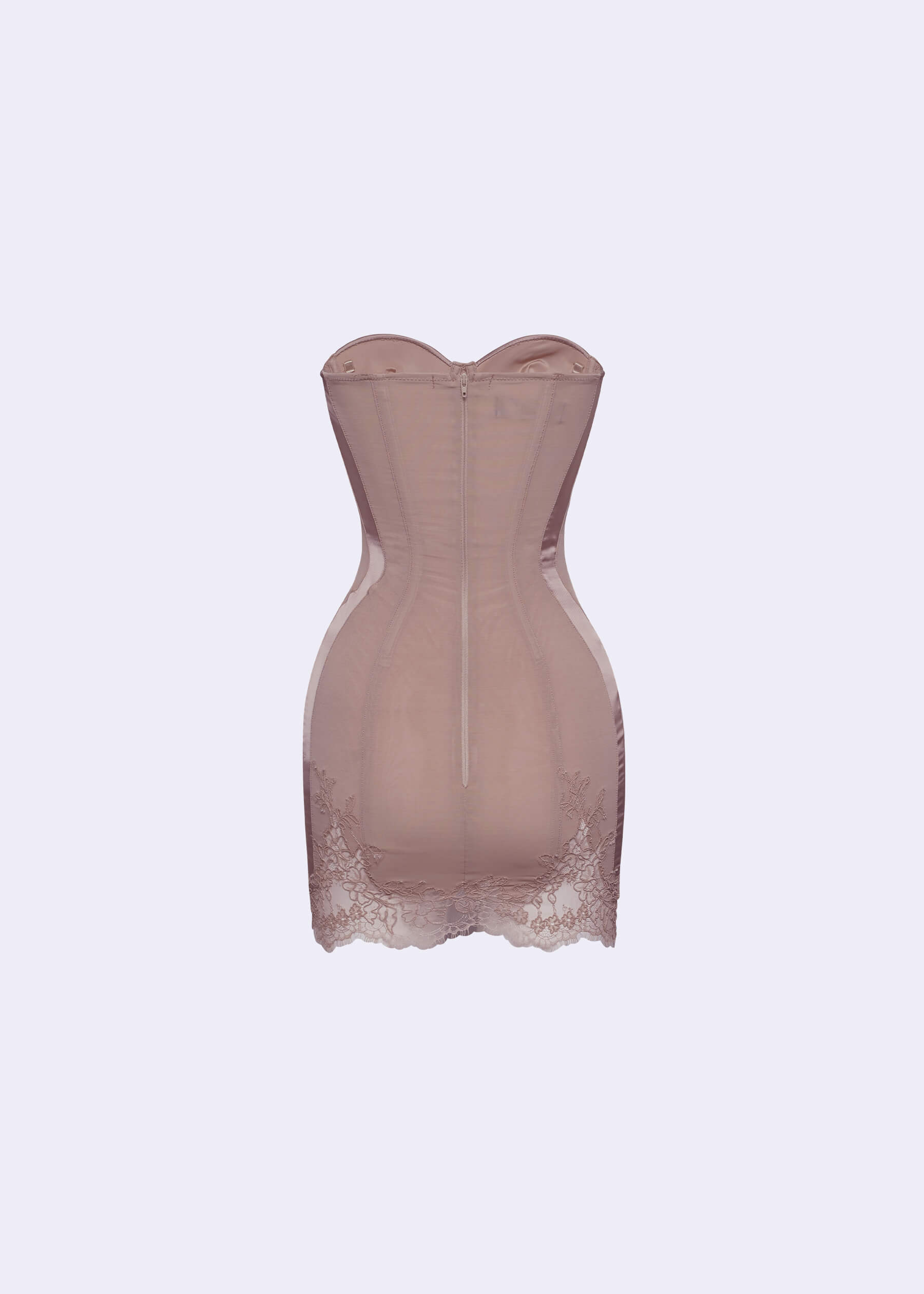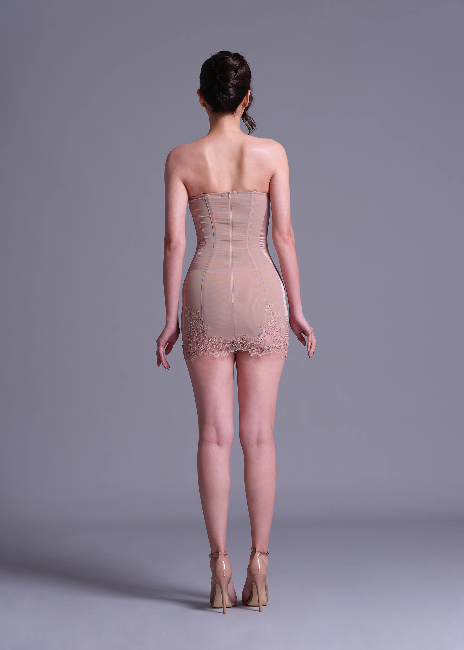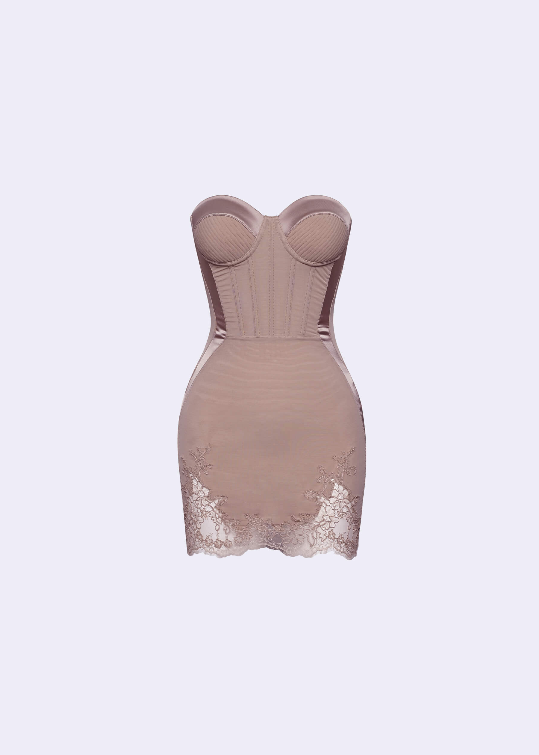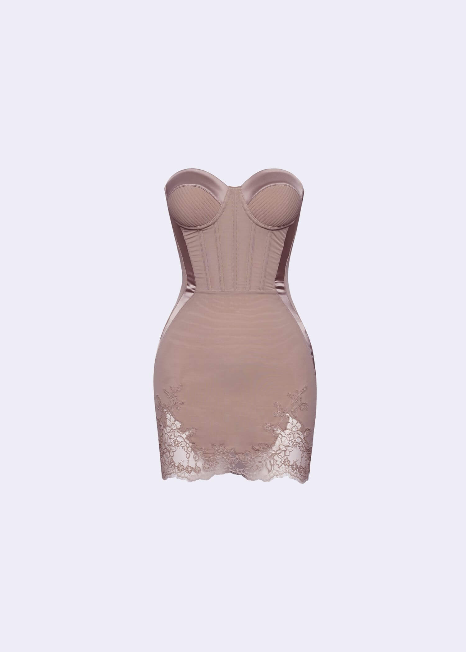 The “Elara” nude bustier minidress, a stunning piece that combines sophistication and sensuality. This exquisite dress is designed to enhance your silhouette with its fitted bustier top, made from luxurious power mesh that offers both support and a flattering fit. The dress features delicate cord lace detailing that adds a touch of elegance, while the stretch satin accents provide a luxurious finish. Pair it with your favorite heels and accessories to complete a look that is both chic and timeless.