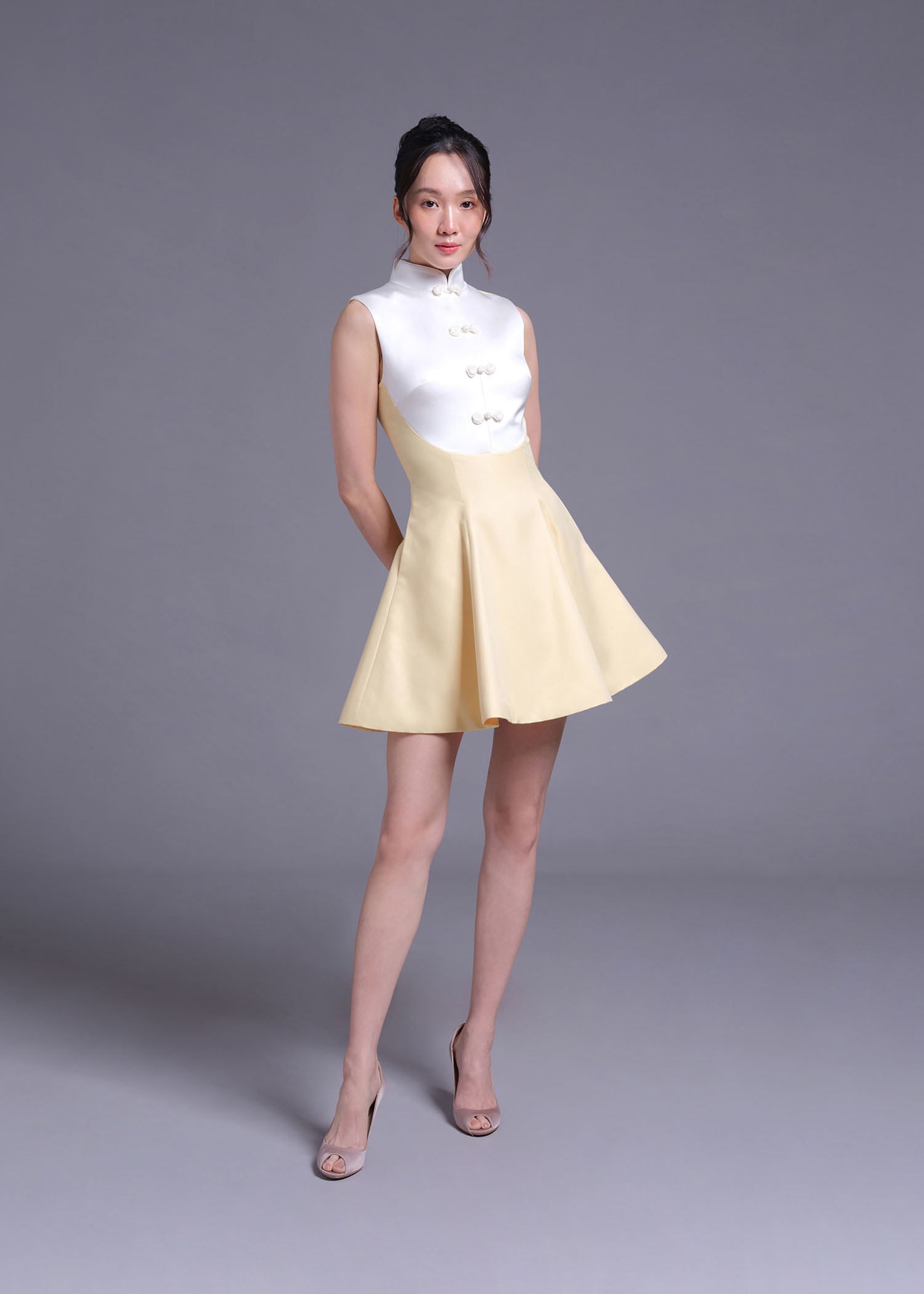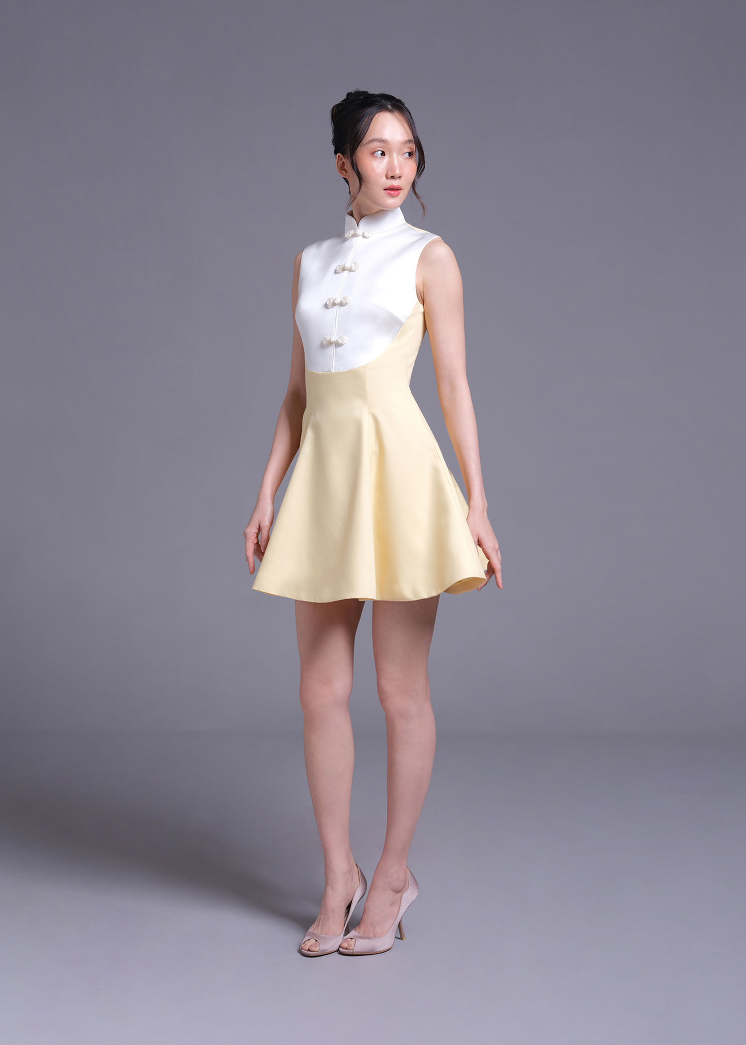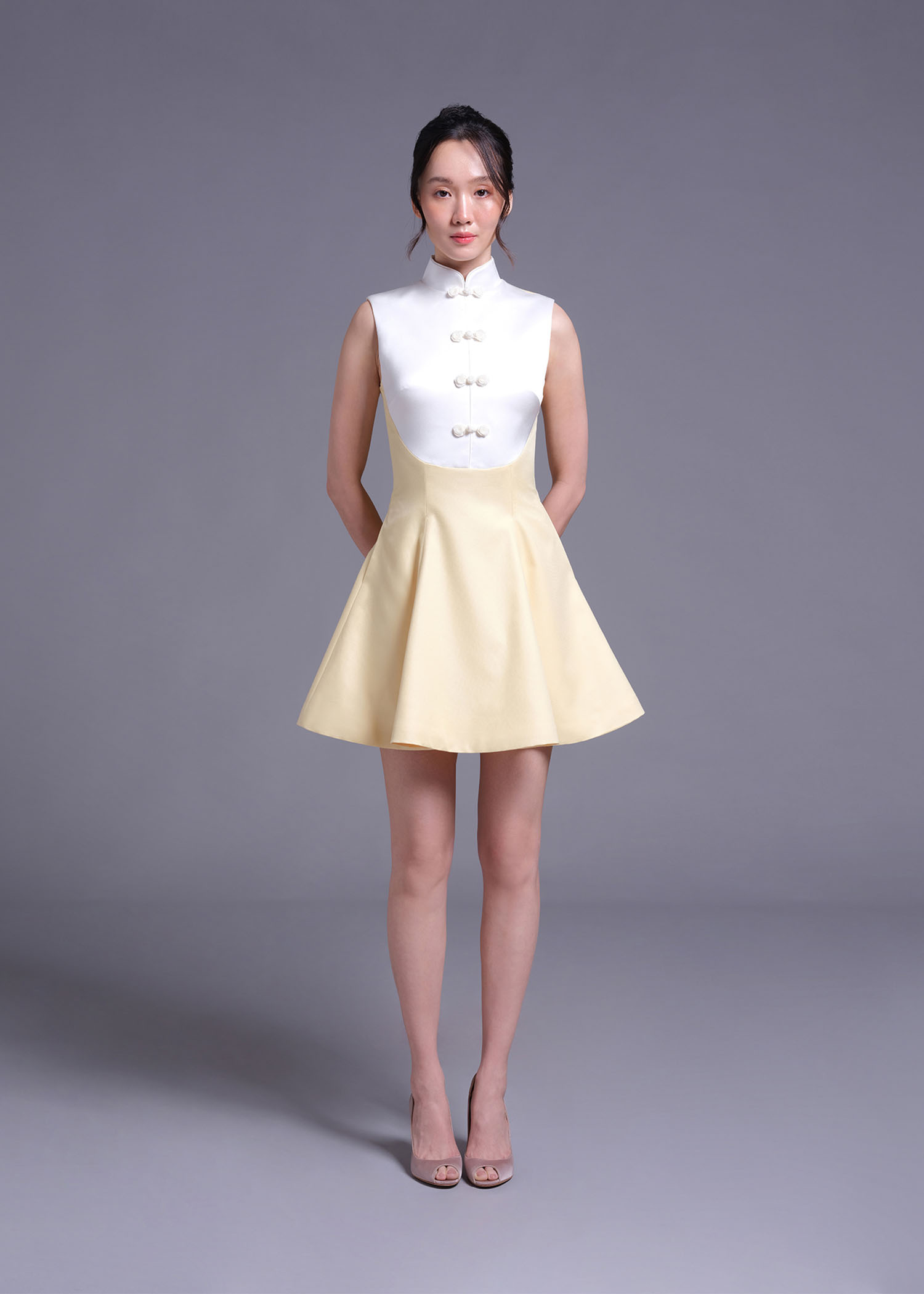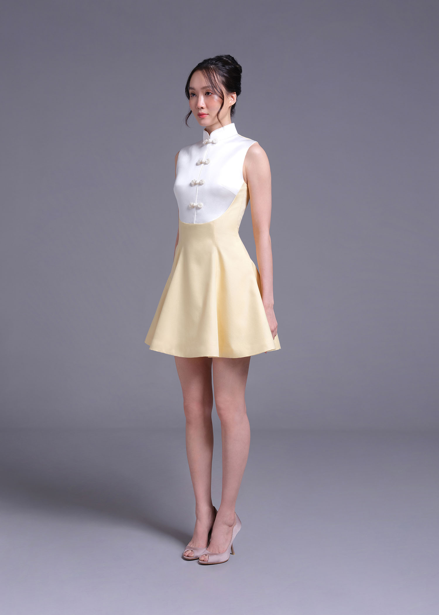 The stunning baby-corn cotton polyester cheongsam A-line mini dress, designed to blend tradition with contemporary style. The delicate off-white duchess polyester details along the collar and trim elevate the overall sophistication of this piece. Featuring an A-line silhouette and a flattering mini length, this dress is perfect for weddings, formal gatherings, or any occasion where you want to stand out.
