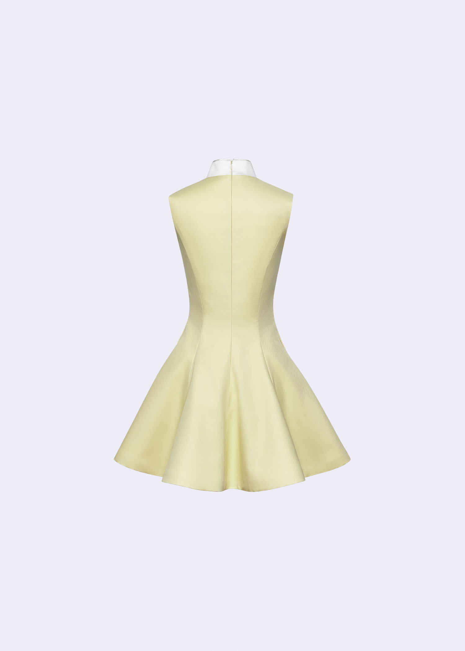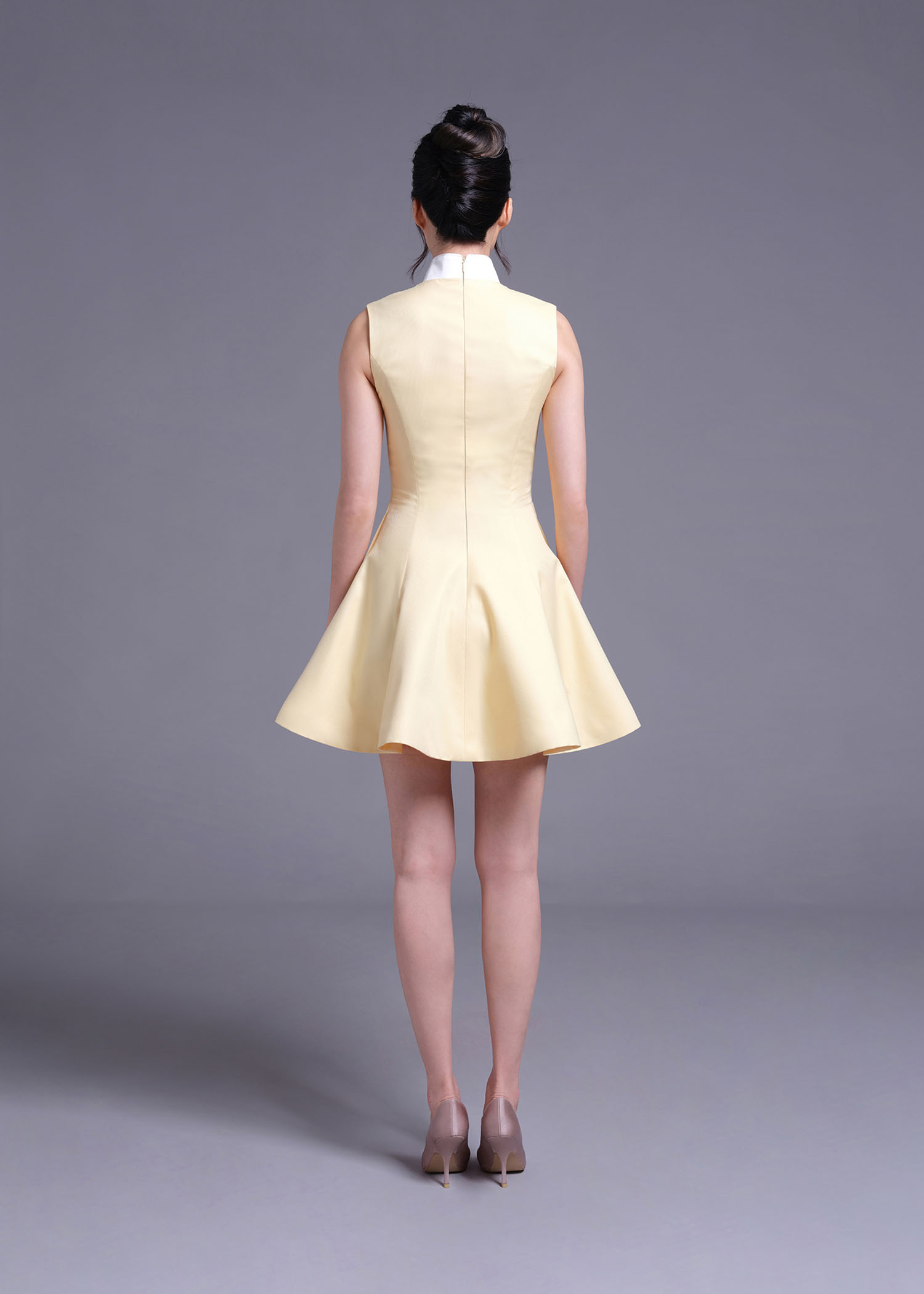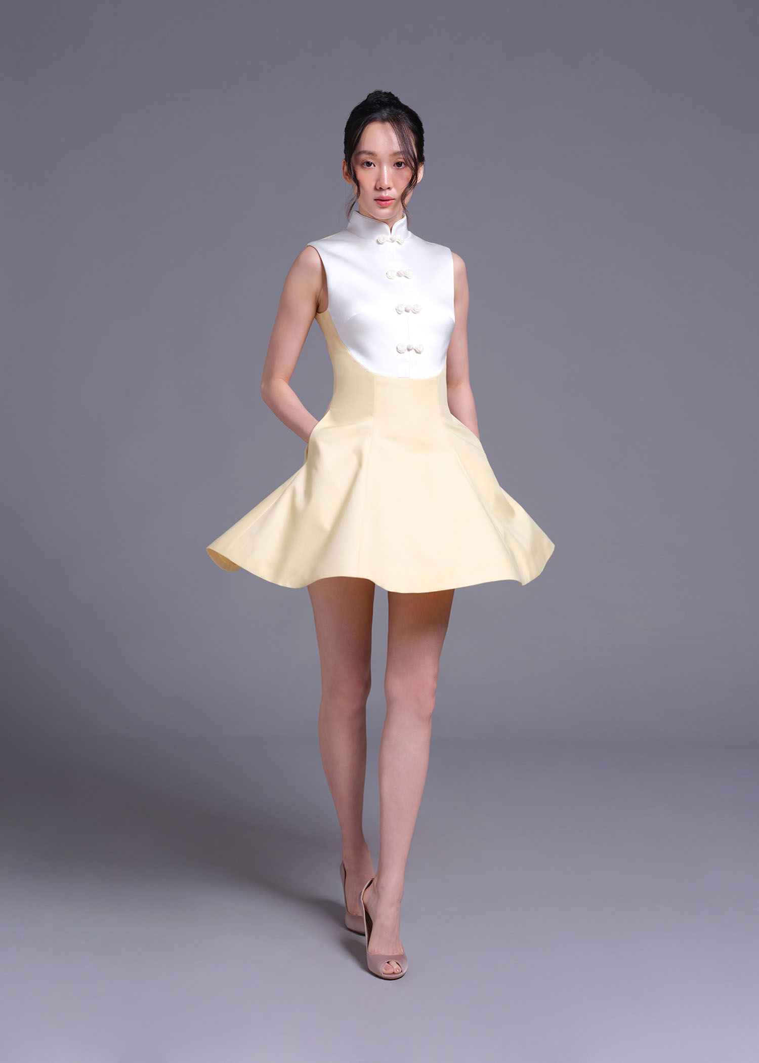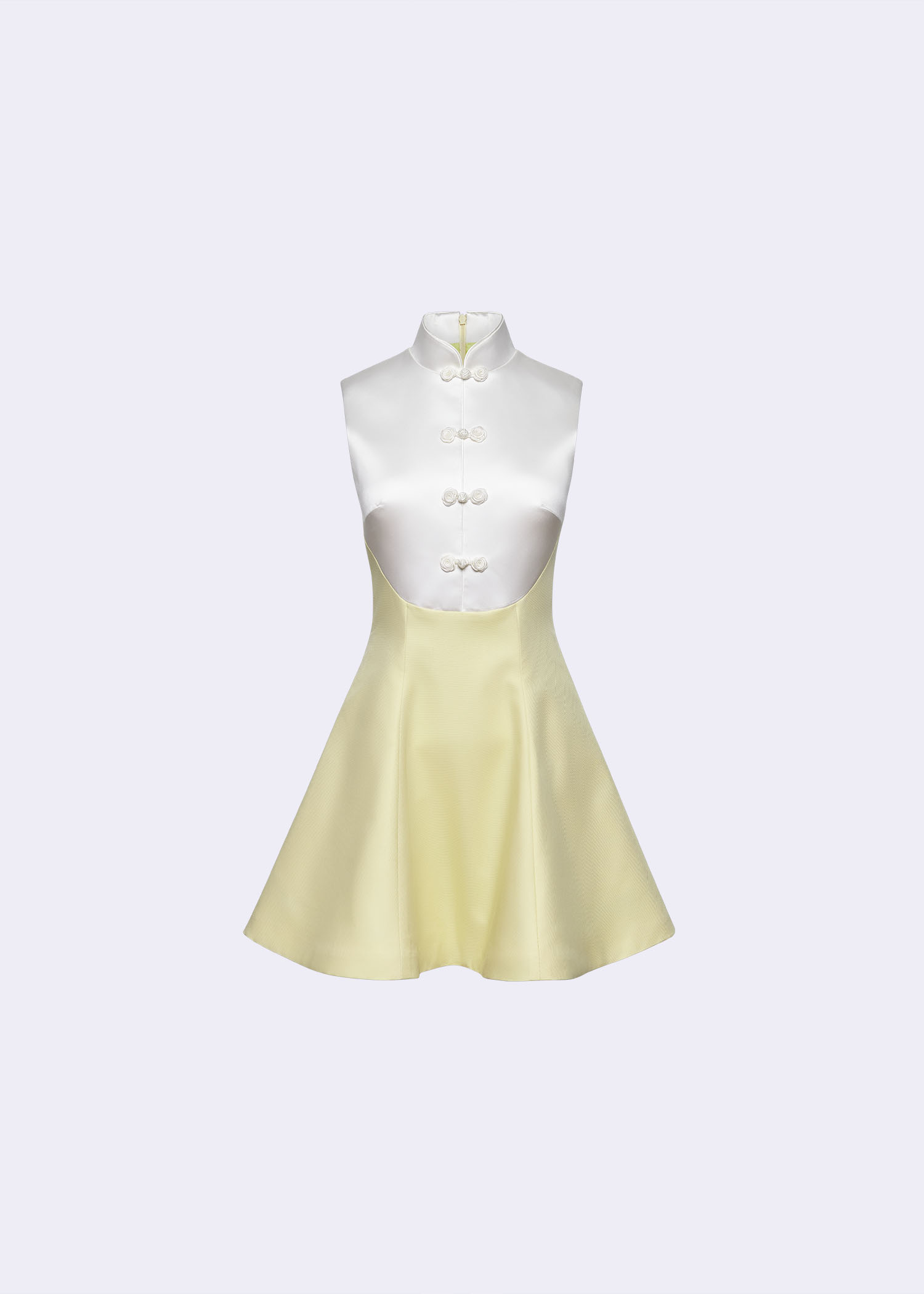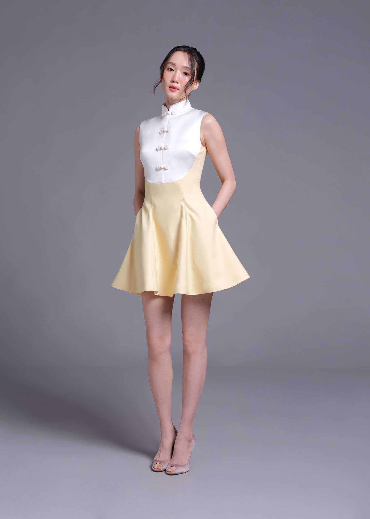 The stunning baby-corn cotton polyester cheongsam A-line mini dress, designed to blend tradition with contemporary style. The delicate off-white duchess polyester details along the collar and trim elevate the overall sophistication of this piece. Featuring an A-line silhouette and a flattering mini length, this dress is perfect for weddings, formal gatherings, or any occasion where you want to stand out.