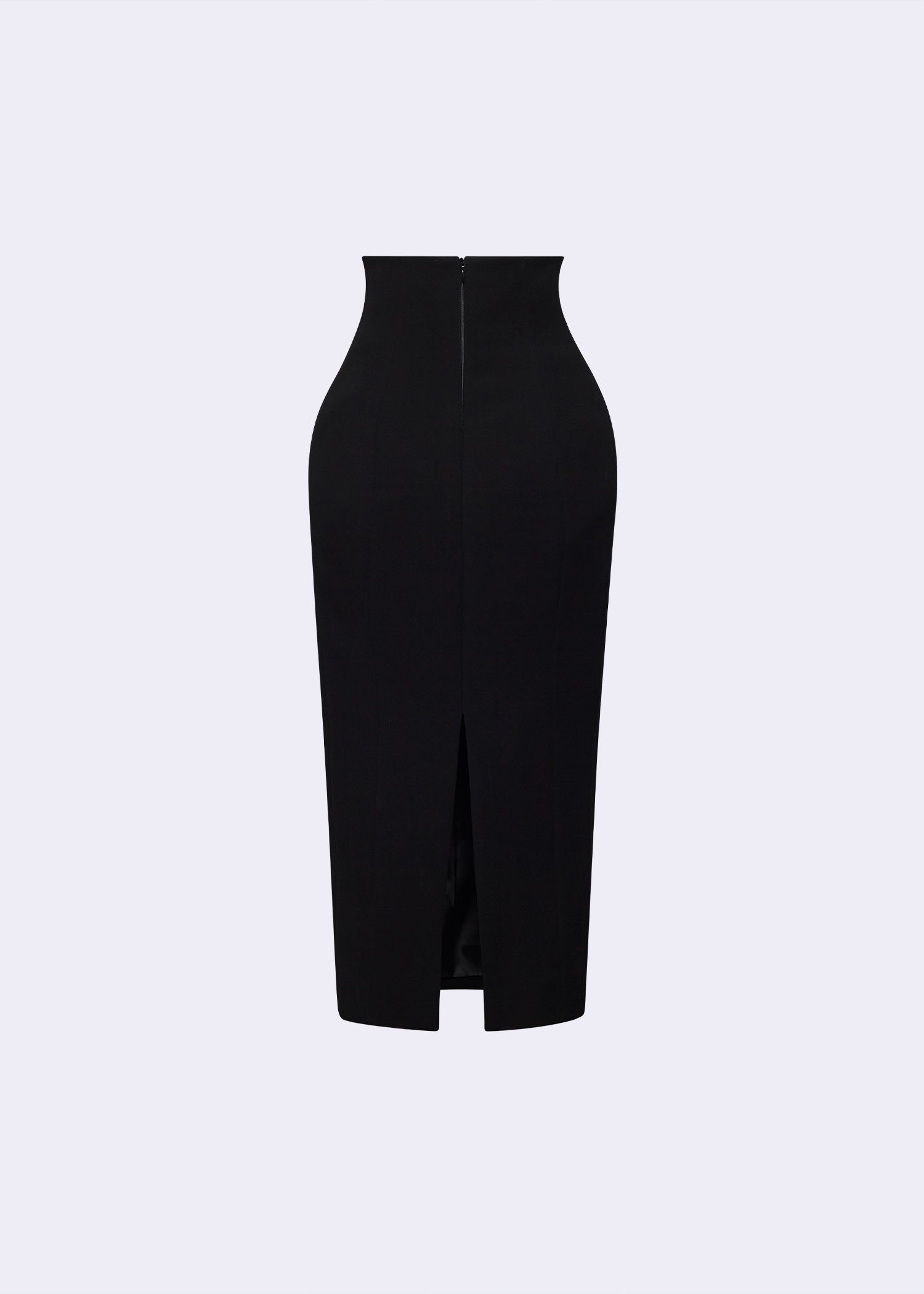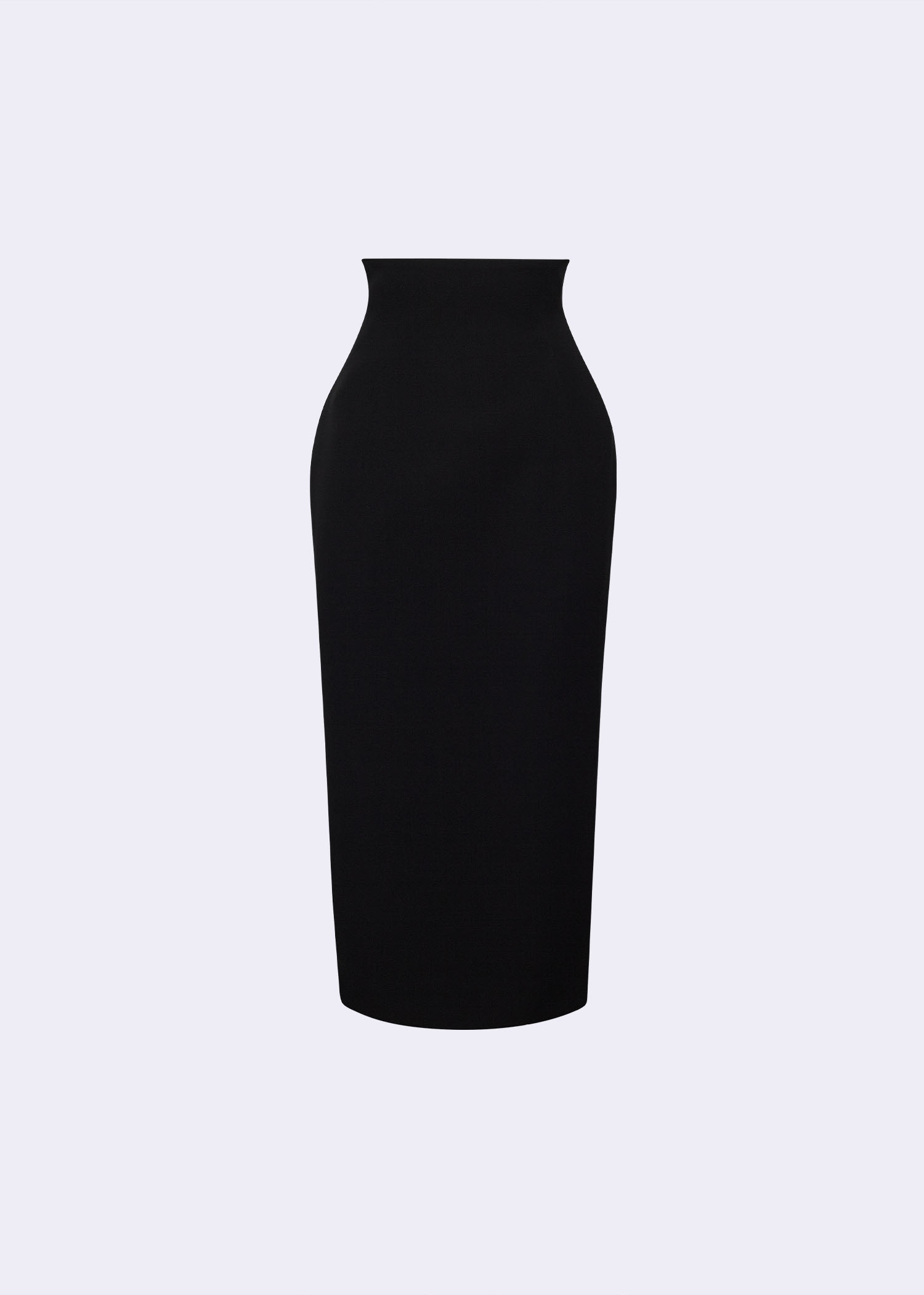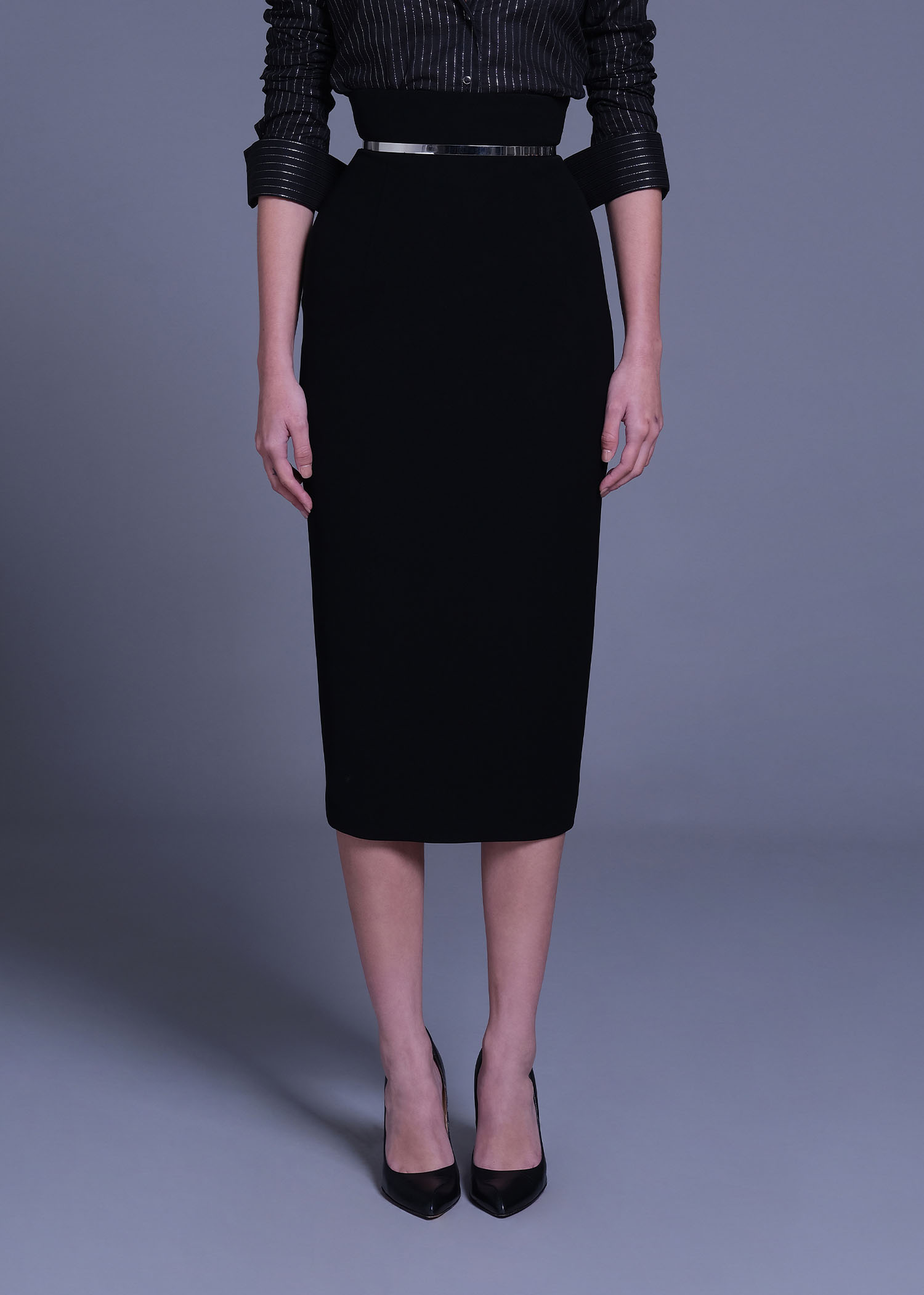 The Black Polyester High-Waist Below the Knee-Length Pencil Skirt, a timeless piece that embodies sophistication and versatility. This classic skirt is designed to flatter your figure with its high-waist cut, creating a sleek and elongated silhouette. The below-the-knee length adds a touch of elegance, making it suitable for both professional and formal settings.