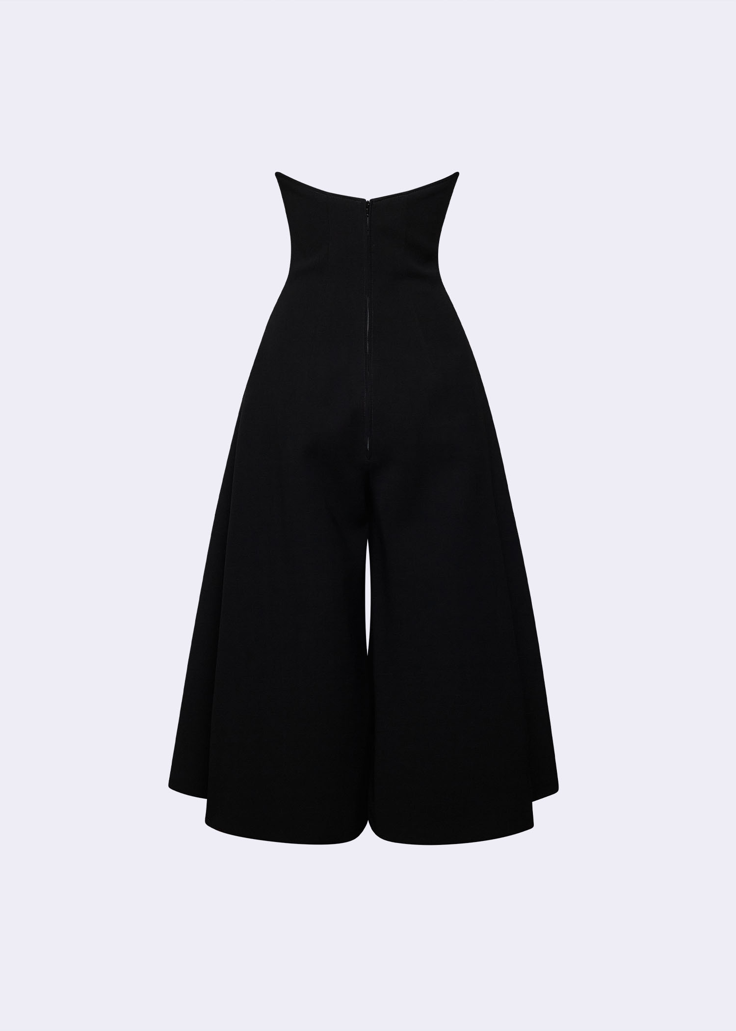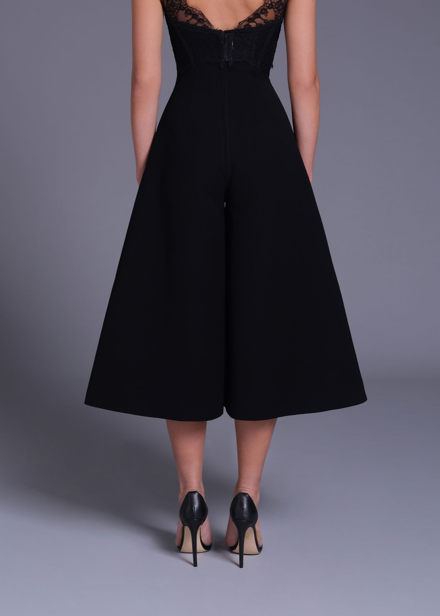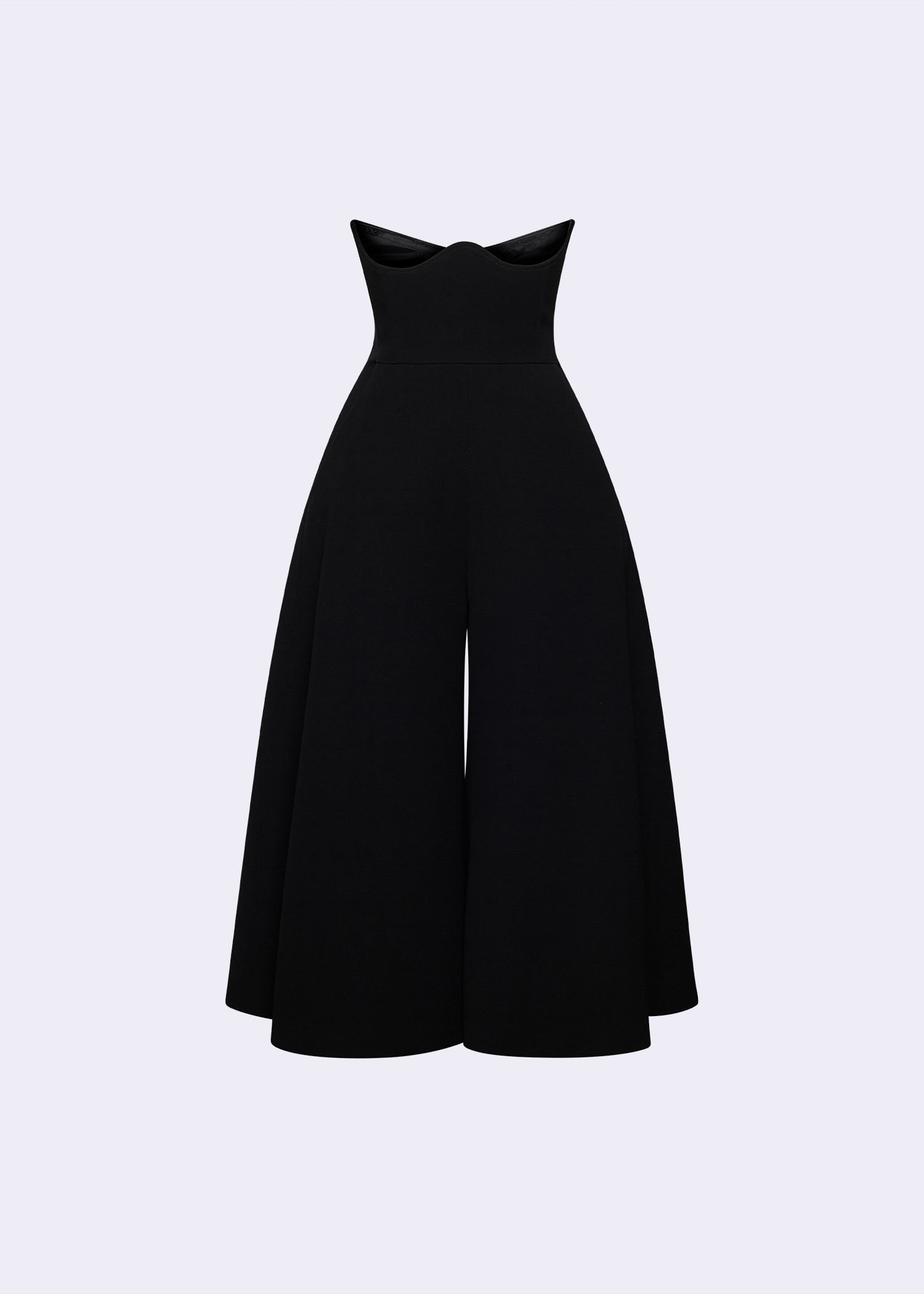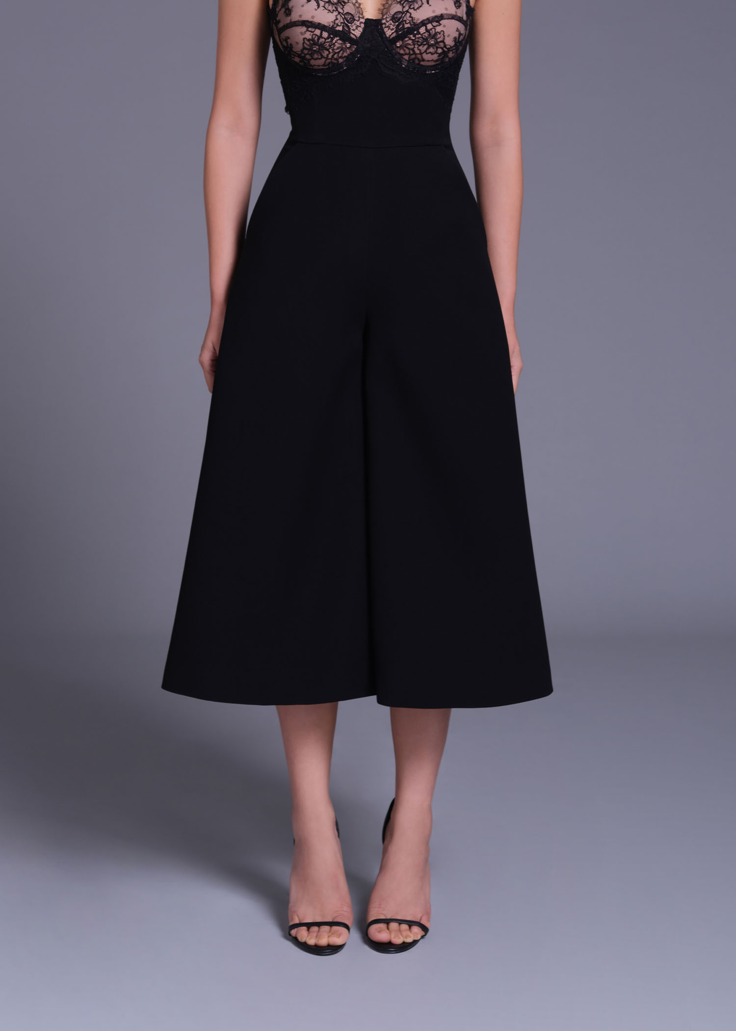 Our black high-waisted wide-leg culotte pants. Crafted from premium-quality polyester, these tailored trousers feature a structured silhouette with a clean front and an elegant below-the-knee length, offering a modern twist on classic wide-leg pants. Designed to flatter the waistline, the high-rise fit ensures comfort and a polished look, perfect for both formal and casual styling. Whether paired with a corset top or a tailored blouse, these black wide-leg culottes are a versatile staple for any refined wardrobe.