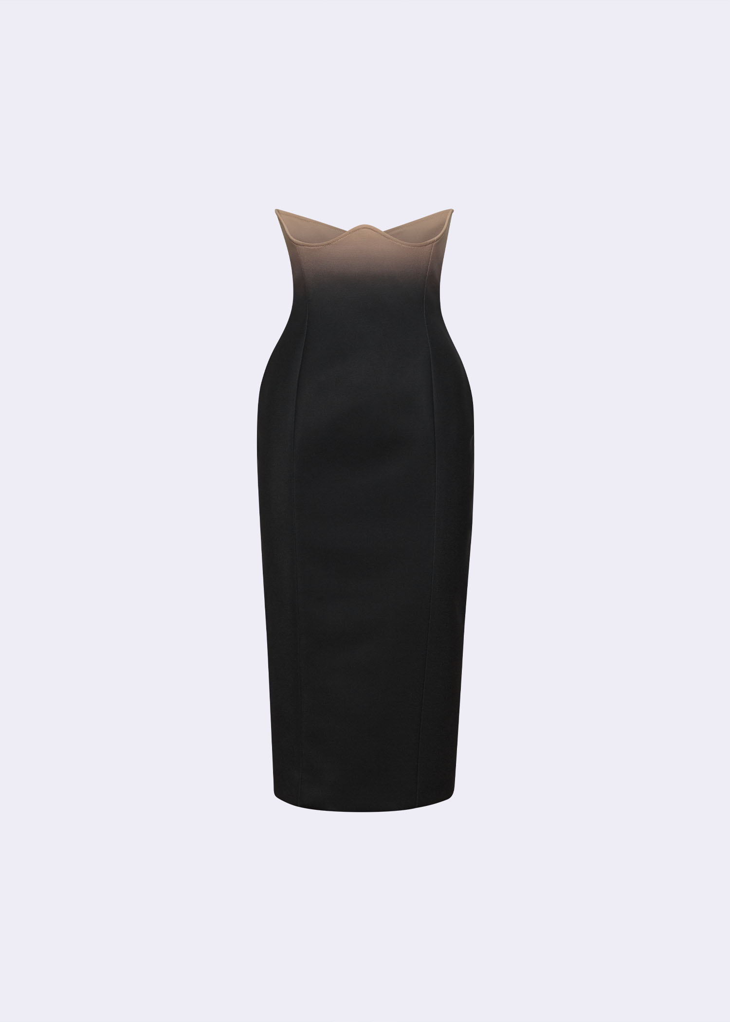 The Black Ombre on Nude Under-Bust Corset Skirt. This elegant skirt showcases a stunning black ombre effect that gradually transitions into a nude polyester base, creating a captivating gradient look. The under-bust corset design cinches the waist, offering a figure-flattering silhouette that enhances your natural curves. Crafted from high-quality polyester, this skirt ensures comfort and style, making it an ideal choice for evening events, parties, or a sophisticated night out. Pair it with a chic blouse, a matching corset top, or a tailored jacket to complete a refined yet bold ensemble. Step out in style with this unique and fashionable piece.