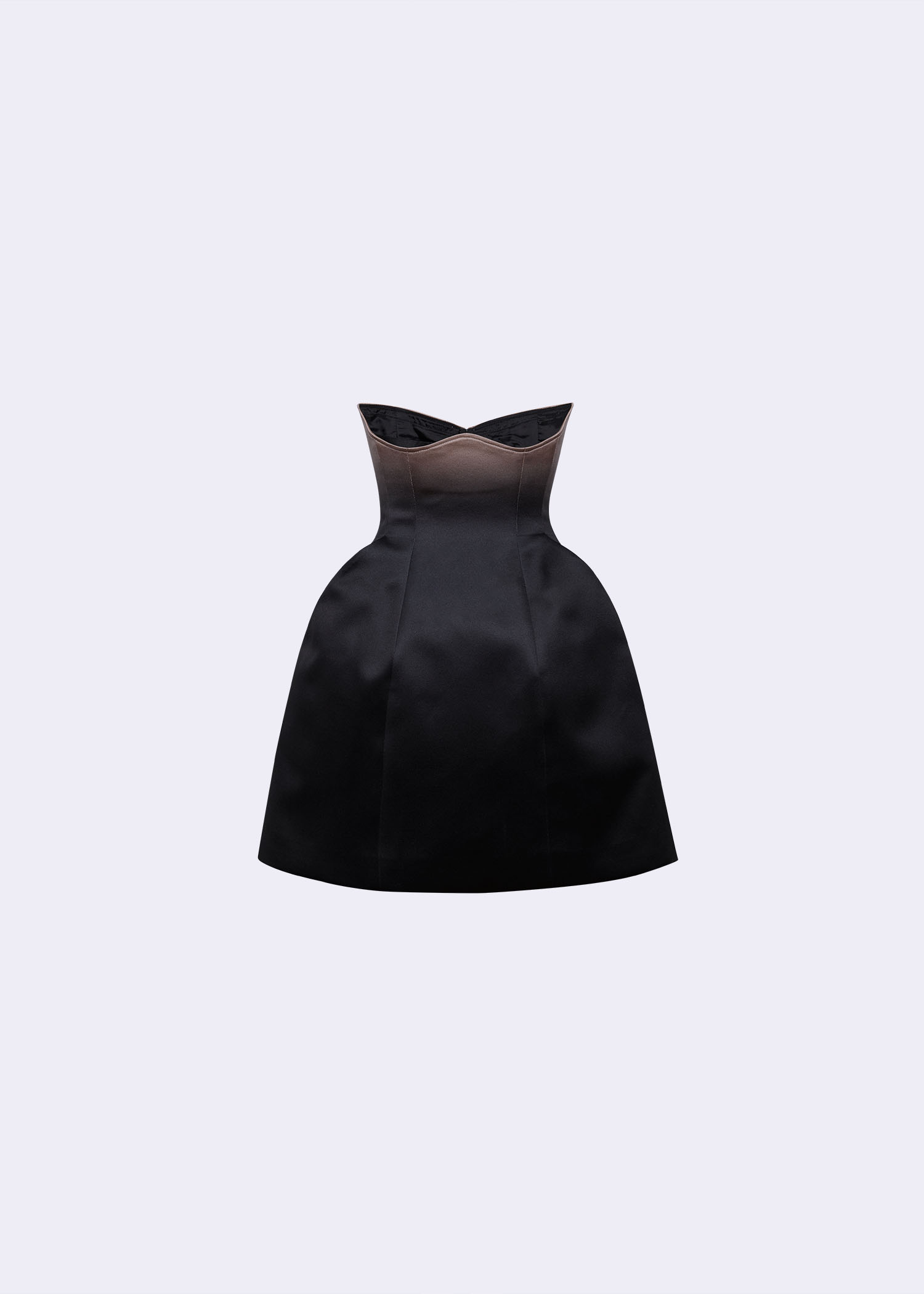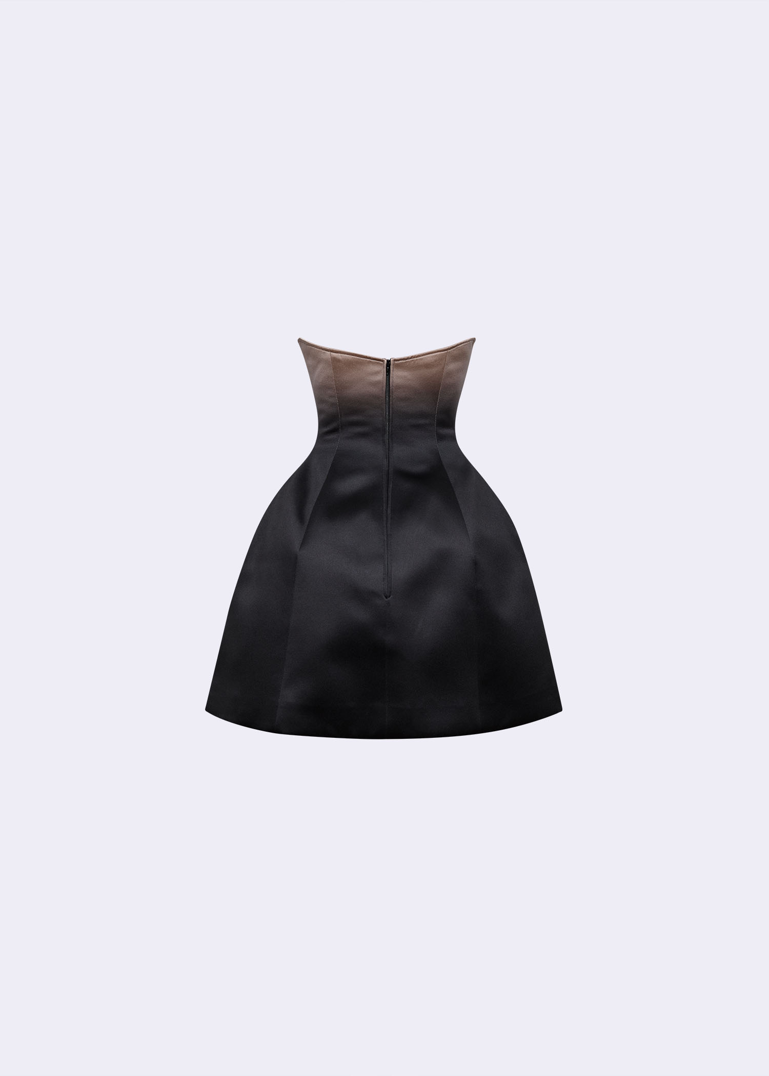 The Black Ombre on Nude Under-Bust Corset Mini Bell Skirt. This unique piece features a striking black ombre effect that fades into a soft nude hue on luxurious duchess polyester fabric. The under-bust corset design provides a flattering and defined waistline, while the mini bell skirt adds a playful, flared silhouette, perfect for making a fashion statement. The high-quality duchess polyester ensures a smooth, structured fit, making it ideal for special occasions, evening events, or a stylish night out. Pair it with a matching corset top or a sleek blouse to complete a chic ensemble. Make every moment stylish with this standout skirt.
