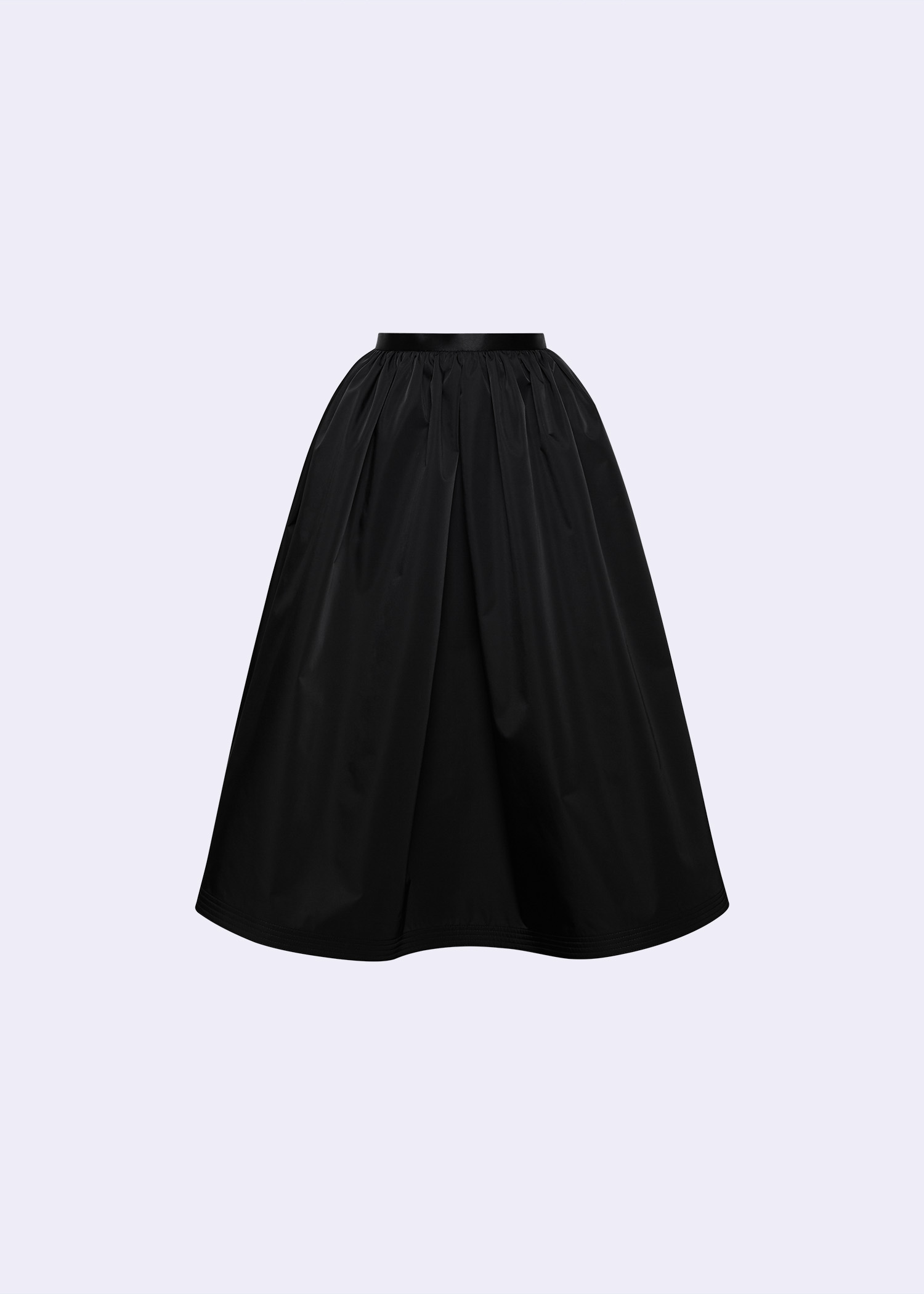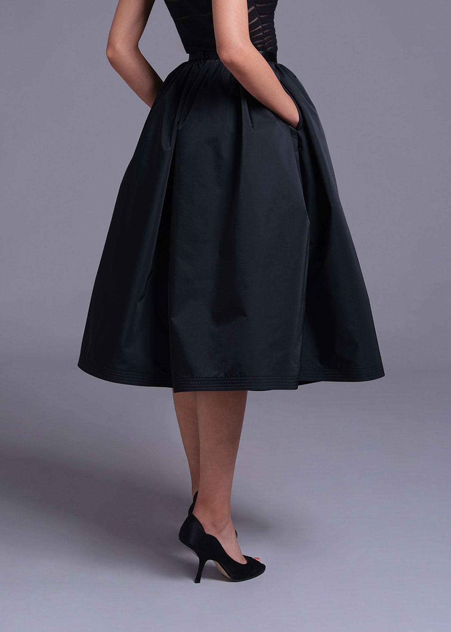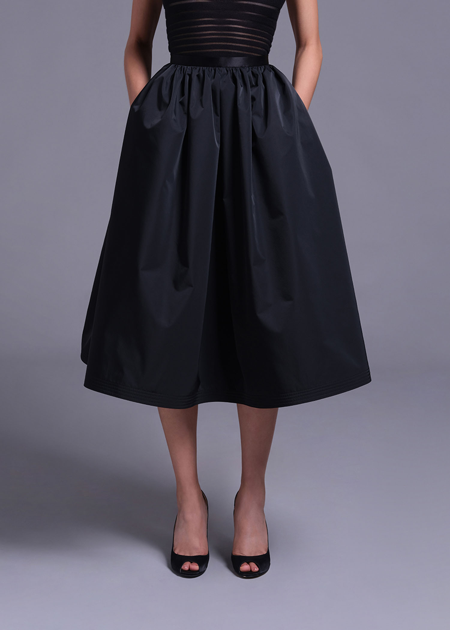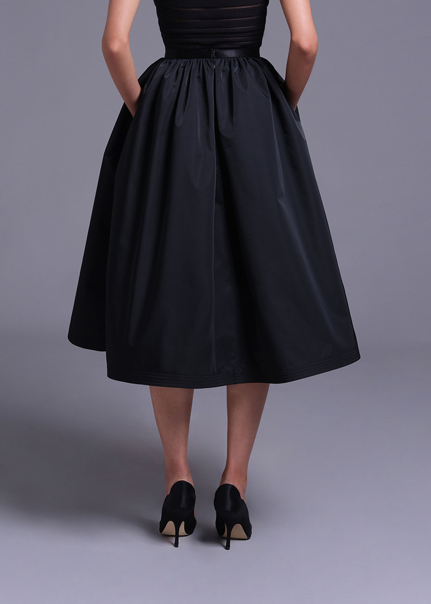 The Black Round Skirt. Crafted with premium micro polyester and accented by a luxurious satin-crepe waistband, this skirt offers a flattering, flowy silhouette that falls gracefully below the knee. Its versatile design makes it a must-have for formal events, workdays, or stylish everyday wear. The subtle sheen of the satin-crepe detail adds a touch of sophistication to this classic black piece.