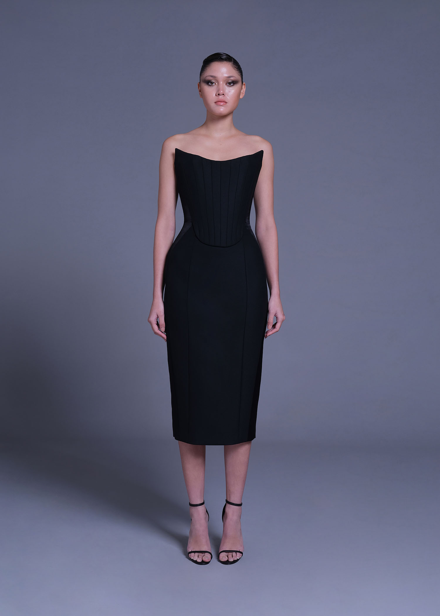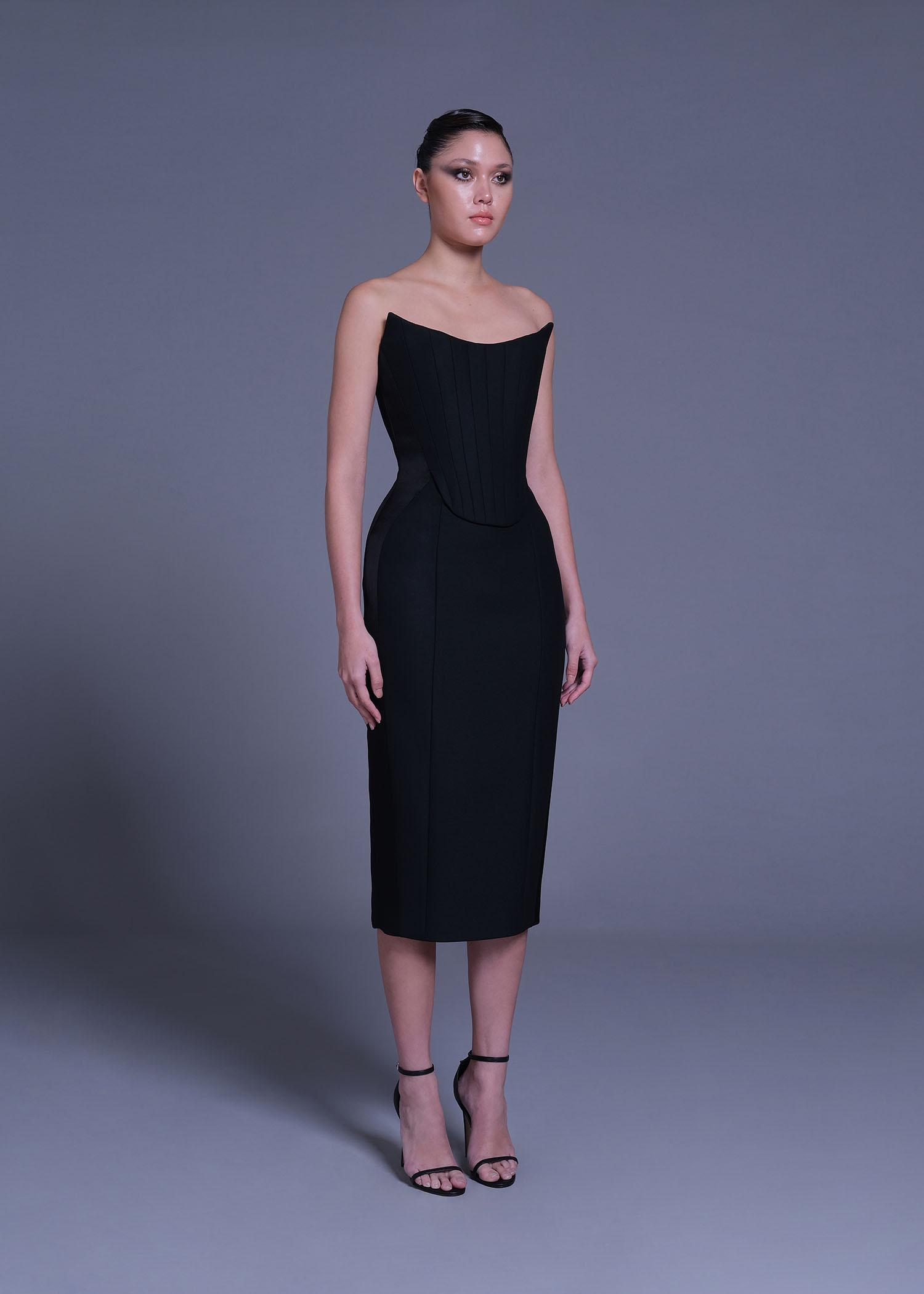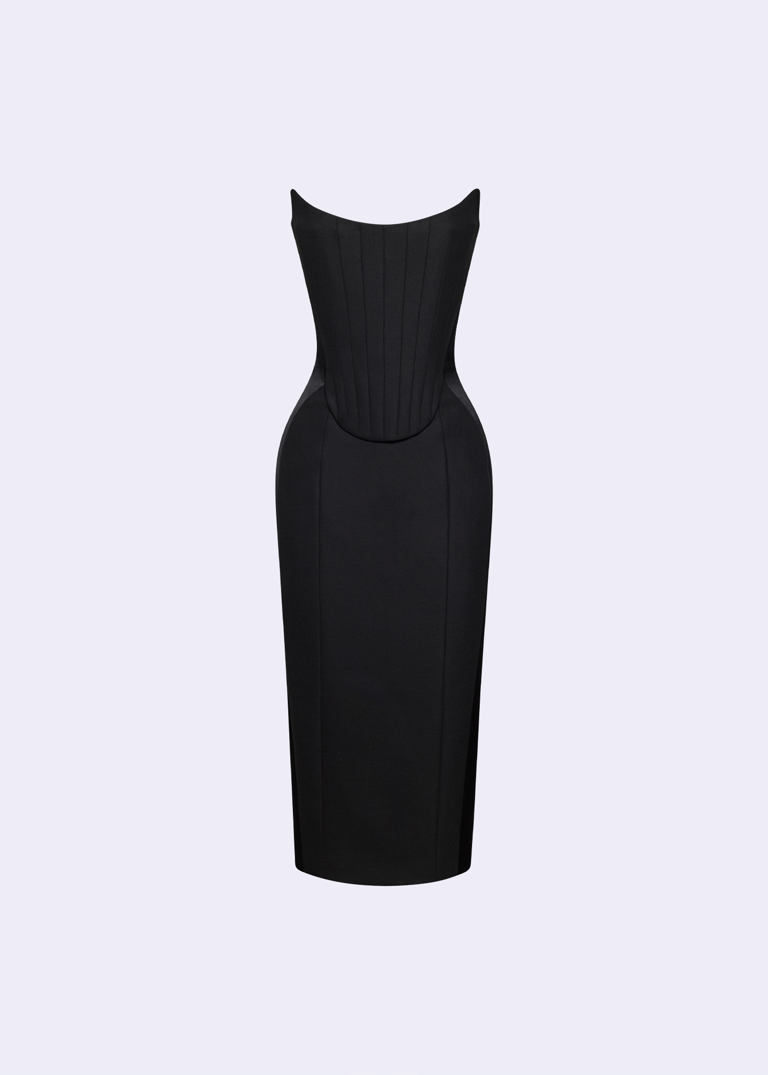 The Black Strapless Sheath Dress, a stunning blend of elegance and edge. This chic dress is crafted from a premium polyester viscose blend, offering a sleek and comfortable fit that flatters your figure. The strapless design exudes confidence and sophistication, while the satin-crepe accents add a touch of luxury.