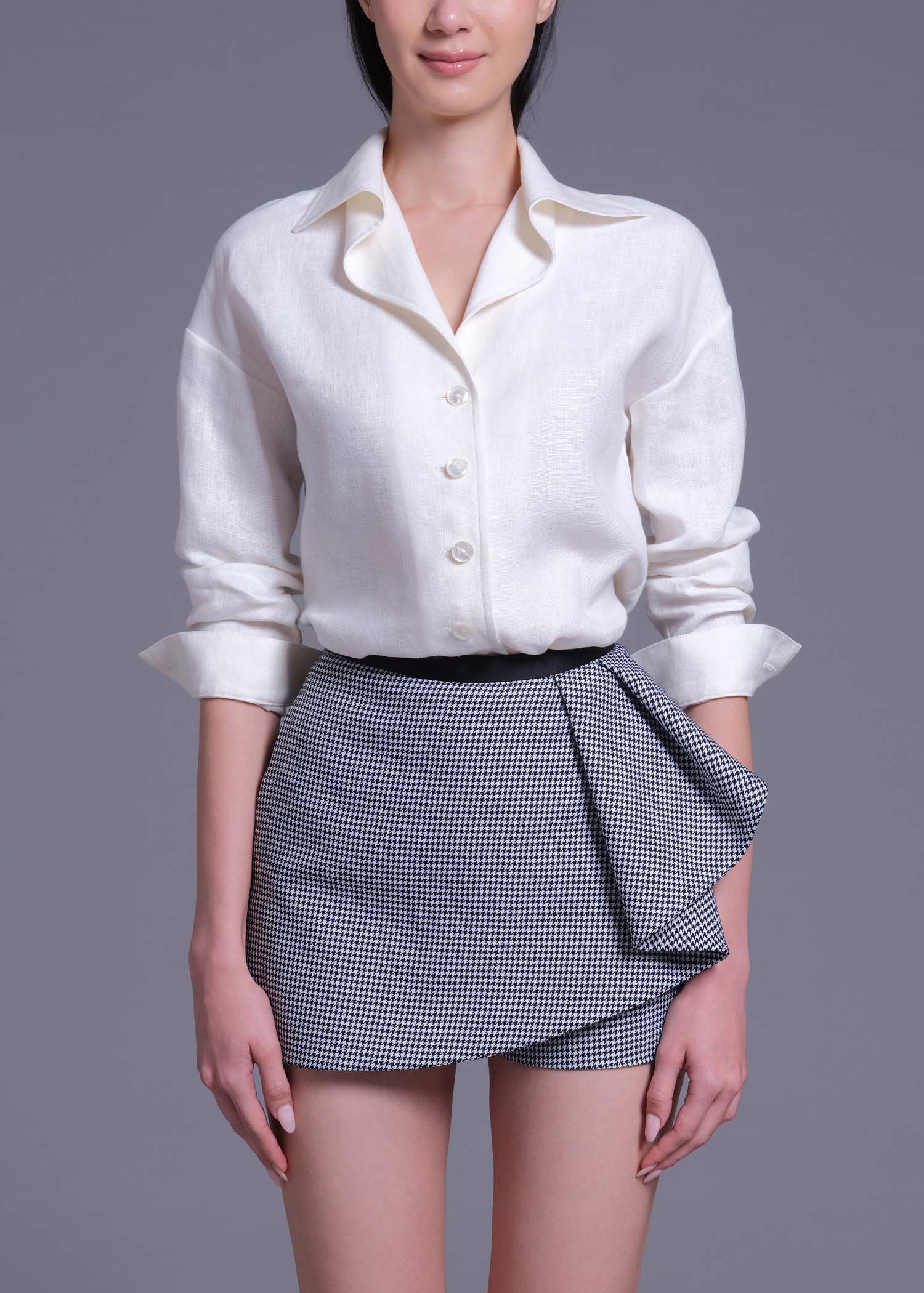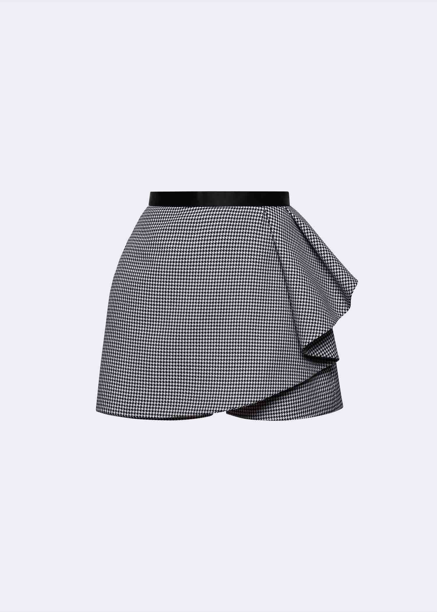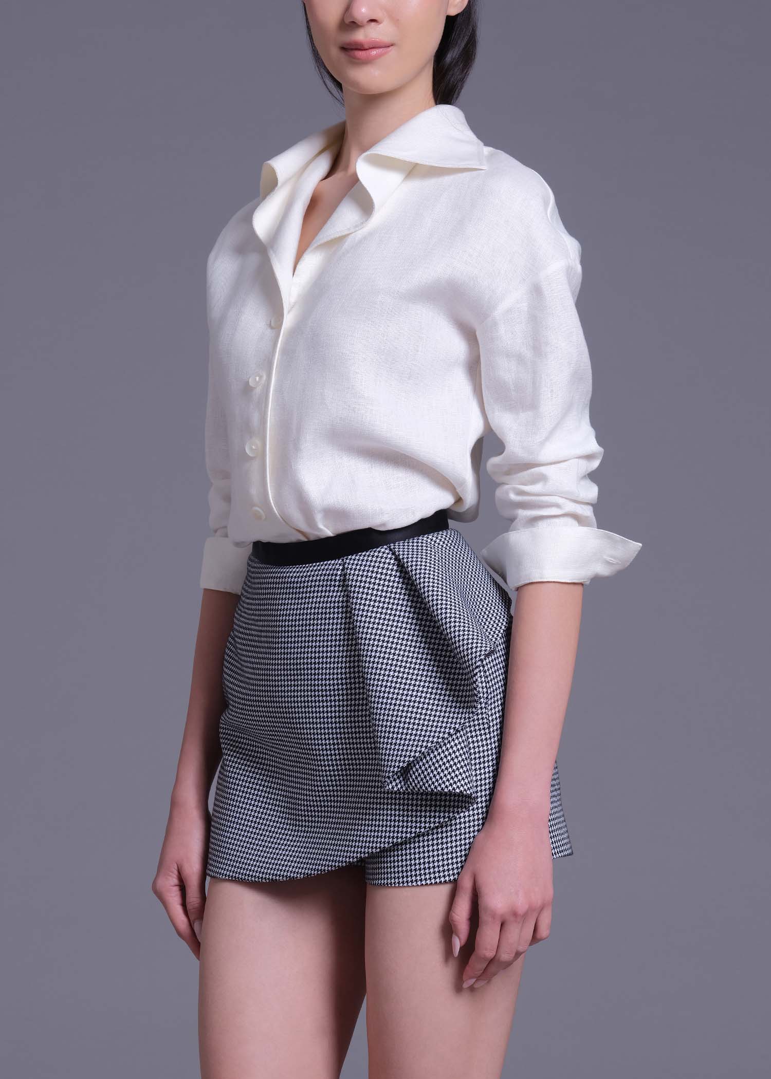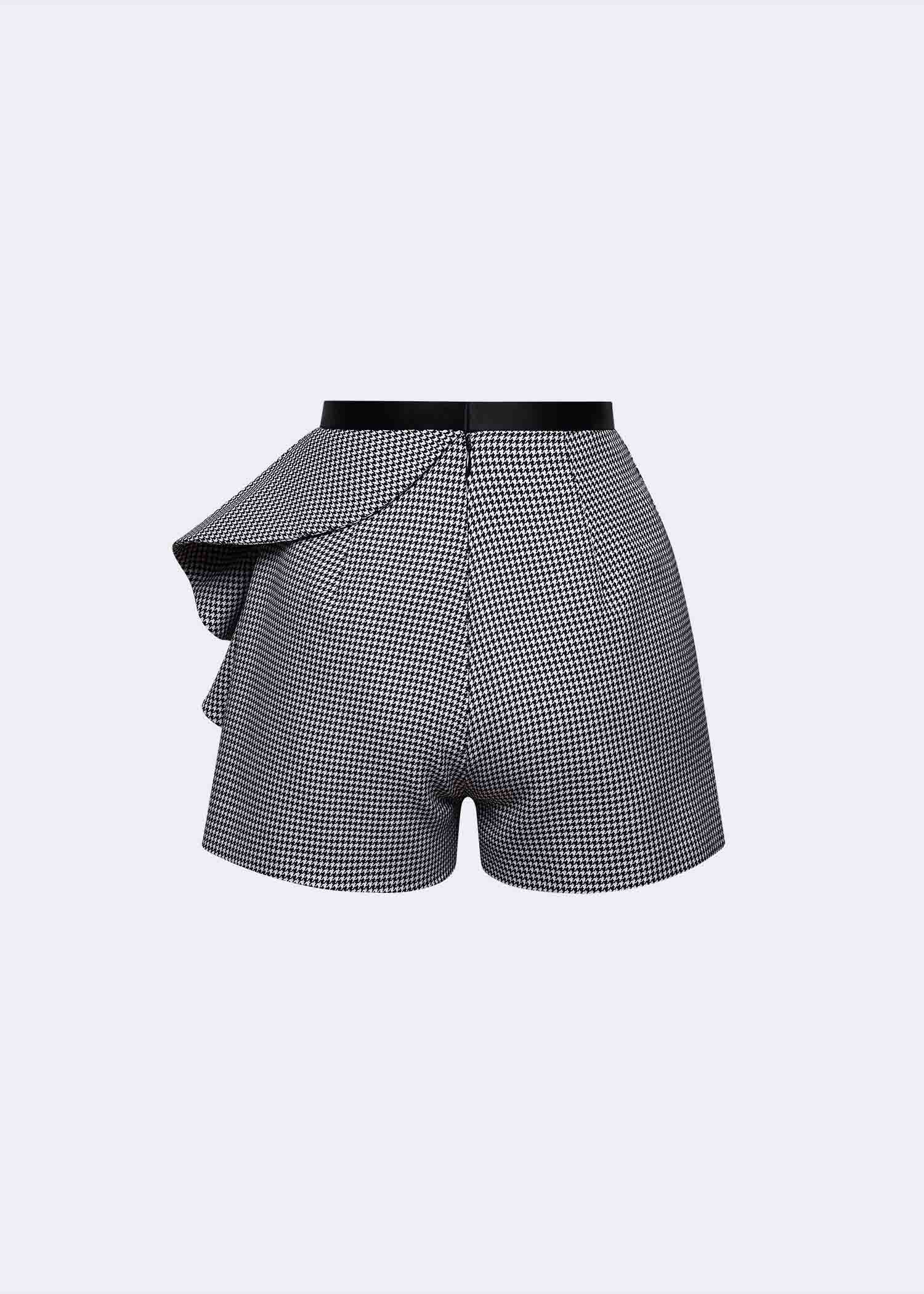 Our black & white houndstooth shorts, designed to blend structured tailoring with feminine movement. The eye-catching cascading side-ruffle detail adds dimensional elegance, while the contrasting black satin-crepe waistband enhances the silhouette with a polished, waist-defining finish. Crafted from durable polyester fabric with a classic micro-houndstooth pattern, this modern piece offers both comfort and versatility, perfect for styling with crisp shirts, soft blouses, or sharp blazers for a sophisticated day-to-evening transition. Ideal for contemporary wardrobes that embrace refined tailoring, statement textures, and elevated smart-casual dressing