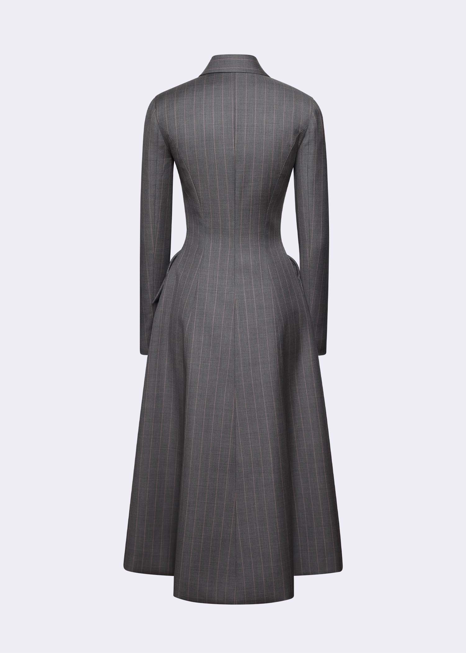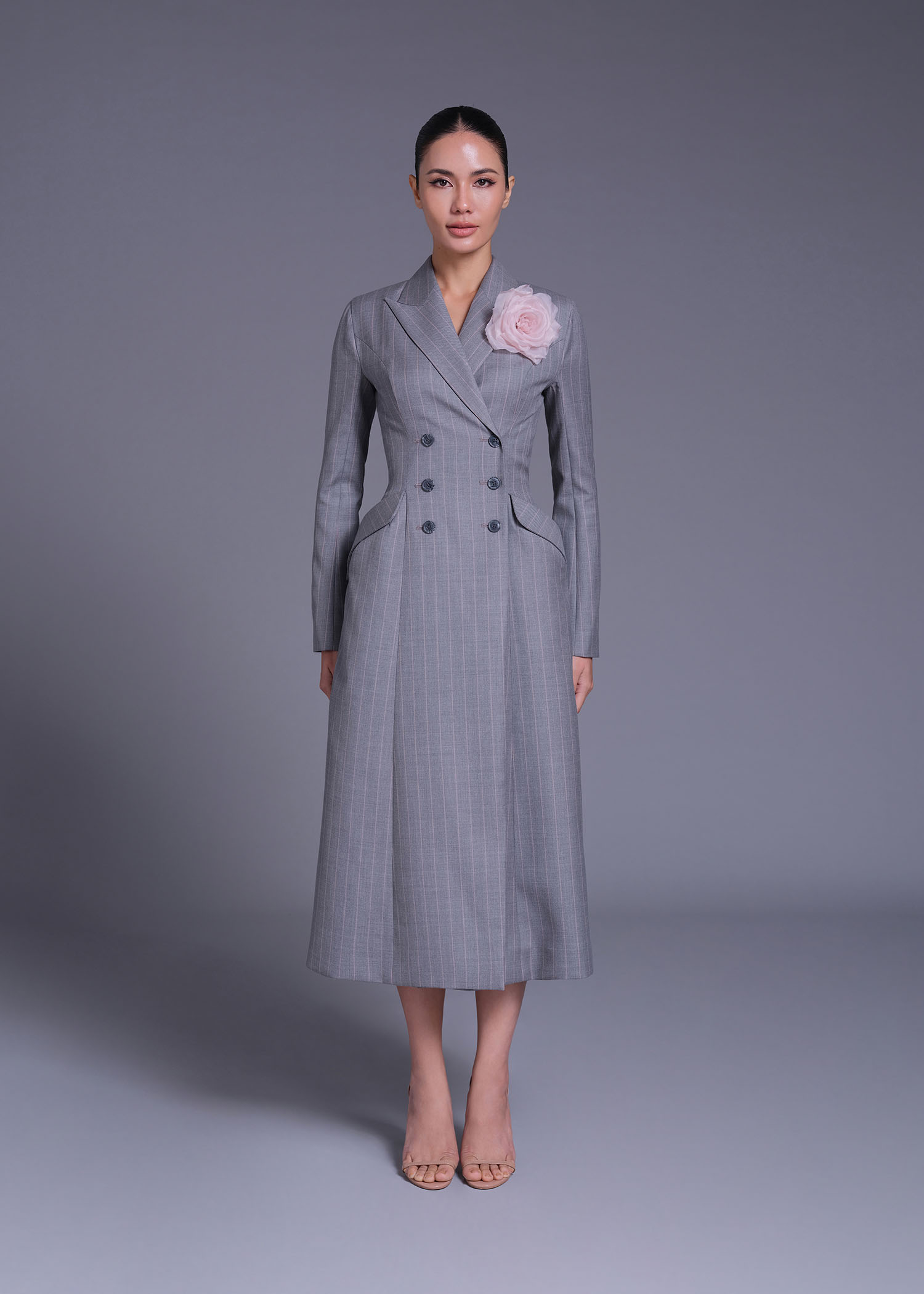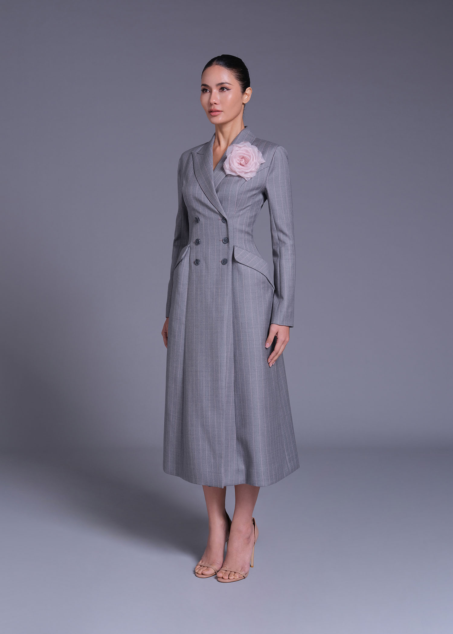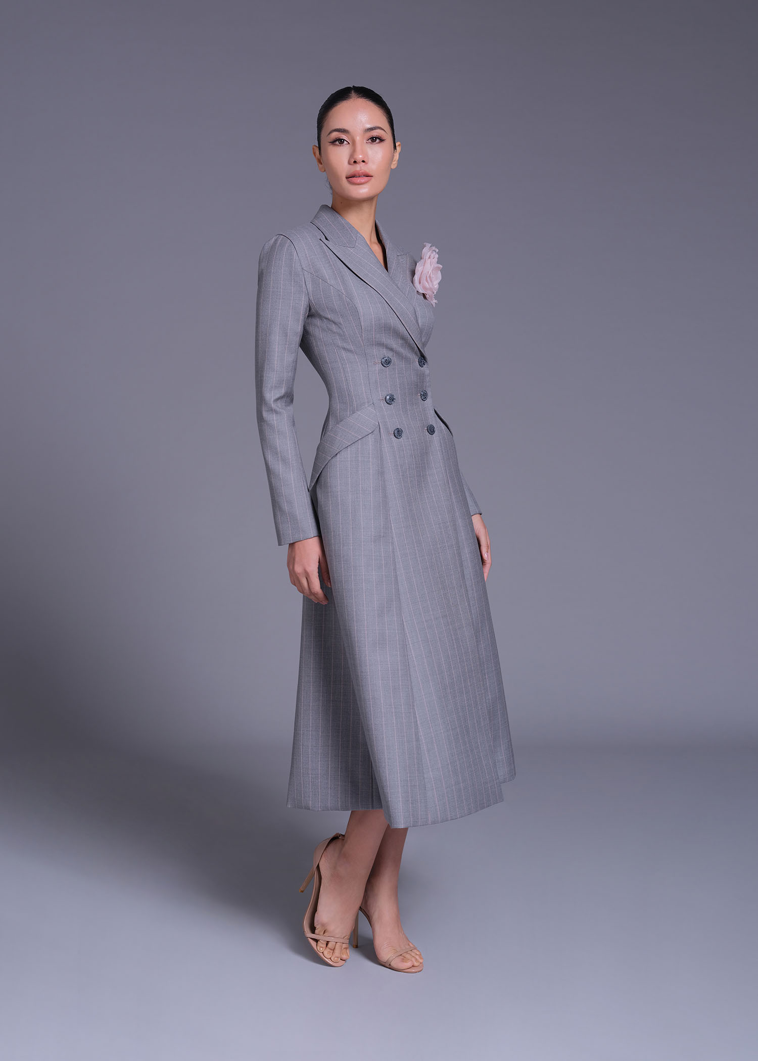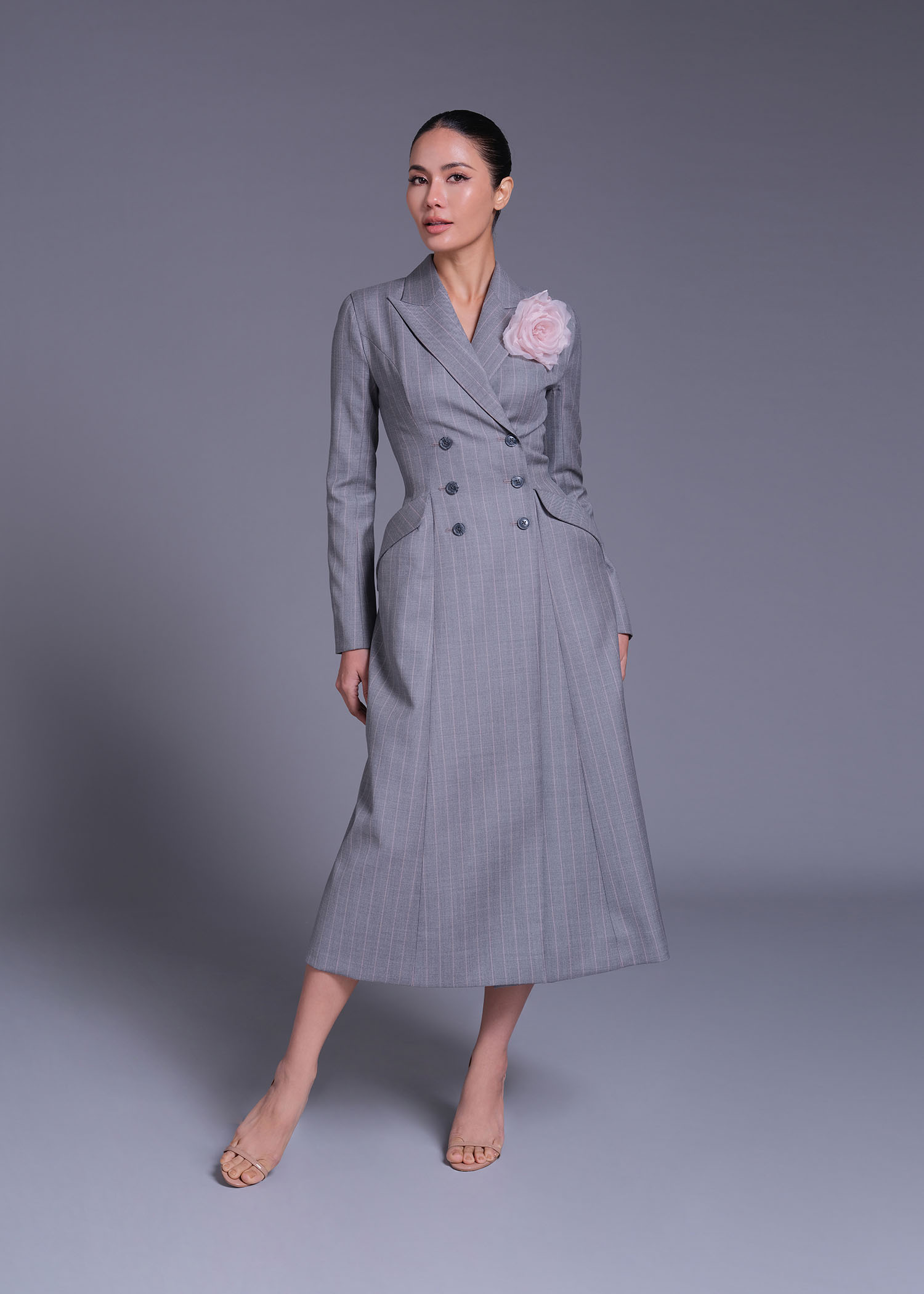 The grey chalk stripe wool “Windermere” double-breasted coat dress embodies refined tailoring with a modern feminine edge. Crafted from premium wool, its structured silhouette and double-breasted front highlight timeless sophistication, while the chalk stripe pattern adds a touch of sartorial charm. Designed to transition seamlessly from day to evening, the “Windermere” coat dress offers versatility, elegance, and polished style for any occasion.