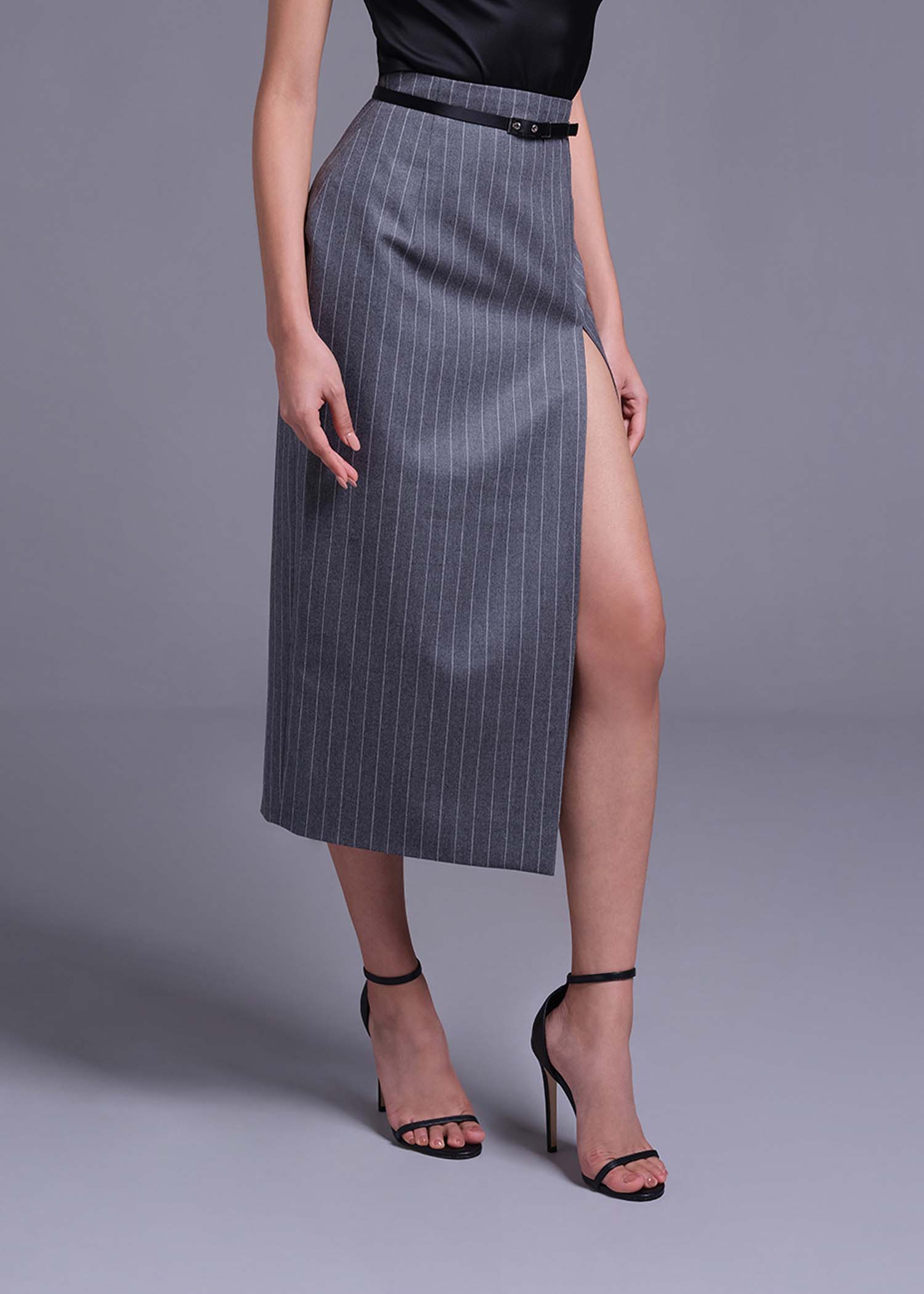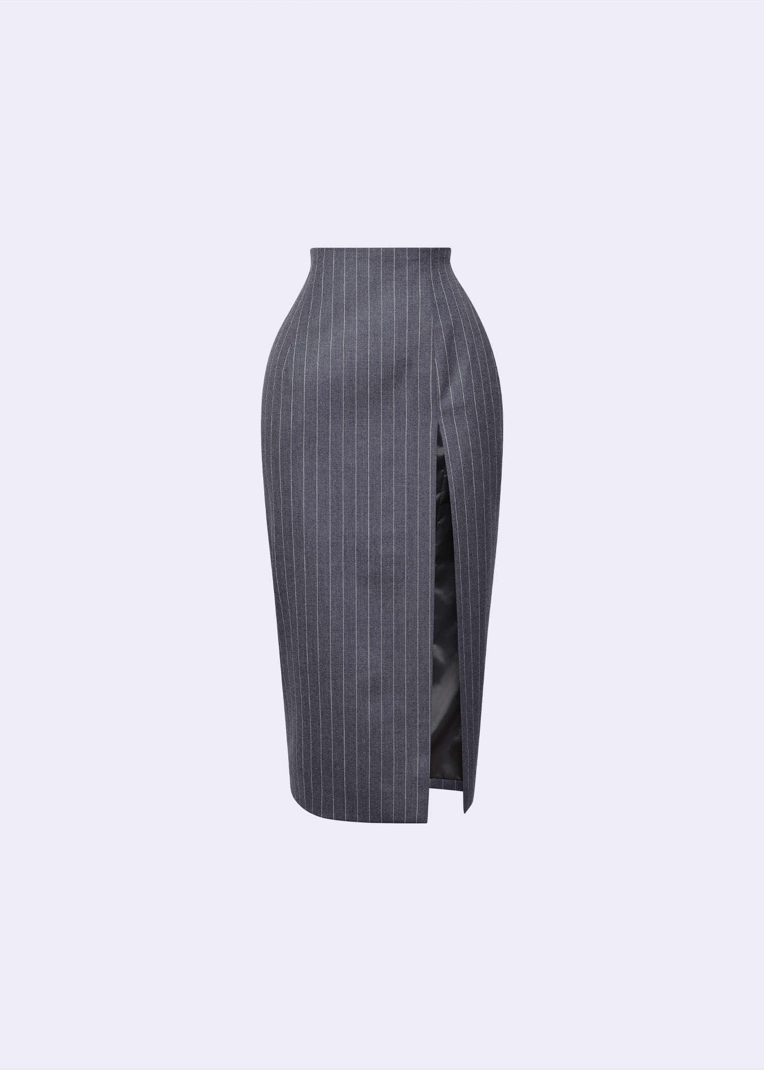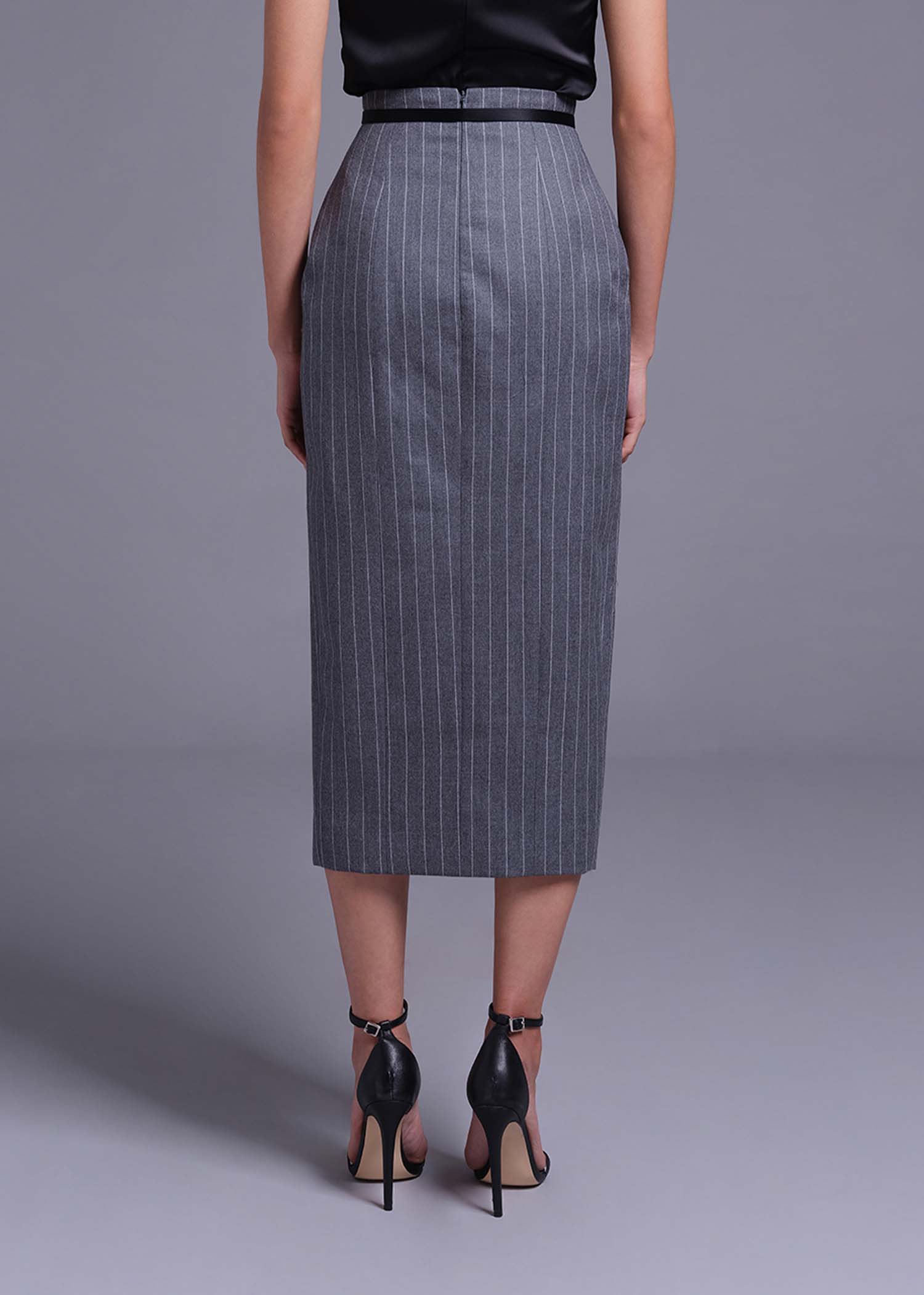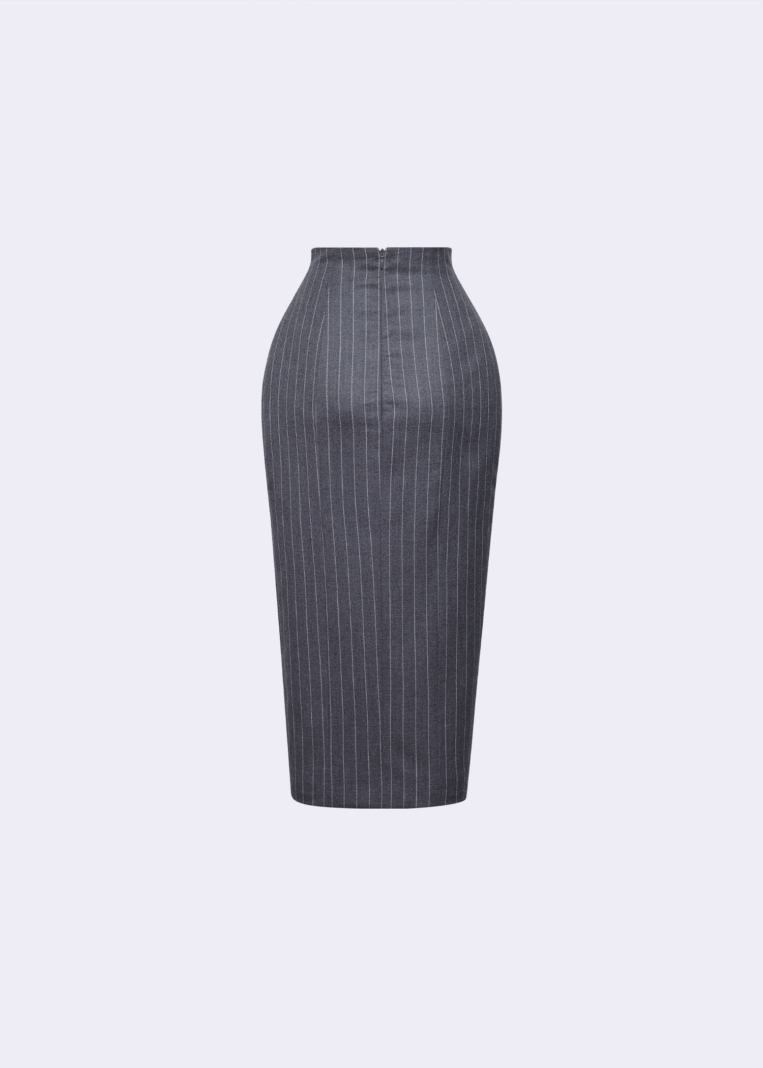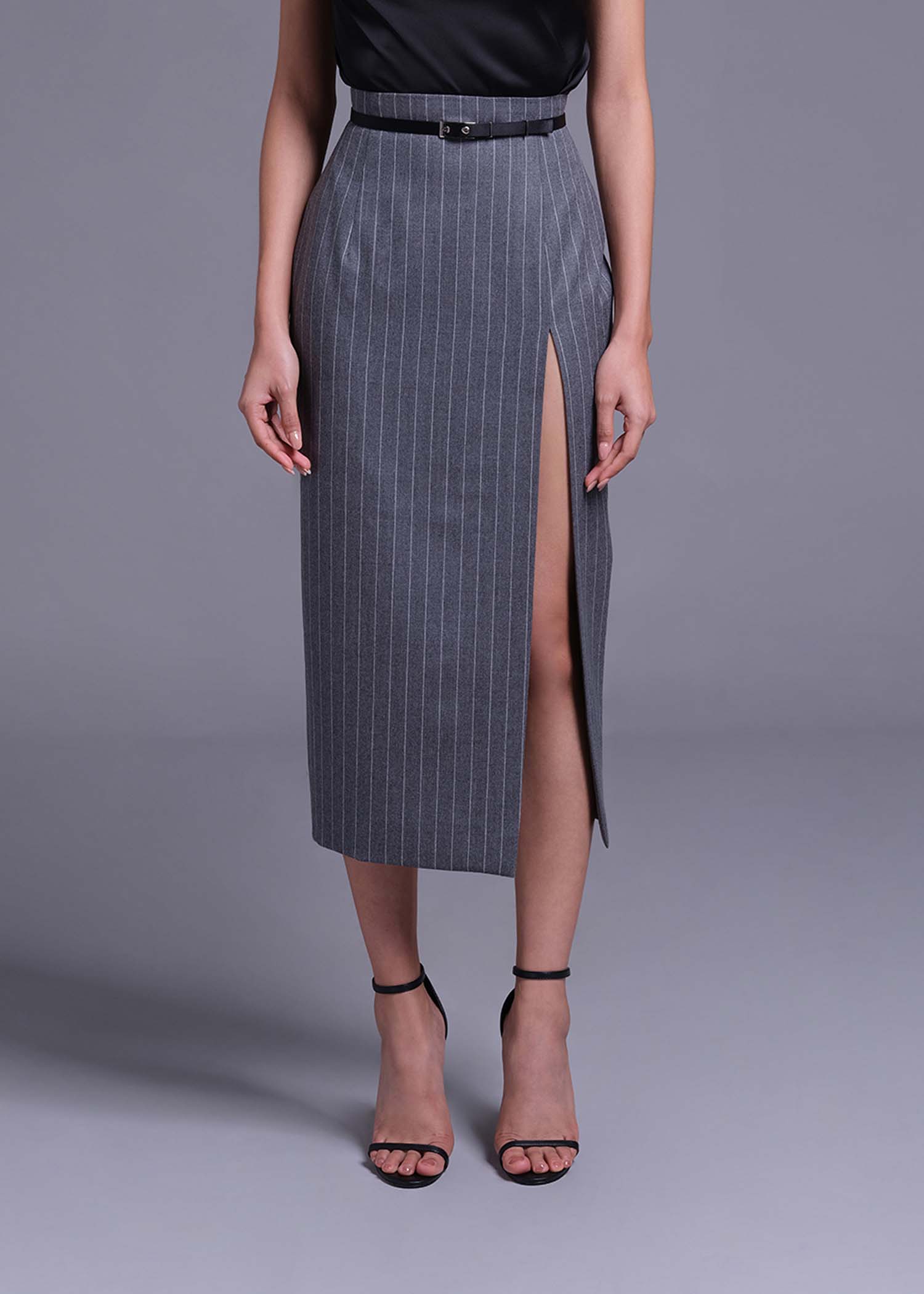 The grey pinstripe wool pencil skirt, designed with a flattering high-waist fit and a sophisticated thigh slit. Crafted from premium wool fabric, this tailored piece exudes elegance and versatility, making it perfect for office wear, business meetings, or refined evening outings. The classic pinstripe pattern adds a timeless touch, while the thigh slit introduces a modern, confident edge. Pair it with a structured blazer, blouse, or fitted knit top for a polished and chic look.