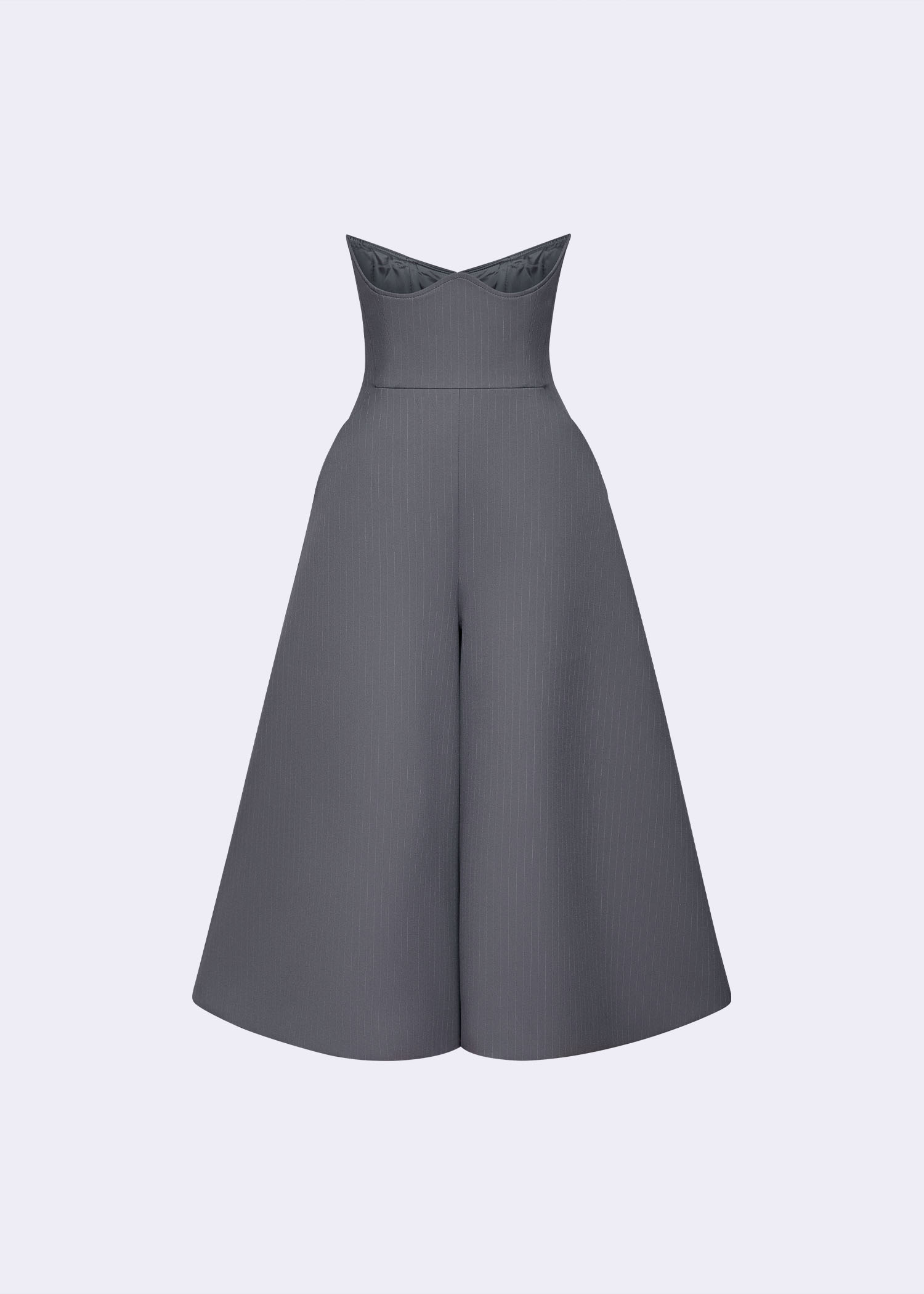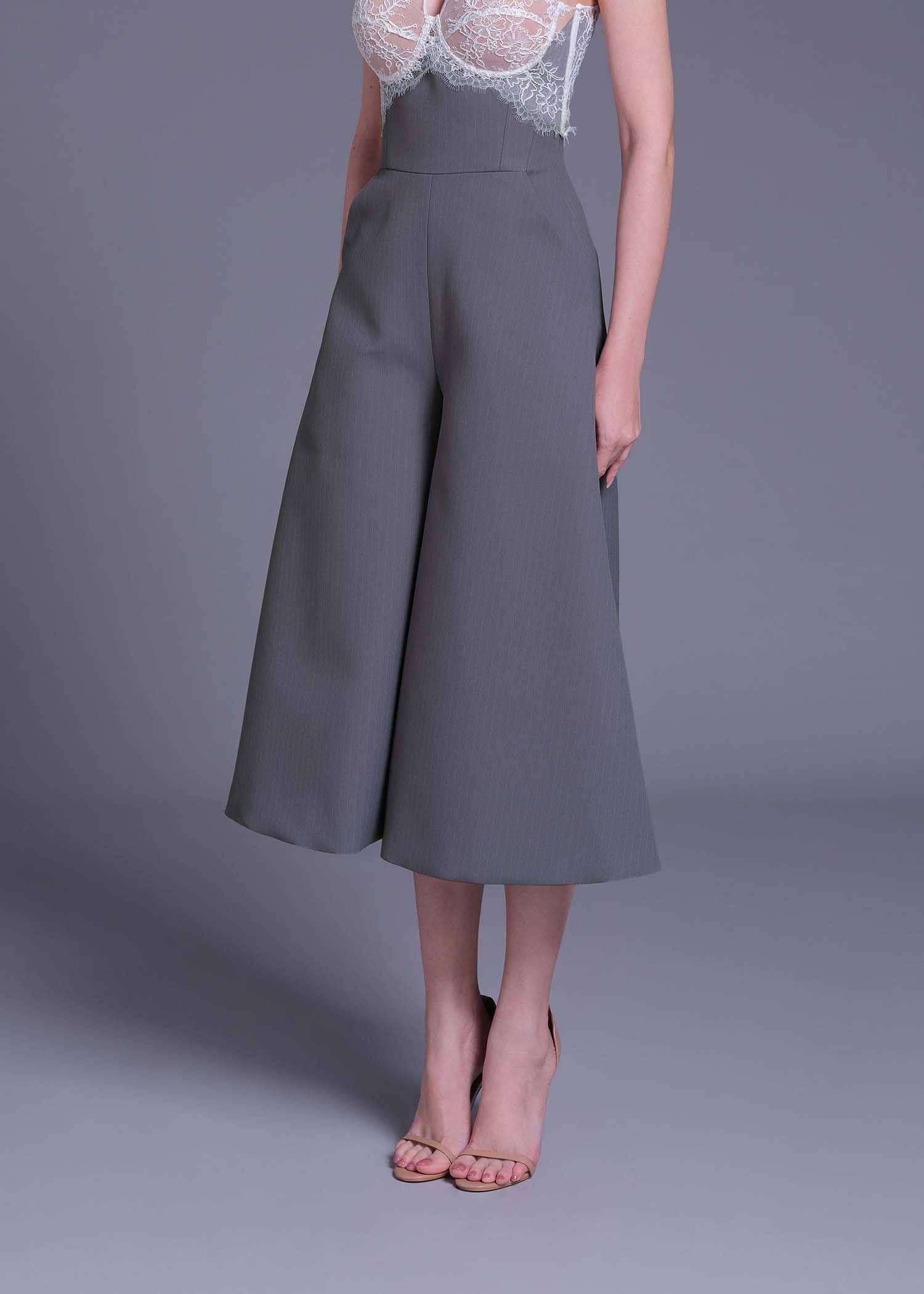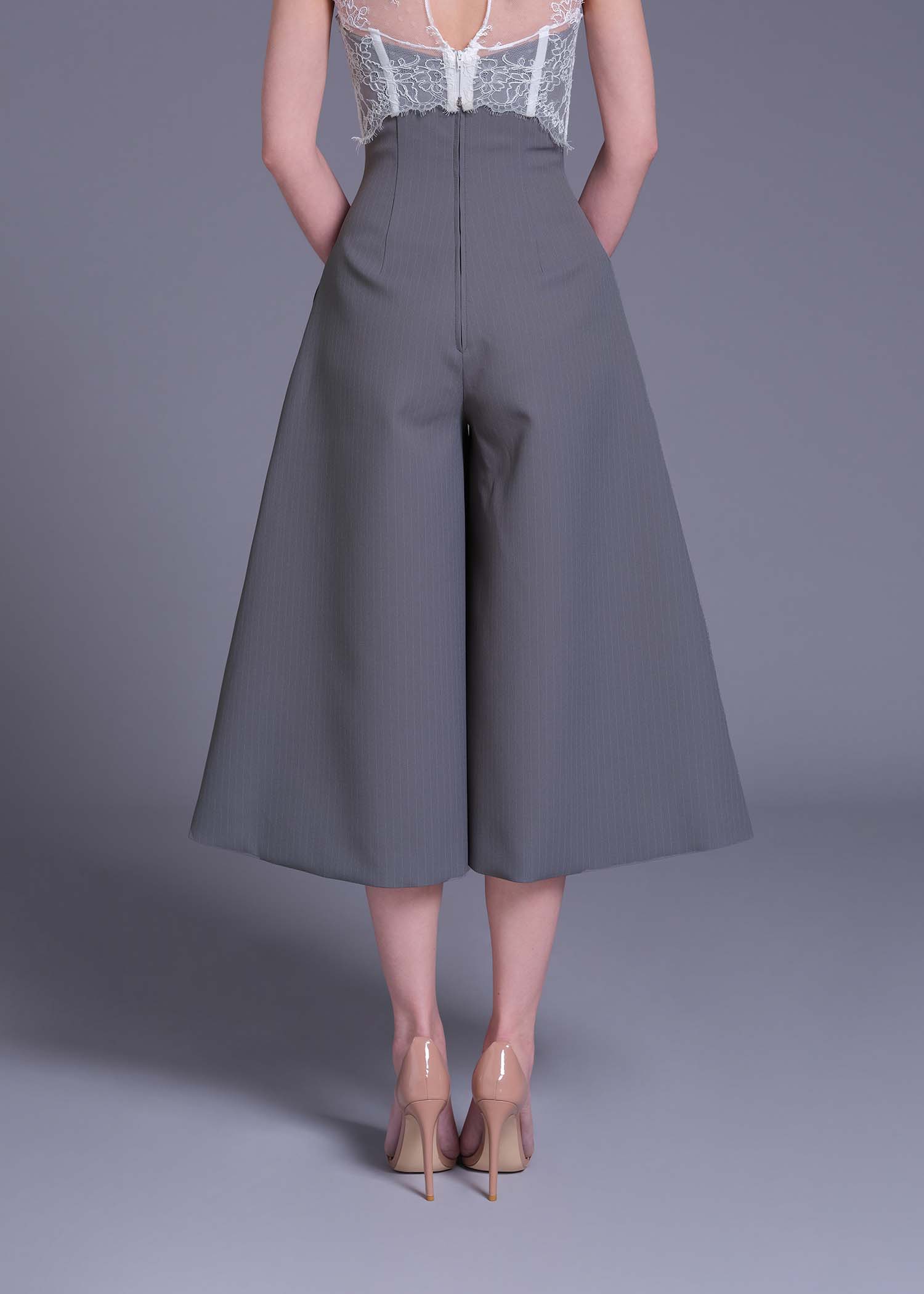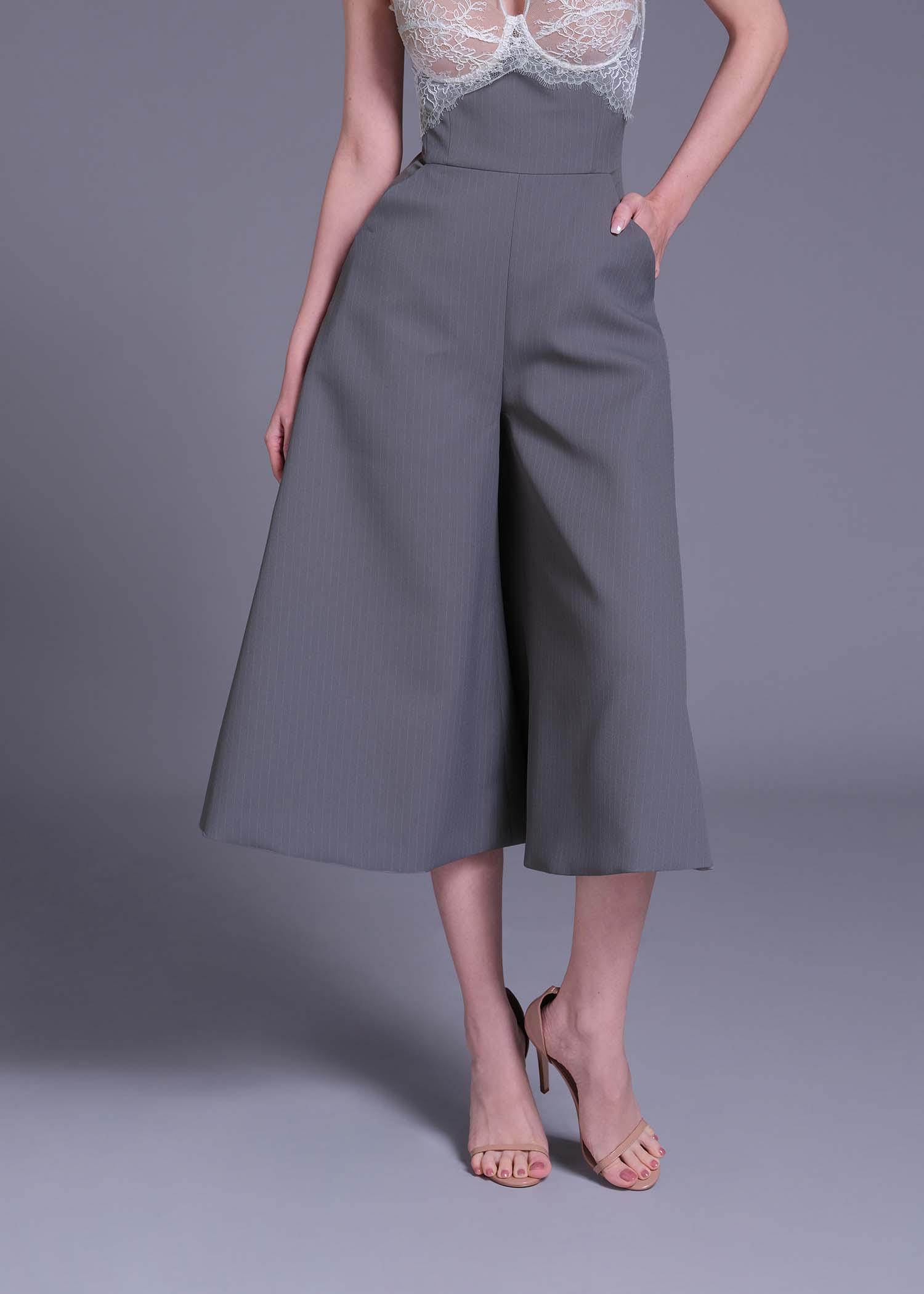 The lilac grey high-waisted wide-leg pants. Designed in a modern culotte silhouette, they fall just below the knee with graceful volume, offering both movement and structure. Crafted from premium polyester with subtle pinstripe texture, these pants blend contemporary tailoring with classic charm. The high waist flatters the figure, while the cool-toned lilac-grey hue adds a refined edge.