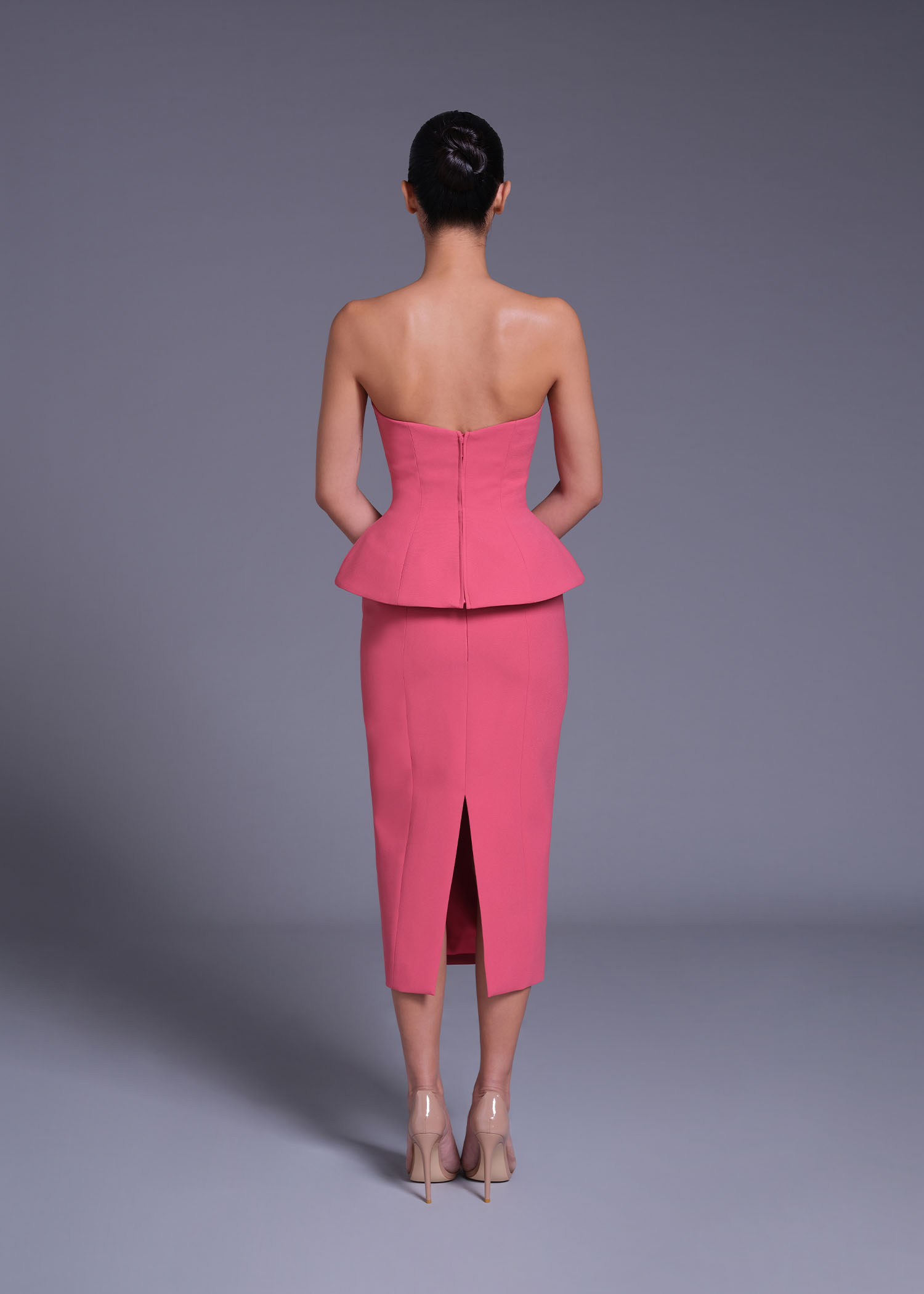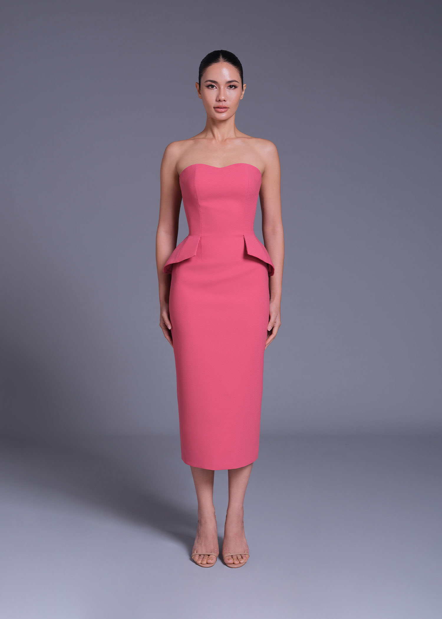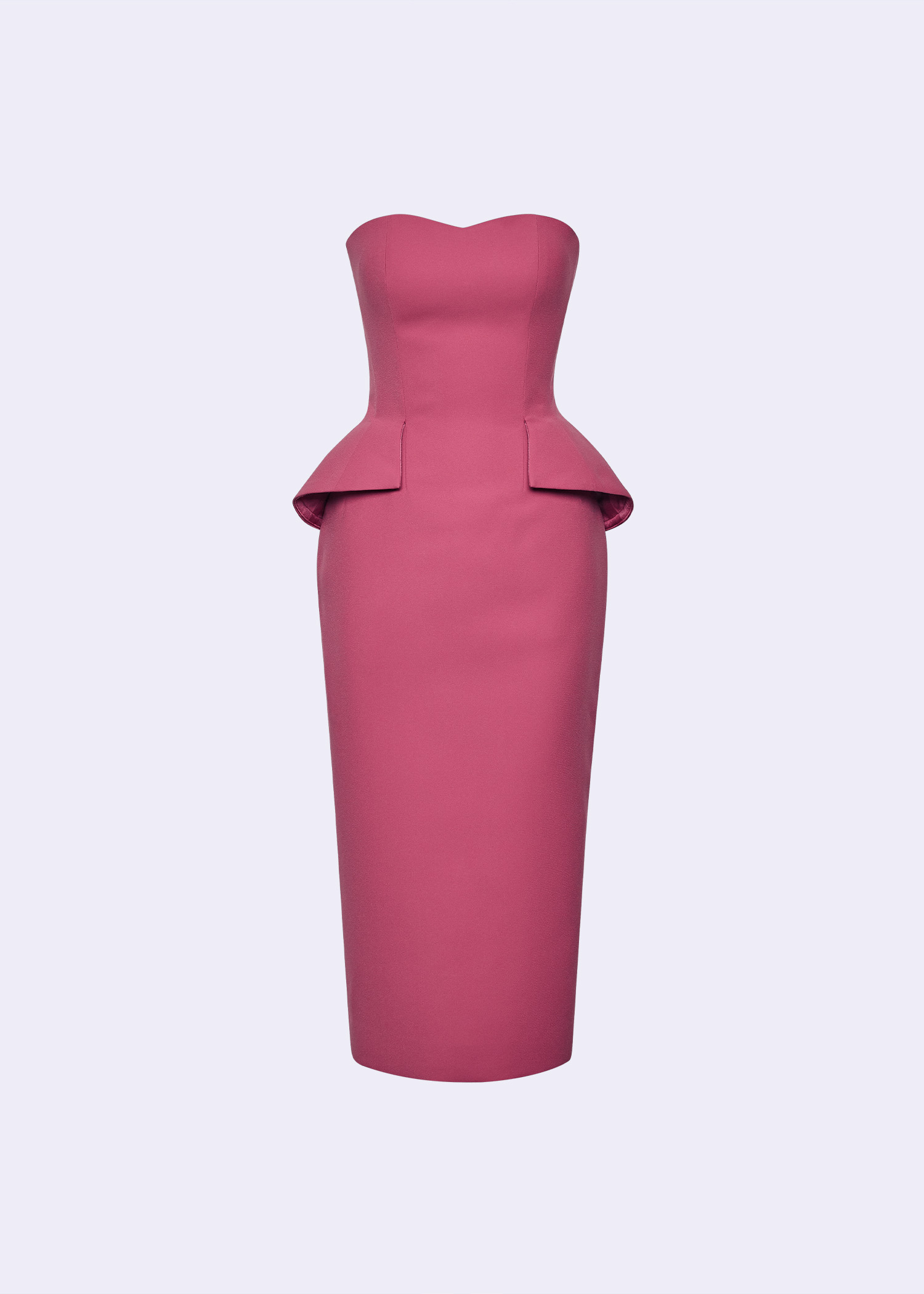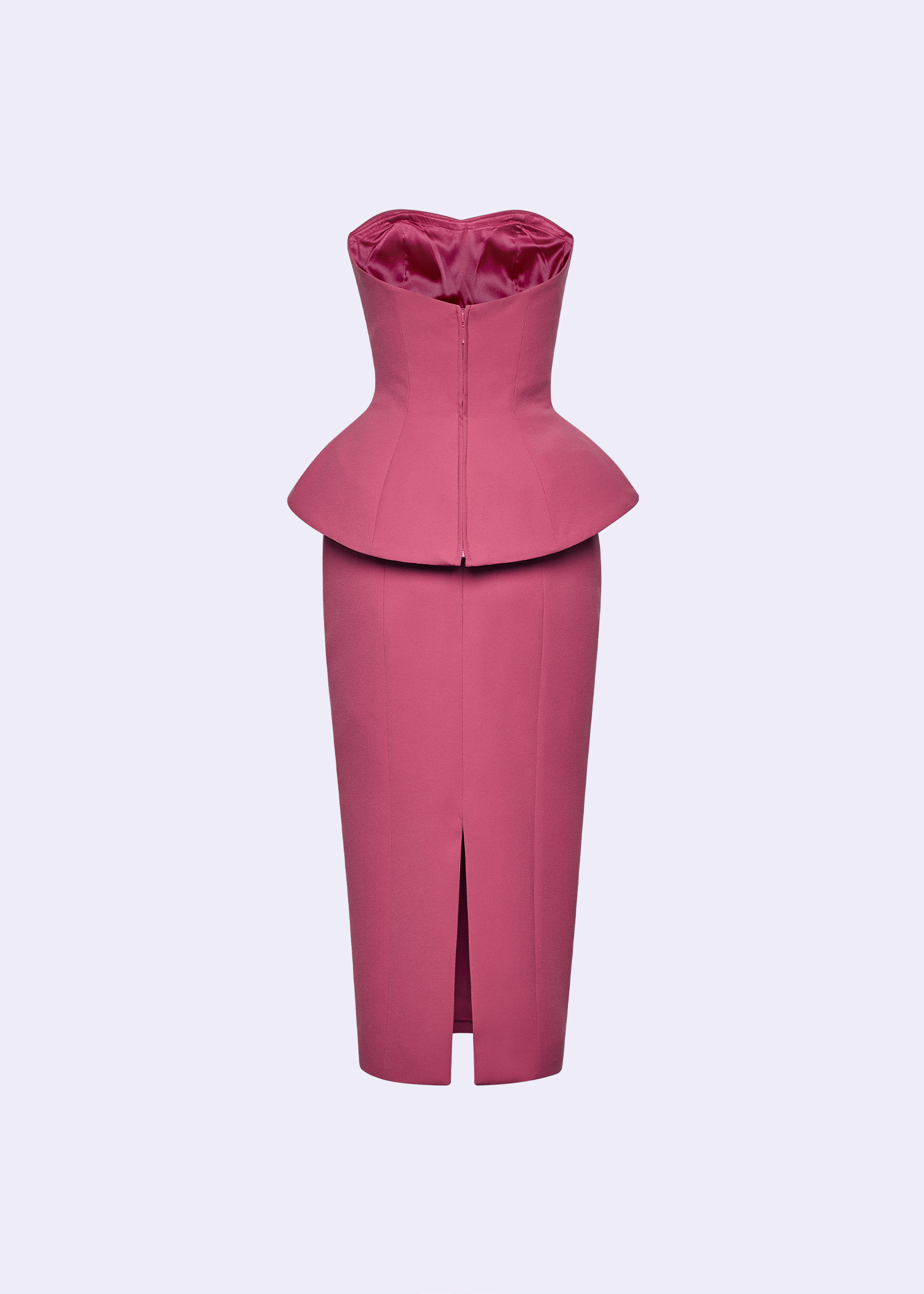 The “Gertrude Jekyll” Strapless Sheath Dress in lipstick pink polyester is a timeless silhouette reimagined with modern sophistication. Featuring a structured bodice and double-layer waist detail, this piece defines the waistline beautifully while maintaining clean architectural lines. Perfect for cocktail events, evening dinners, or modern formal occasions, this dress blends femininity and strength with effortless poise.