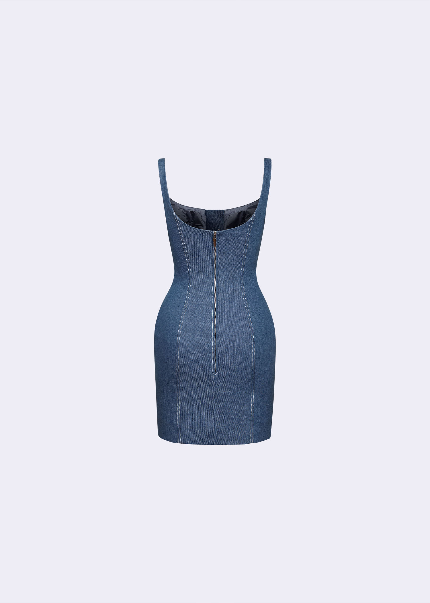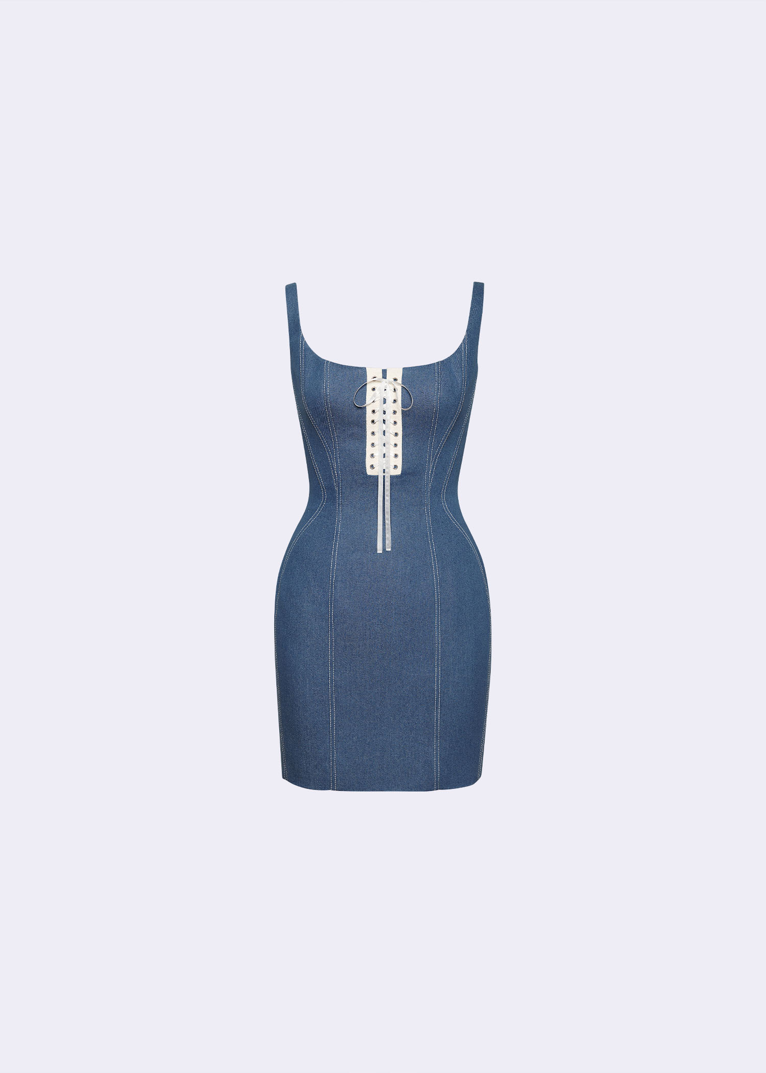 Inspired by modern nautical femininity, the Nautica Femme Denim Corset Mini Dress reinterprets classic denim through a refined corset silhouette. Designed with structured seams and a lace-up front detail, this mini dress enhances the waistline while maintaining a sleek, streamlined form. The square neckline and fitted bodice highlight the upper silhouette, while precision tailoring ensures a flattering, body-contouring fit. Perfect for day-to-night styling, this piece embodies confident elegance with a subtle maritime influence-ideal for the modern woman seeking statement simplicity.