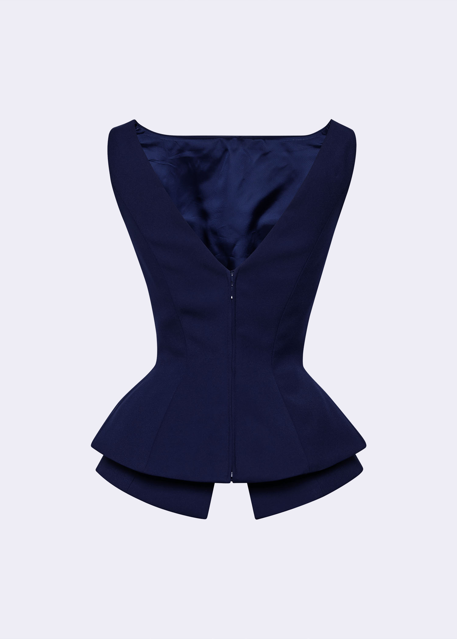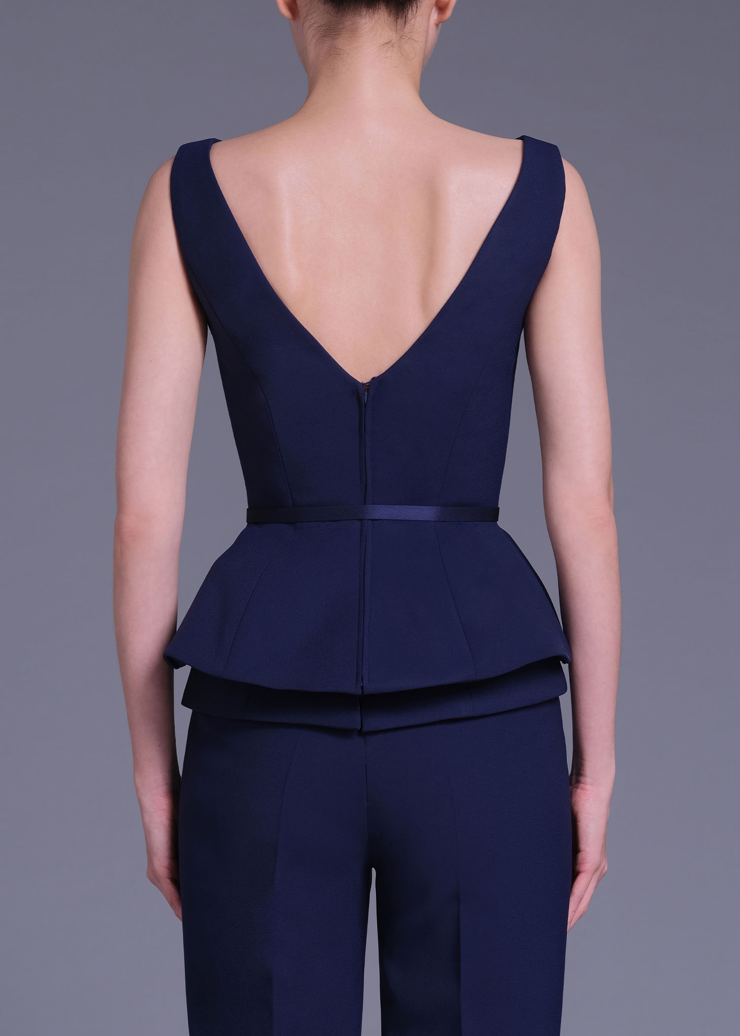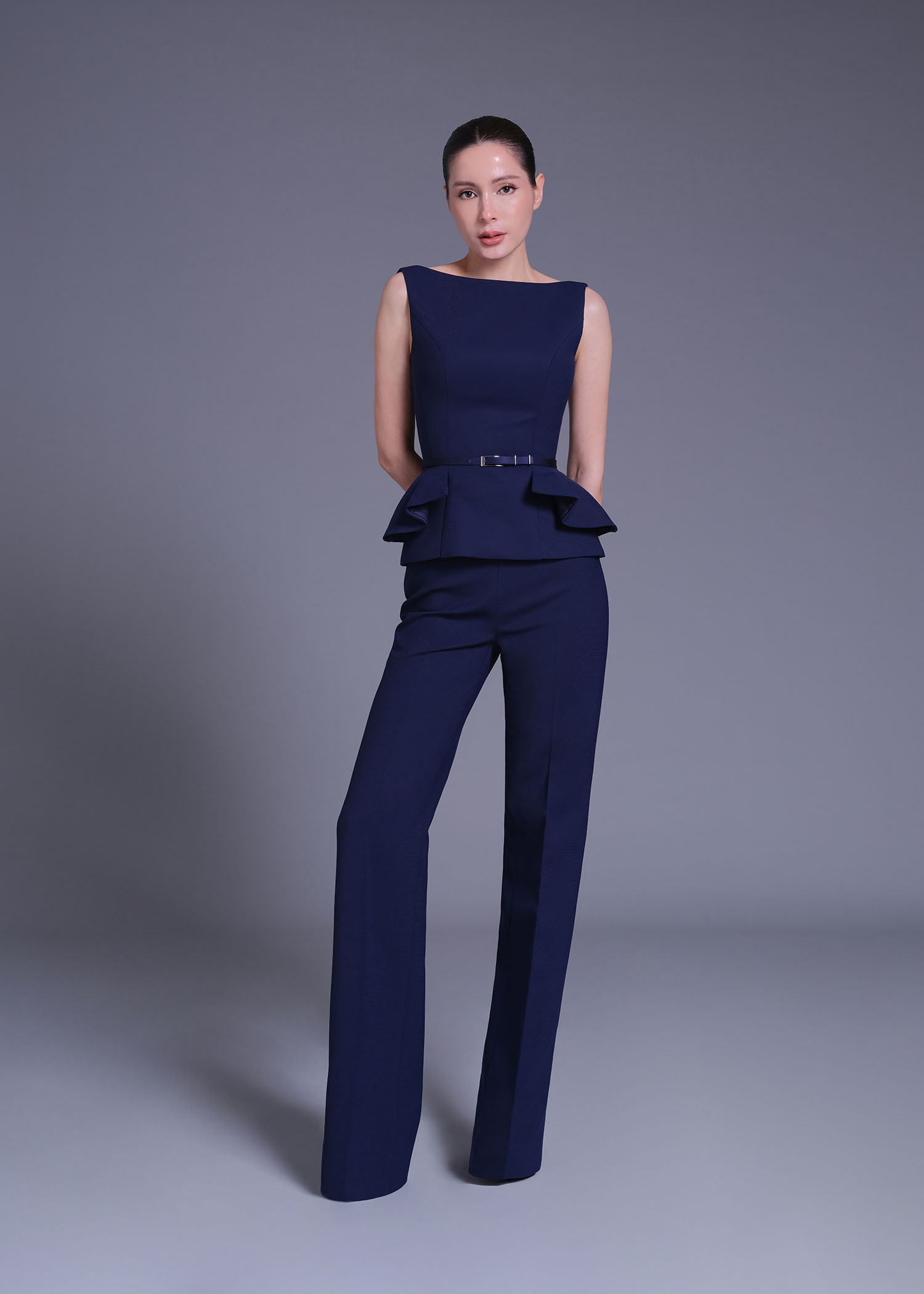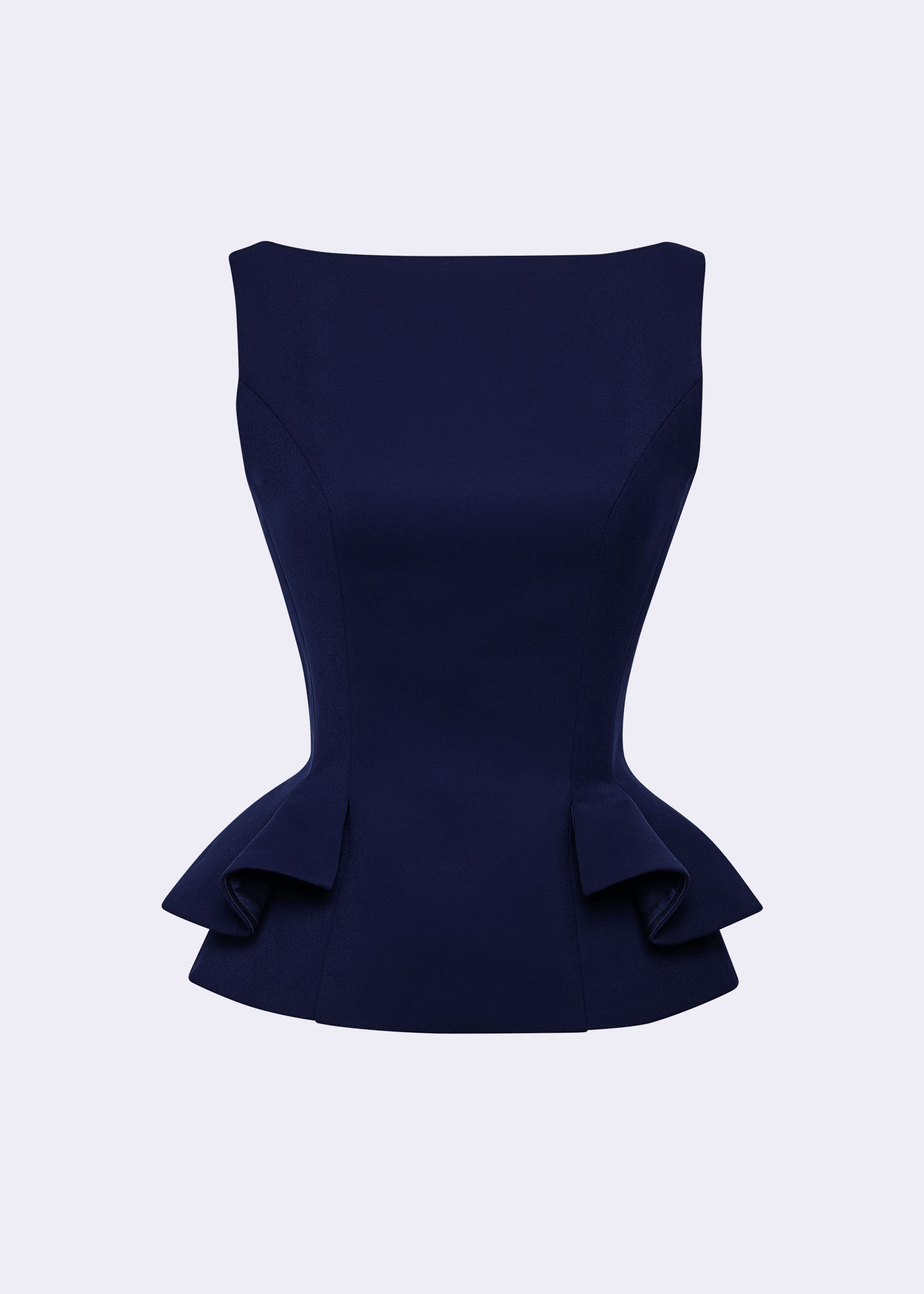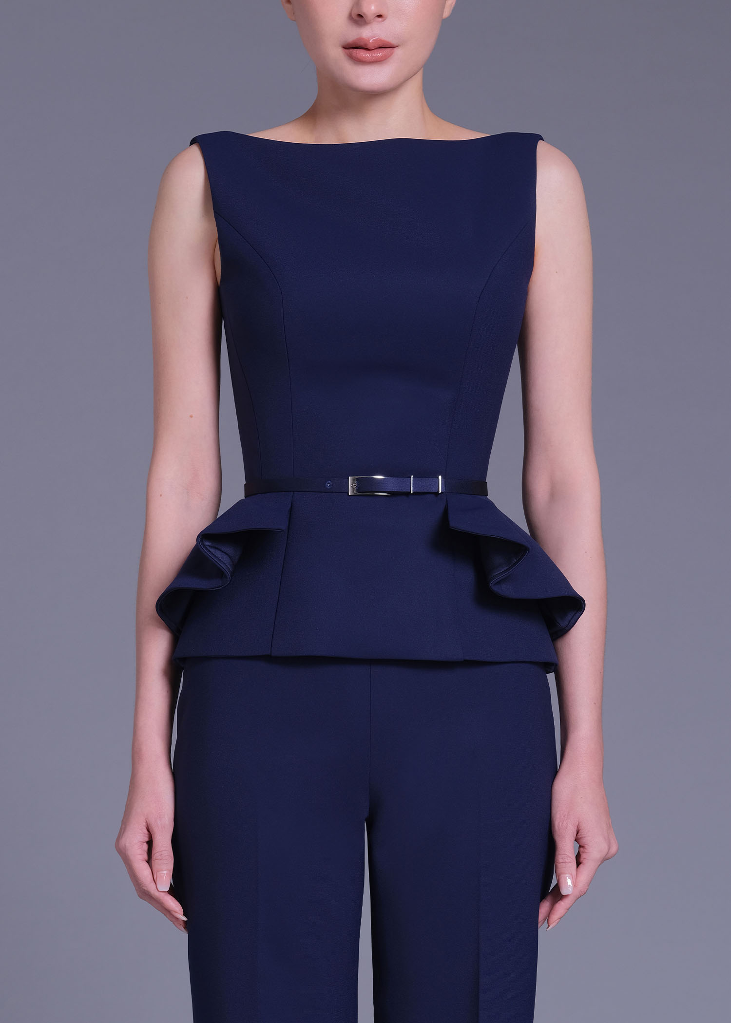 The Navy polyester “Gartentraume” ruffled waist blouse, a statement piece that blends modern tailoring with feminine elegance. Crafted from premium polyester, this blouse features a structured bodice with a refined bateau neckline, complemented by a ruffled waist design that enhances the silhouette. The deep navy shade conveys timeless sophistication, while the peplum-inspired ruffles add movement and style. Perfect for pairing with tailored trousers or skirts, this versatile blouse transitions seamlessly from business wear to evening occasions.