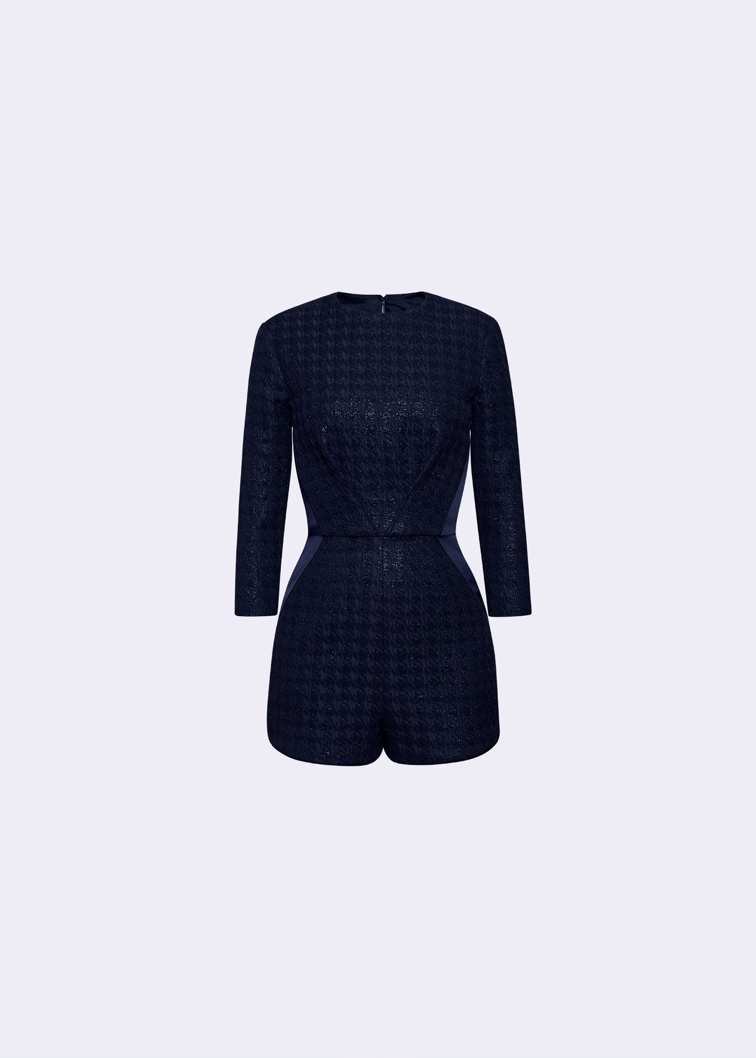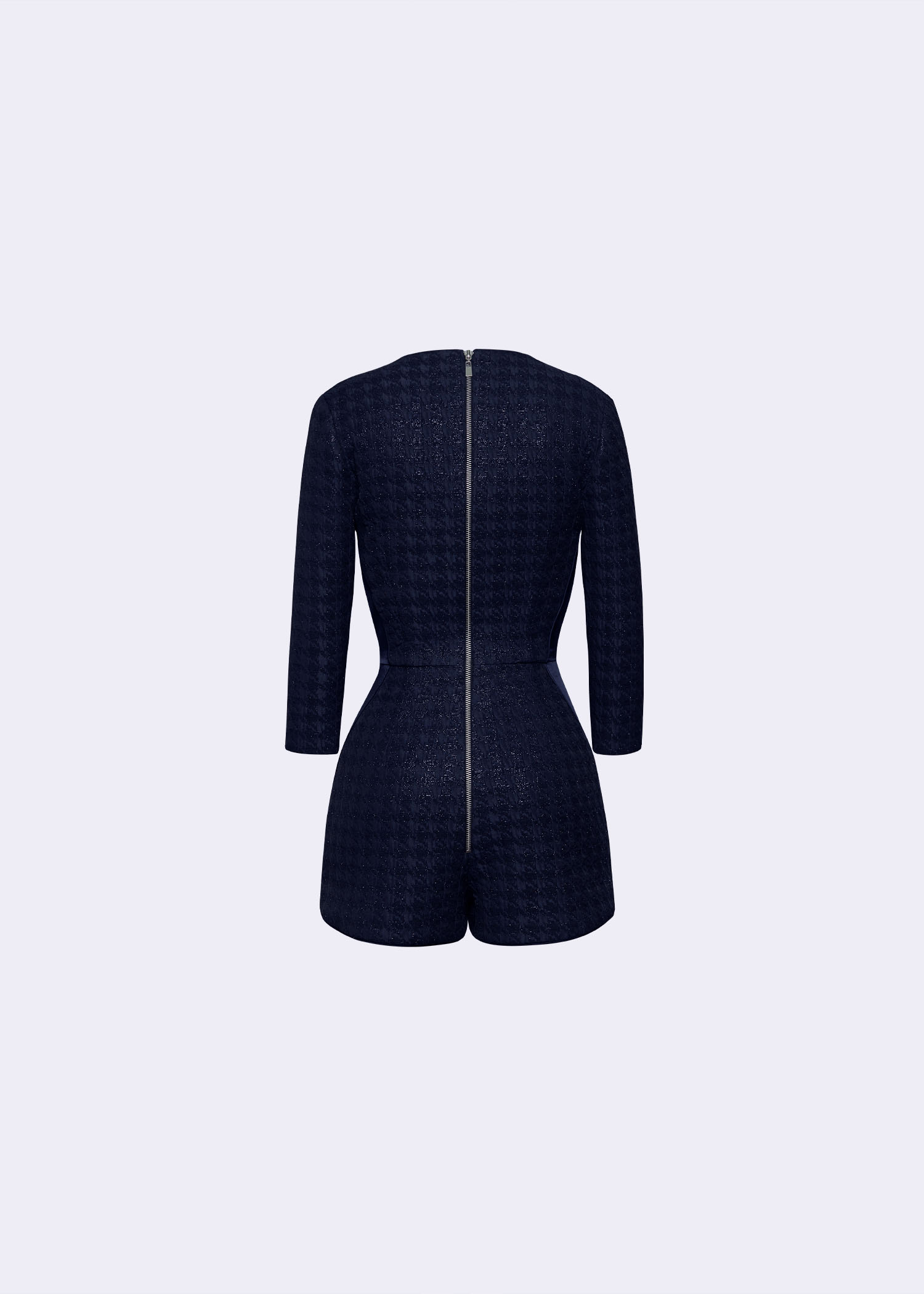 The Navy Houndstooth Jumpsuit with Satin-Crepe Detail, a sophisticated piece that combines timeless elegance with modern flair. This luxurious jumpsuit features a classic houndstooth pattern in rich navy jacquard, enhanced by delicate satin-crepe detailing that adds a touch of refinement and texture. Whether you’re attending a formal event, a business gathering, or a stylish evening out, this jumpsuit ensures you stand out with its unique blend of classic and contemporary elements. Pair it with your favorite heels and statement jewelry for a complete, chic ensemble.