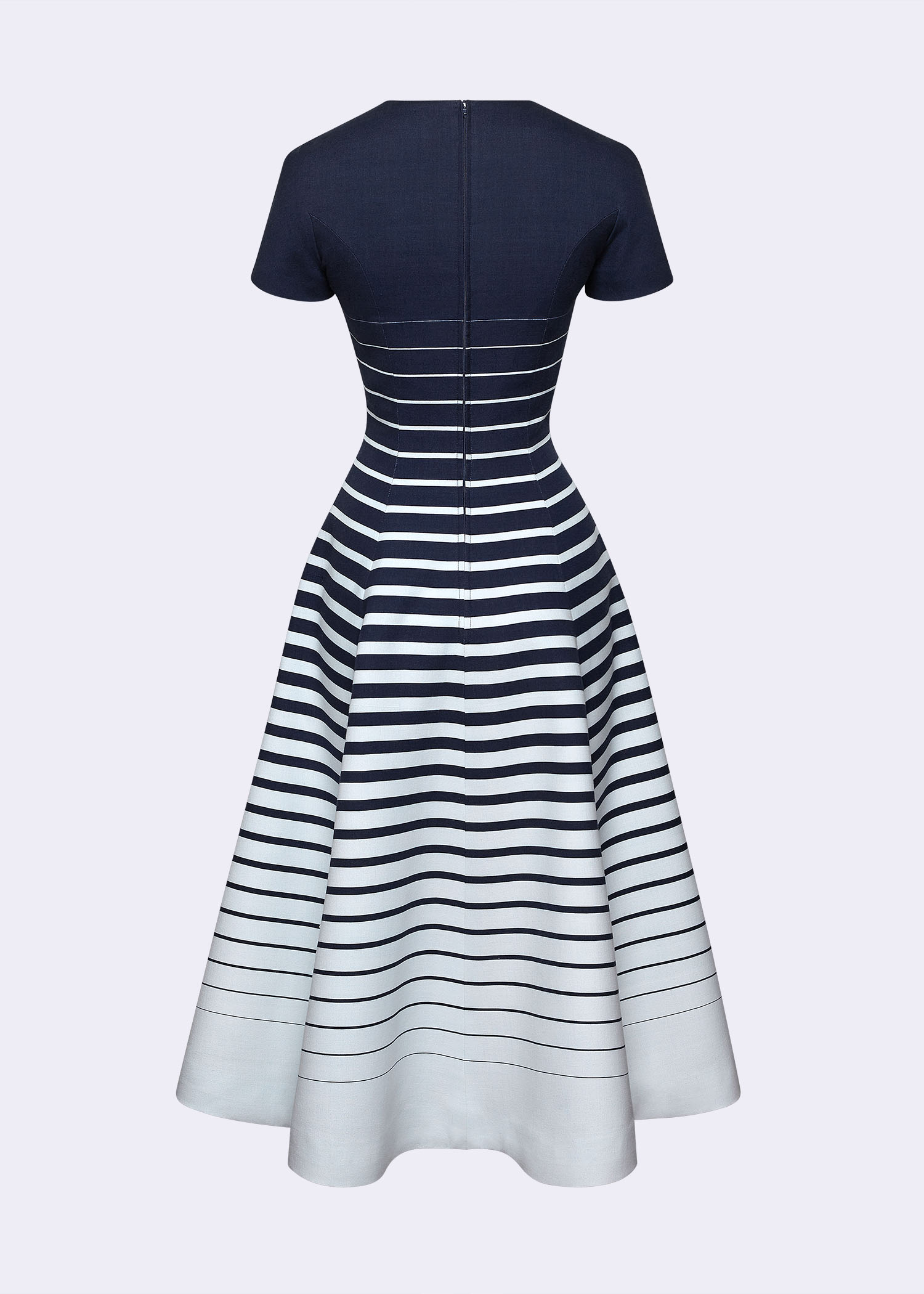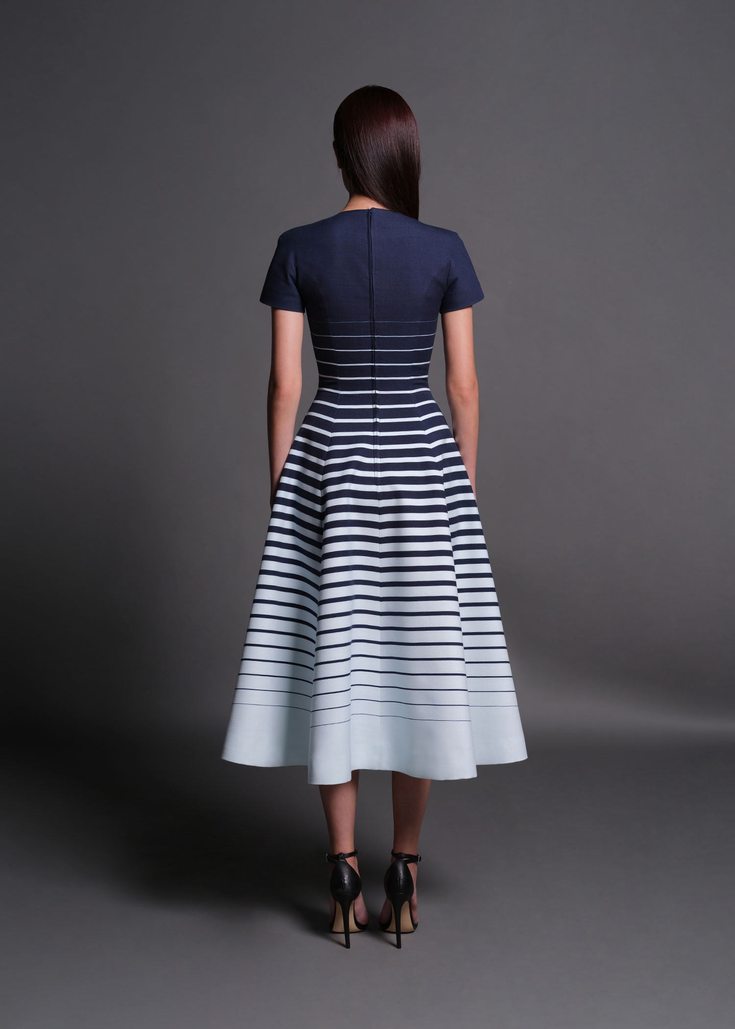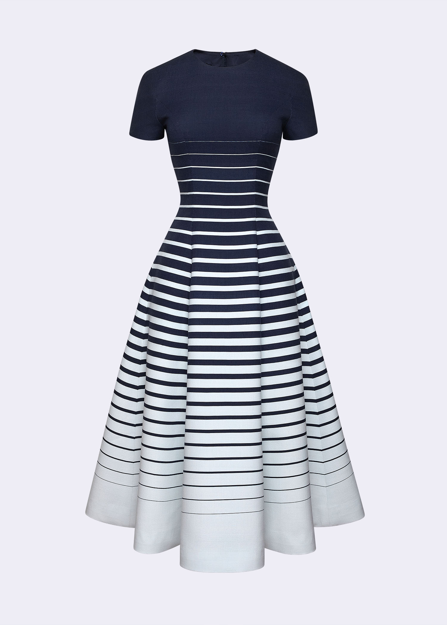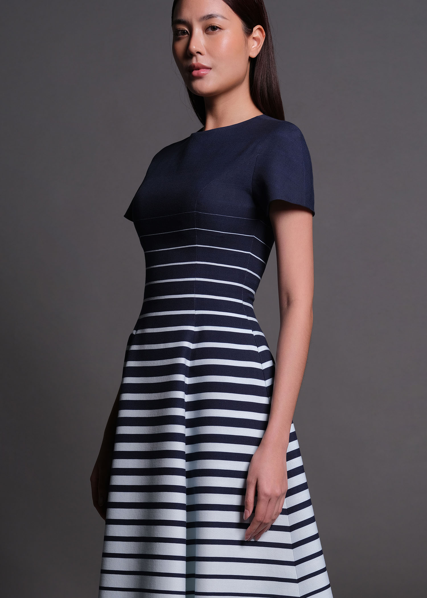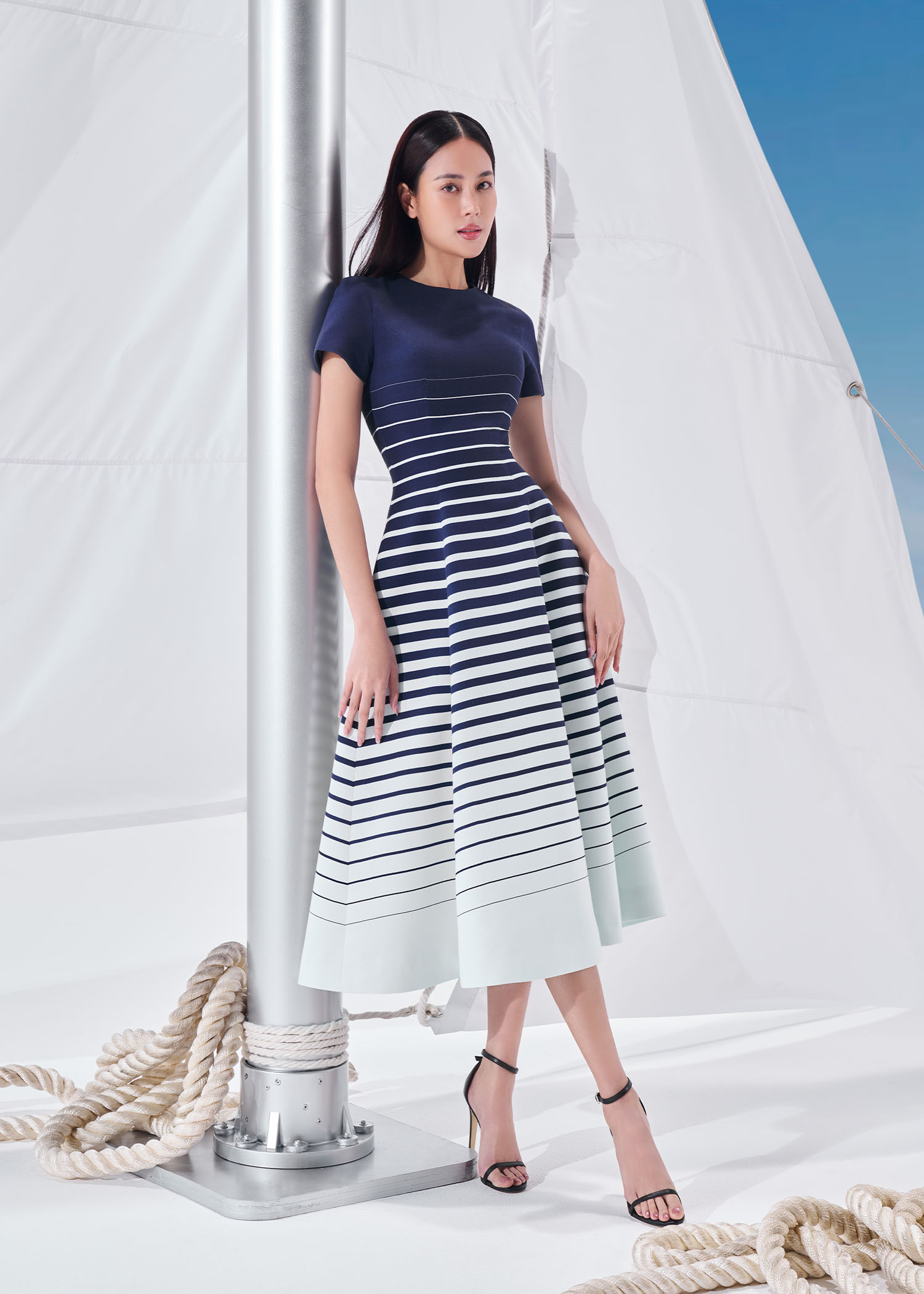Part of the Cruise 2026 “Nautica Femme” Collection, this Navy Perspective Rib Midi Dress reimagines classic nautical stripes through a modern, feminine lens. The perspective rib detailing creates a dynamic visual rhythm, echoing the fluid lines of the sea while enhancing the natural contours of the body. The fitted bodice flows into a graceful midi-length skirt, balancing structure and movement with quiet confidence. Crafted for women who embrace freedom, travel, and timeless elegance, this dress embodies the spirit of Sail & Grace, where strength and softness exist in perfect harmony.