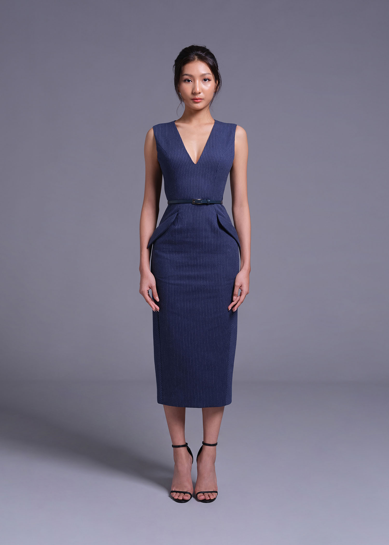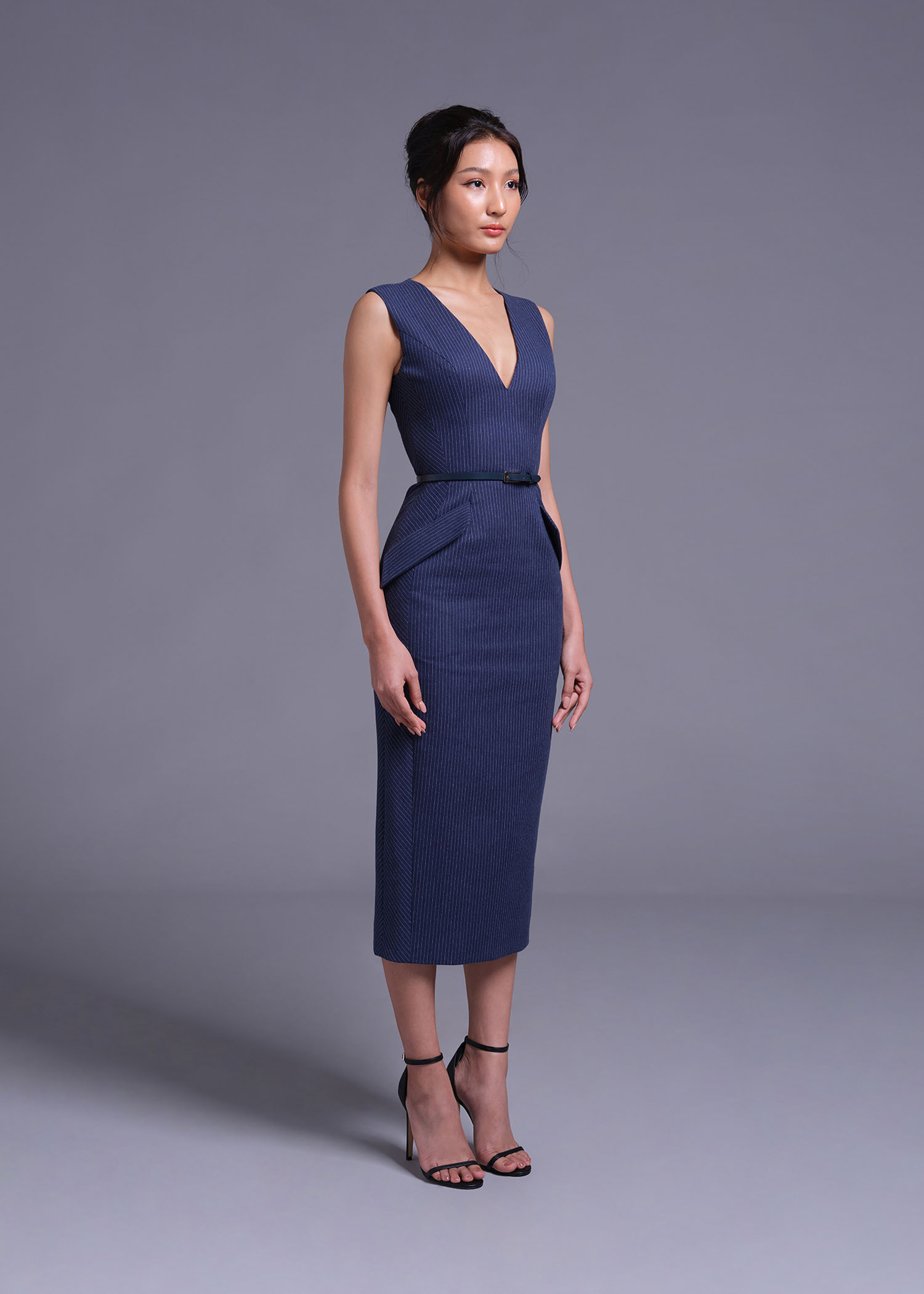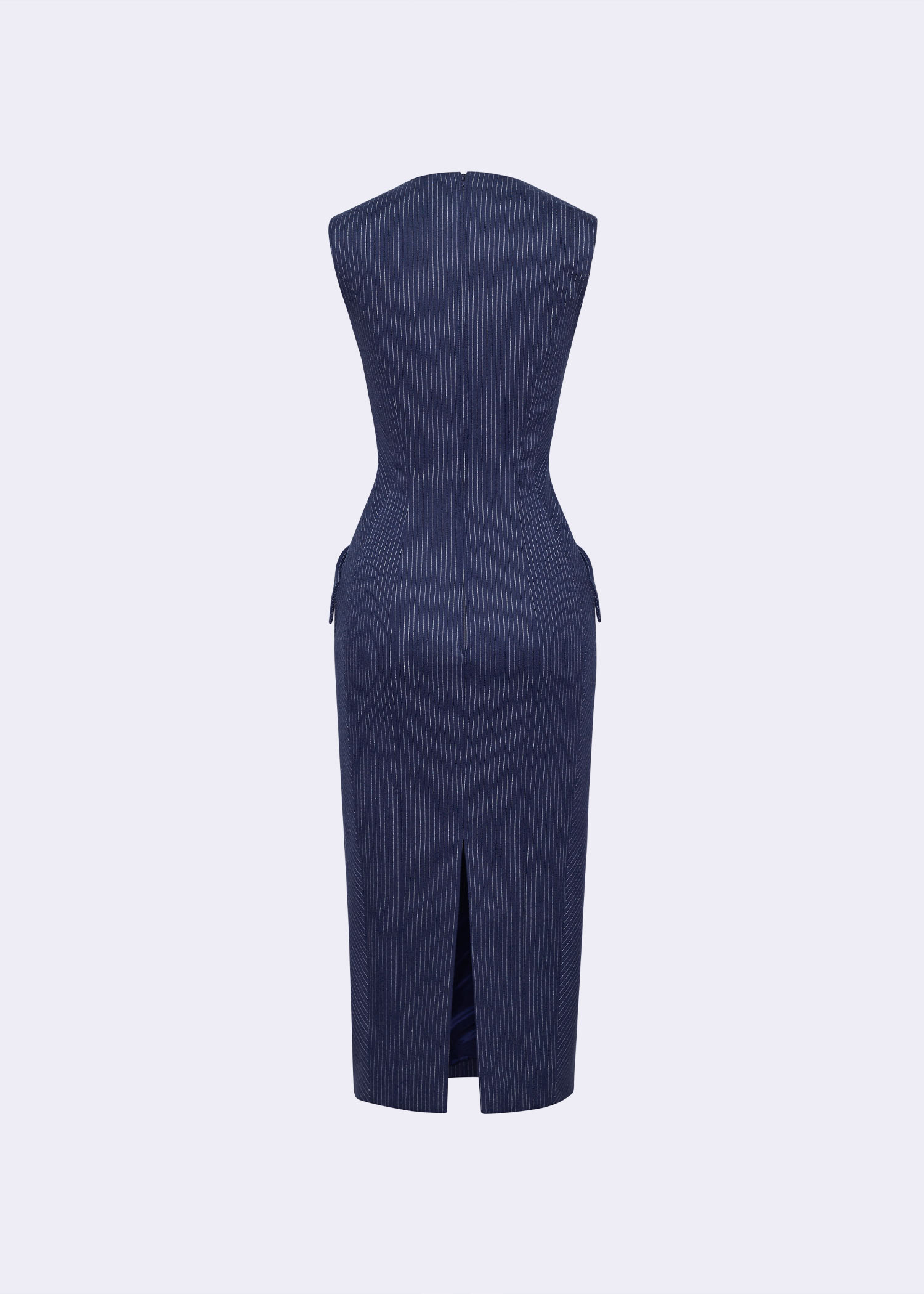 This navy pinstripe sheath dress, a perfect blend of sophistication and modern tailoring. Crafted from high-quality cotton, this dress offers breathability and comfort while maintaining a structured silhouette. The classic pinstripe pattern enhances its professional appeal, making it ideal for office wear, business meetings, and formal events. The sheath cut flatters the figure, ensuring a sleek and elegant look. Pair it with heels and a blazer for a polished ensemble or style it with minimal accessories for a refined, effortless outfit.